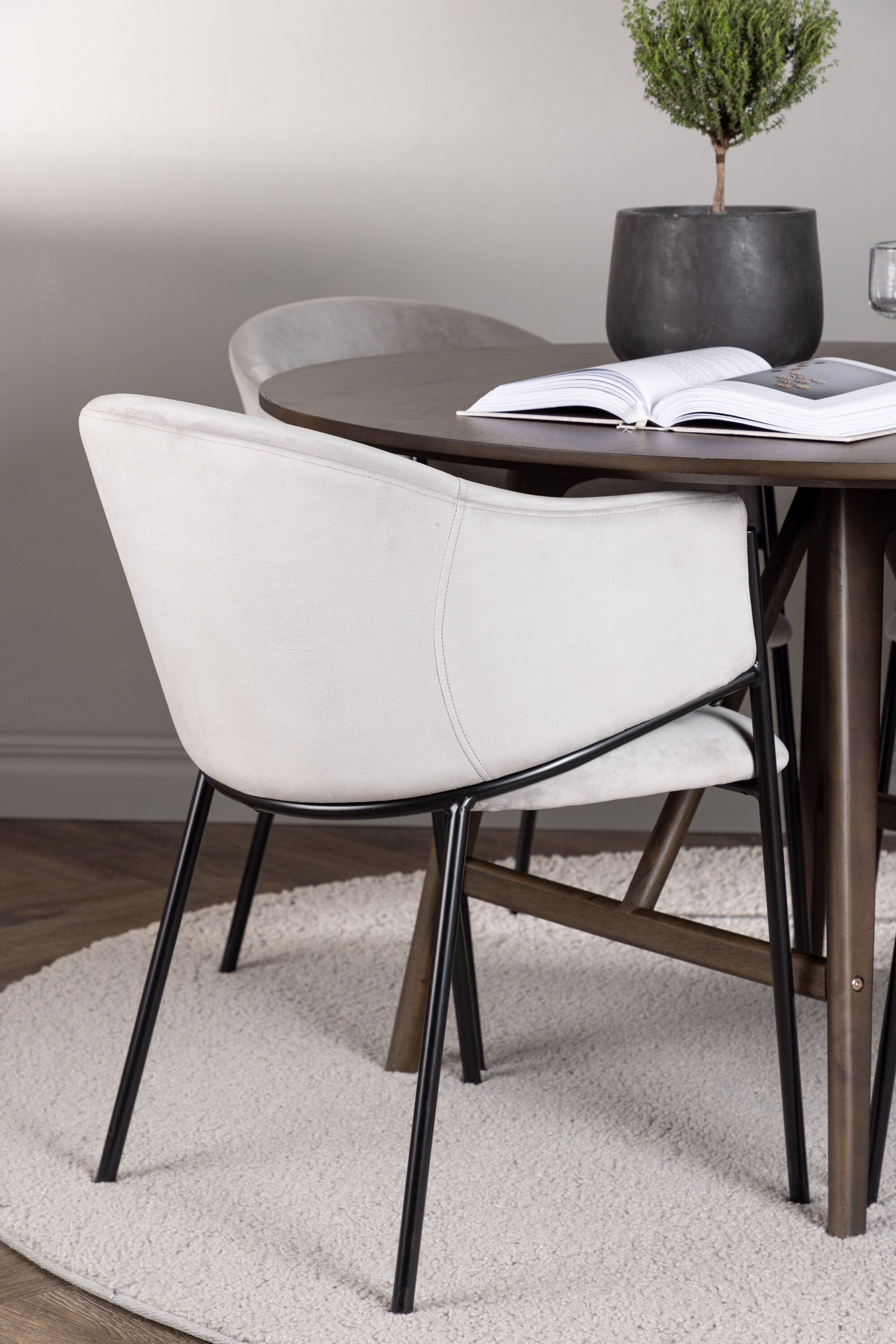 Aby tmavě hnědý stůl co nejlépe doplnil, spárovali jsme jej s jídelními židlemi ze série Evelina. Tato židle se vyznačuje moderní a elegantní estetikou v kombinaci s fantastickým pohodlím. Užijte si luxus sezení na celočalouněném sedadle ze světle šedé sametové látky s elegantně zakřiveným opěradlem. Minimalistický rám z černé oceli dodává stylový kontrast a dodává židli jedinečný výraz.