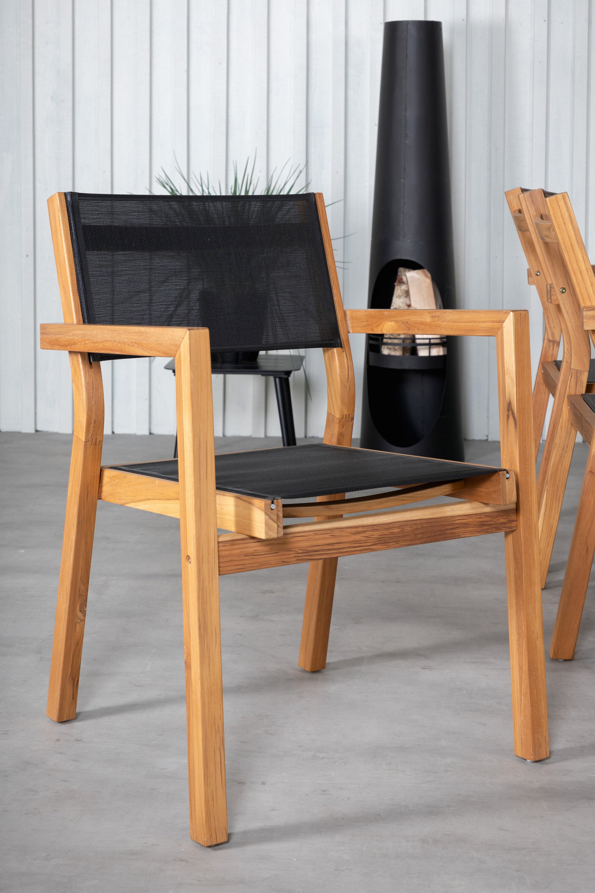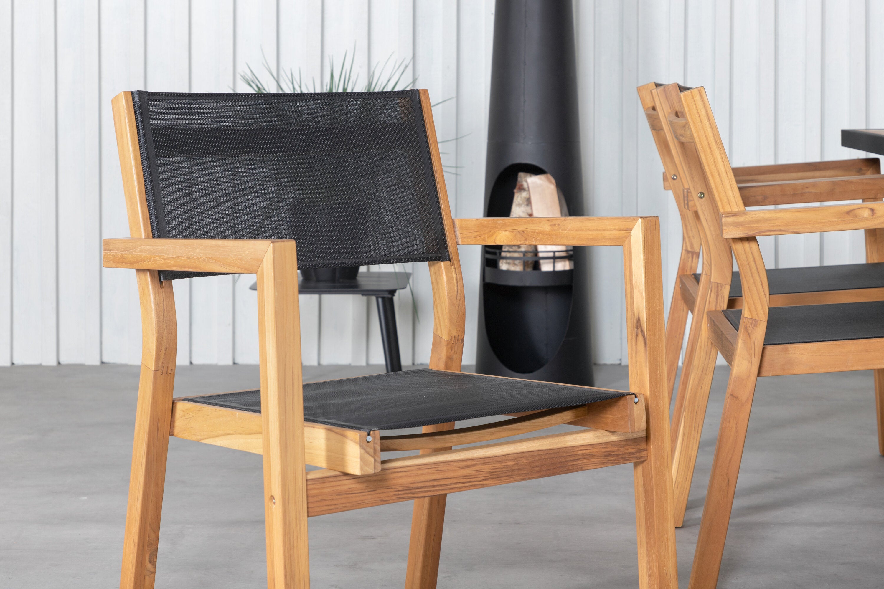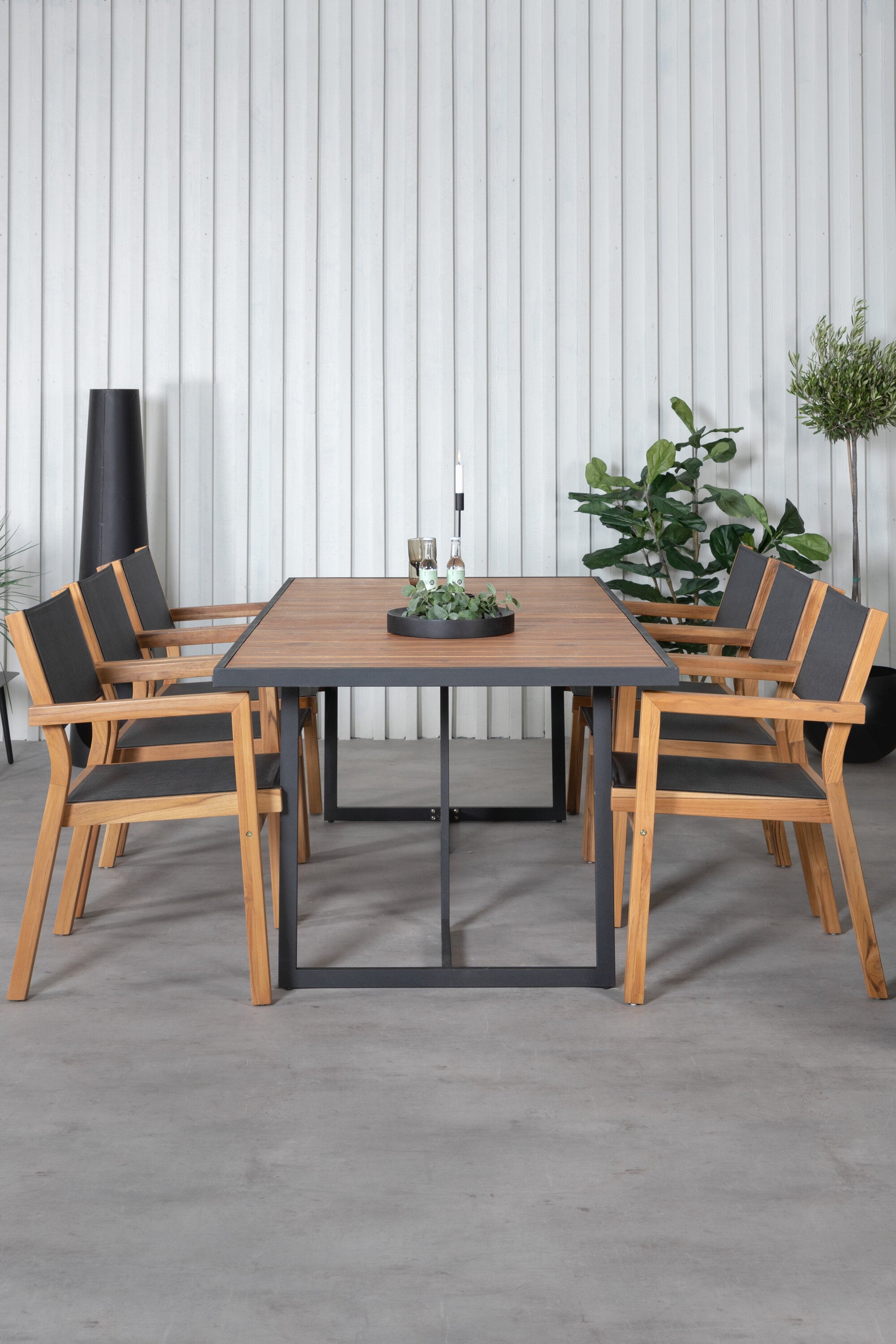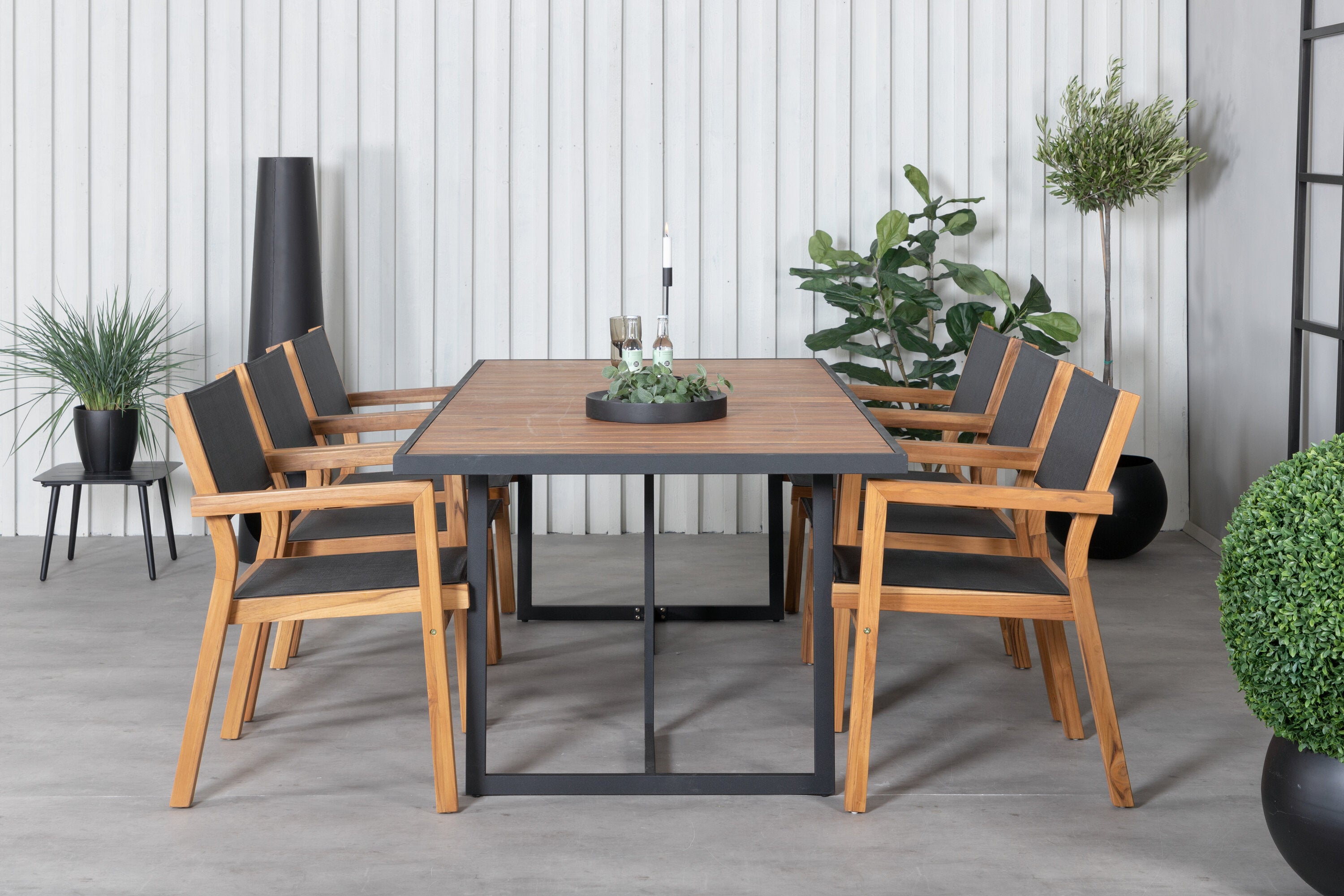 Jídelní stůl Khung - černá ocel / akácie (teklook) - 200*100 cm + stohovací židle Venice - teak / černá textilne_6