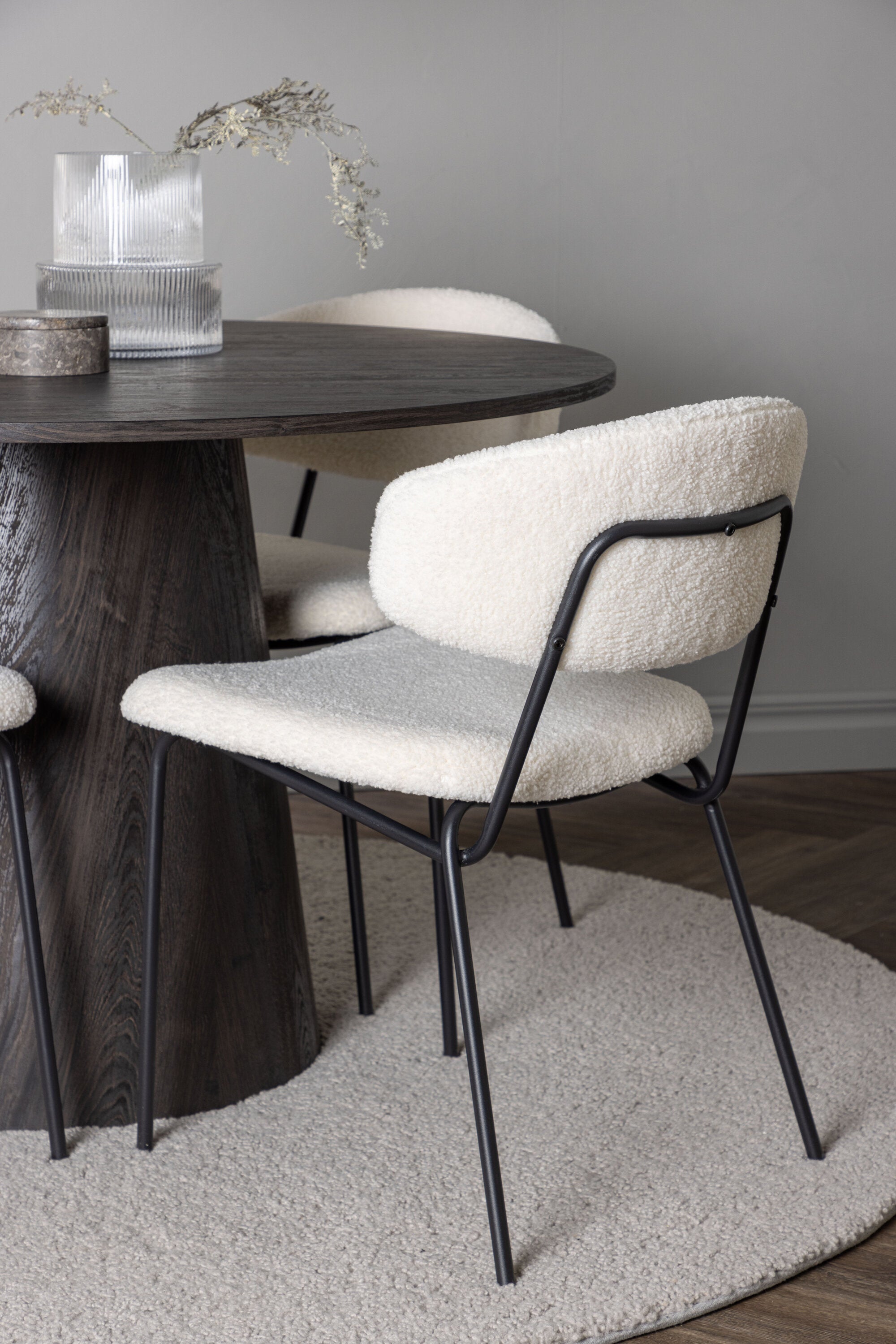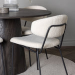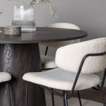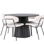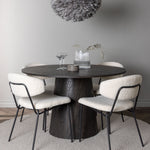 Vyzdobte si svůj domov útulně a lákavě! Náš nádherný kulatý jídelní stůl Lanzo má celkový design z hnědé MDF s tenkou deskou a krouceným válcovým rámem, který je vycentrován pod stolem. Zde ve stylové kombinaci s našimi bílými jídelními židlemi ze série Chico. Židle je vyrobena z bílého boucle látky s čalouněným sedákem a opěradlem pro větší pohodlí. Nohy jsou úzké z černé oceli, což dodává židli vzdušný pocit. Pozvěte do okouzlujícího středu! Průměr stolu: 120 cm.