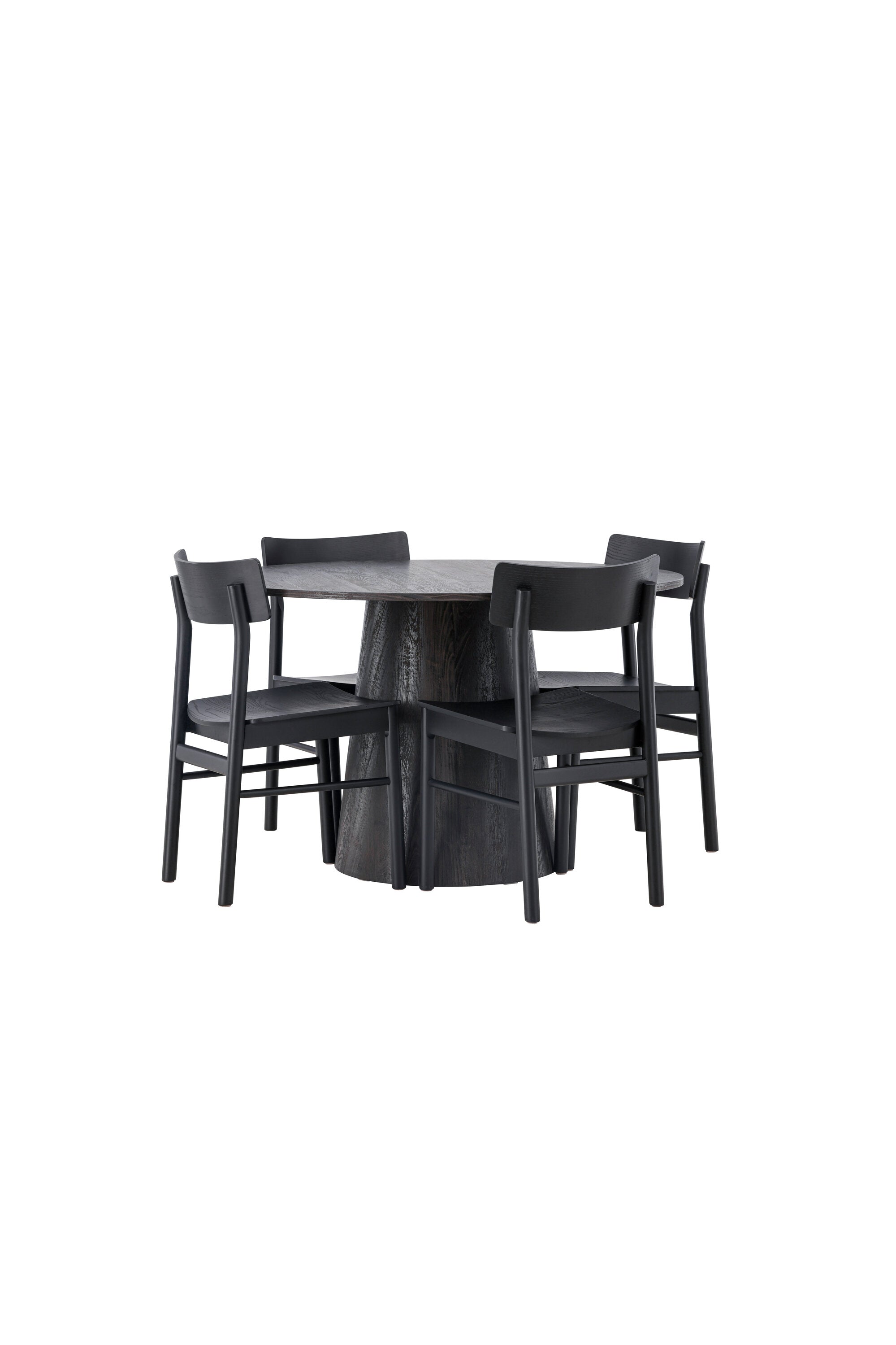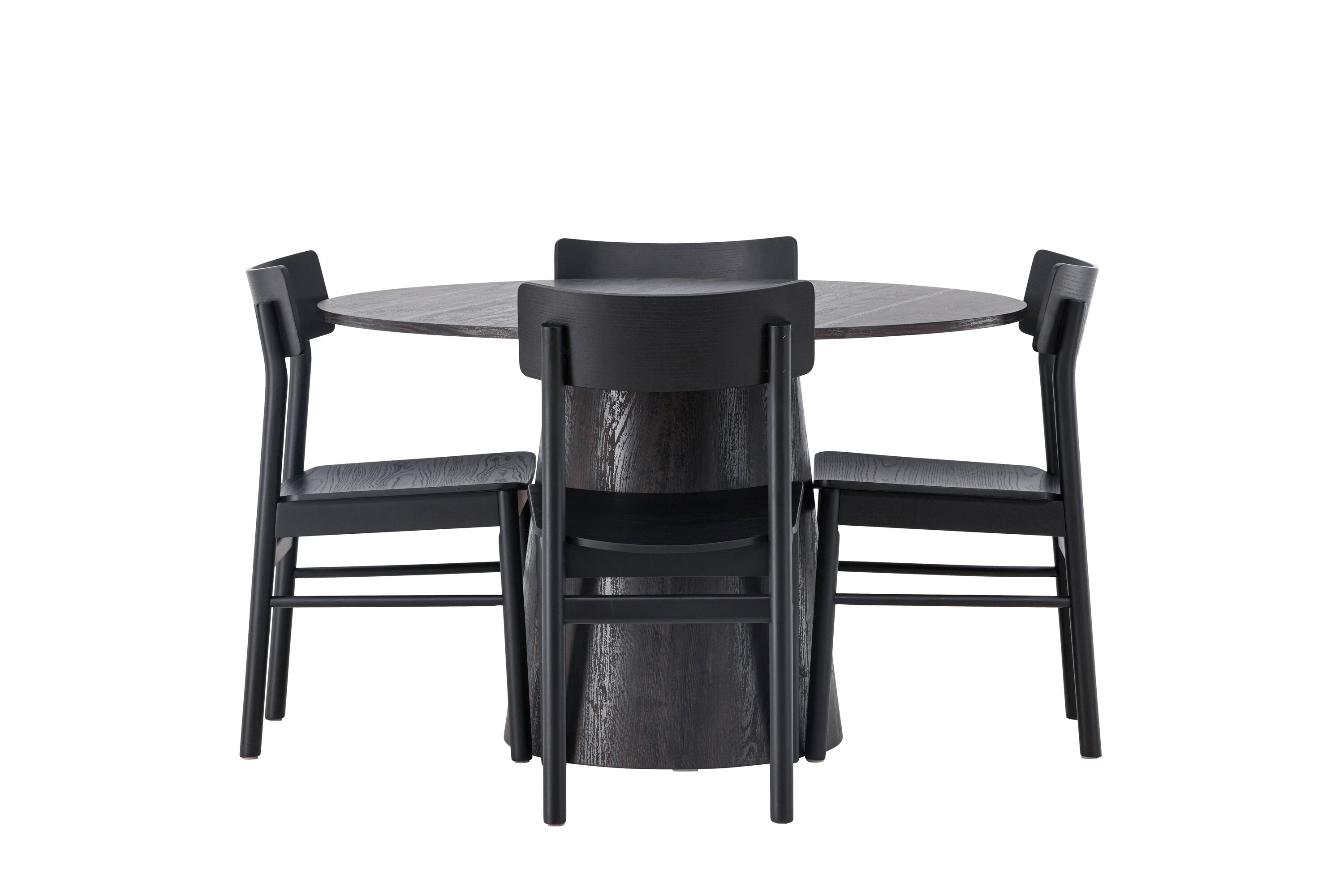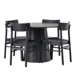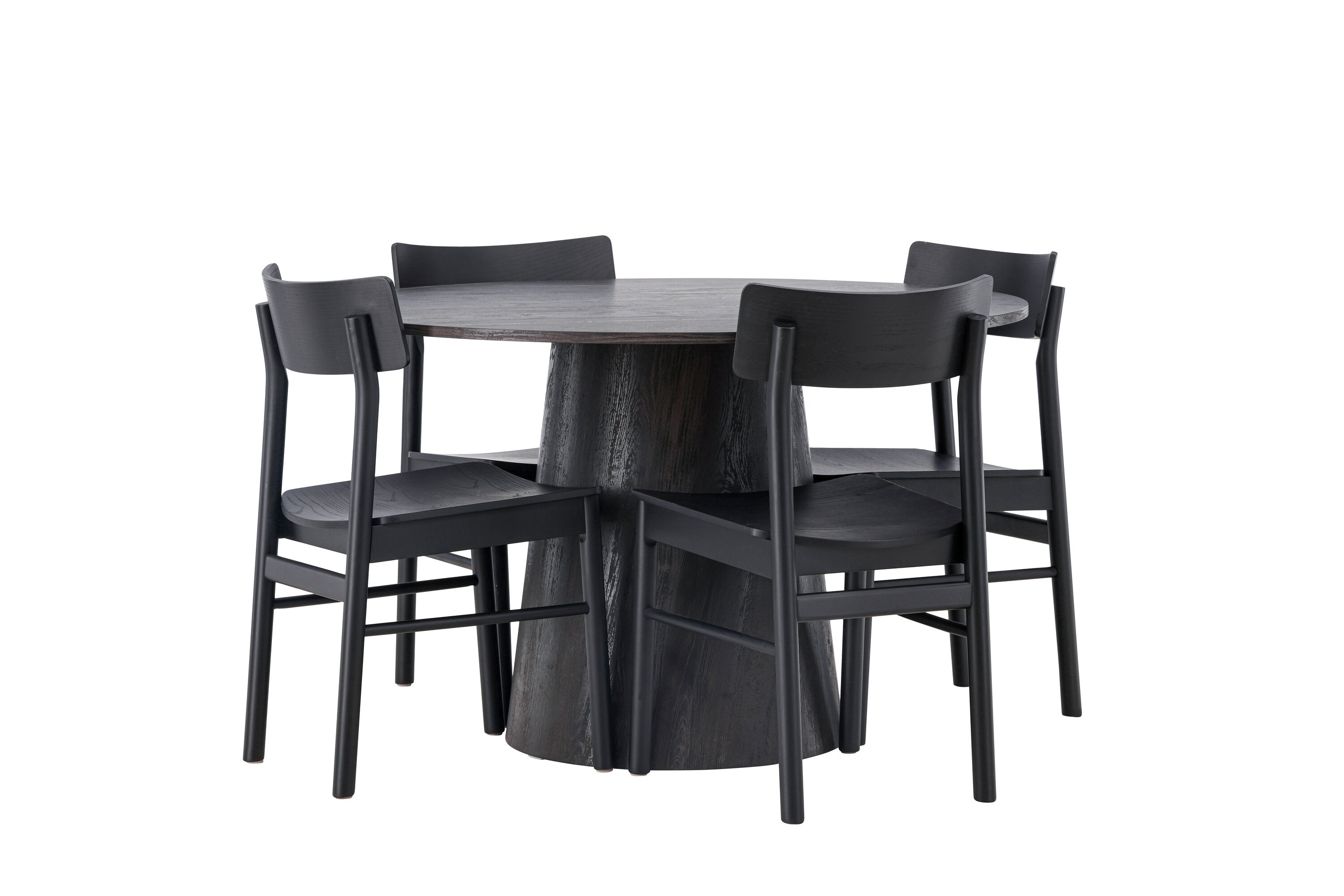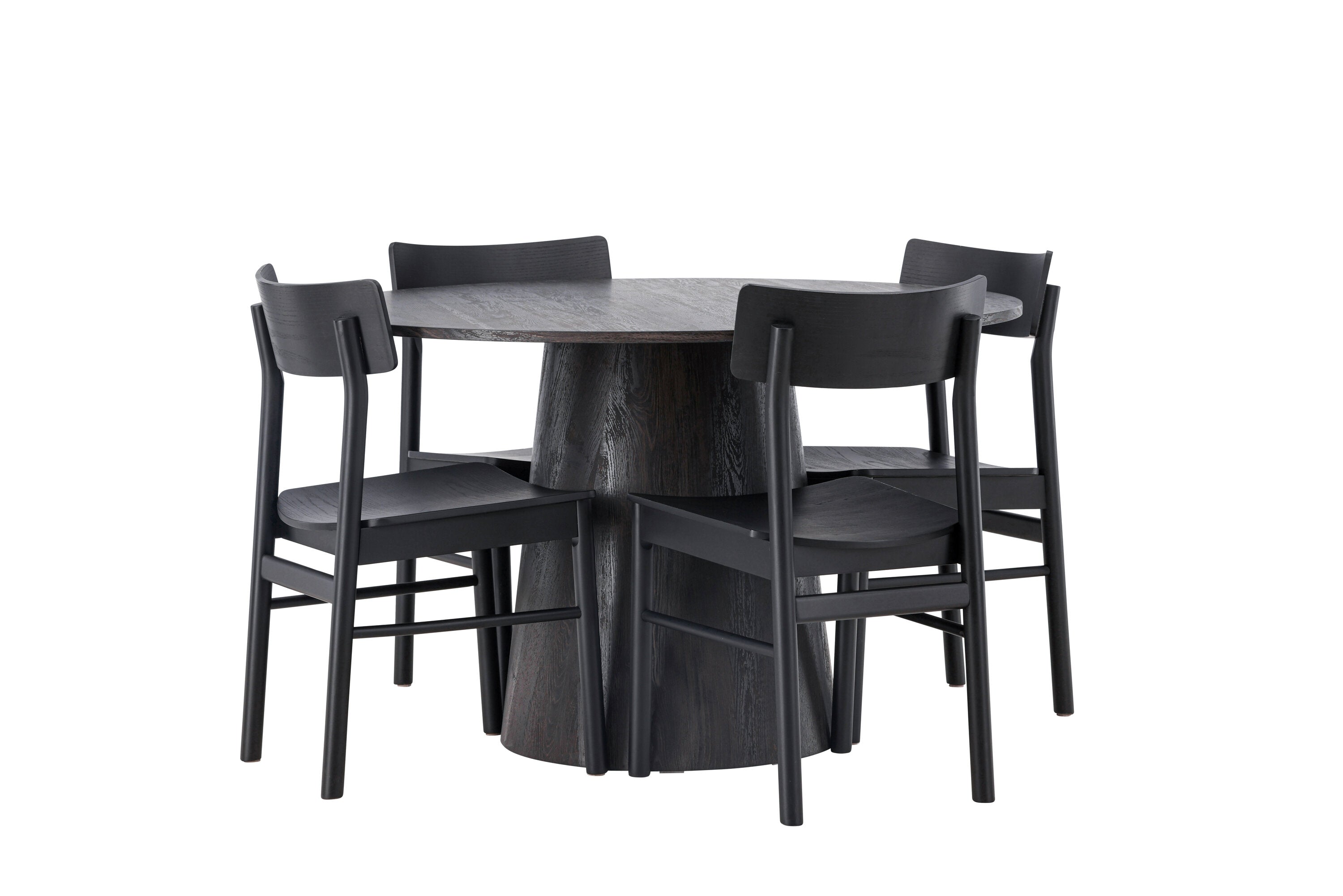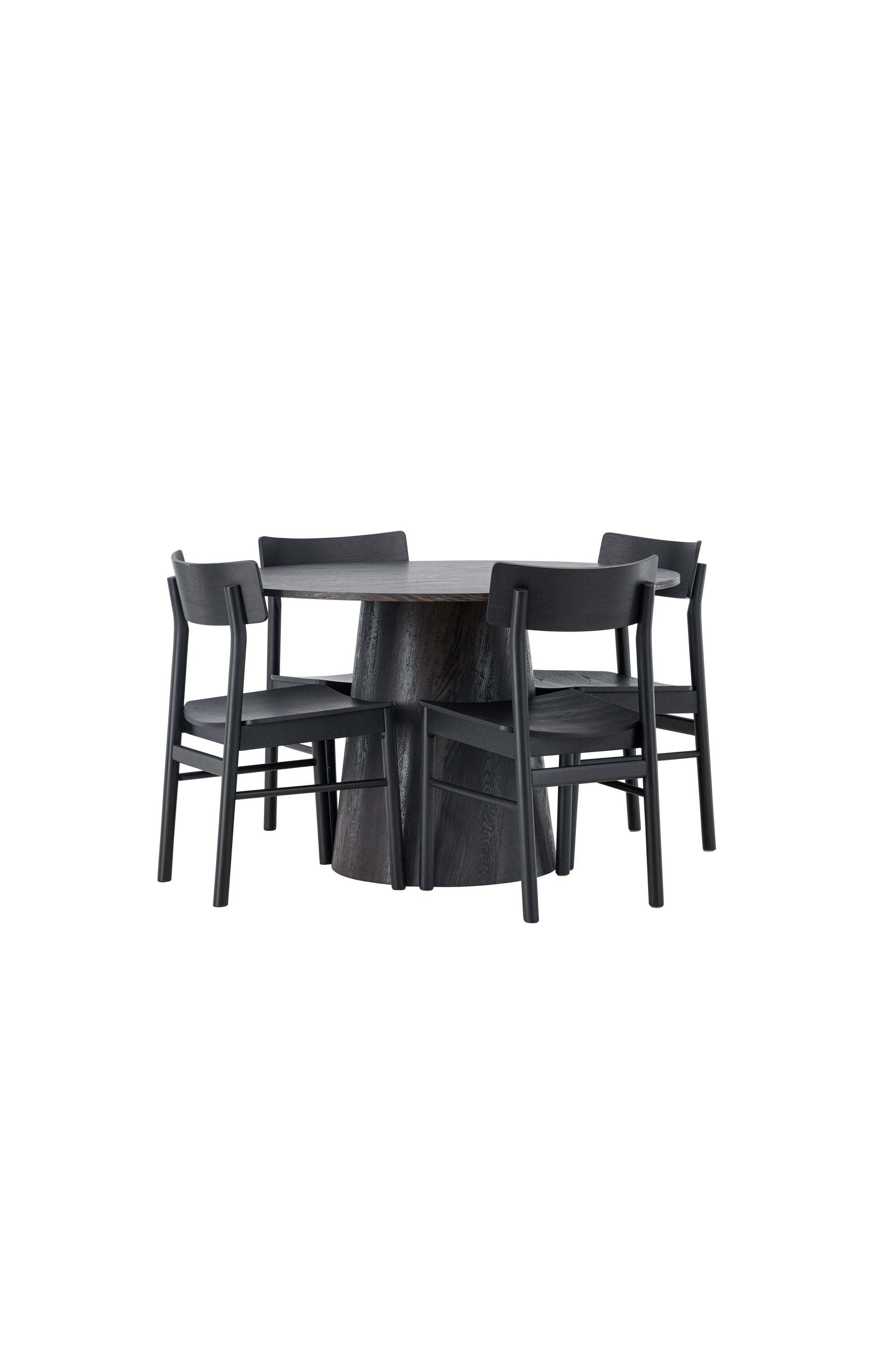 Skandinávský design v celé své kráse! Náš nádherný kulatý jídelní stůl Lanzo má celkový design z hnědé MDF s tenkou deskou a krouceným válcovým rámem, který je vycentrován pod stolem. Zde ve vkusné kombinaci s moderními jídelními židlemi ze série Montros. Židle má klasický a nostalgický design s rovnými severskými tvary, celoplošně vyrobena z černého kaučukovníku. Jednoduše, dokonalá shoda! Průměr stolu: 120 cm.