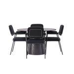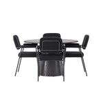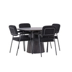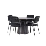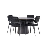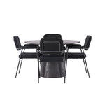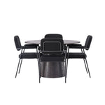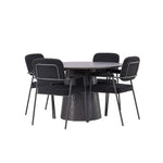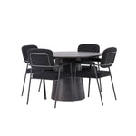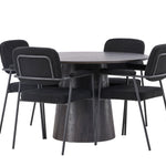Vytvořte si moderní poutač v obývacím pokoji! Náš nádherný kulatý jídelní stůl Lanzo má celkový design z hnědé MDF s tenkou deskou a zkrouceným válcovým rámem, který je vycentrován pod středem stolu. Zde s našimi fantastickými černými jídelními židlemi ze série Yesterday. Židle má celočalouněný sedák v černé buklé a úzké nohy s integrovanými područkami v černém kovu. Měkké sedadlo je čalouněné pro větší pohodlí. Průměr stolu: 120 cm.