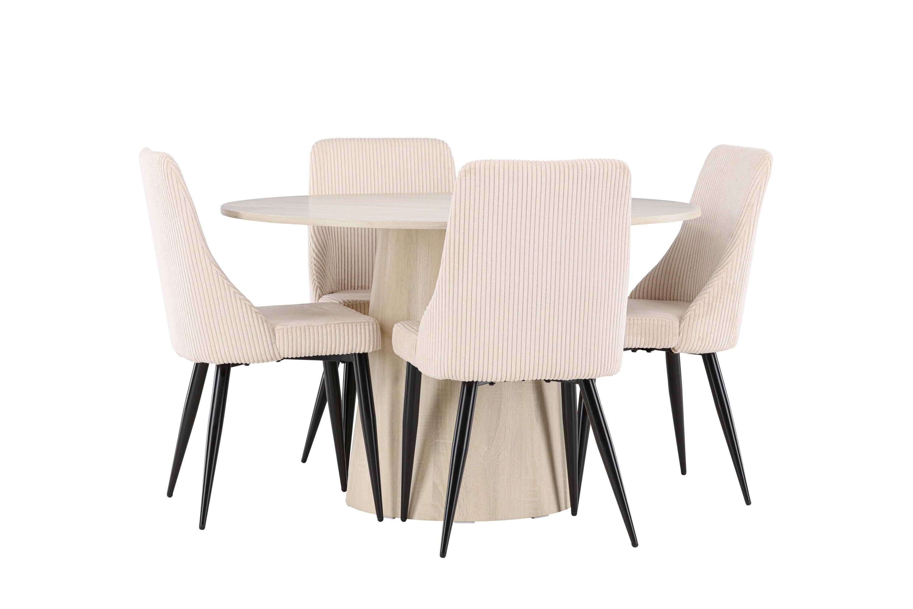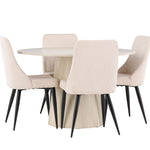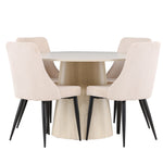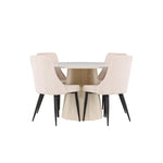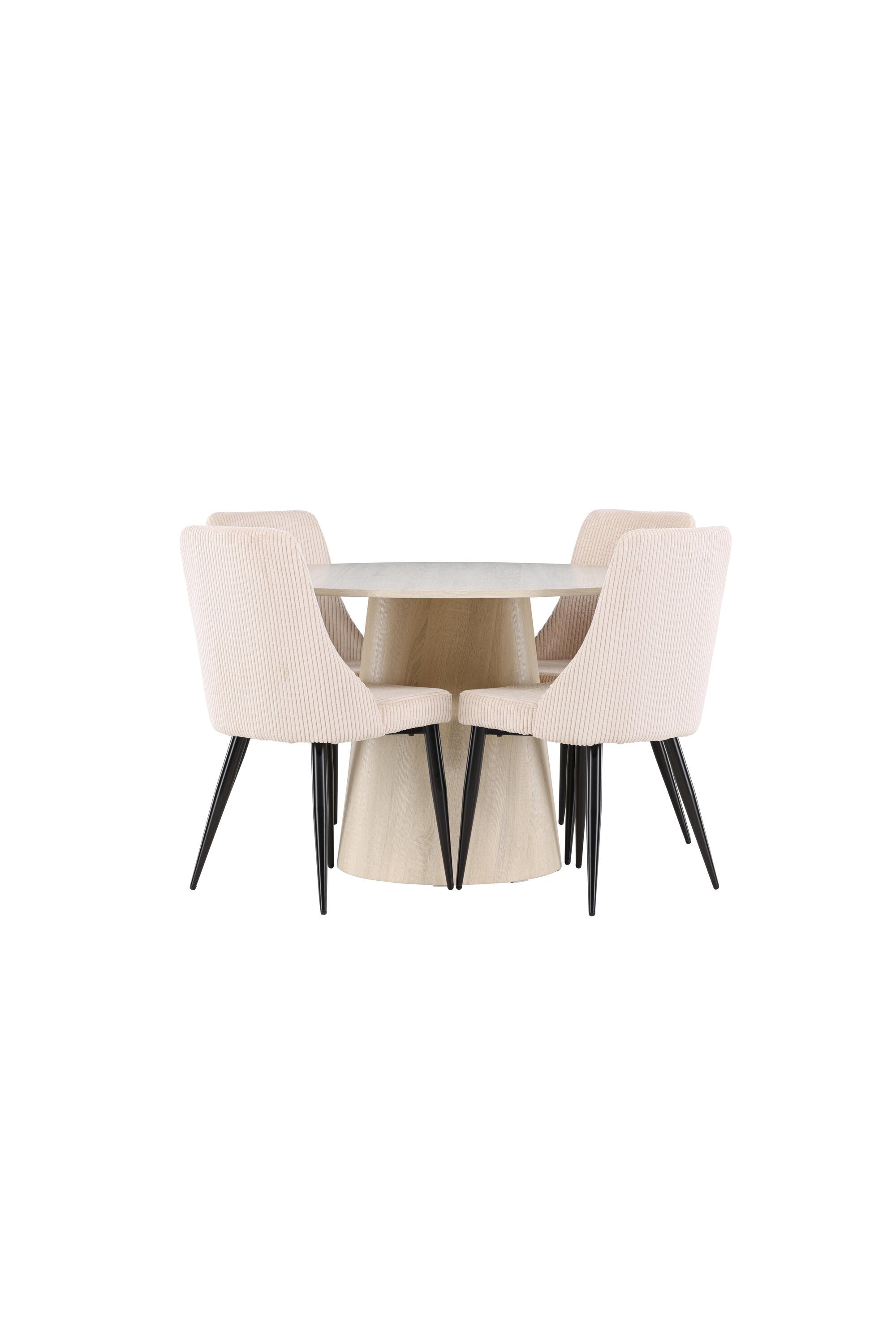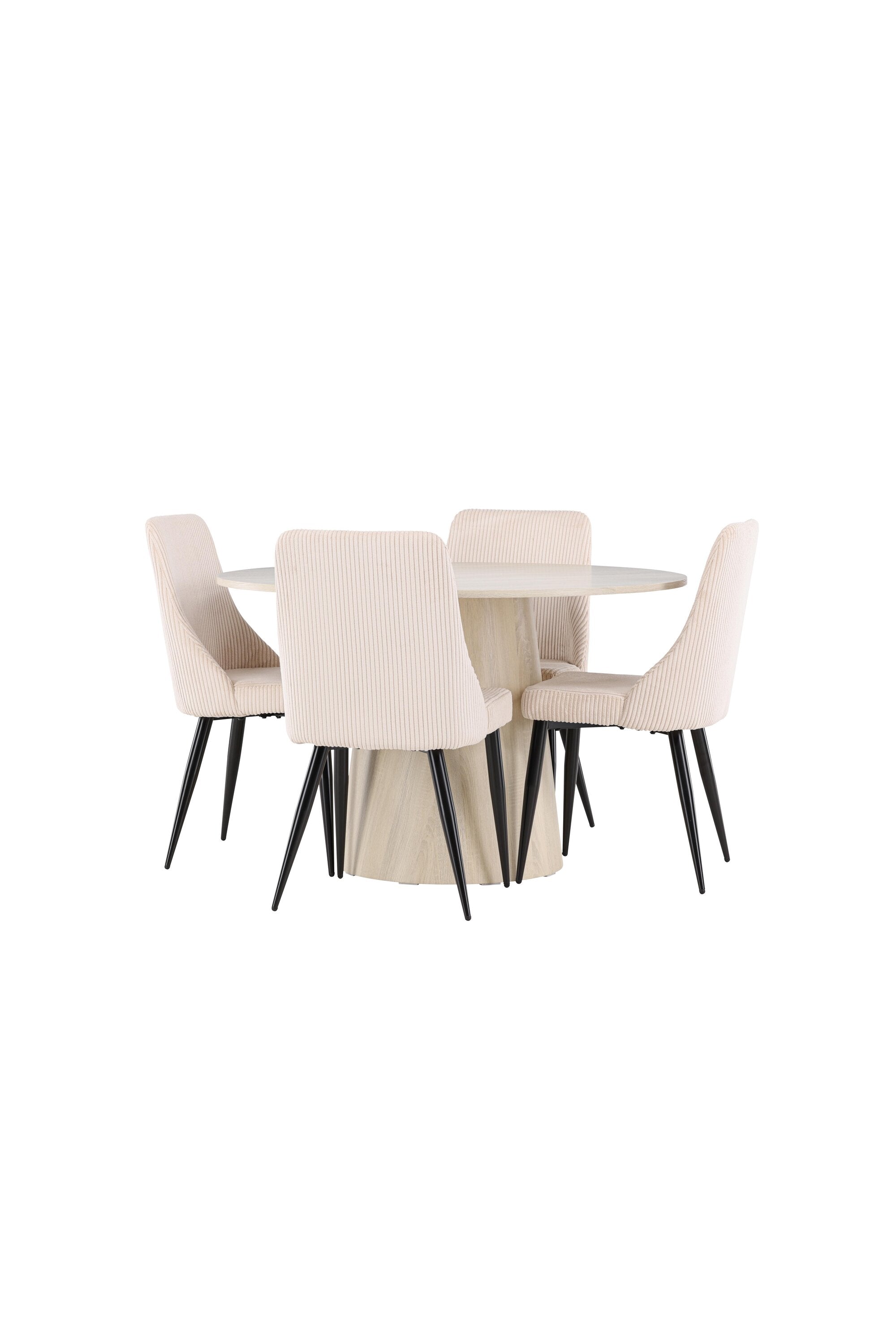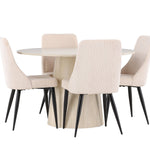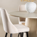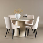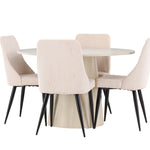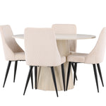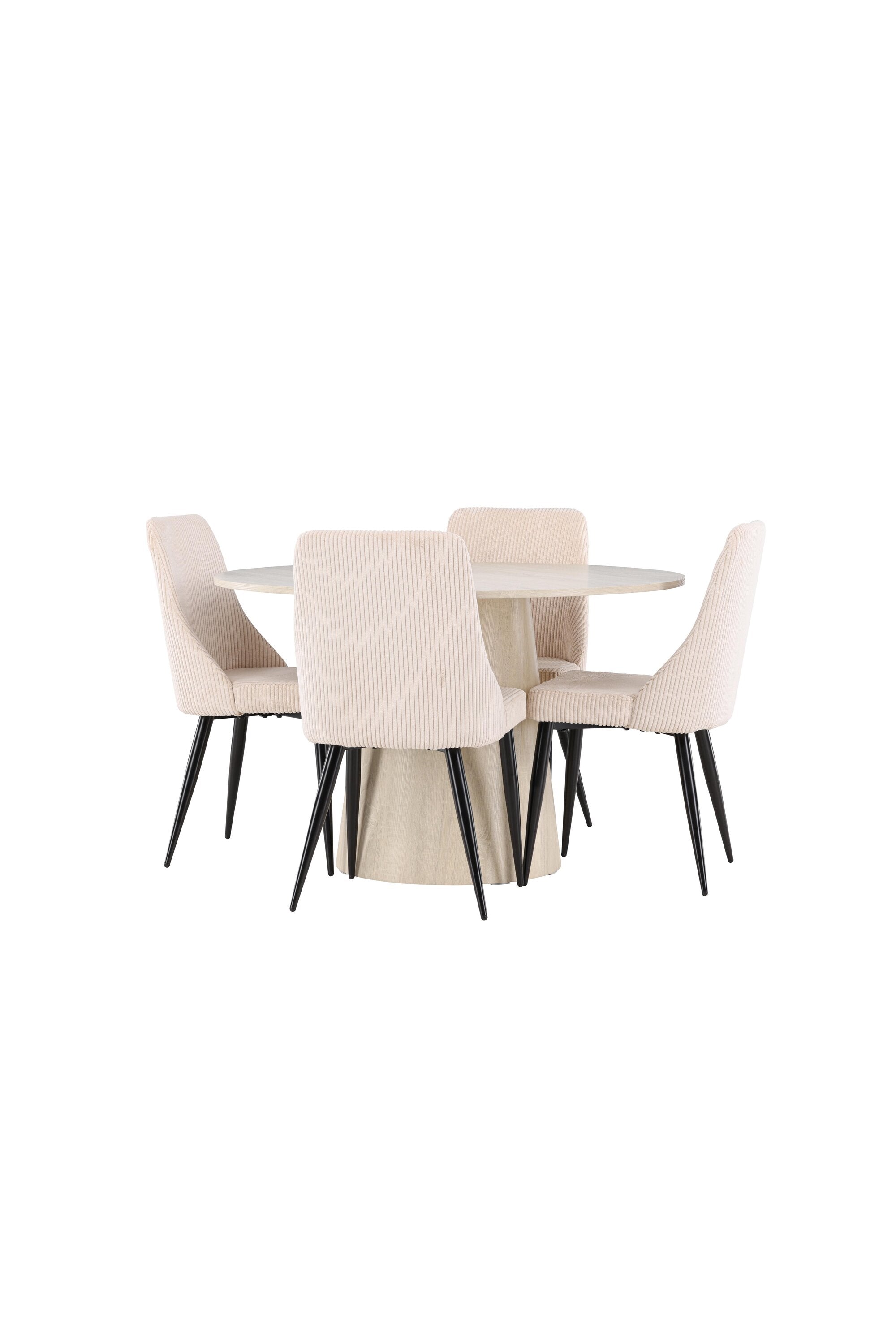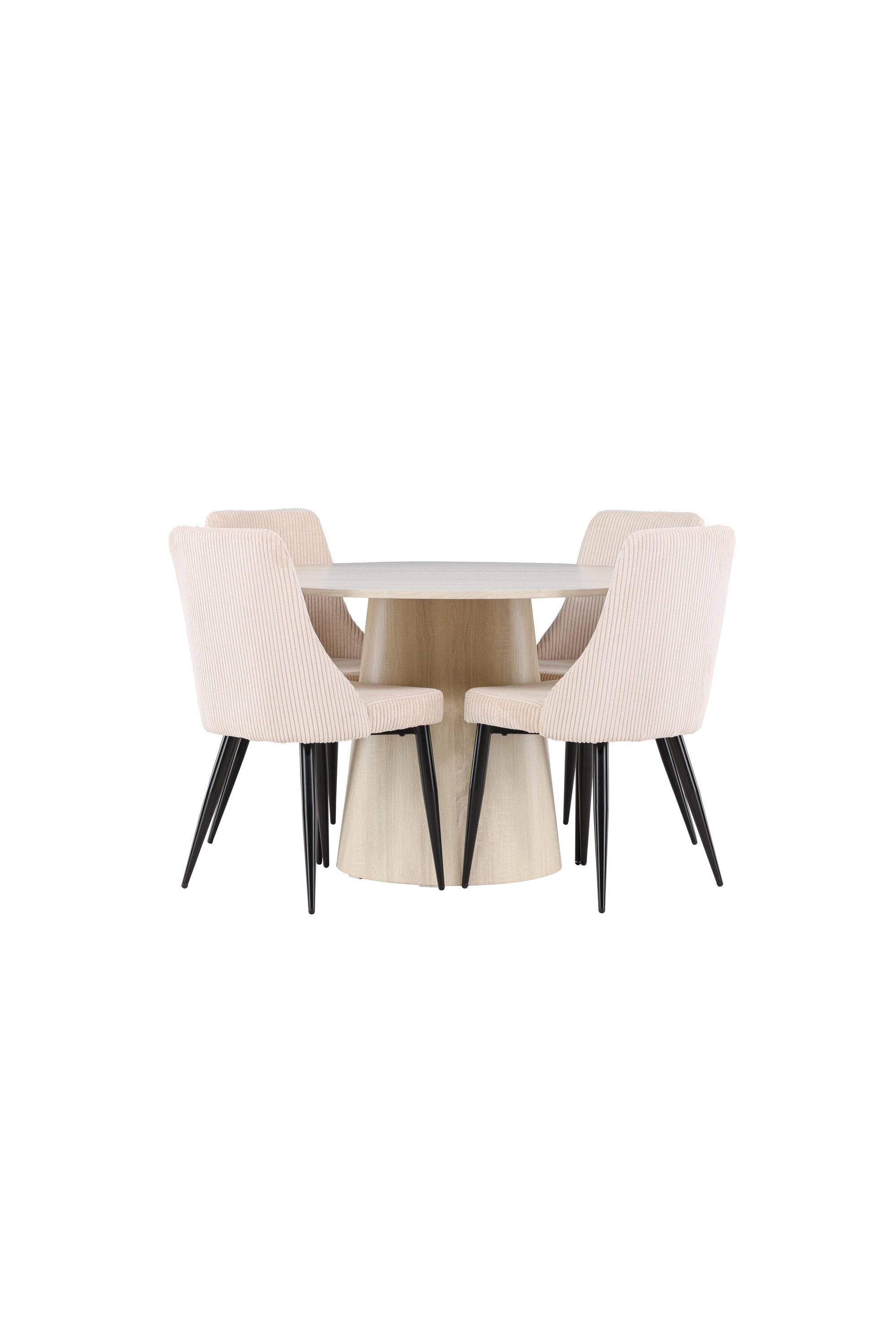 Vytvořte si stylový a příjemný jídelní kout s naší elegantní jídelní sadou, která kombinuje krásný stůl Lanzo se sofistikovanými židlemi Leone. Tato jídelní souprava, která je ideální pro každodenní večeři i slavnostní příležitosti, dodá vaší jídelně moderní a harmonický nádech. Stůl Lanzo, vyrobený z nabílené MDF desky, má světlou a svěží barvu, která dodá vaší jídelně čistou a příjemnou atmosféru. Stůl s velkorysým průměrem 120 cm nabízí dostatek prostoru pro jídlo a rozhovory, přičemž jeho kulatý tvar vytváří vyvážené a společenské prostředí. Robustní konstrukce stolu zajišťuje dlouhodobé používání a stabilitu. Čtyři židle Leone skvěle doplňují stůl se svými elegantními béžovými manšestrovými sedáky. Tyto židle nabízejí pohodlí i styl, takže jsou ideální pro dlouhé a příjemné večeře s rodinou a přáteli. Jejich moderní design s vysokými opěradly a měkkými sedáky dodá vaší jídelně sofistikovaný a moderní nádech. Tato jídelní souprava je dokonalou kombinací estetiky a funkčnosti, takže je vynikající volbou pro ty, kteří hledají elegantní a pohodlný jídelní kout. Vylepšete svou jídelnu kombinací stolu Lanzo a židlí Leone a vytvořte si místo, kde se budou sdílet vzpomínky a radost.