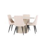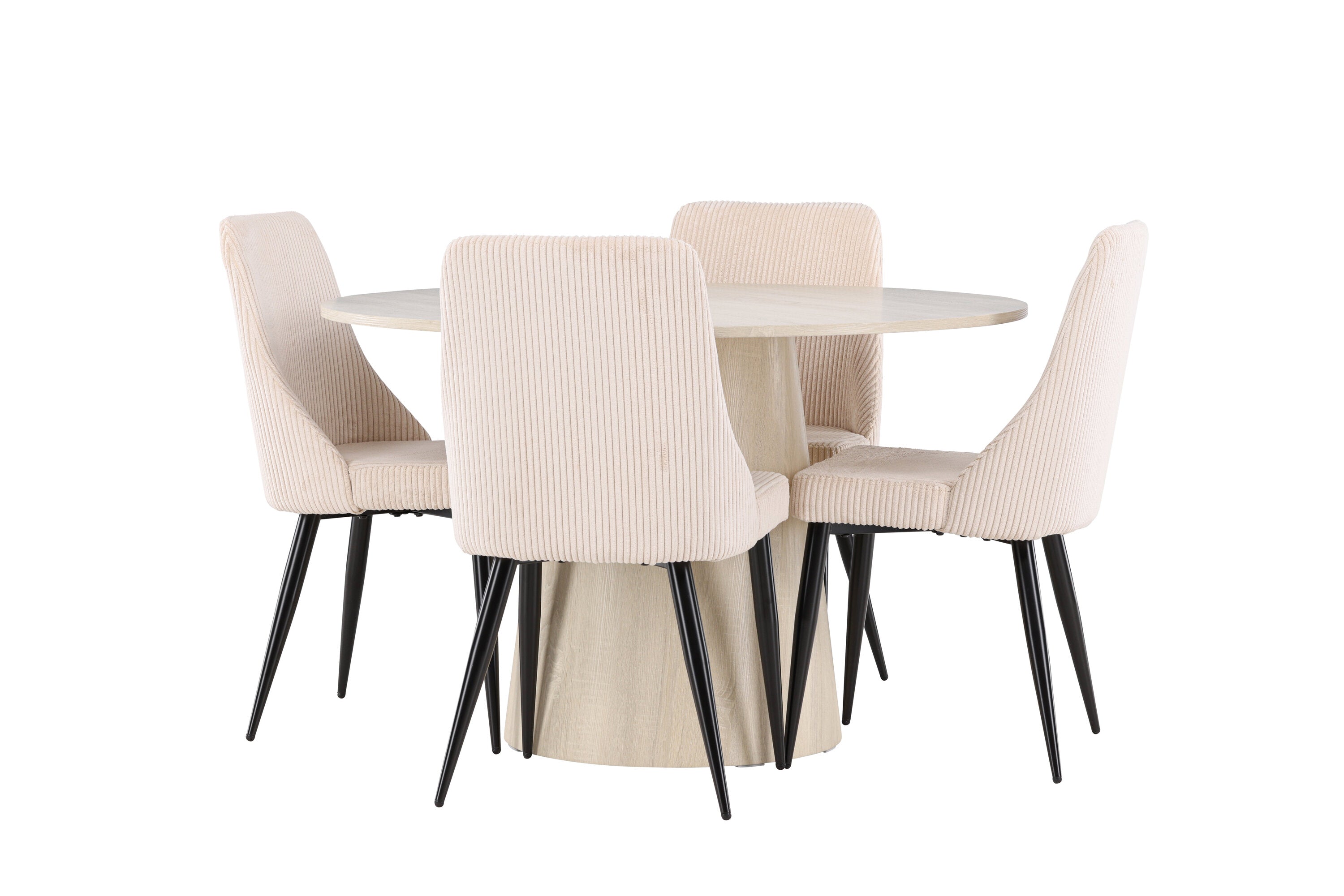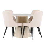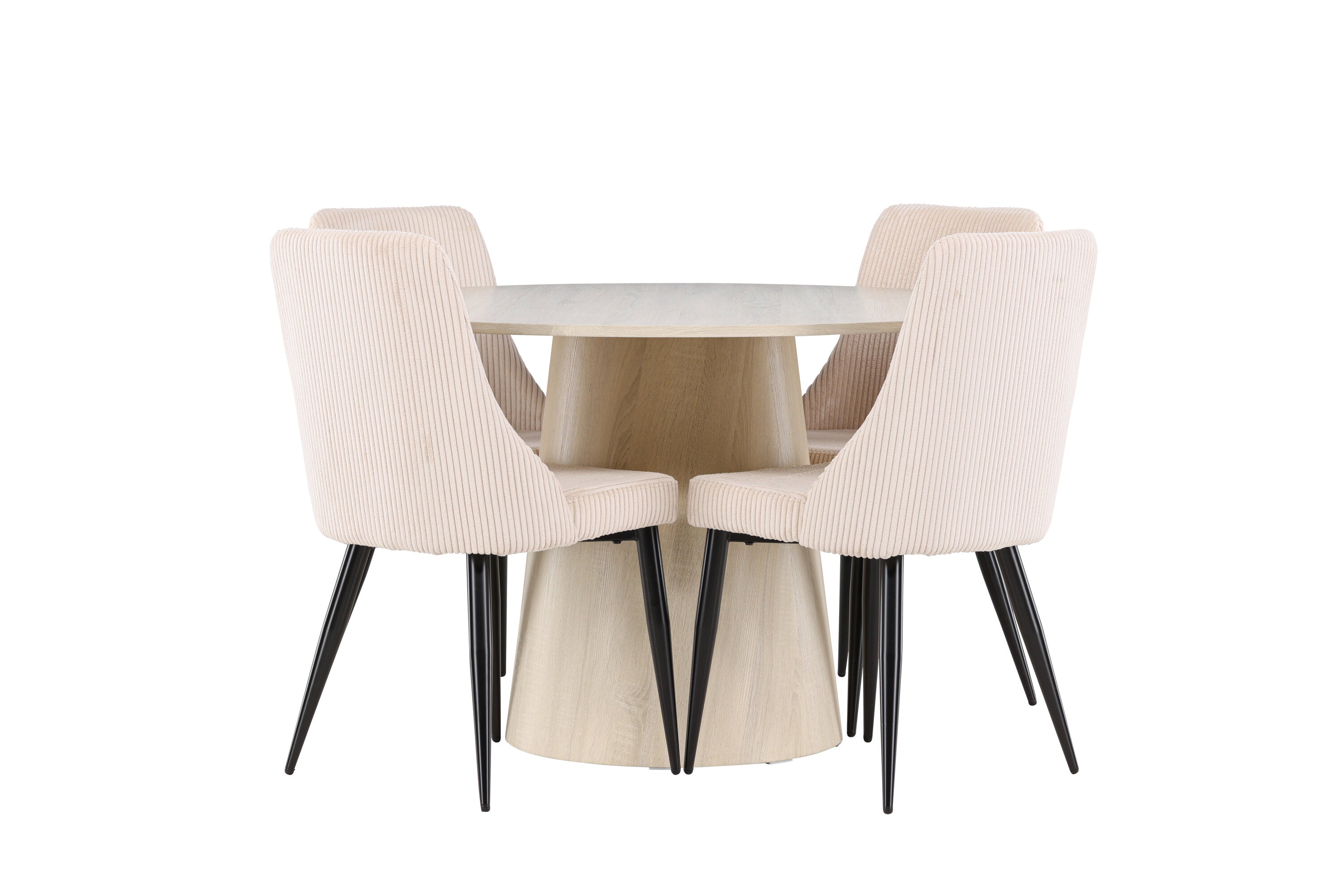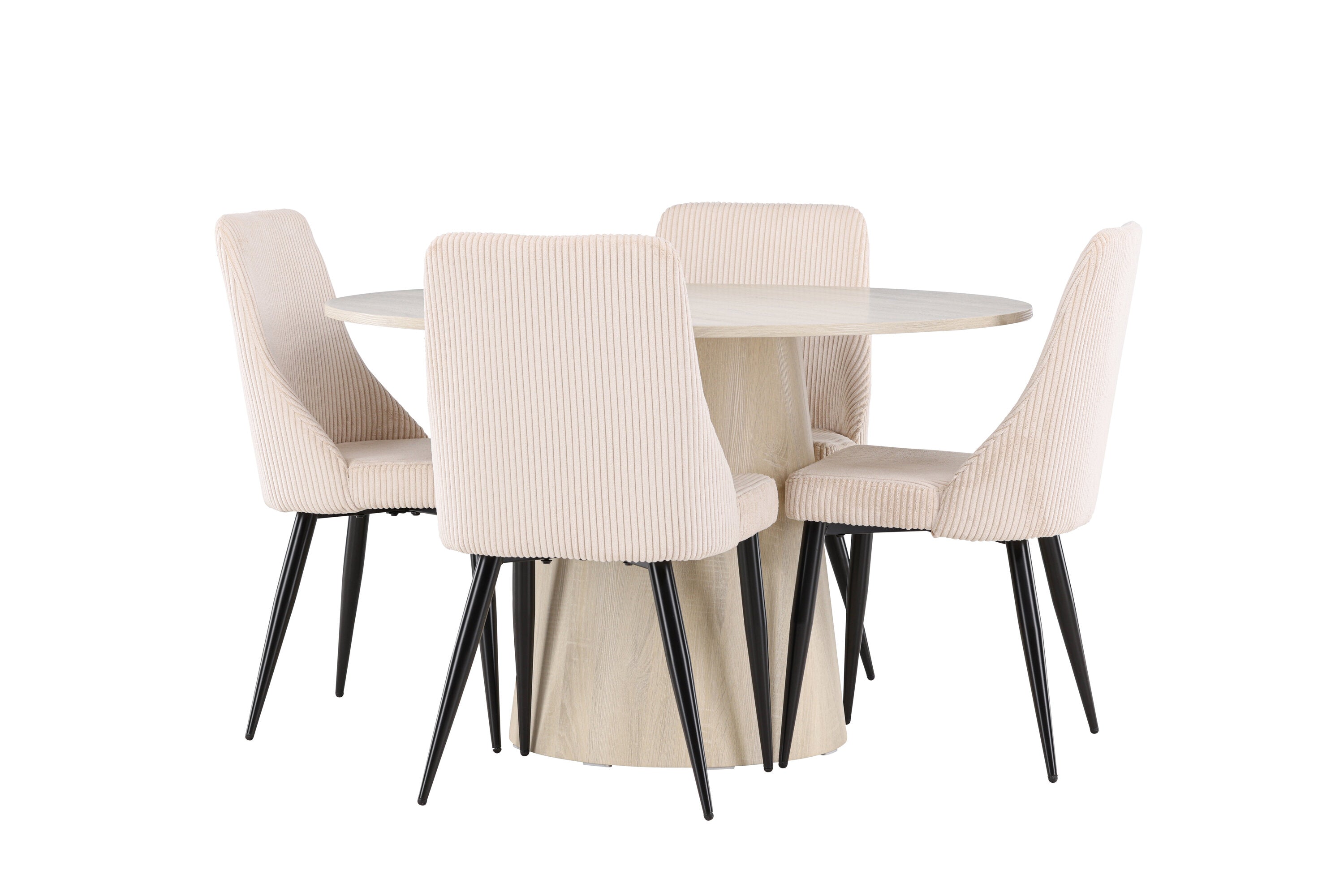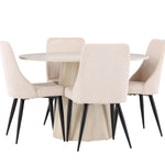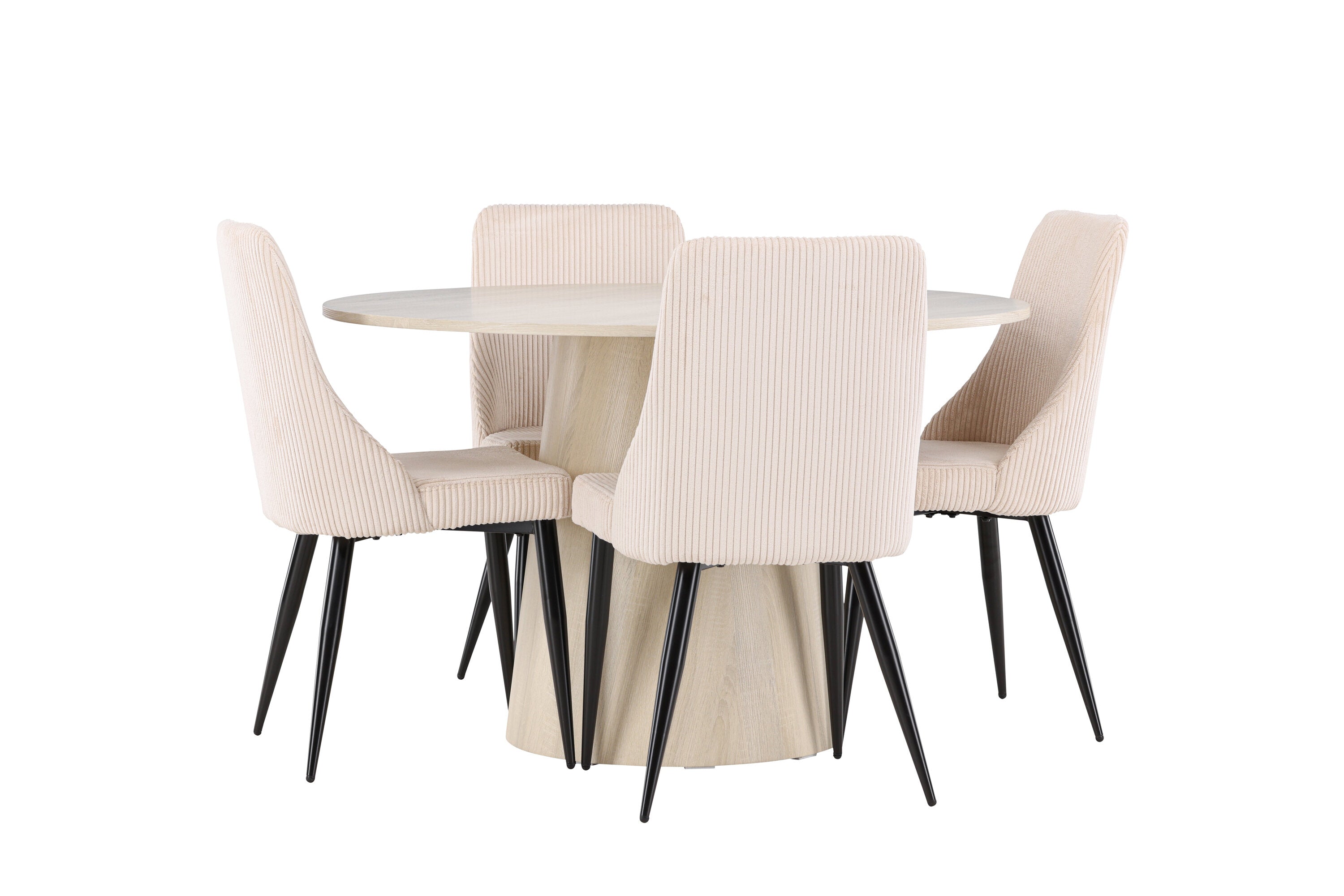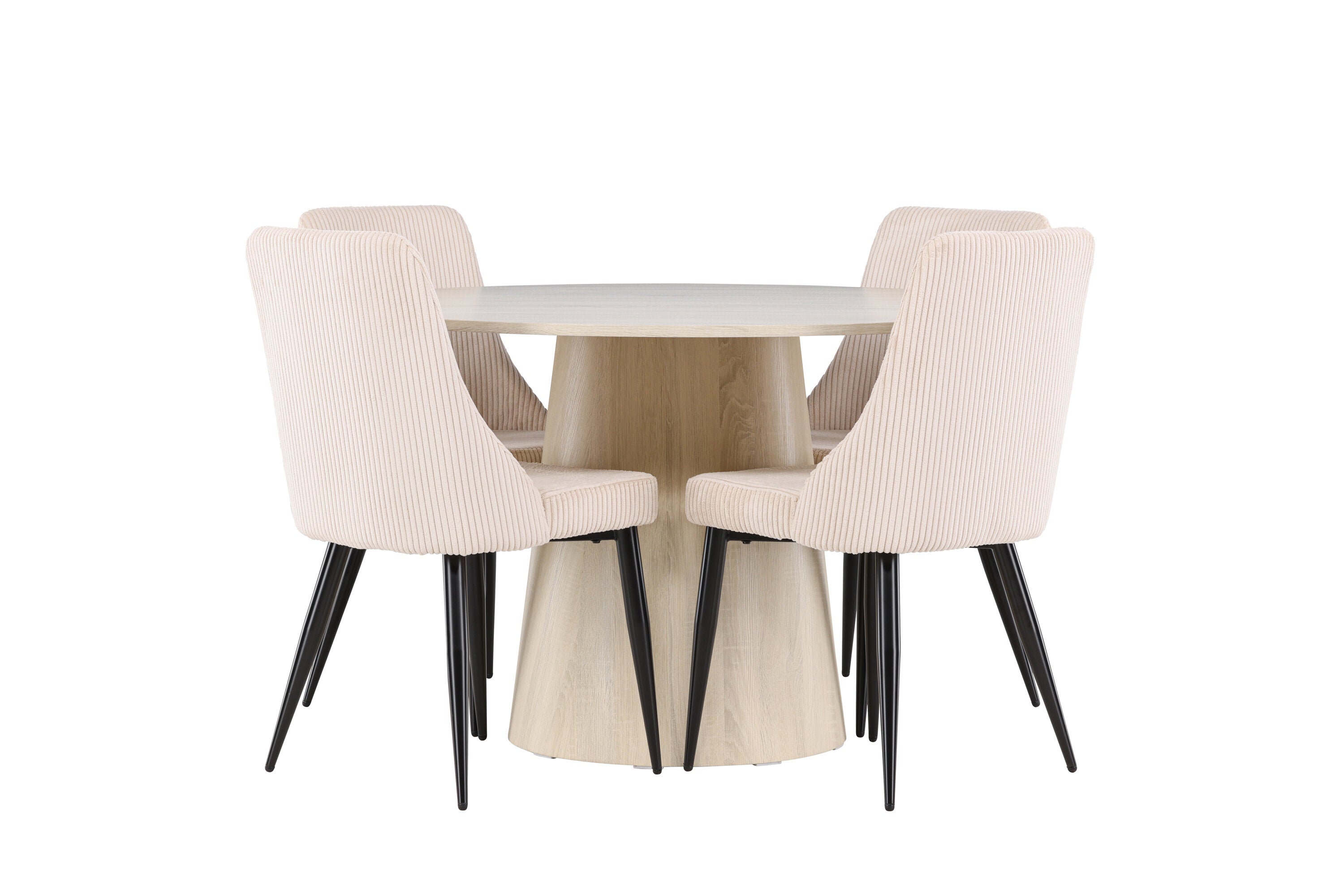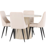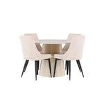 Vytvořte si stylový a příjemný jídelní kout s naší elegantní jídelní sadou, která kombinuje krásný stůl Lanzo se sofistikovanými židlemi Leone. Tato jídelní souprava, která je ideální pro každodenní večeři i slavnostní příležitosti, dodá vaší jídelně moderní a harmonický nádech. Stůl Lanzo, vyrobený z nabílené MDF desky, má světlou a svěží barvu, která dodá vaší jídelně čistou a příjemnou atmosféru. Stůl s velkorysým průměrem 120 cm nabízí dostatek prostoru pro jídlo a rozhovory, přičemž jeho kulatý tvar vytváří vyvážené a společenské prostředí. Robustní konstrukce stolu zajišťuje dlouhodobé používání a stabilitu. Čtyři židle Leone skvěle doplňují stůl se svými elegantními béžovými manšestrovými sedáky. Tyto židle nabízejí pohodlí i styl, takže jsou ideální pro dlouhé a příjemné večeře s rodinou a přáteli. Jejich moderní design s vysokými opěradly a měkkými sedáky dodá vaší jídelně sofistikovaný a moderní nádech. Tato jídelní souprava je dokonalou kombinací estetiky a funkčnosti, takže je vynikající volbou pro ty, kteří hledají elegantní a pohodlný jídelní kout. Vylepšete svou jídelnu kombinací stolu Lanzo a židlí Leone a vytvořte si místo, kde se budou sdílet vzpomínky a radost.