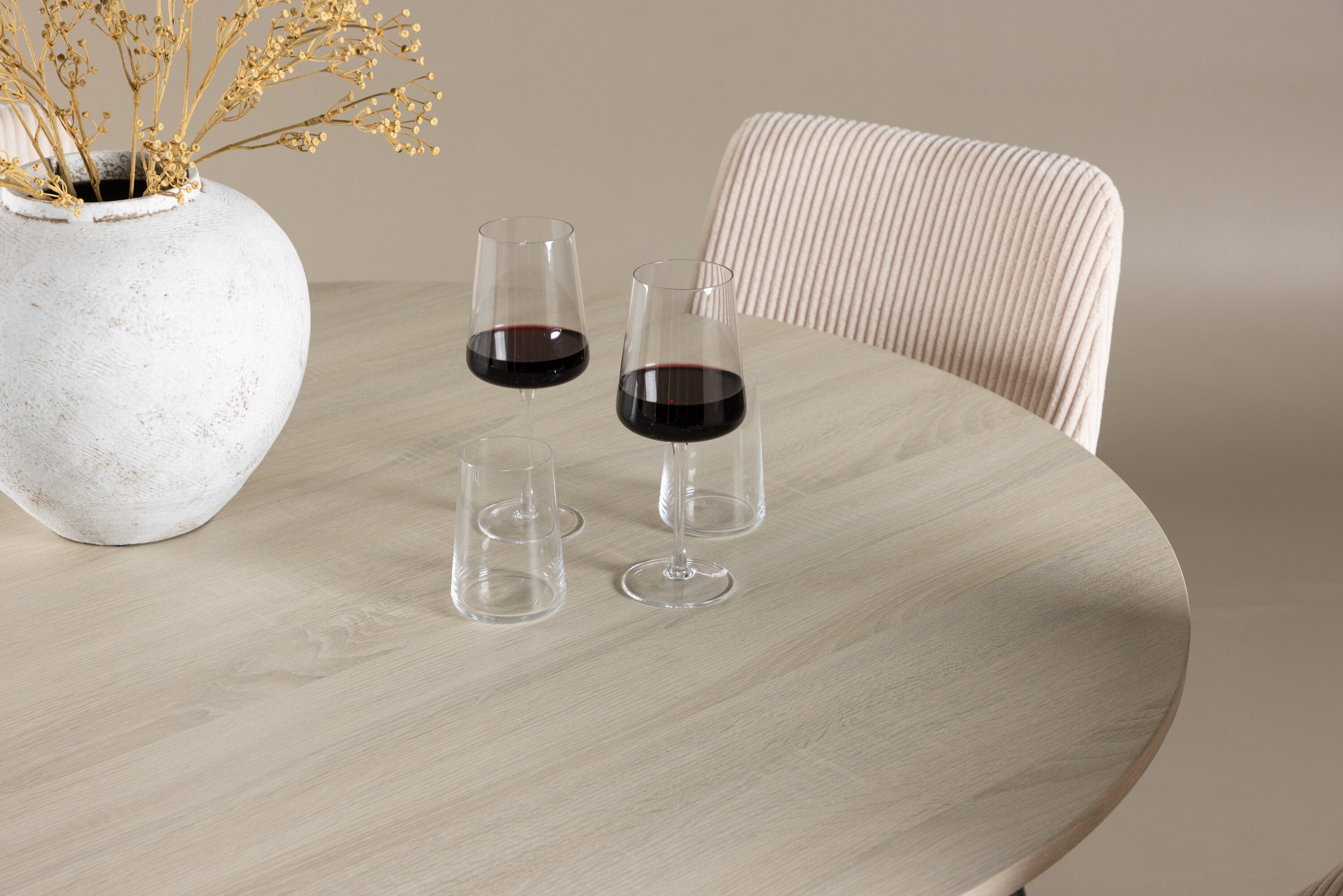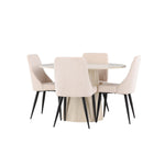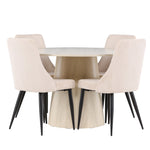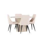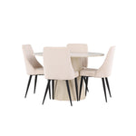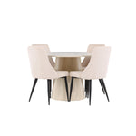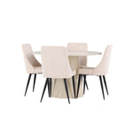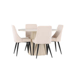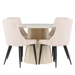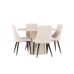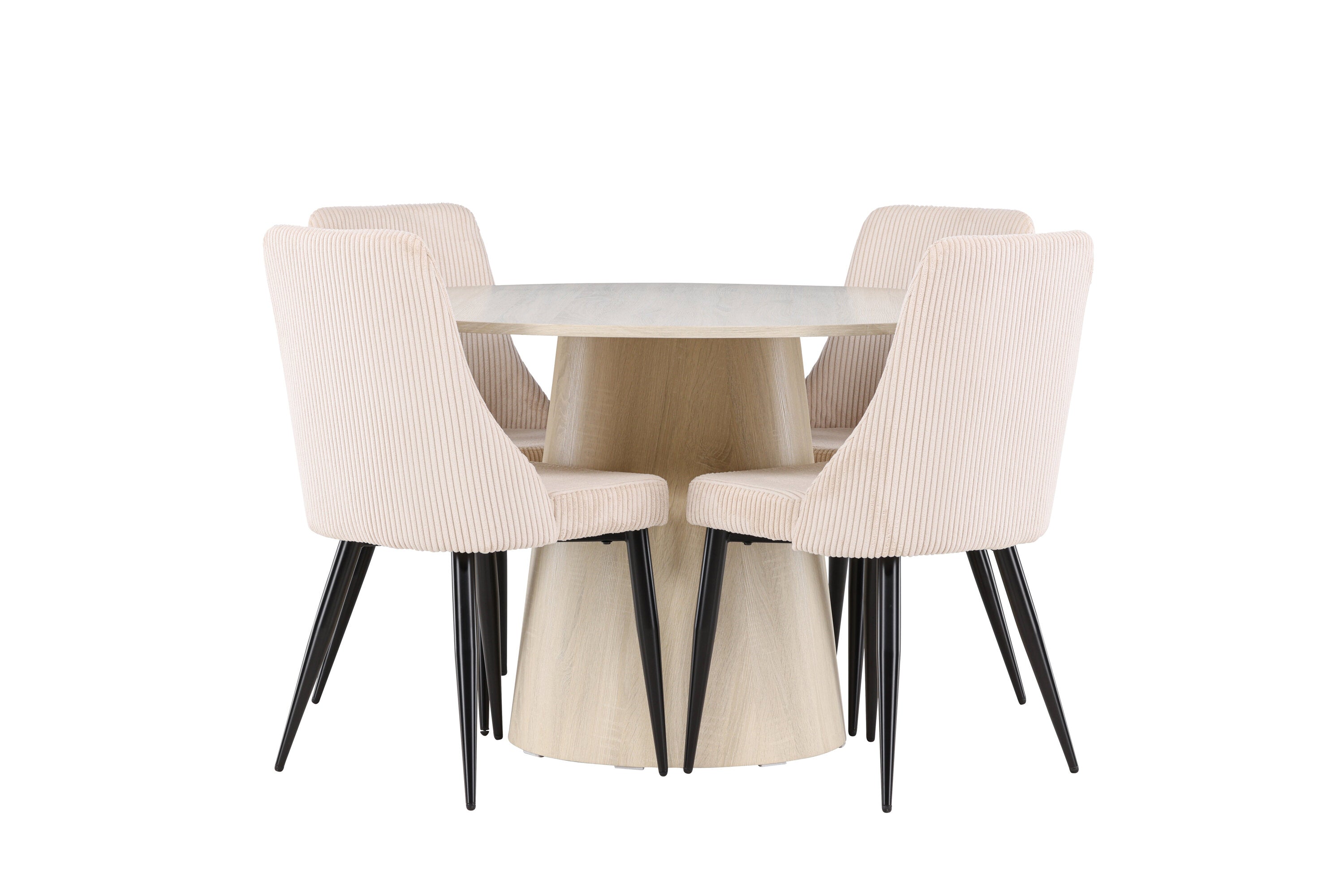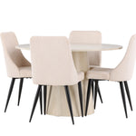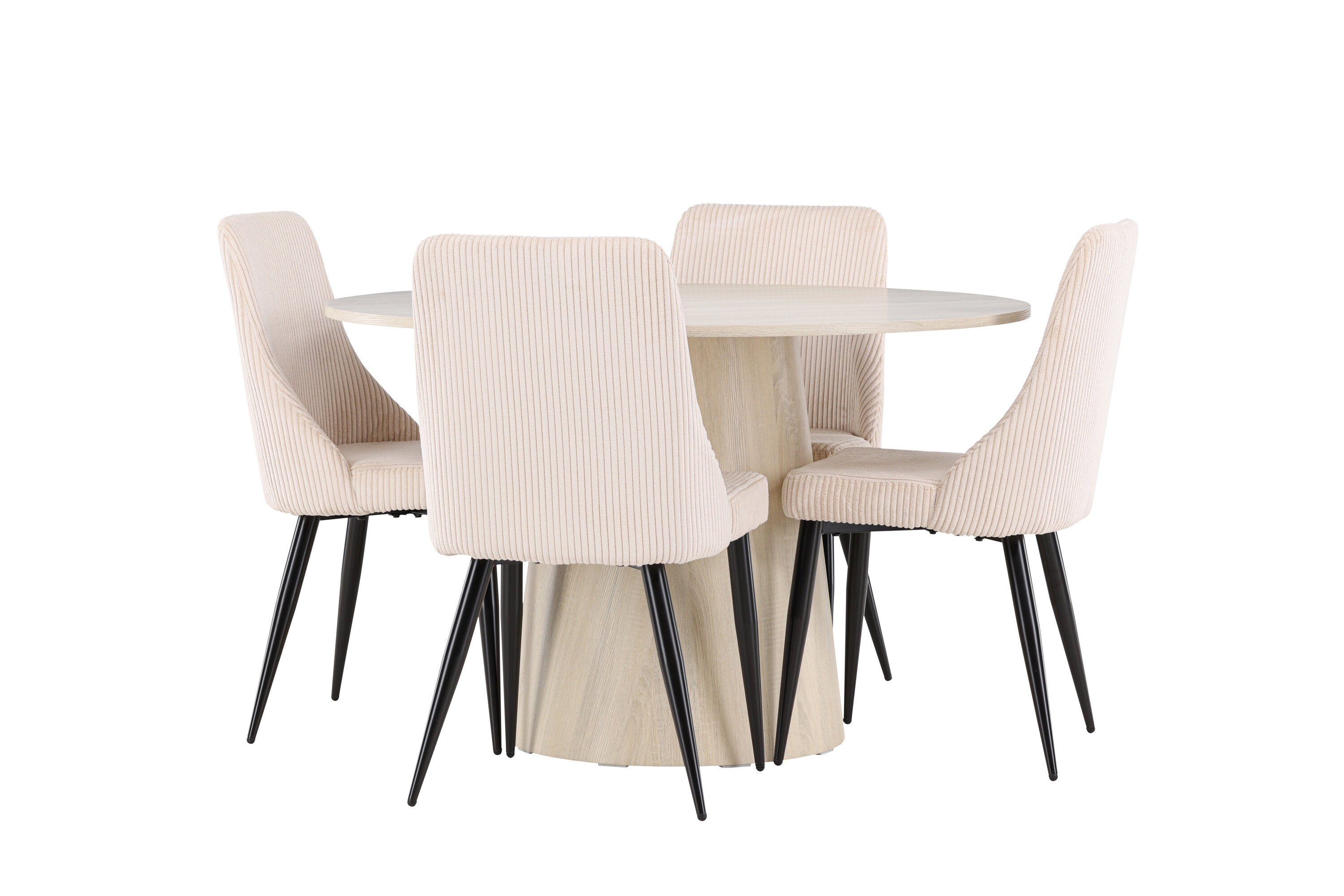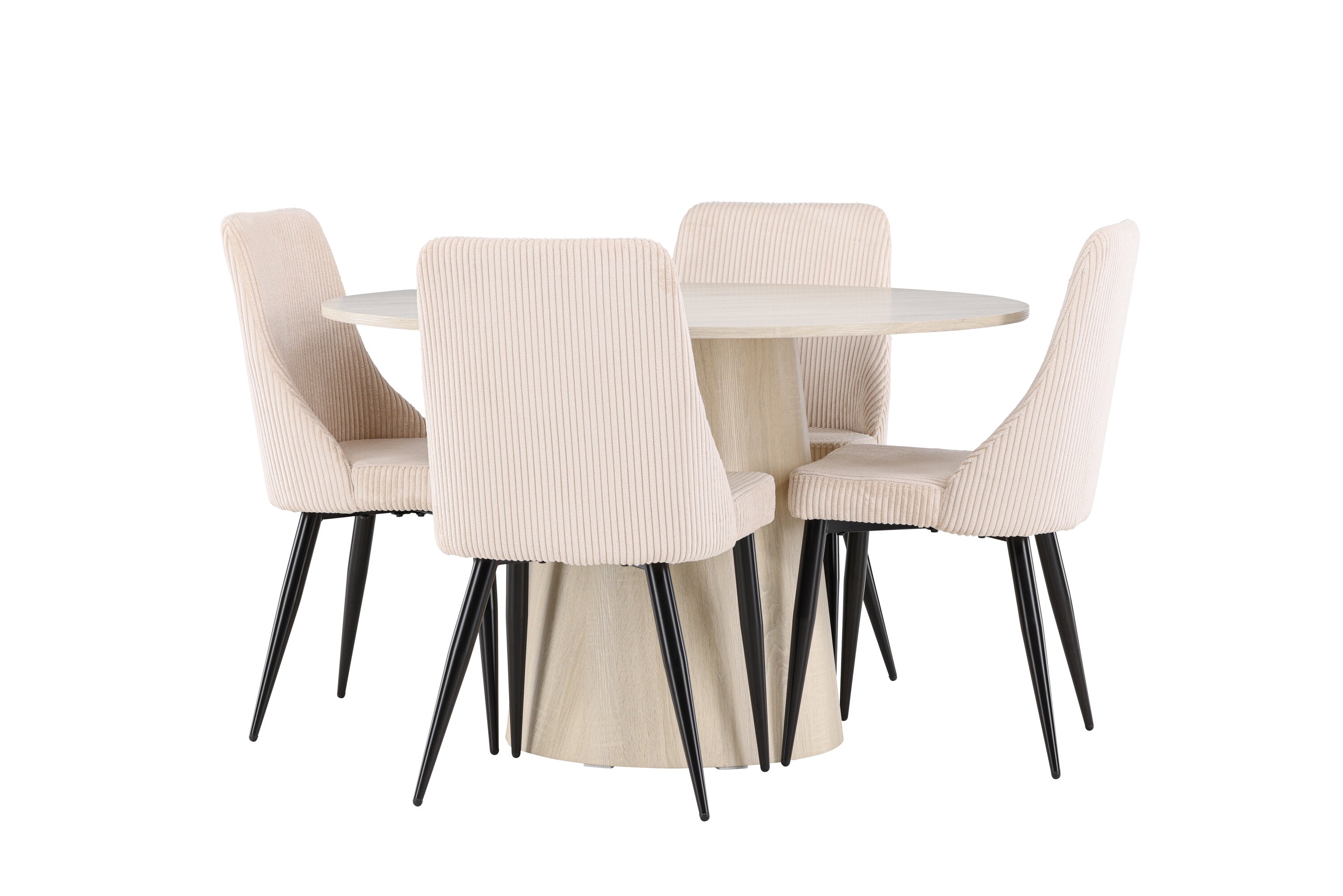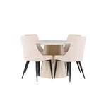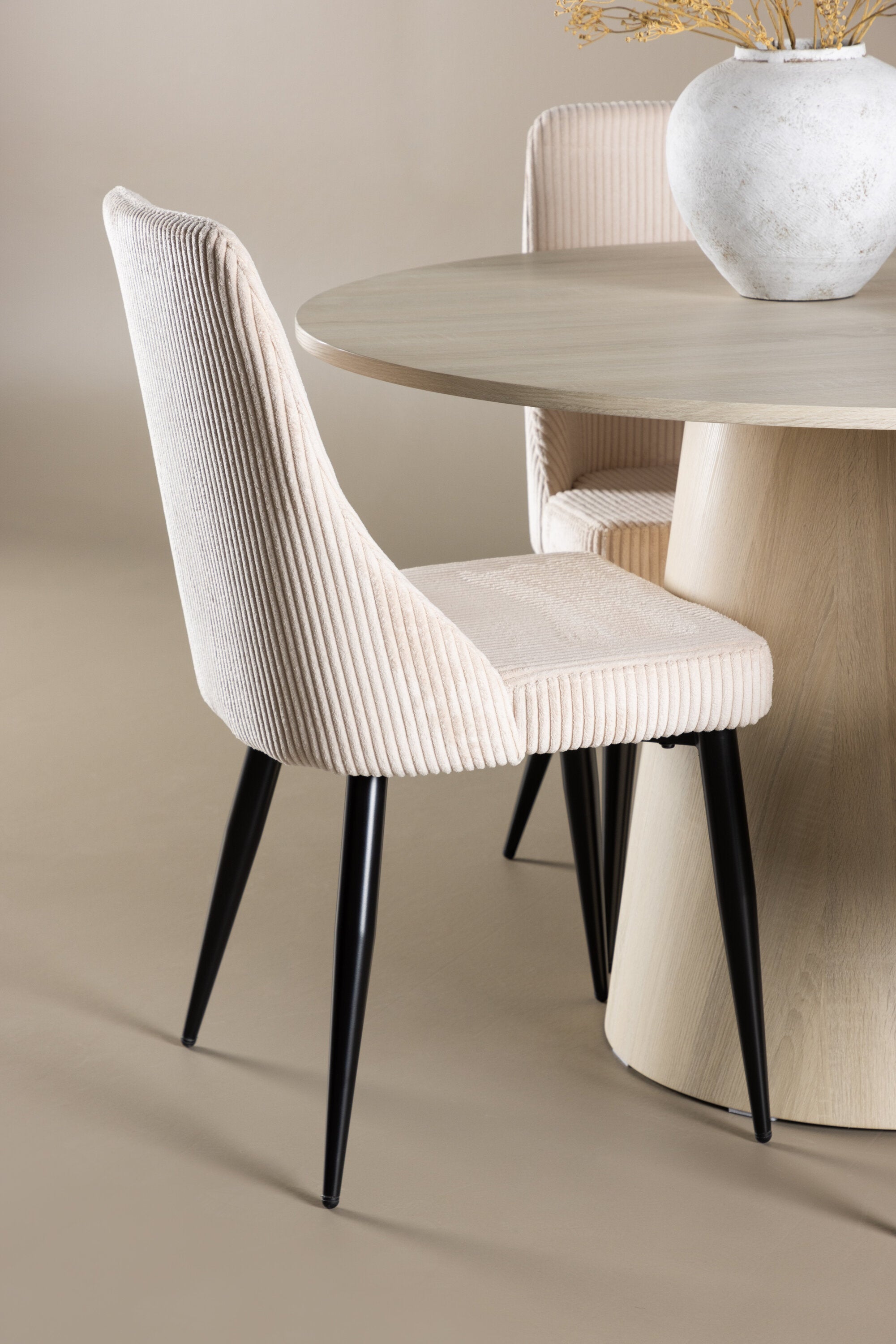 Vytvořte si stylový a příjemný jídelní kout s naší elegantní jídelní sadou, která kombinuje krásný stůl Lanzo se sofistikovanými židlemi Leone. Tato jídelní souprava, která je ideální pro každodenní večeři i slavnostní příležitosti, dodá vaší jídelně moderní a harmonický nádech. Stůl Lanzo, vyrobený z nabílené MDF desky, má světlou a svěží barvu, která dodá vaší jídelně čistou a příjemnou atmosféru. Stůl s velkorysým průměrem 120 cm nabízí dostatek prostoru pro jídlo a rozhovory, přičemž jeho kulatý tvar vytváří vyvážené a společenské prostředí. Robustní konstrukce stolu zajišťuje dlouhodobé používání a stabilitu. Čtyři židle Leone skvěle doplňují stůl se svými elegantními béžovými manšestrovými sedáky. Tyto židle nabízejí pohodlí i styl, takže jsou ideální pro dlouhé a příjemné večeře s rodinou a přáteli. Jejich moderní design s vysokými opěradly a měkkými sedáky dodá vaší jídelně sofistikovaný a moderní nádech. Tato jídelní souprava je dokonalou kombinací estetiky a funkčnosti, takže je vynikající volbou pro ty, kteří hledají elegantní a pohodlný jídelní kout. Vylepšete svou jídelnu kombinací stolu Lanzo a židlí Leone a vytvořte si místo, kde se budou sdílet vzpomínky a radost.