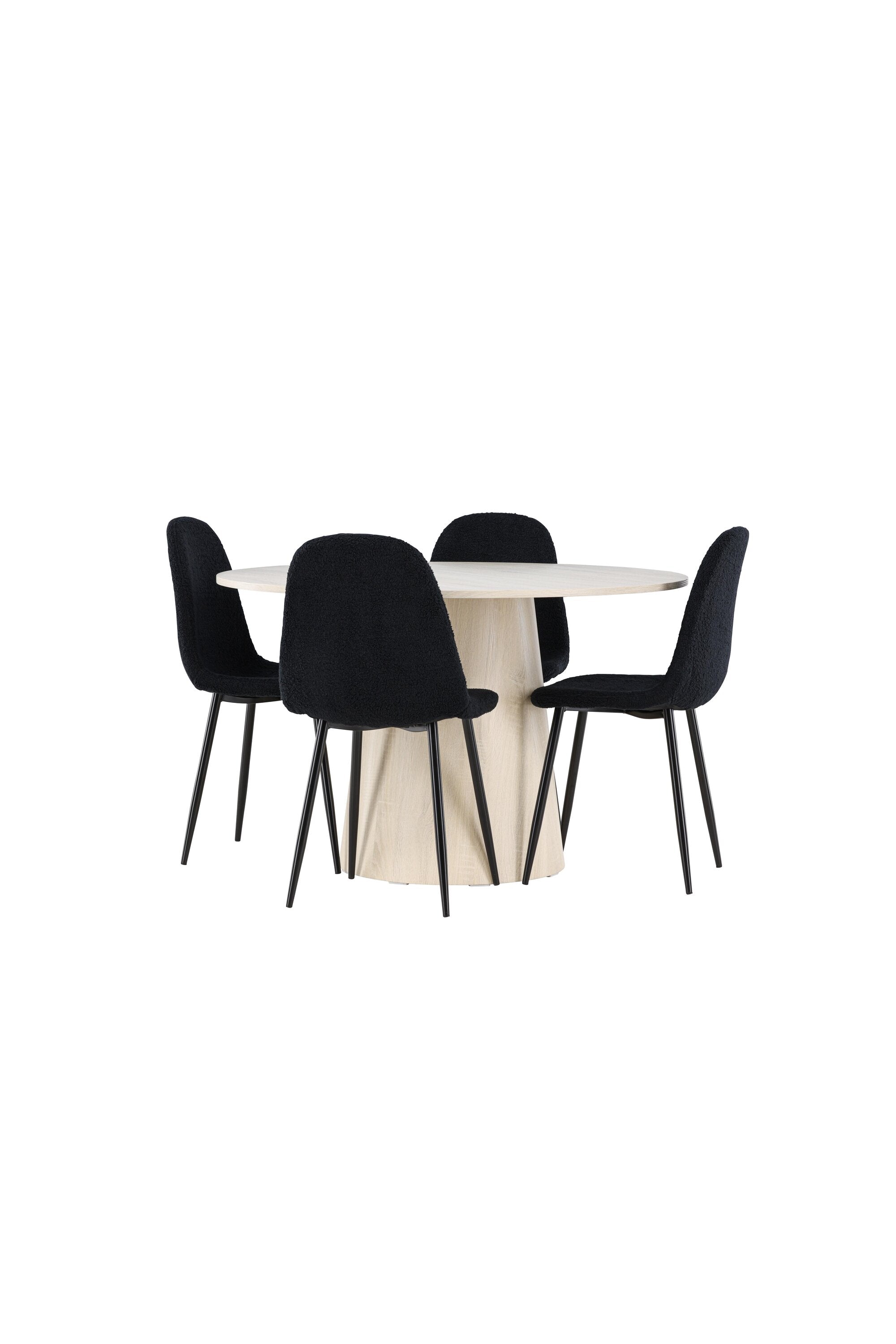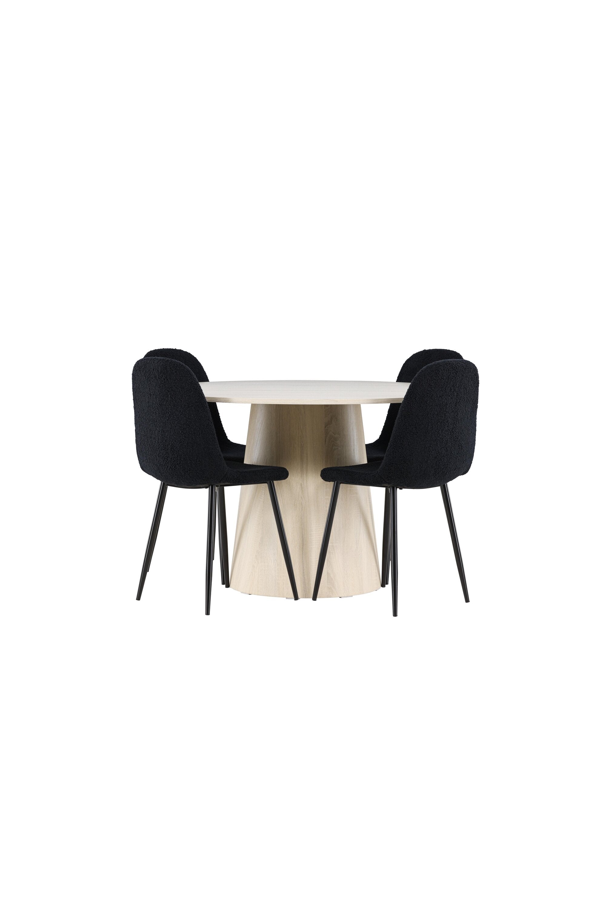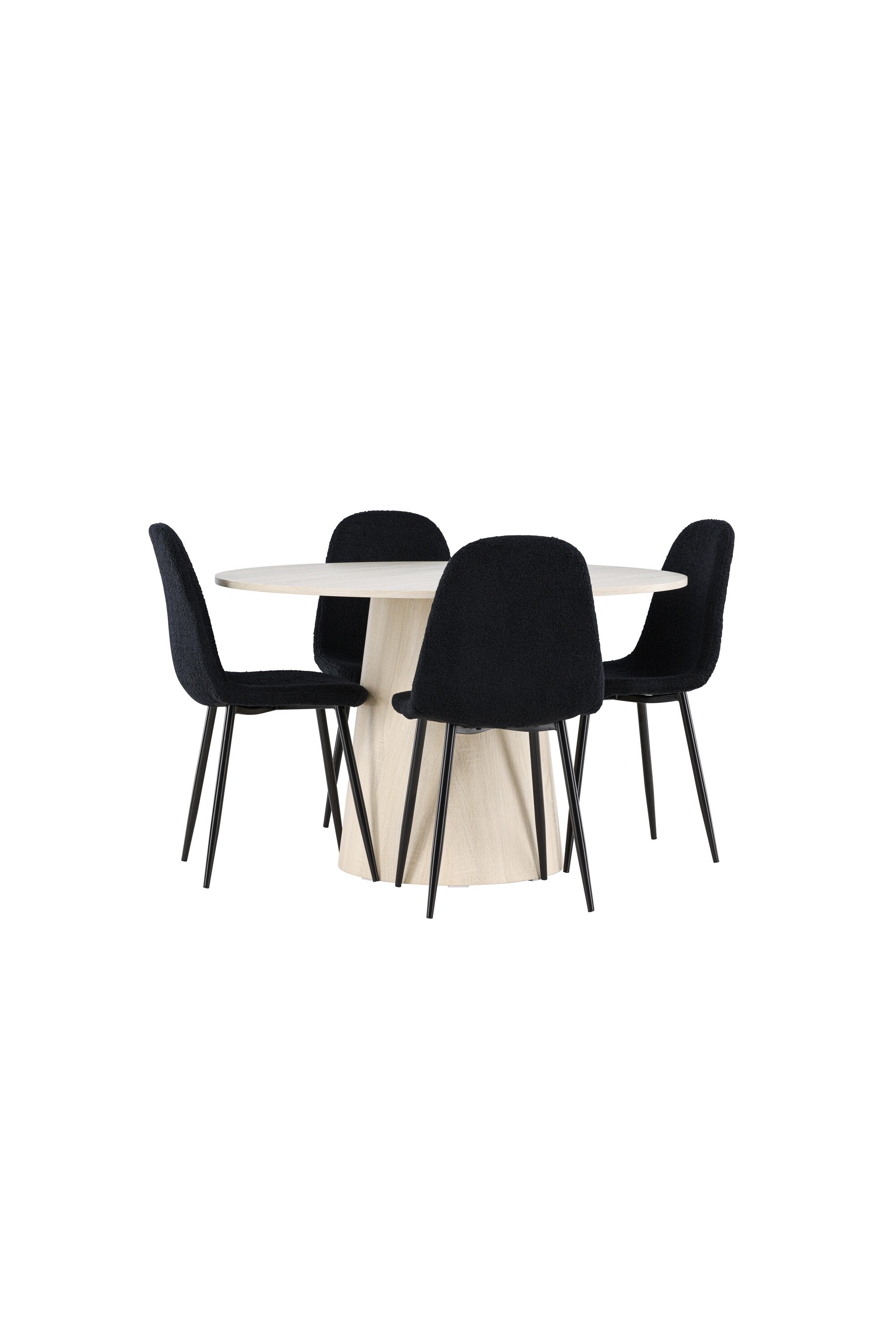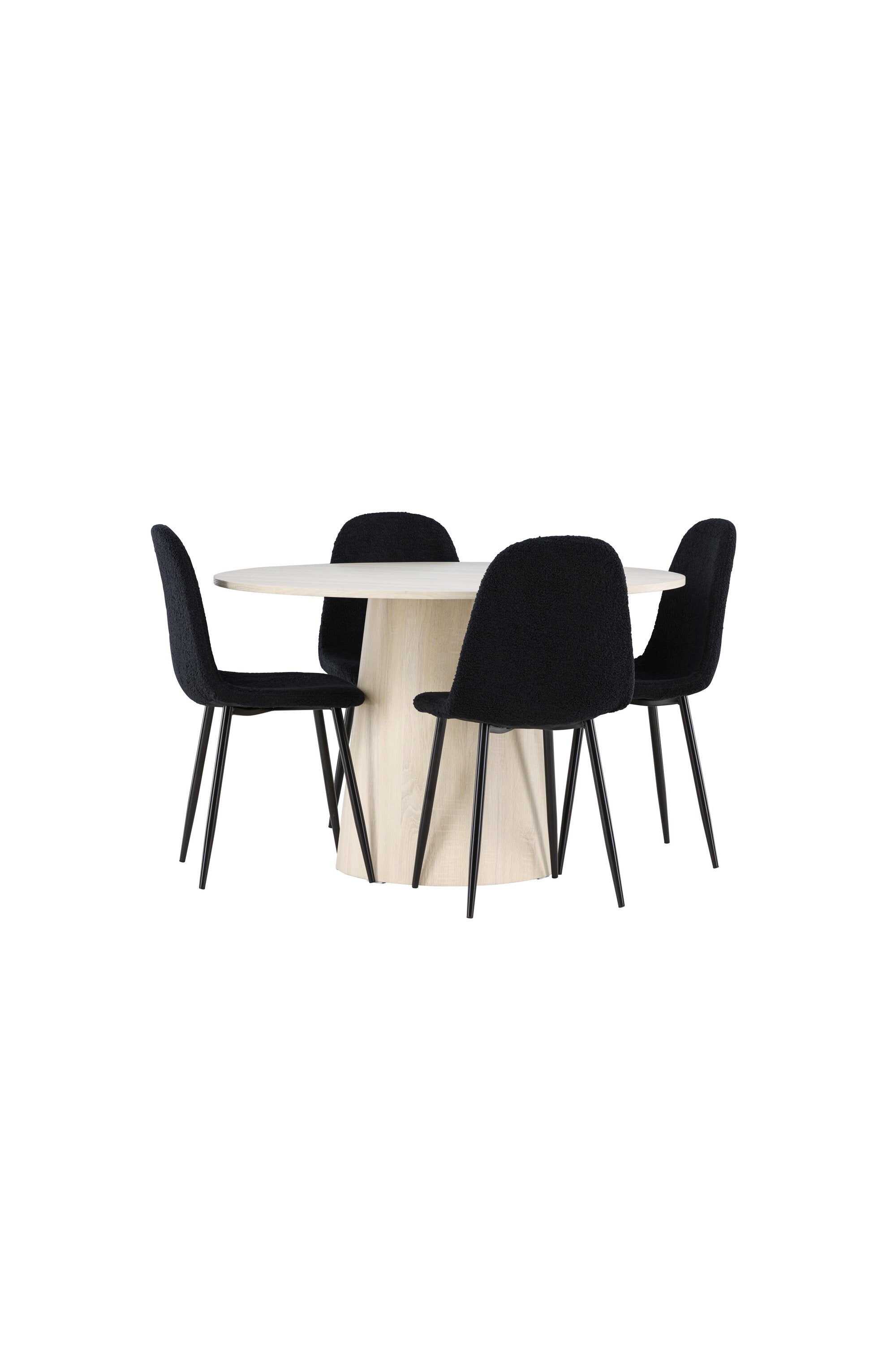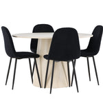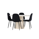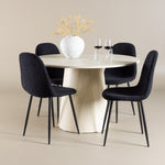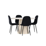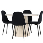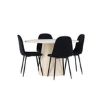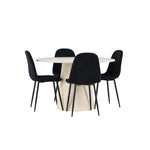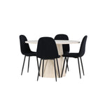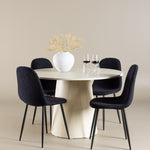 Vytvořte si stylový a příjemný jídelní kout s naší elegantní jídelní sadou, která kombinuje krásný stůl Lanzo s pohodlnými židlemi Polar. Tato jídelní souprava, která je ideální jak pro každodenní večeři, tak pro slavnostní příležitosti, dodá vaší jídelně moderní a sofistikovaný nádech. Stůl Lanzo, vyrobený z nabílené MDF, má světlou a svěží barvu, která dodá vaší jídelně čistou a harmonickou atmosféru. Stůl s velkorysým průměrem 120 cm nabízí dostatek prostoru pro jídlo a rozhovory, zatímco jeho kulatý tvar vytváří vyvážené a příjemné prostředí. Robustní konstrukce stolu zajišťuje dlouhodobé používání a stabilitu. Čtyři židle Polar skvěle doplňují stůl s elegantními černými polyesterovými plyšovými sedáky. Tyto židle nabízejí pohodlí i styl, takže jsou ideální pro dlouhé a příjemné večeře s rodinou a přáteli. Jejich moderní design s vysokými opěradly a měkkými sedáky dodá vaší jídelně sofistikovaný a moderní nádech. Tato jídelní souprava je dokonalou kombinací estetiky a funkčnosti, takže je vynikající volbou pro ty, kteří hledají elegantní a pohodlný jídelní kout. Vylepšete svou jídelnu kombinací stolu Lanzo a židlí Polar a vytvořte si místo, kde se budou sdílet vzpomínky a radost.