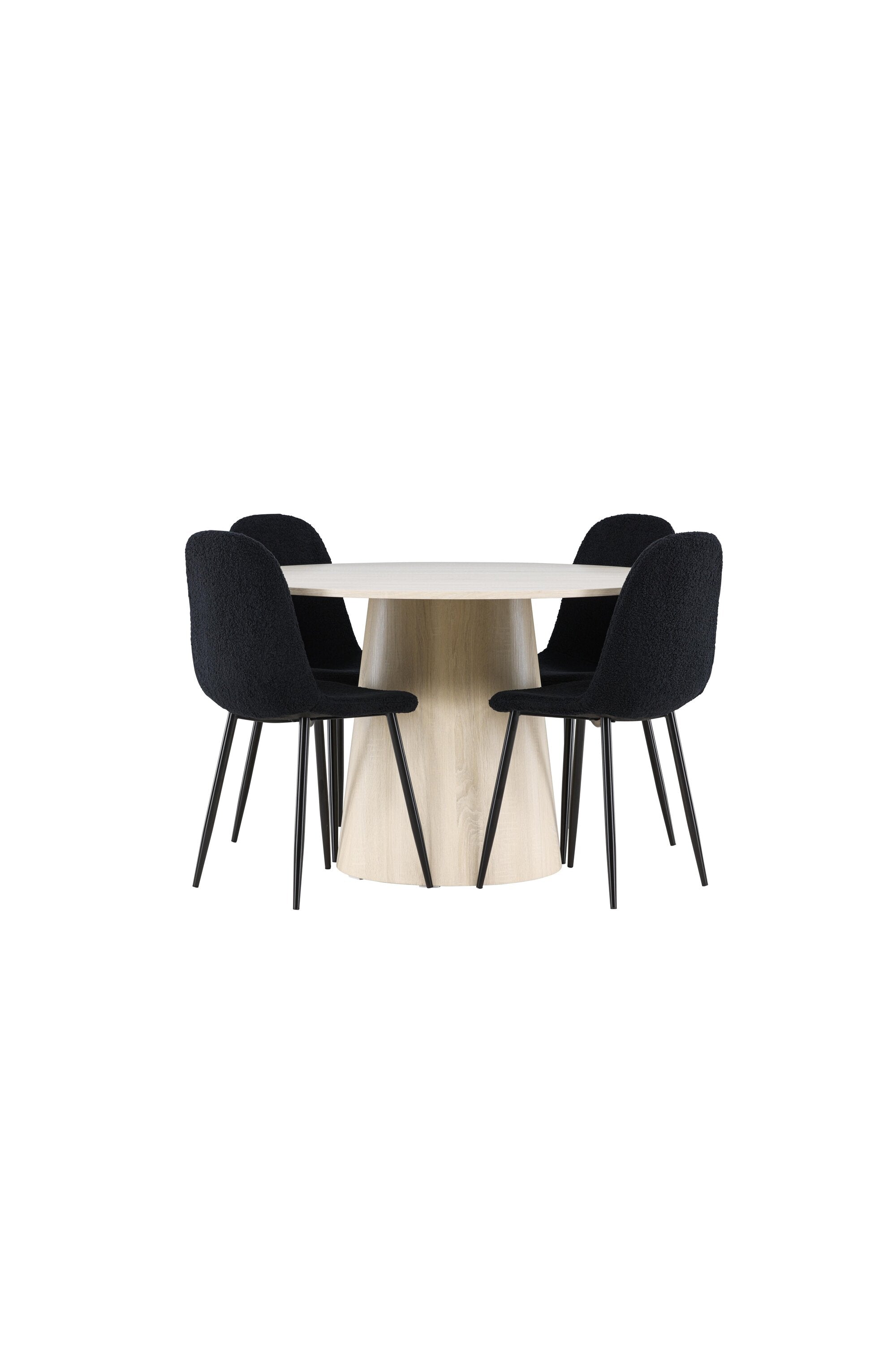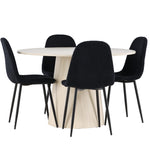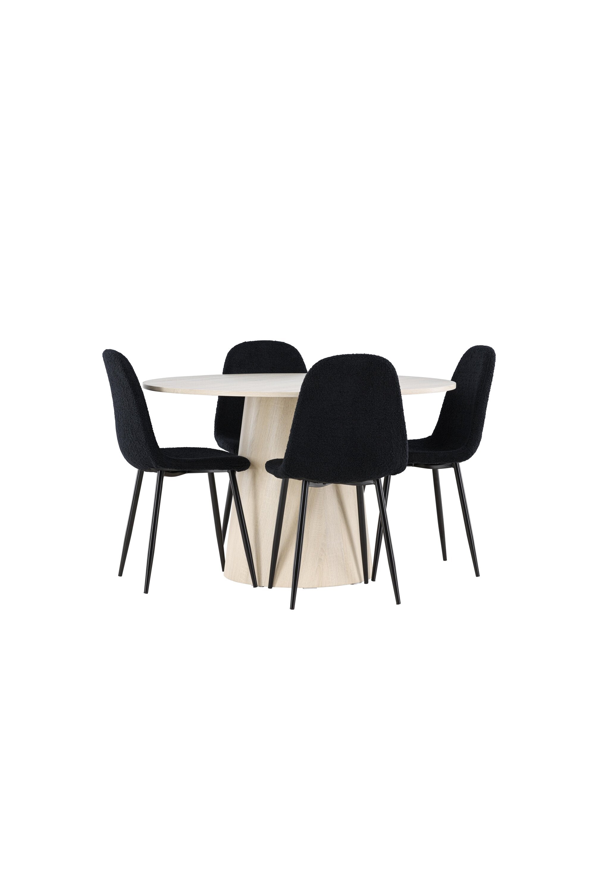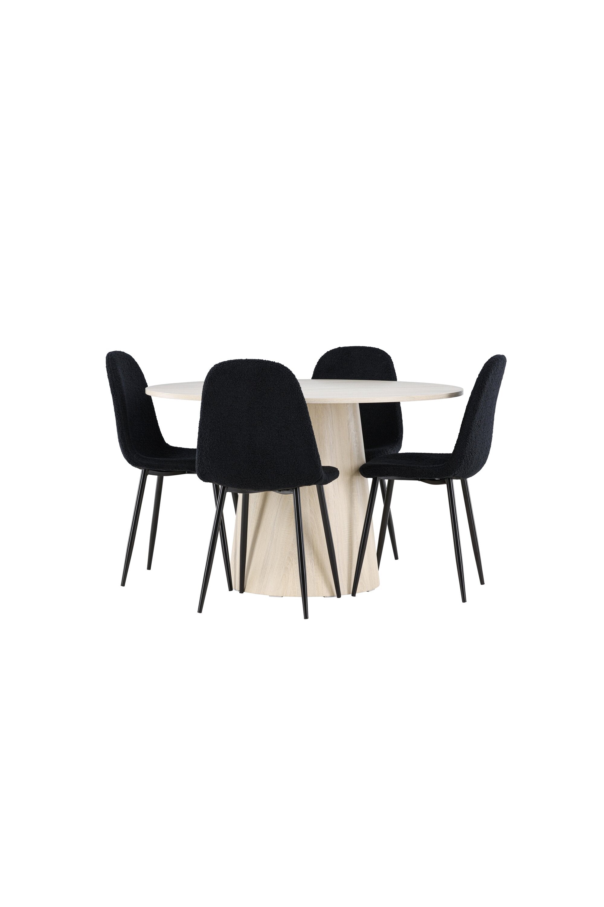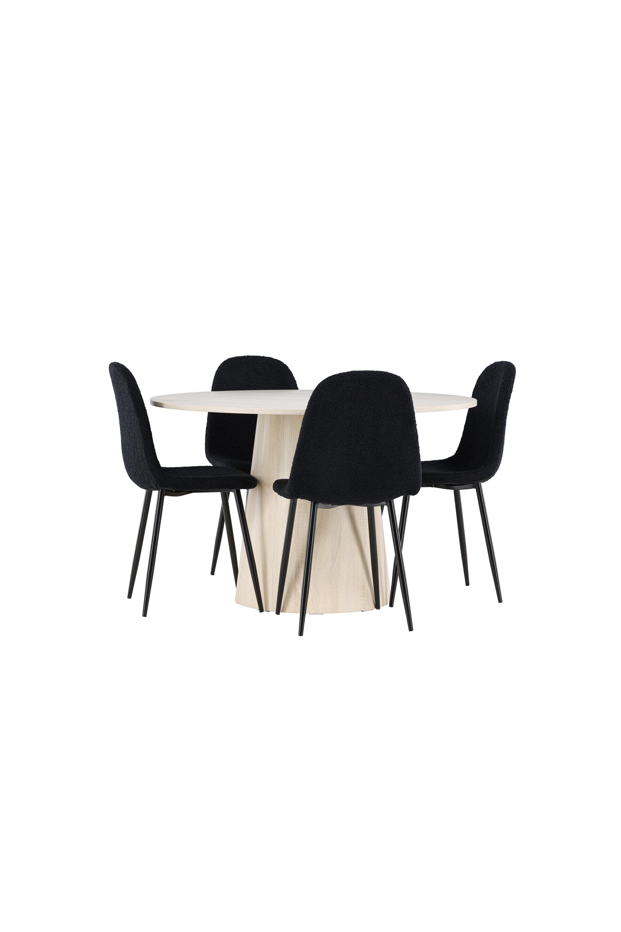 Vytvořte si stylový a příjemný jídelní kout s naší elegantní jídelní sadou, která kombinuje krásný stůl Lanzo s pohodlnými židlemi Polar. Tato jídelní souprava, která je ideální jak pro každodenní večeři, tak pro slavnostní příležitosti, dodá vaší jídelně moderní a sofistikovaný nádech. Stůl Lanzo, vyrobený z nabílené MDF, má světlou a svěží barvu, která dodá vaší jídelně čistou a harmonickou atmosféru. Stůl s velkorysým průměrem 120 cm nabízí dostatek prostoru pro jídlo a rozhovory, zatímco jeho kulatý tvar vytváří vyvážené a příjemné prostředí. Robustní konstrukce stolu zajišťuje dlouhodobé používání a stabilitu. Čtyři židle Polar skvěle doplňují stůl s elegantními černými polyesterovými plyšovými sedáky. Tyto židle nabízejí pohodlí i styl, takže jsou ideální pro dlouhé a příjemné večeře s rodinou a přáteli. Jejich moderní design s vysokými opěradly a měkkými sedáky dodá vaší jídelně sofistikovaný a moderní nádech. Tato jídelní souprava je dokonalou kombinací estetiky a funkčnosti, takže je vynikající volbou pro ty, kteří hledají elegantní a pohodlný jídelní kout. Vylepšete svou jídelnu kombinací stolu Lanzo a židlí Polar a vytvořte si místo, kde se budou sdílet vzpomínky a radost.