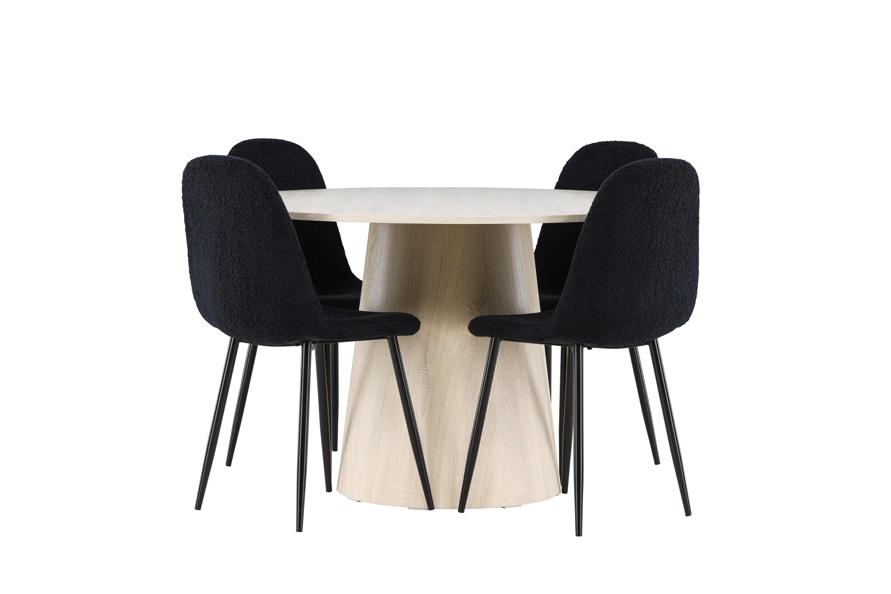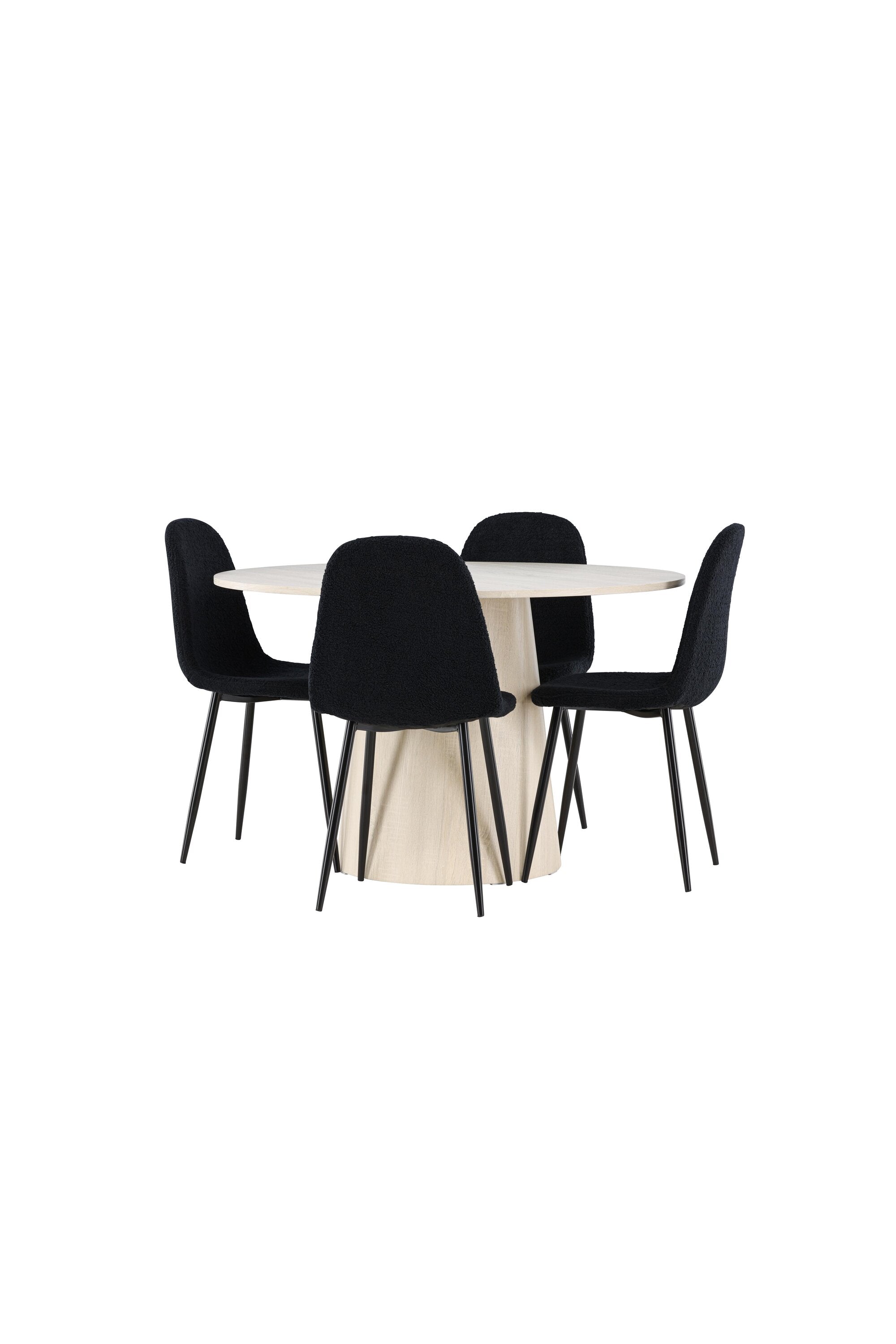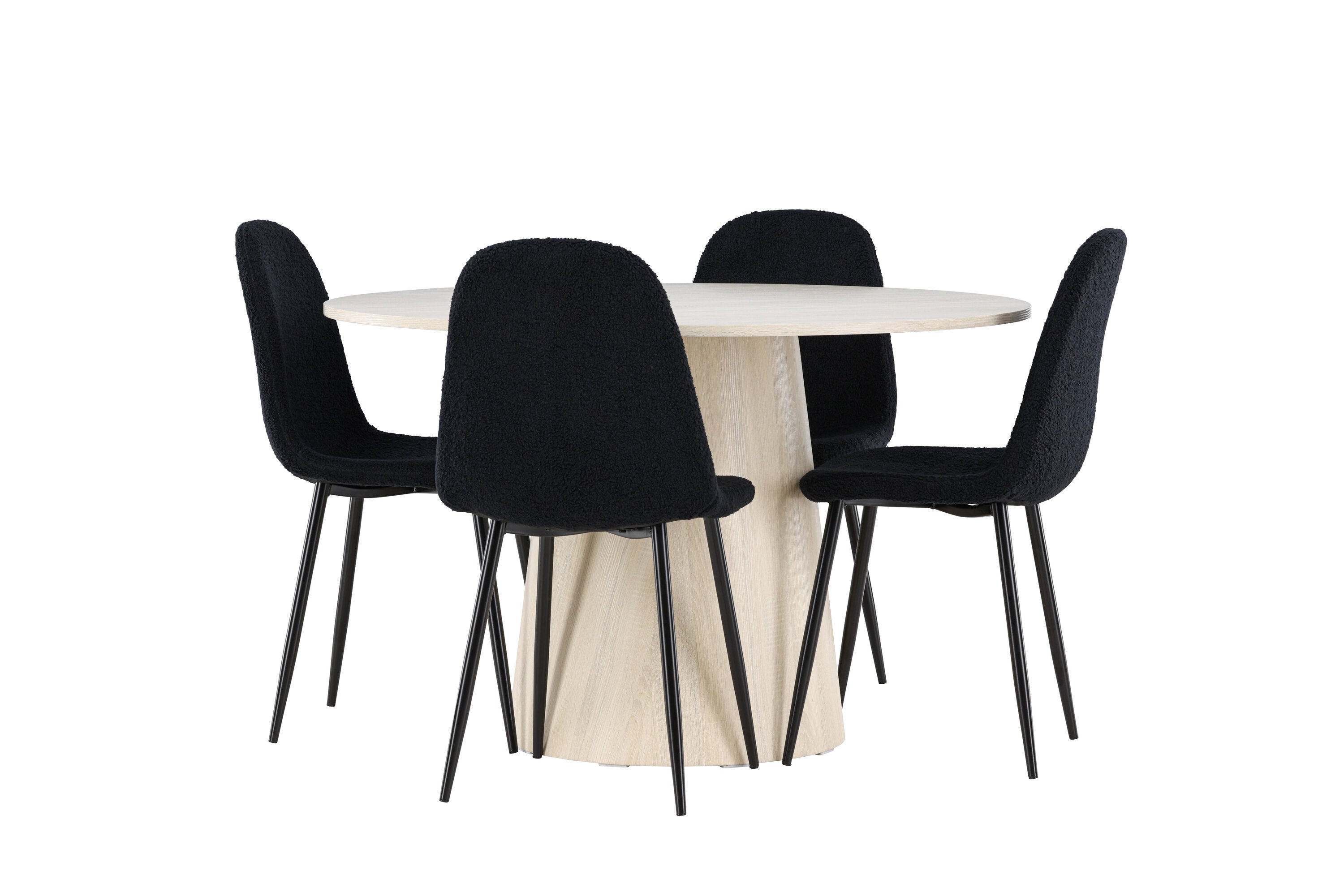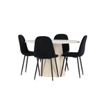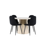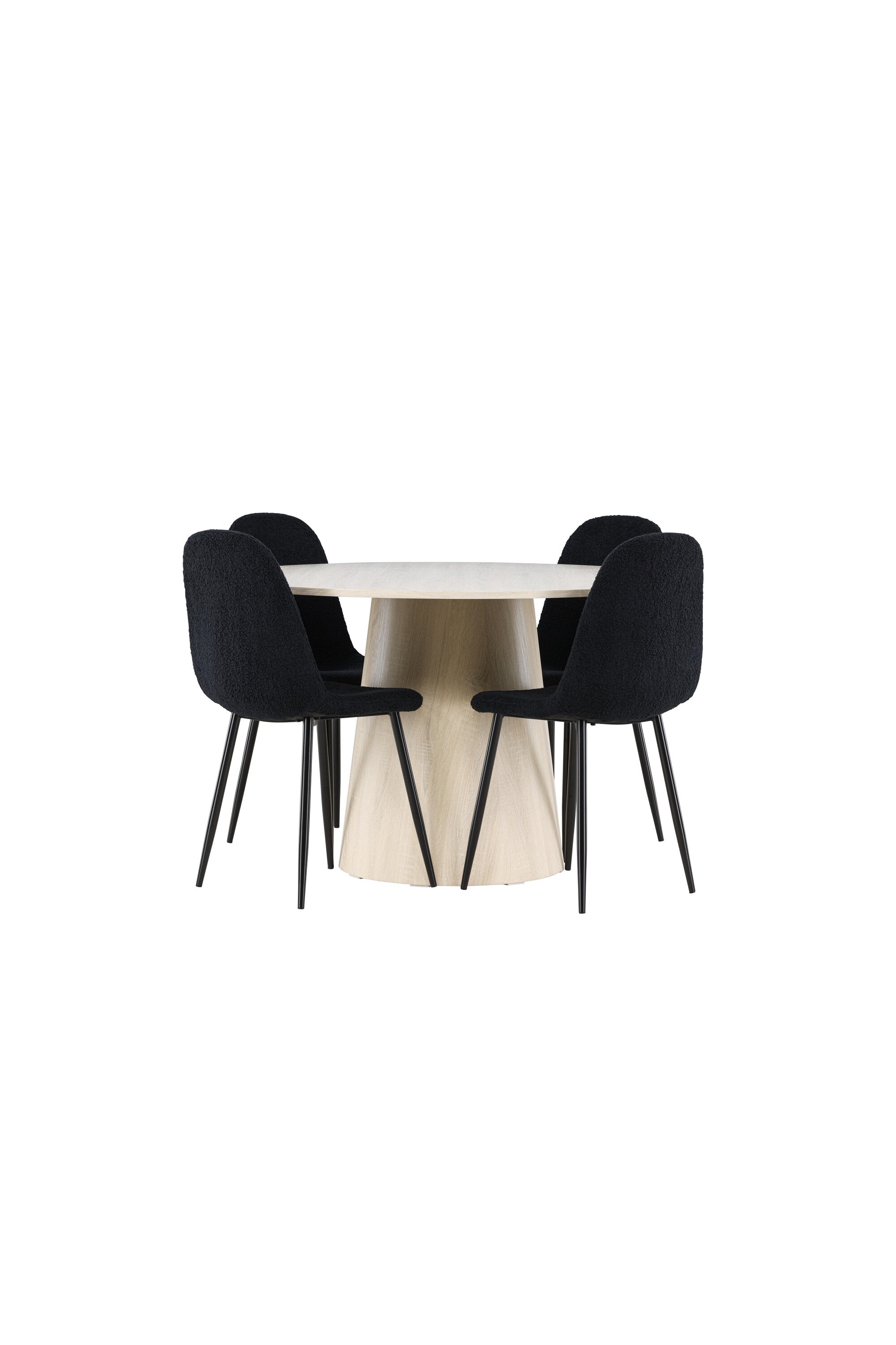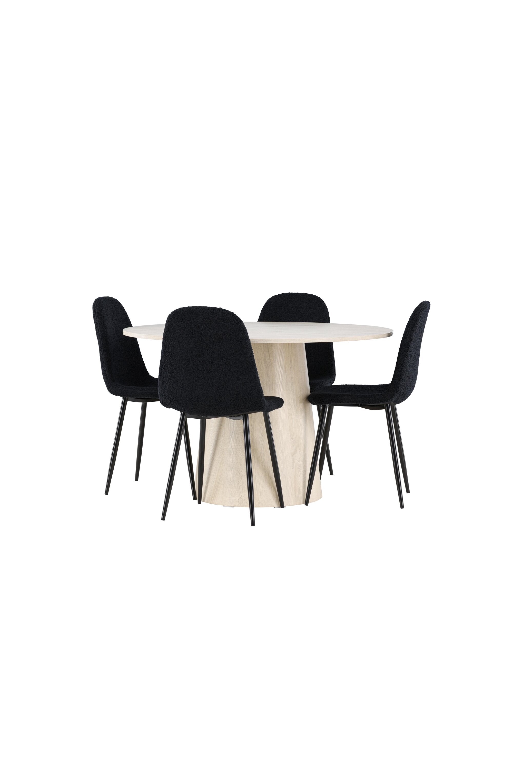 Vytvořte si stylový a příjemný jídelní kout s naší elegantní jídelní sadou, která kombinuje krásný stůl Lanzo s pohodlnými židlemi Polar. Tato jídelní souprava, která je ideální jak pro každodenní večeři, tak pro slavnostní příležitosti, dodá vaší jídelně moderní a sofistikovaný nádech. Stůl Lanzo, vyrobený z nabílené MDF, má světlou a svěží barvu, která dodá vaší jídelně čistou a harmonickou atmosféru. Stůl s velkorysým průměrem 120 cm nabízí dostatek prostoru pro jídlo a rozhovory, zatímco jeho kulatý tvar vytváří vyvážené a příjemné prostředí. Robustní konstrukce stolu zajišťuje dlouhodobé používání a stabilitu. Čtyři židle Polar skvěle doplňují stůl s elegantními černými polyesterovými plyšovými sedáky. Tyto židle nabízejí pohodlí i styl, takže jsou ideální pro dlouhé a příjemné večeře s rodinou a přáteli. Jejich moderní design s vysokými opěradly a měkkými sedáky dodá vaší jídelně sofistikovaný a moderní nádech. Tato jídelní souprava je dokonalou kombinací estetiky a funkčnosti, takže je vynikající volbou pro ty, kteří hledají elegantní a pohodlný jídelní kout. Vylepšete svou jídelnu kombinací stolu Lanzo a židlí Polar a vytvořte si místo, kde se budou sdílet vzpomínky a radost.