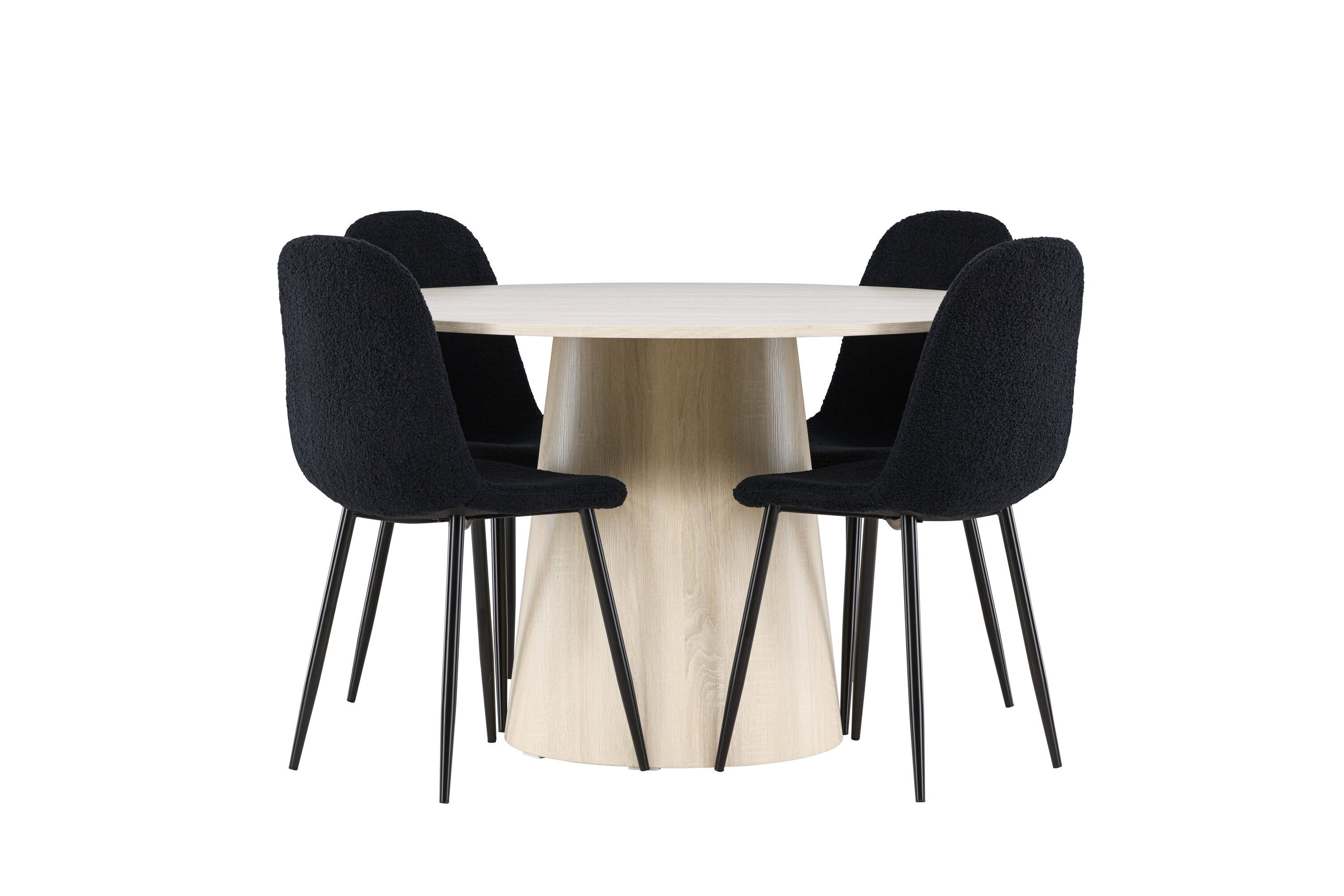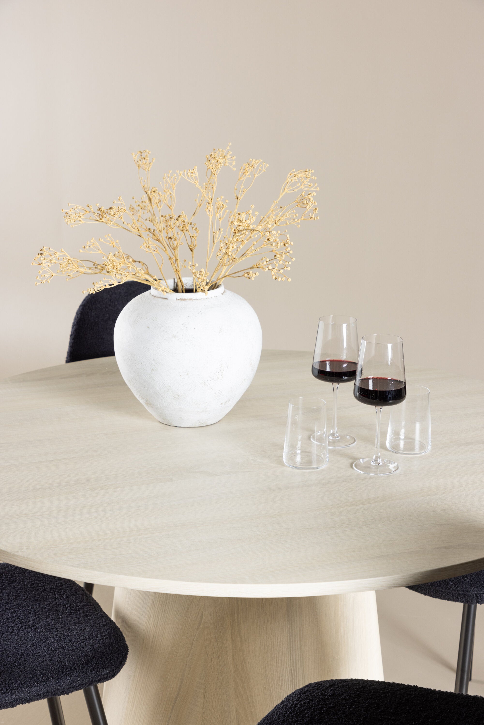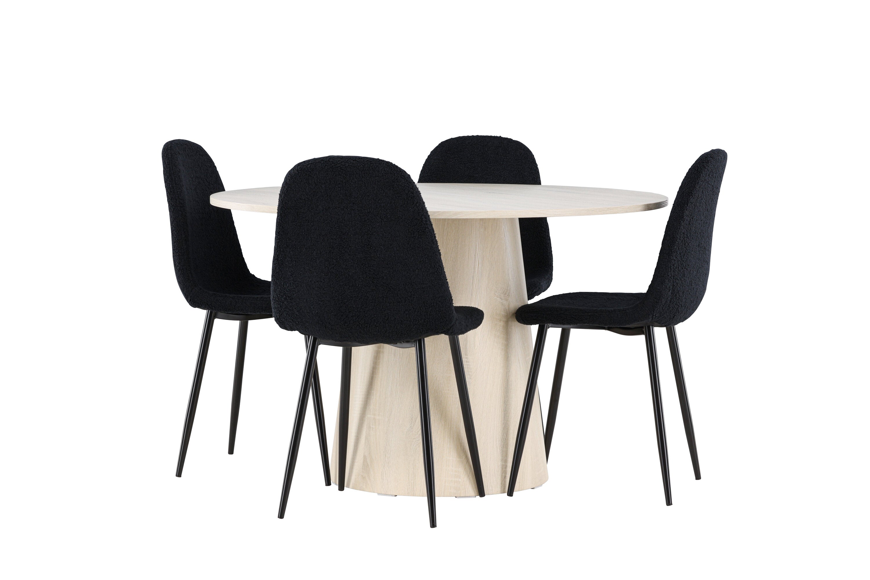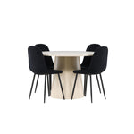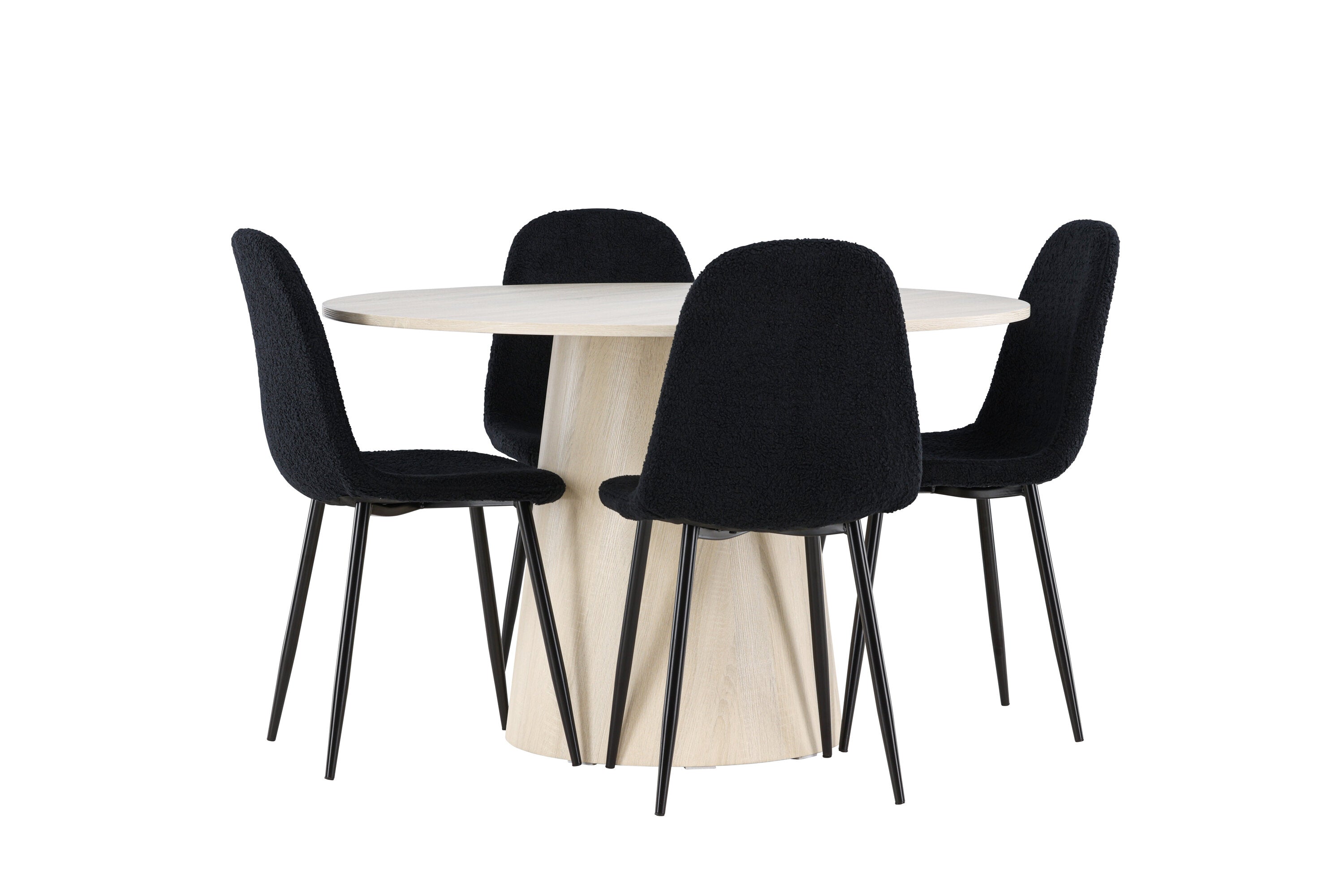 Vytvořte si stylový a příjemný jídelní kout s naší elegantní jídelní sadou, která kombinuje krásný stůl Lanzo s pohodlnými židlemi Polar. Tato jídelní souprava, která je ideální jak pro každodenní večeři, tak pro slavnostní příležitosti, dodá vaší jídelně moderní a sofistikovaný nádech. Stůl Lanzo, vyrobený z nabílené MDF, má světlou a svěží barvu, která dodá vaší jídelně čistou a harmonickou atmosféru. Stůl s velkorysým průměrem 120 cm nabízí dostatek prostoru pro jídlo a rozhovory, zatímco jeho kulatý tvar vytváří vyvážené a příjemné prostředí. Robustní konstrukce stolu zajišťuje dlouhodobé používání a stabilitu. Čtyři židle Polar skvěle doplňují stůl s elegantními černými polyesterovými plyšovými sedáky. Tyto židle nabízejí pohodlí i styl, takže jsou ideální pro dlouhé a příjemné večeře s rodinou a přáteli. Jejich moderní design s vysokými opěradly a měkkými sedáky dodá vaší jídelně sofistikovaný a moderní nádech. Tato jídelní souprava je dokonalou kombinací estetiky a funkčnosti, takže je vynikající volbou pro ty, kteří hledají elegantní a pohodlný jídelní kout. Vylepšete svou jídelnu kombinací stolu Lanzo a židlí Polar a vytvořte si místo, kde se budou sdílet vzpomínky a radost.