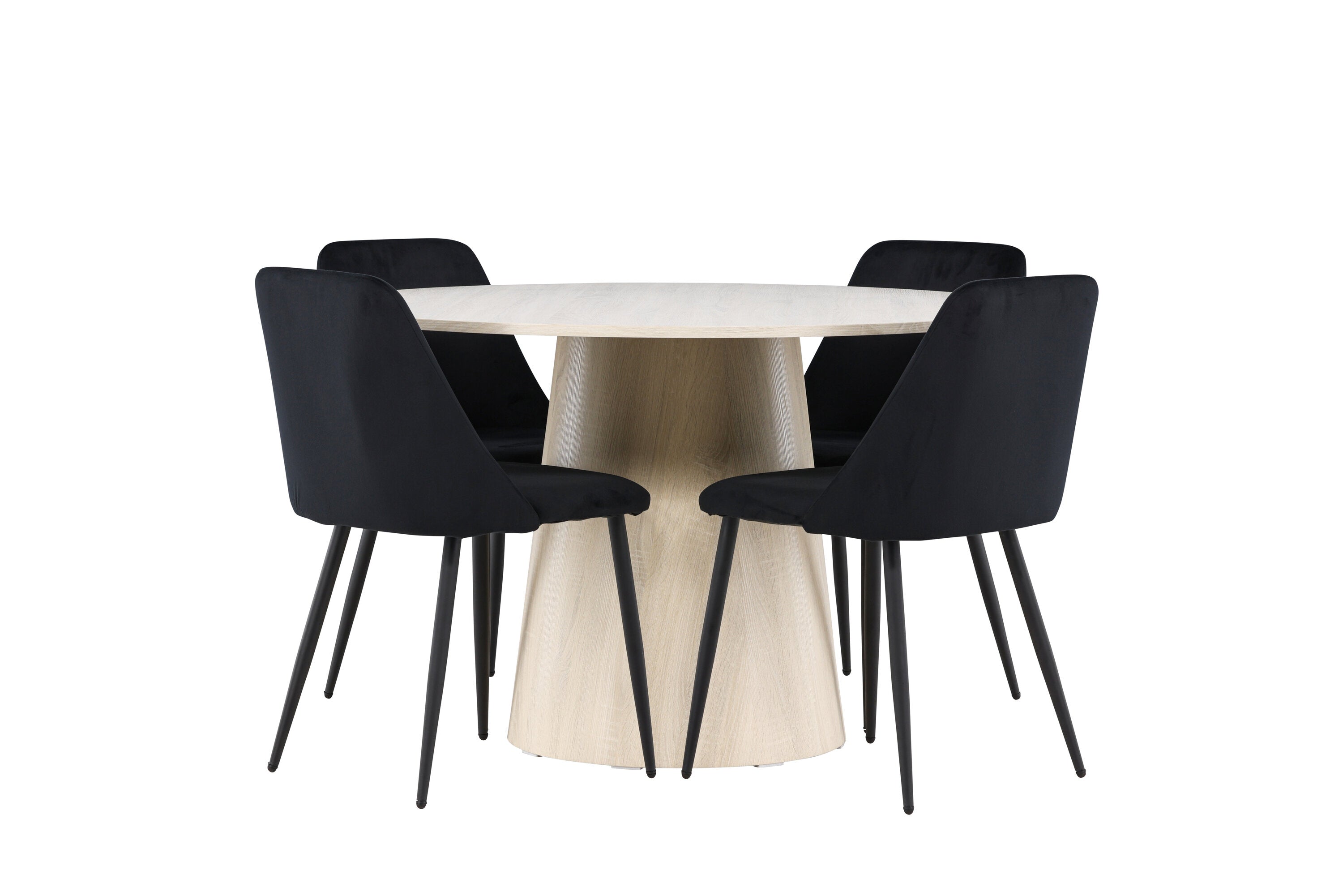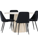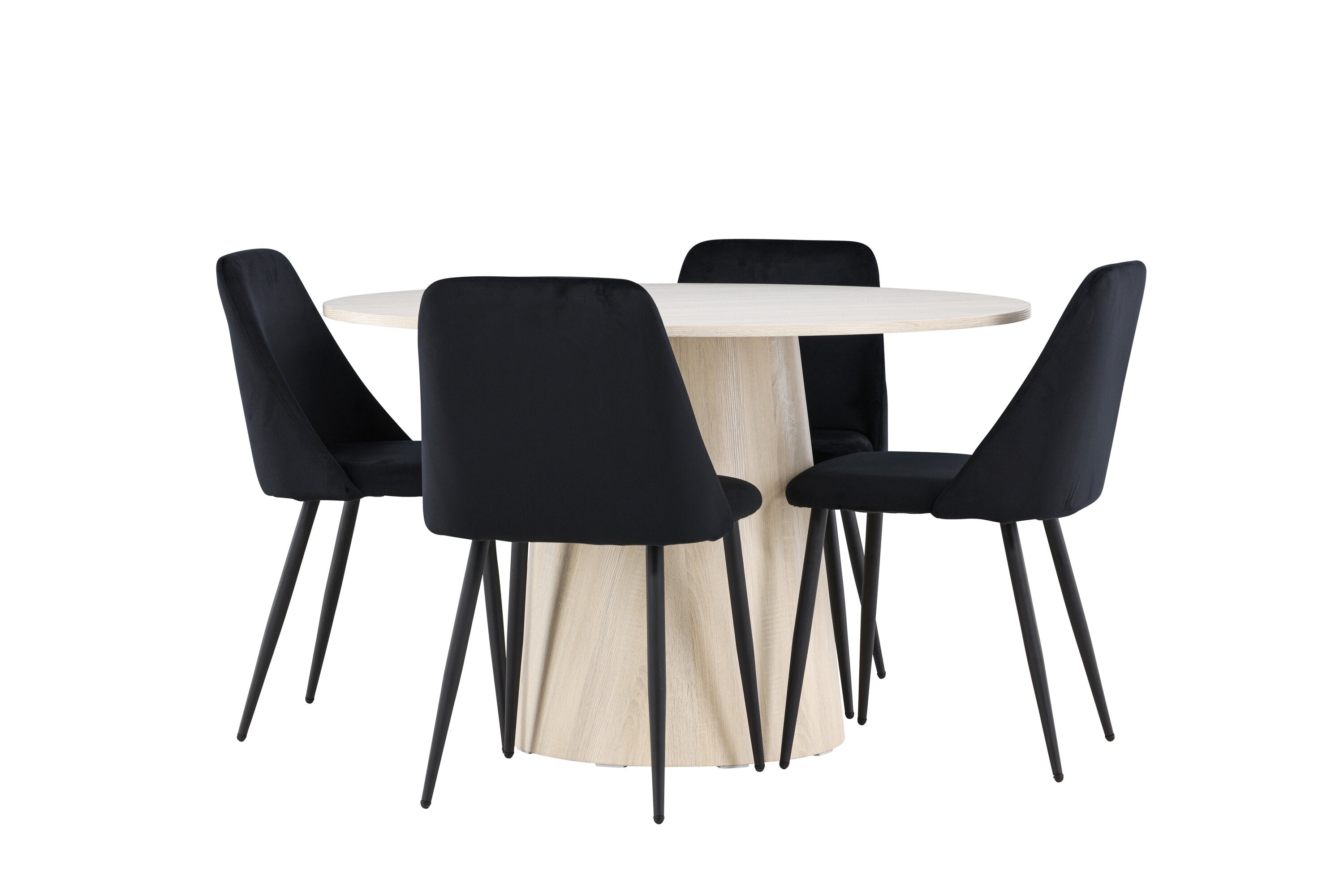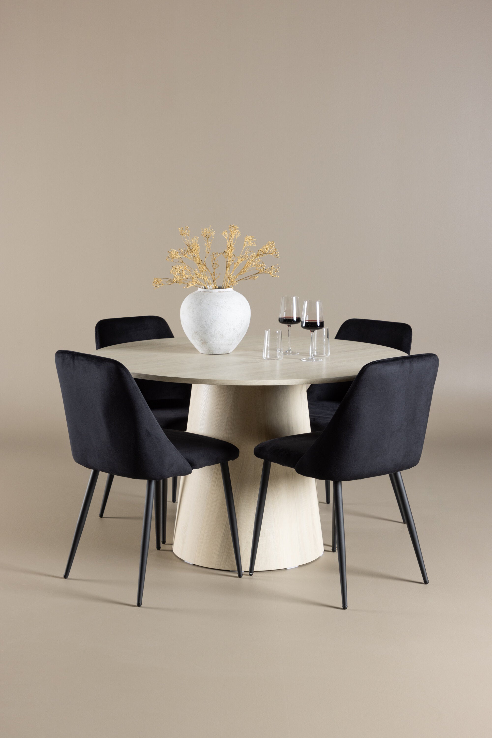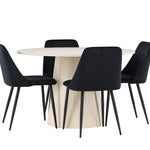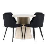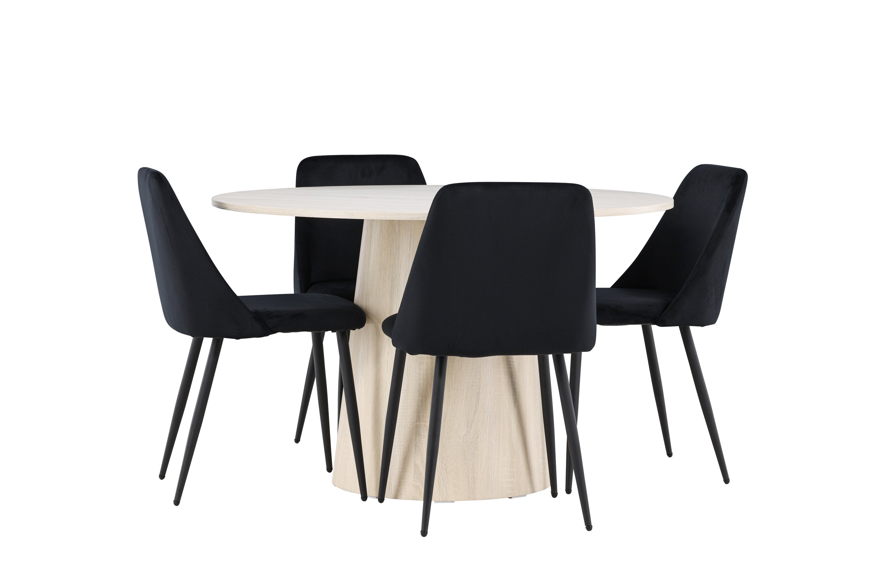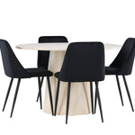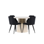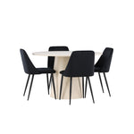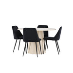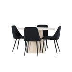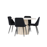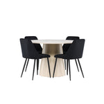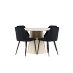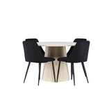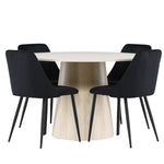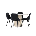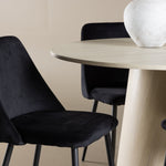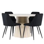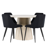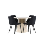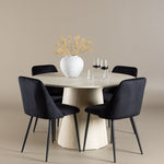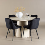 Vytvořte si elegantní a příjemný jídelní kout s naší sofistikovanou jídelní sadou, která kombinuje stylový stůl Lanzo s luxusními nočními židlemi. Tato jídelní sada je ideální pro každodenní večeři i slavnostní příležitosti a dodá vaší jídelně moderní a harmonickou atmosféru. Stůl Lanzo, vyrobený z nabílené MDF, má světlou a svěží barvu, která dodá vaší jídelně čistý a příjemný pocit. Stůl s velkorysým průměrem 120 cm nabízí dostatek prostoru pro jídlo a konverzaci, přičemž jeho kulatý tvar vytváří vyvážené a společenské prostředí. Robustní konstrukce stolu zajišťuje dlouhodobé používání a stabilitu. Čtyři noční křesla skvěle doplňují stůl svými elegantními sedáky čalouněnými černým sametem. Tyto židle nabízejí pohodlí i styl, takže jsou ideální pro dlouhé a příjemné večeře s rodinou a přáteli. Jejich moderní design s vysokými opěradly a měkkými sedáky dodá vaší jídelně sofistikovaný a moderní nádech. Tato jídelní souprava je dokonalou kombinací estetiky a funkčnosti, takže je vynikající volbou pro ty, kteří hledají elegantní a pohodlný jídelní kout. Vylepšete svou jídelnu kombinací stolu Lanzo a nočních židlí a vytvořte si místo, kde se budou sdílet vzpomínky a radost.