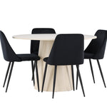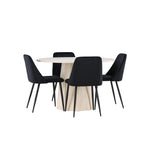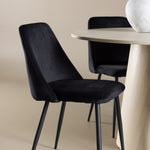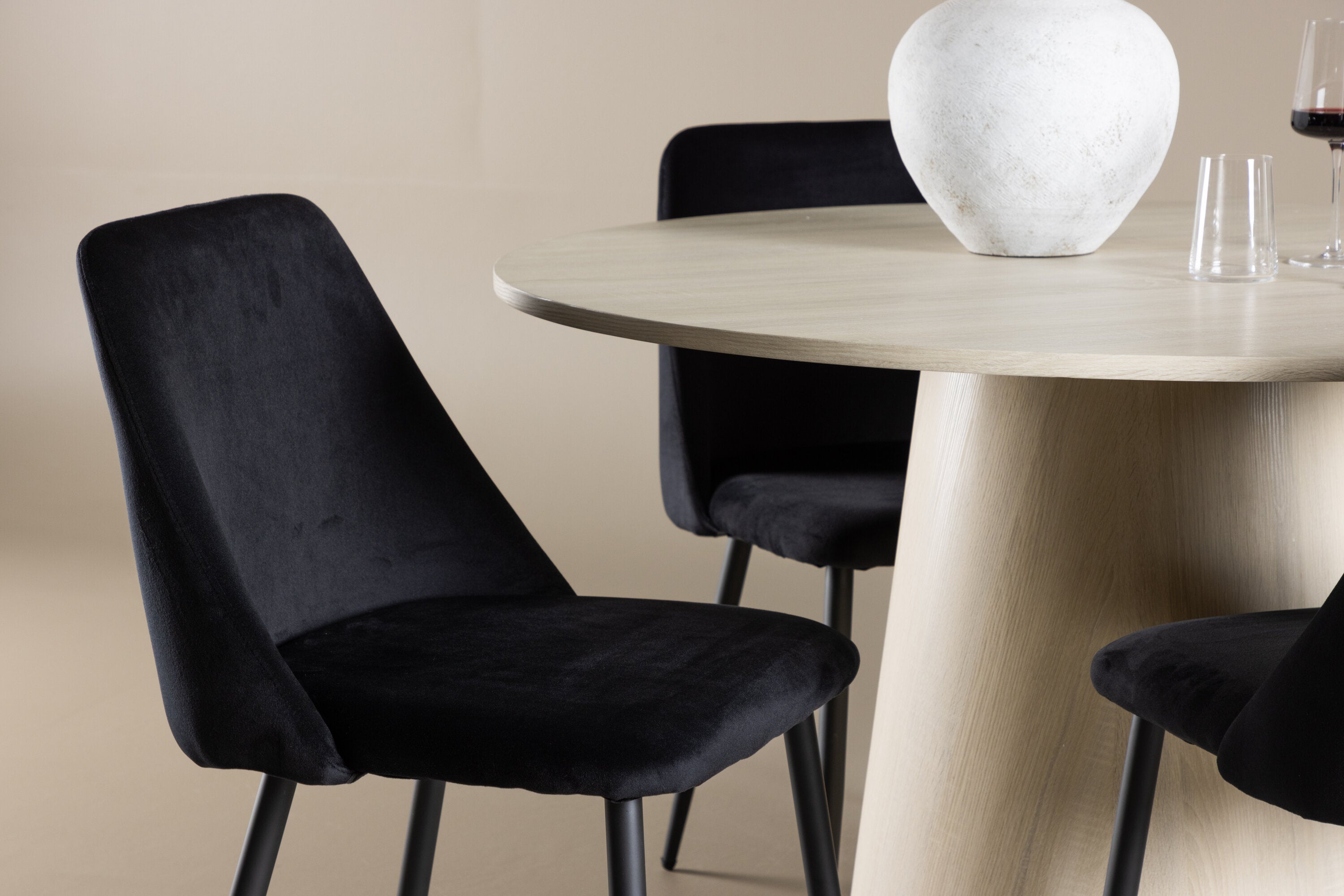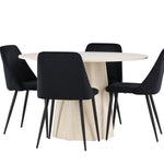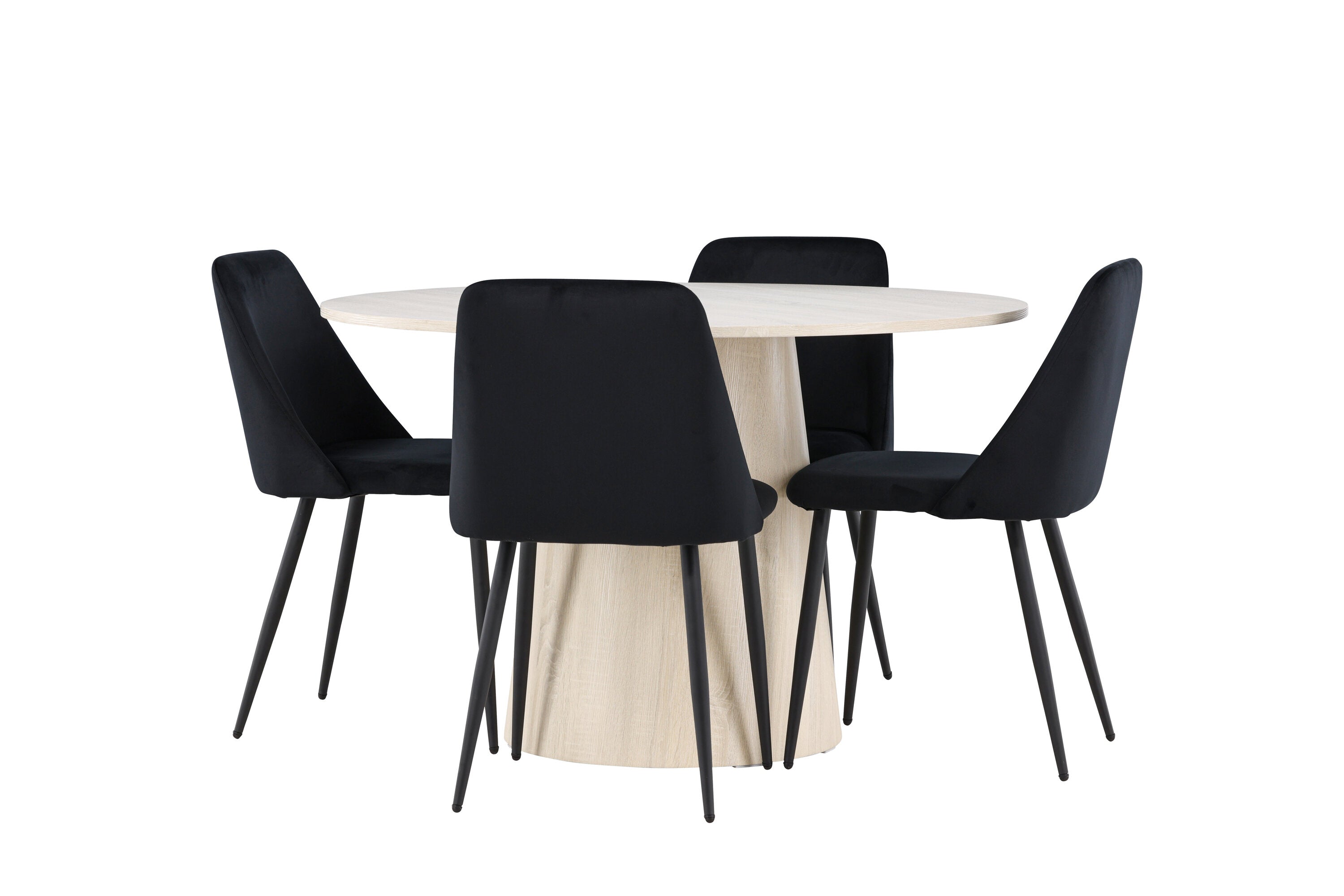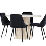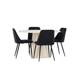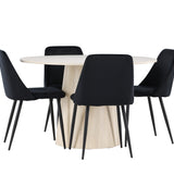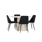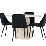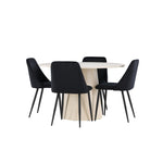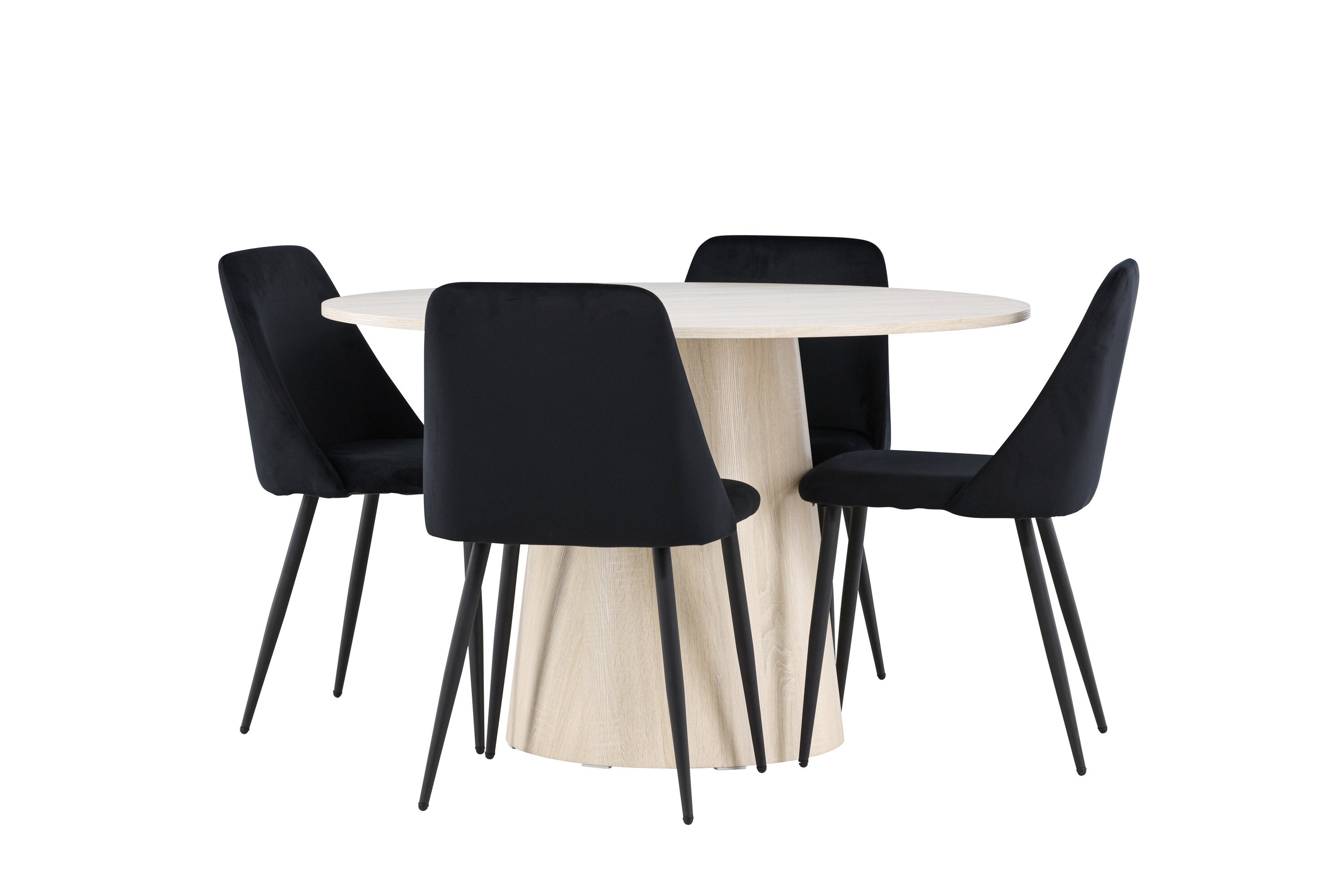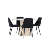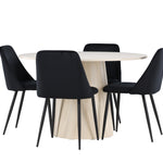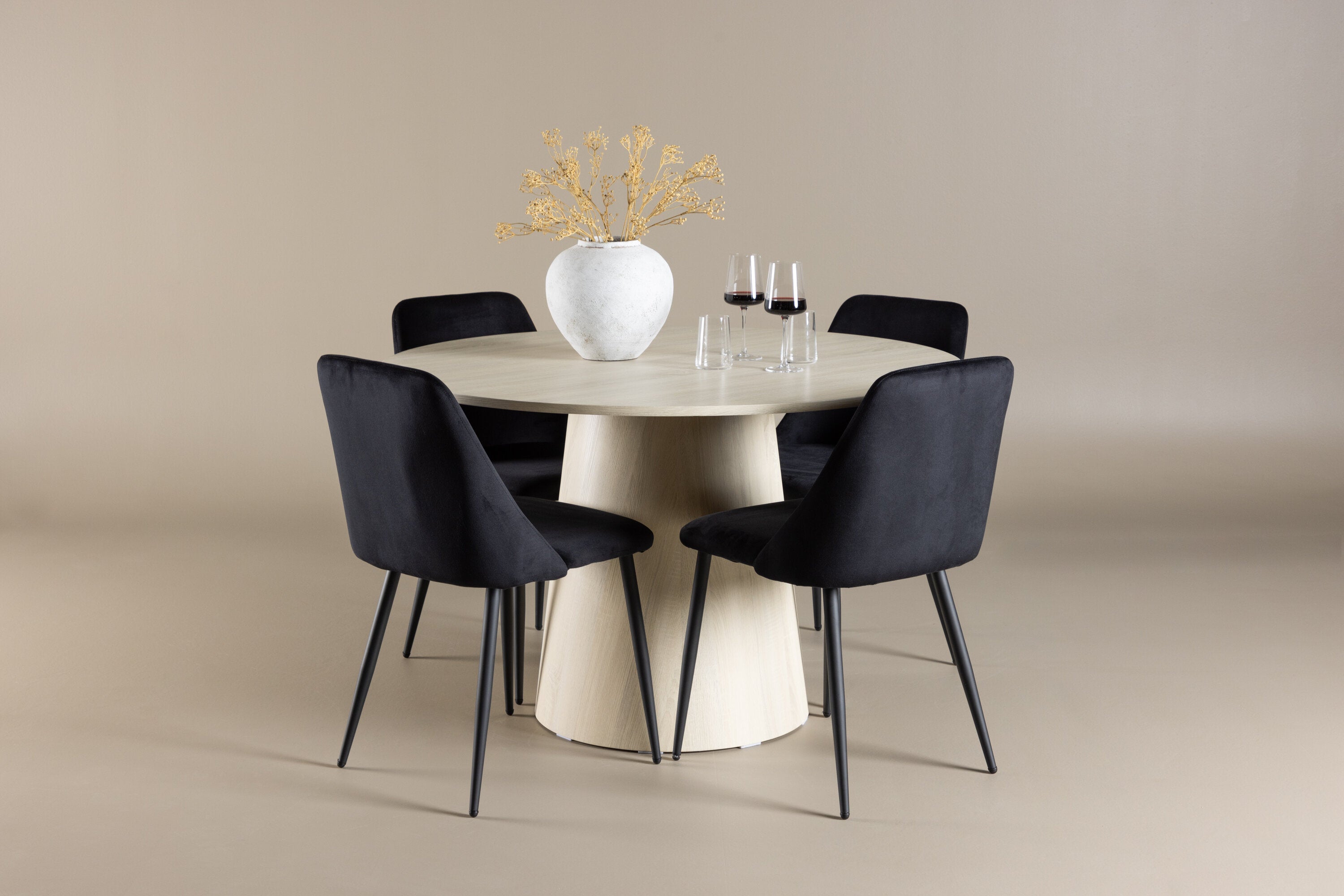Vytvořte si elegantní a příjemný jídelní kout s naší sofistikovanou jídelní sadou, která kombinuje stylový stůl Lanzo s luxusními nočními židlemi. Tato jídelní sada je ideální pro každodenní večeři i slavnostní příležitosti a dodá vaší jídelně moderní a harmonickou atmosféru. Stůl Lanzo, vyrobený z nabílené MDF, má světlou a svěží barvu, která dodá vaší jídelně čistý a příjemný pocit. Stůl s velkorysým průměrem 120 cm nabízí dostatek prostoru pro jídlo a konverzaci, přičemž jeho kulatý tvar vytváří vyvážené a společenské prostředí. Robustní konstrukce stolu zajišťuje dlouhodobé používání a stabilitu. Čtyři noční křesla skvěle doplňují stůl svými elegantními sedáky čalouněnými černým sametem. Tyto židle nabízejí pohodlí i styl, takže jsou ideální pro dlouhé a příjemné večeře s rodinou a přáteli. Jejich moderní design s vysokými opěradly a měkkými sedáky dodá vaší jídelně sofistikovaný a moderní nádech. Tato jídelní souprava je dokonalou kombinací estetiky a funkčnosti, takže je vynikající volbou pro ty, kteří hledají elegantní a pohodlný jídelní kout. Vylepšete svou jídelnu kombinací stolu Lanzo a nočních židlí a vytvořte si místo, kde se budou sdílet vzpomínky a radost.