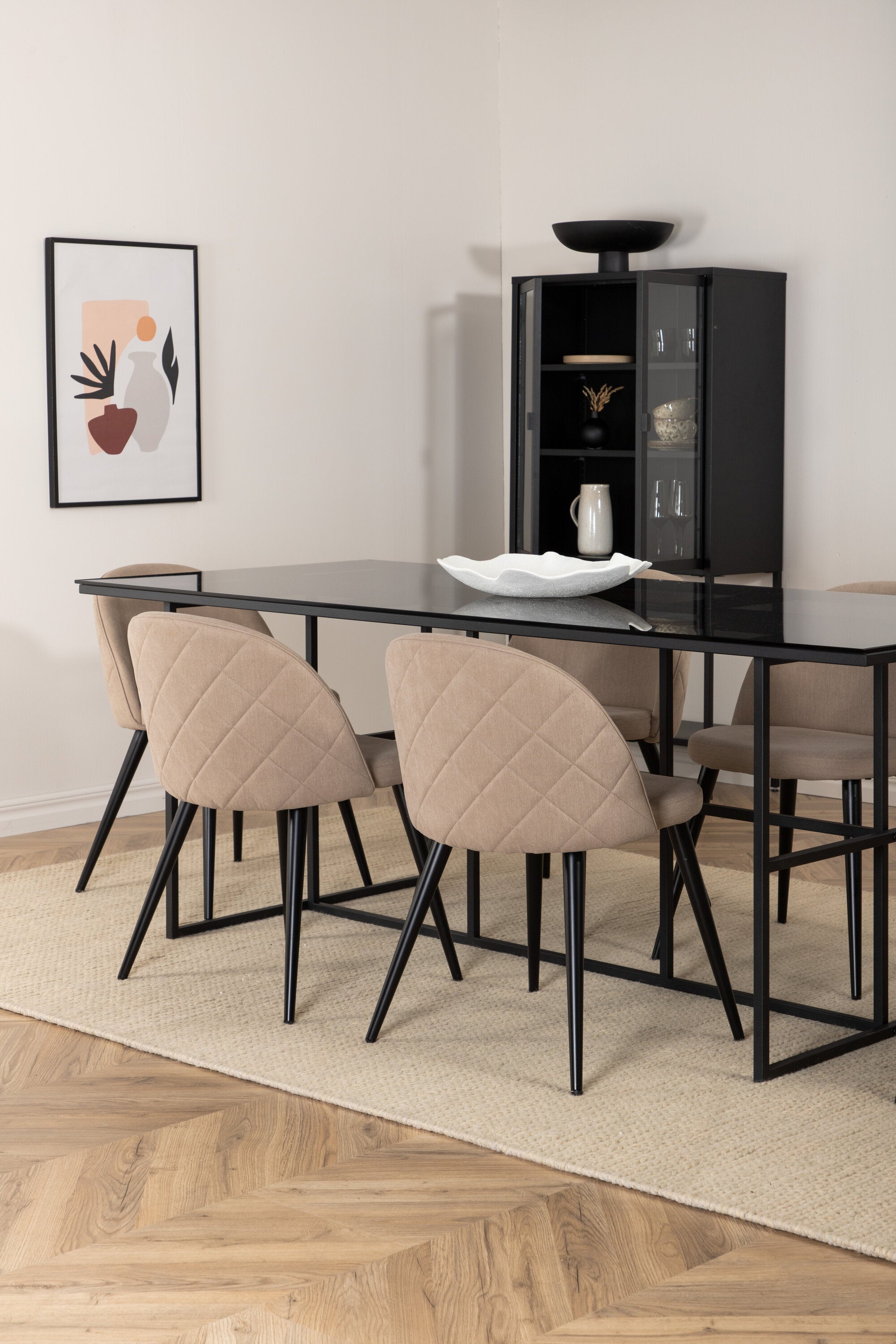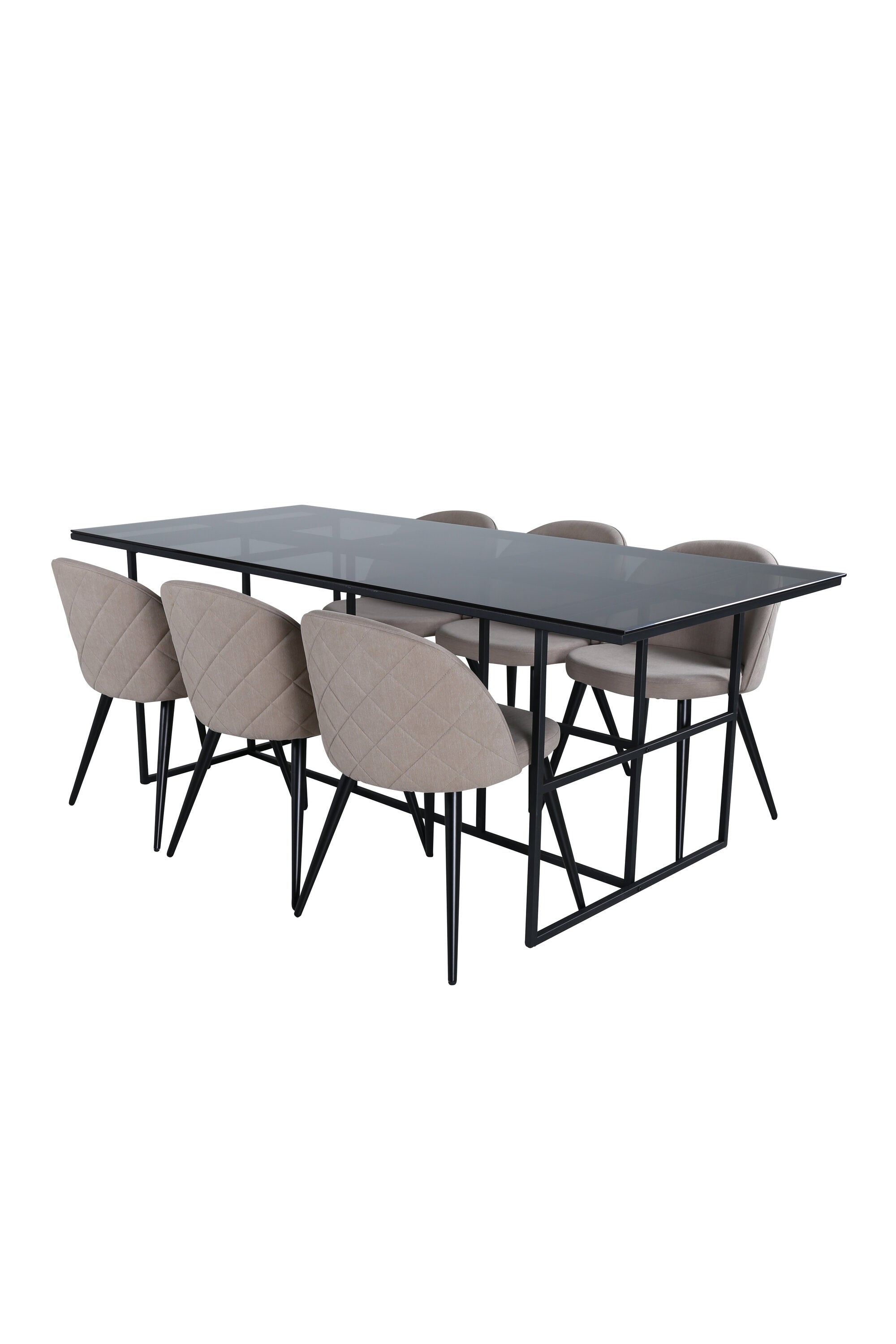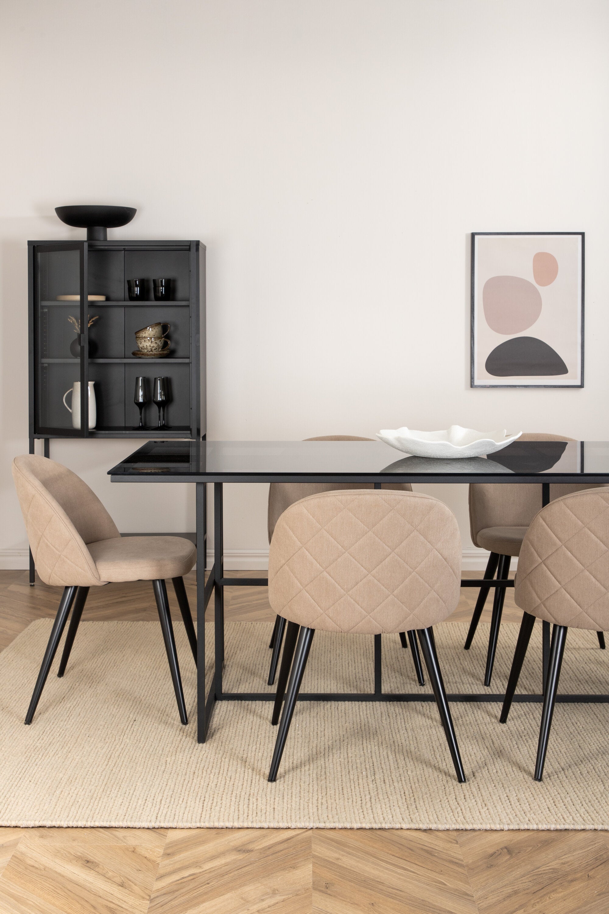 Vyzdobte obývací pokoj moderně a stylově! Jídelní stůl Leif má poutavý design s elegantní horní deskou z kouřového černého skla a rámem z černého kovu – inspirovaný průmyslovými stěnami, které šplhají na žebříčku trendů. Rozměry stolu: Délka: 200 cm, Šířka: 90 cm, Výška: 74 cm. Sladěno se 6 sametovými jídelními židlemi s ozdobným prošíváním v béžovém sedáku z polyesterového lnu a černými nohami židle ze železa. Rozměry židle: Výška: 76,5 cm, výška sedáku: 46,5 cm, šířka: 50 cm, hloubka: 57 cm. Pozvěte dopředu na mnoho příjemných jídel!