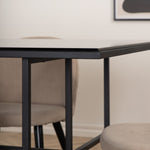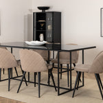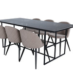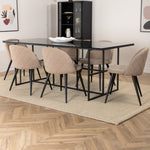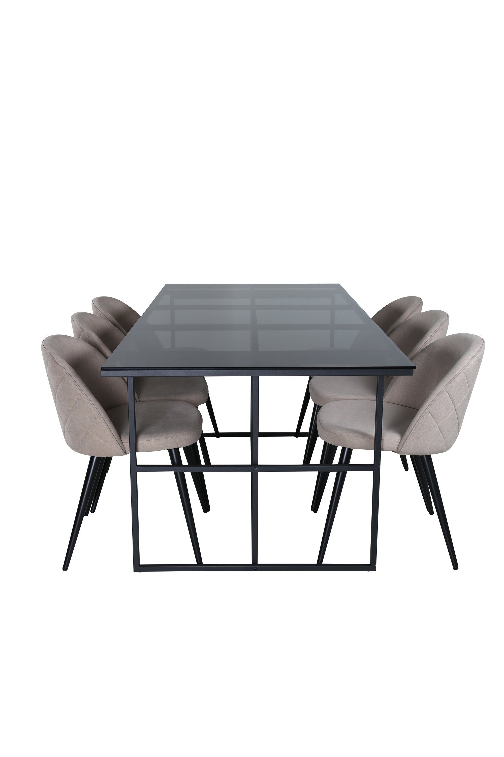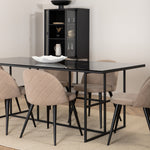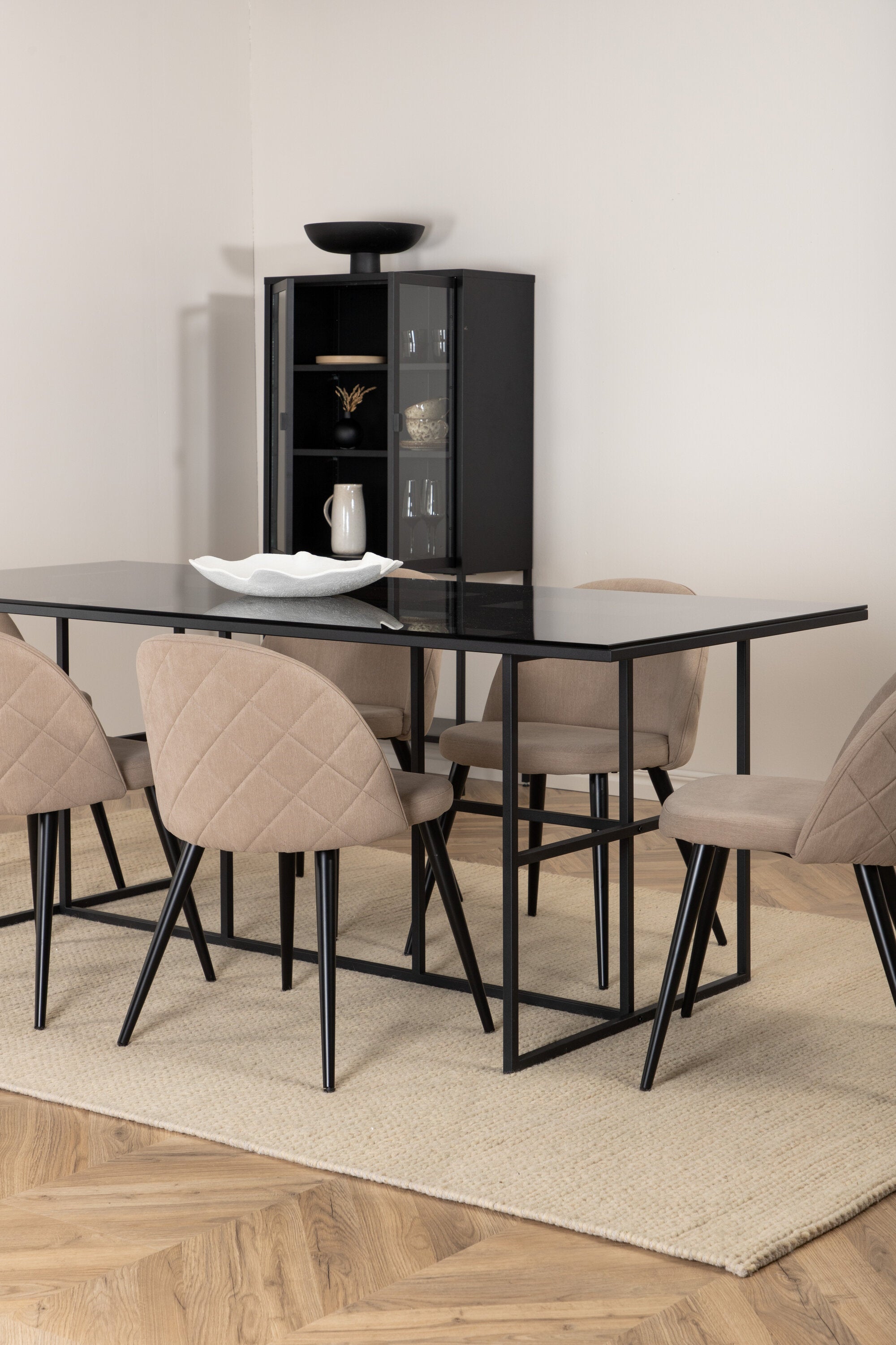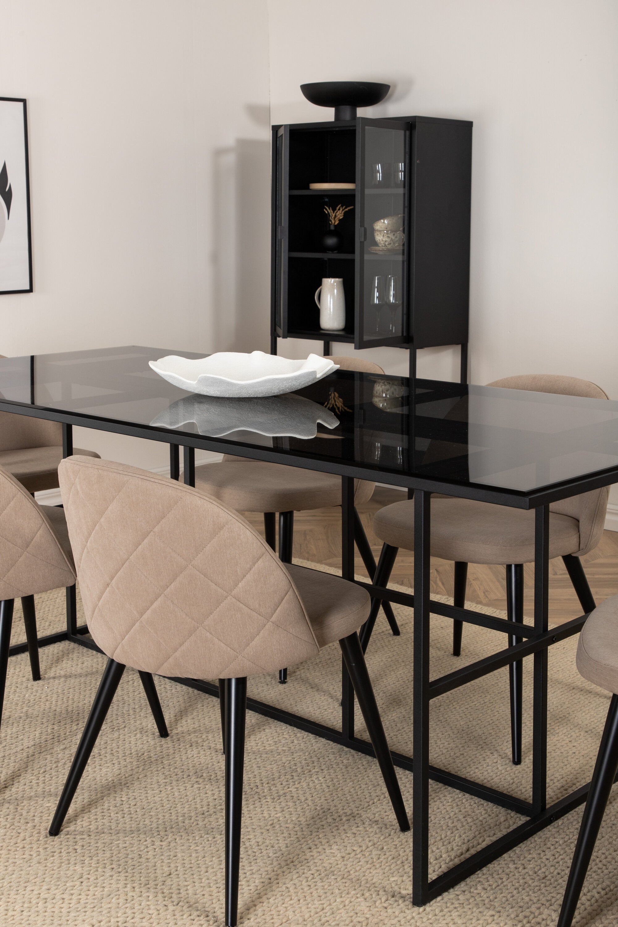 Vyzdobte obývací pokoj moderně a stylově! Jídelní stůl Leif má poutavý design s elegantní horní deskou z kouřového černého skla a rámem z černého kovu – inspirovaný průmyslovými stěnami, které šplhají na žebříčku trendů. Rozměry stolu: Délka: 200 cm, Šířka: 90 cm, Výška: 74 cm. Sladěno se 6 sametovými jídelními židlemi s ozdobným prošíváním v béžovém sedáku z polyesterového lnu a černými nohami židle ze železa. Rozměry židle: Výška: 76,5 cm, výška sedáku: 46,5 cm, šířka: 50 cm, hloubka: 57 cm. Pozvěte dopředu na mnoho příjemných jídel!