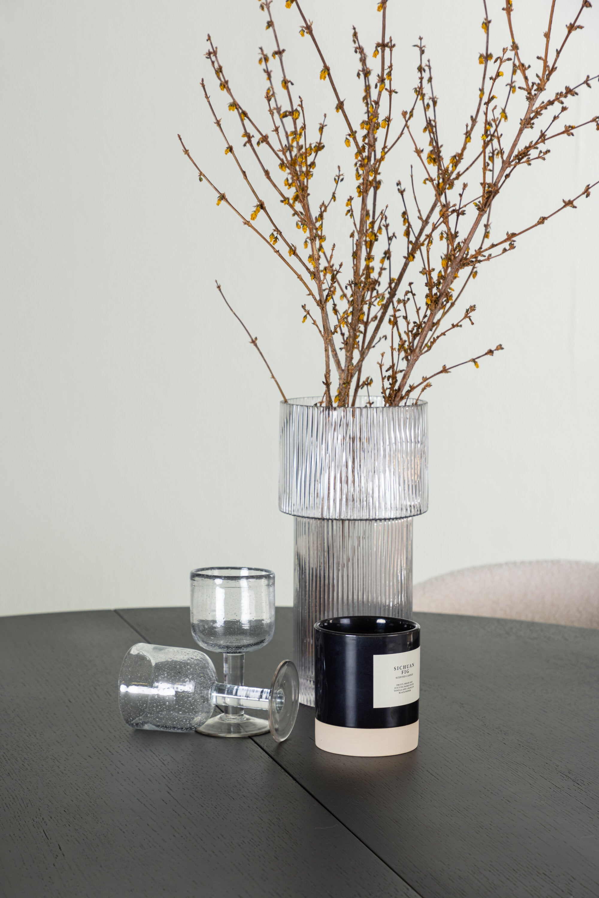 Představte si večer obklopený svými blízkými u tohoto krásného stolu. Stůl snadno roztáhnete do oválného tvaru, aby si jídlo mohli vychutnat všichni společně. Dvě nohy ve tvaru bloku, které tvoří rám, jsou žebrované v černé MDF a poskytují stolu dobrou stabilitu. Průměr stolu: 130 cm.