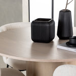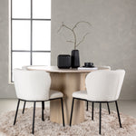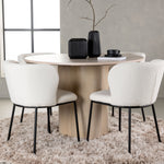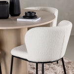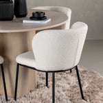 Zde sladíme bílý stůl s našimi krásnými jídelními židlemi ze série Edina. Tato židle se vyznačuje flexibilním a celočalouněným sedákem v bílé buklé látce, který dodává nádech luxusu a pohodlí. Minimalistické černé kovové nohy židle poskytují moderní kontrast a přispívají k elegantní estetice.