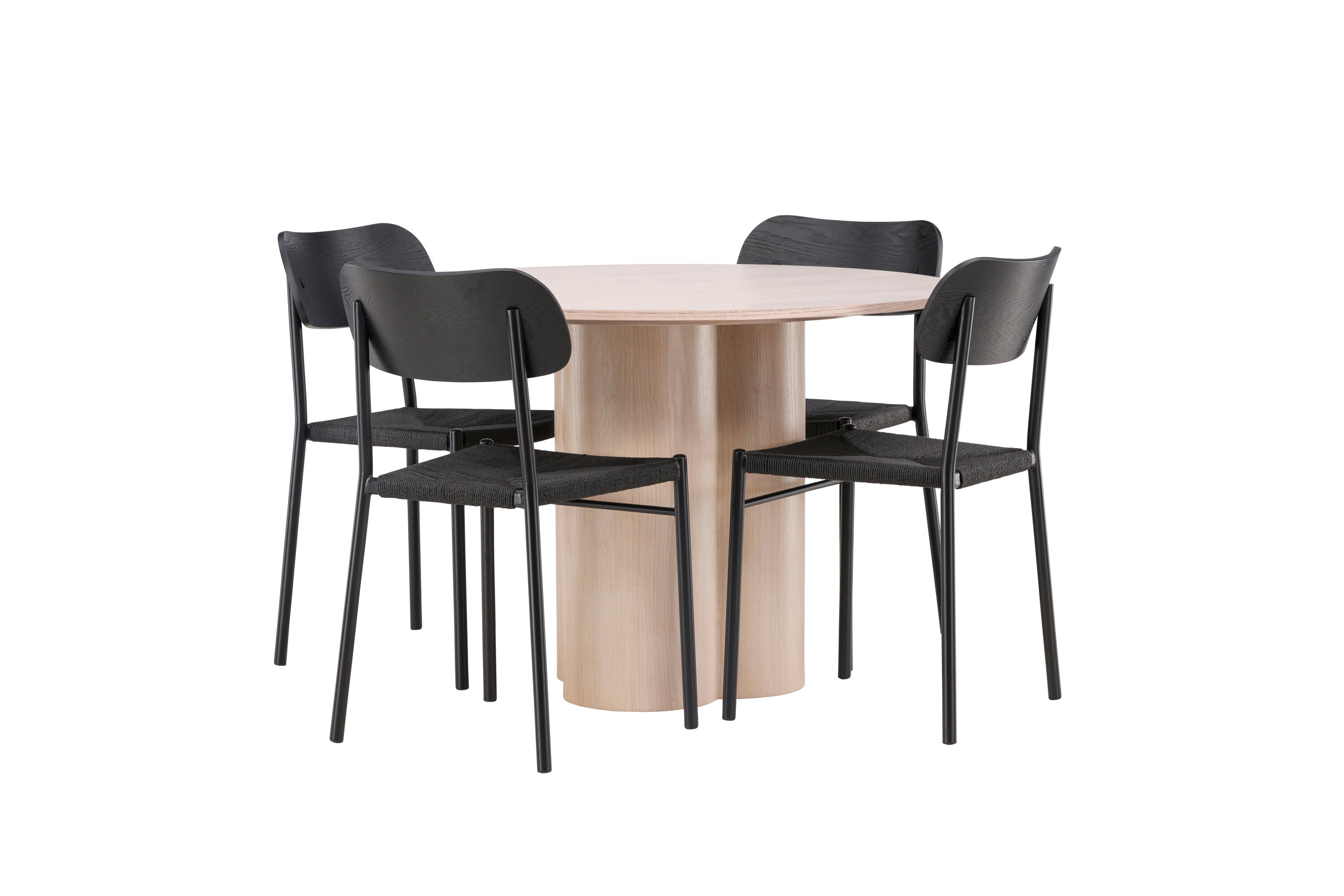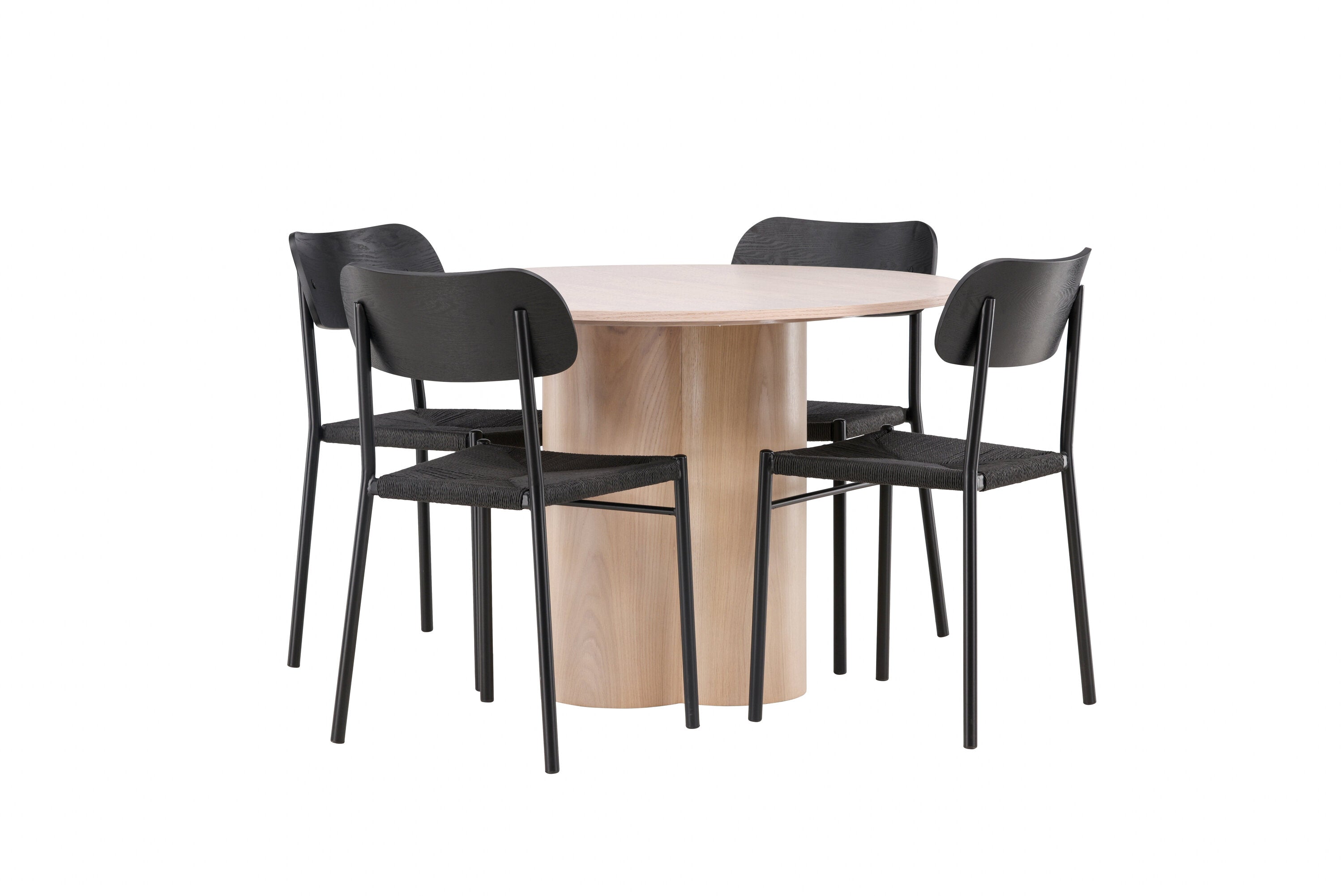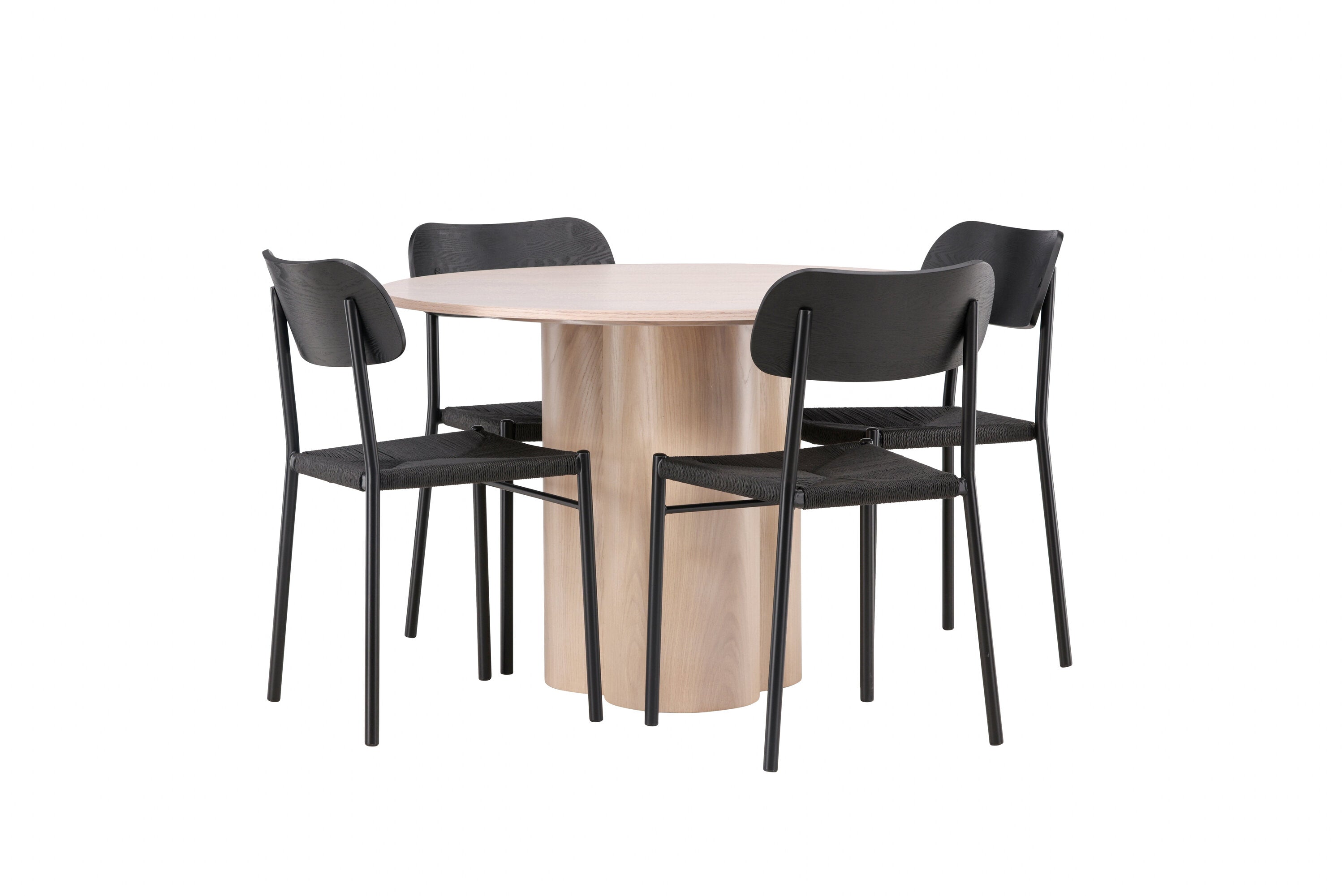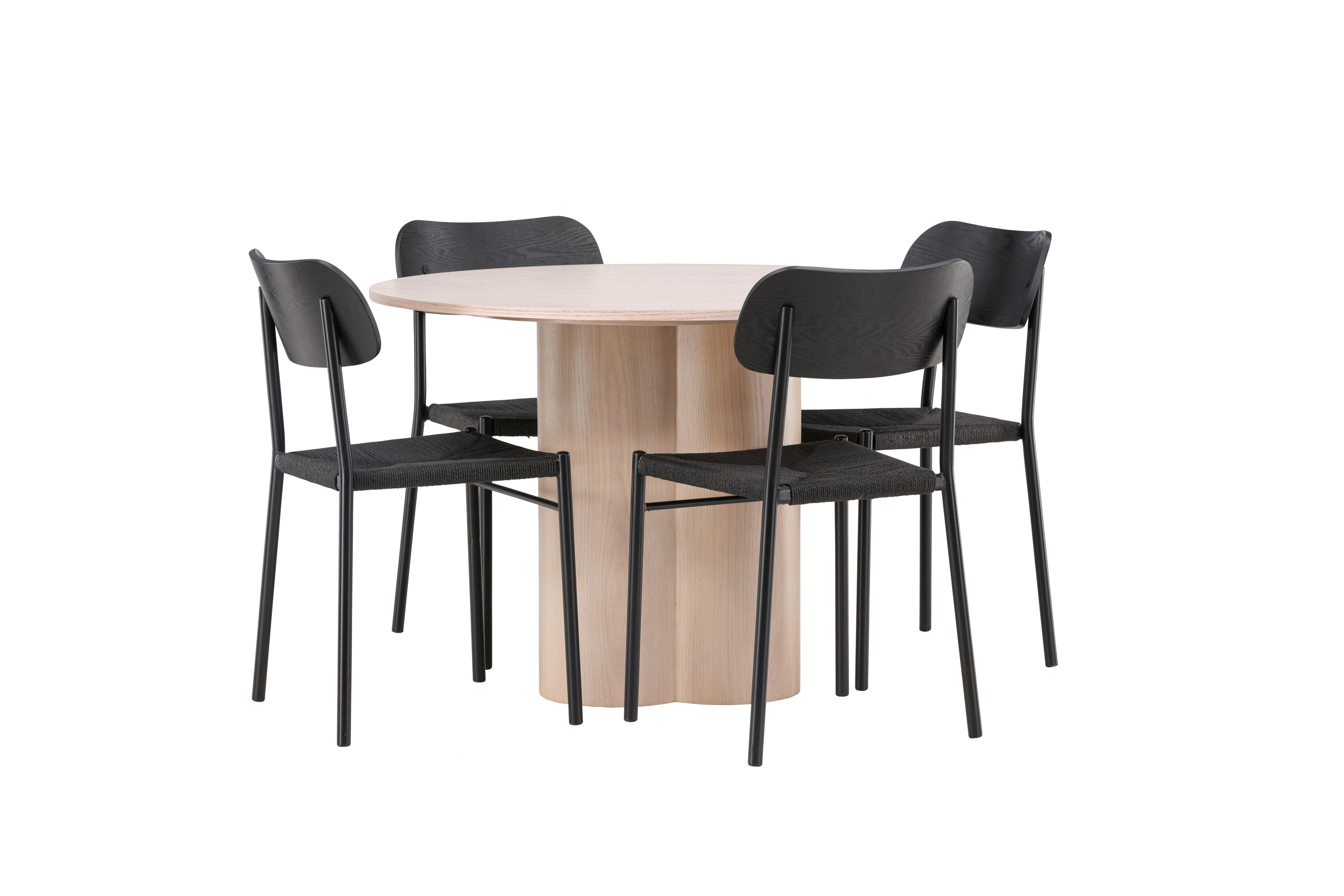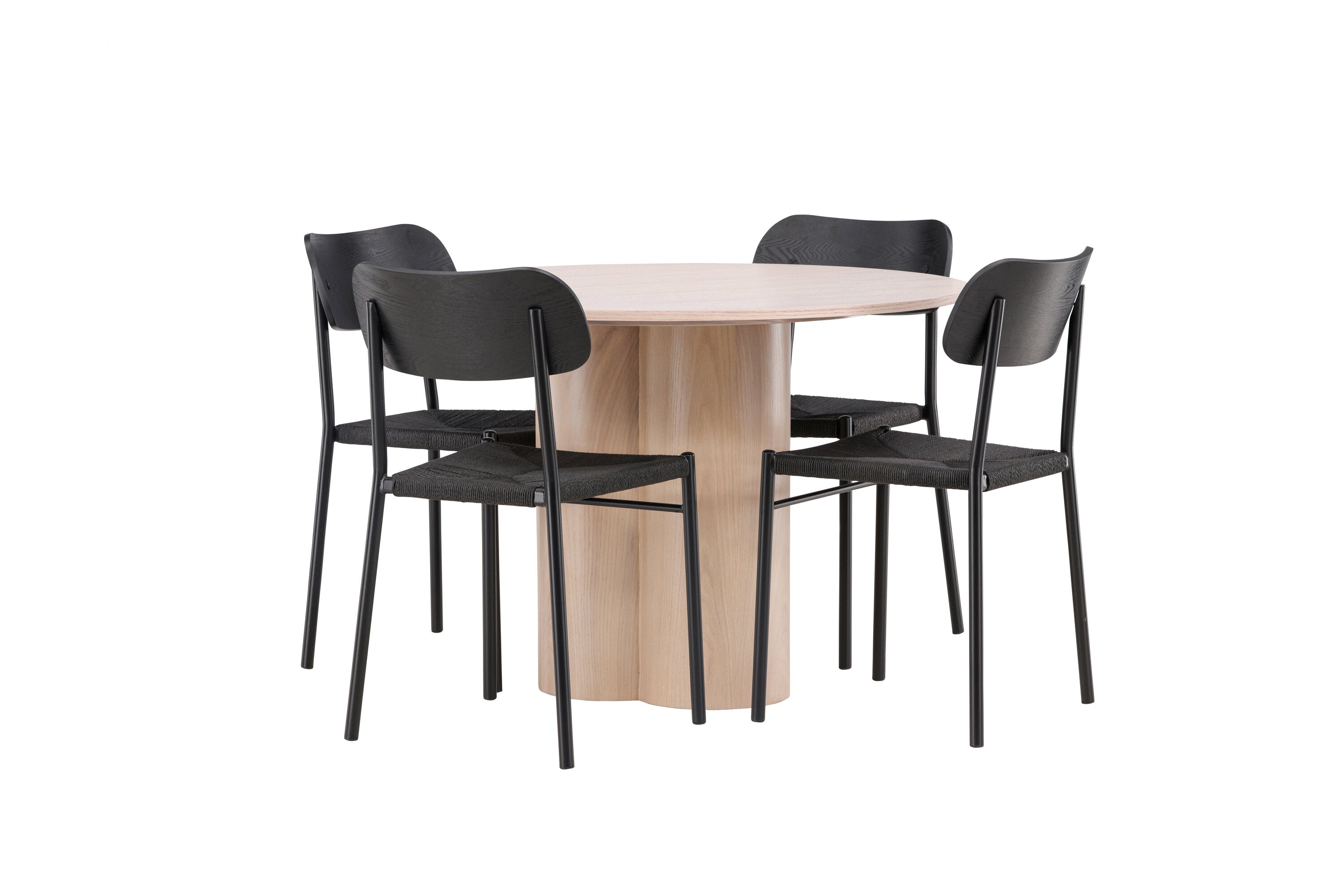 Tato skupina potravin kombinuje klasické tvary s dekorativním designem! Jídelní stůl ze série Olivia má konzistentní celkový design z bílé omítnuté MDF desky s tenkou, kulatou horní deskou a třemi válcovými nohami, které jsou shromážděny pod středem stolu. Barva má světlý kryt na dýhovaném kotouči, díky kterému je materiál viditelný, který dává stolu život a pohyb. Zde společně se 4 jídelními židlemi ze série Polly. Opěradlo židle je z černé MDF s dýhou a sedák z trendy černé látky z přírodních vláken. Nohy židle jsou z kovu s černou práškovou barvou. Srdce nábytkového domu zve!