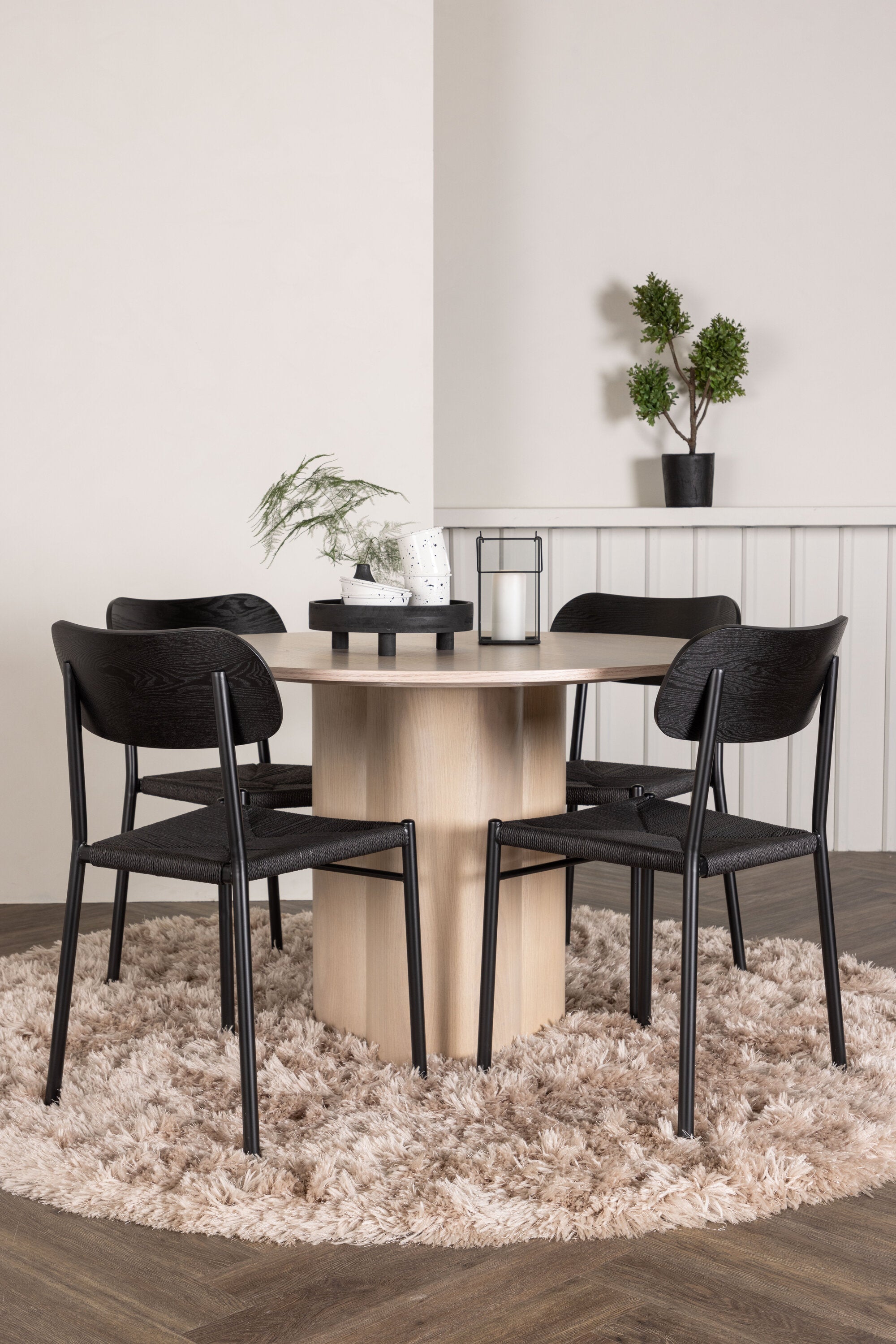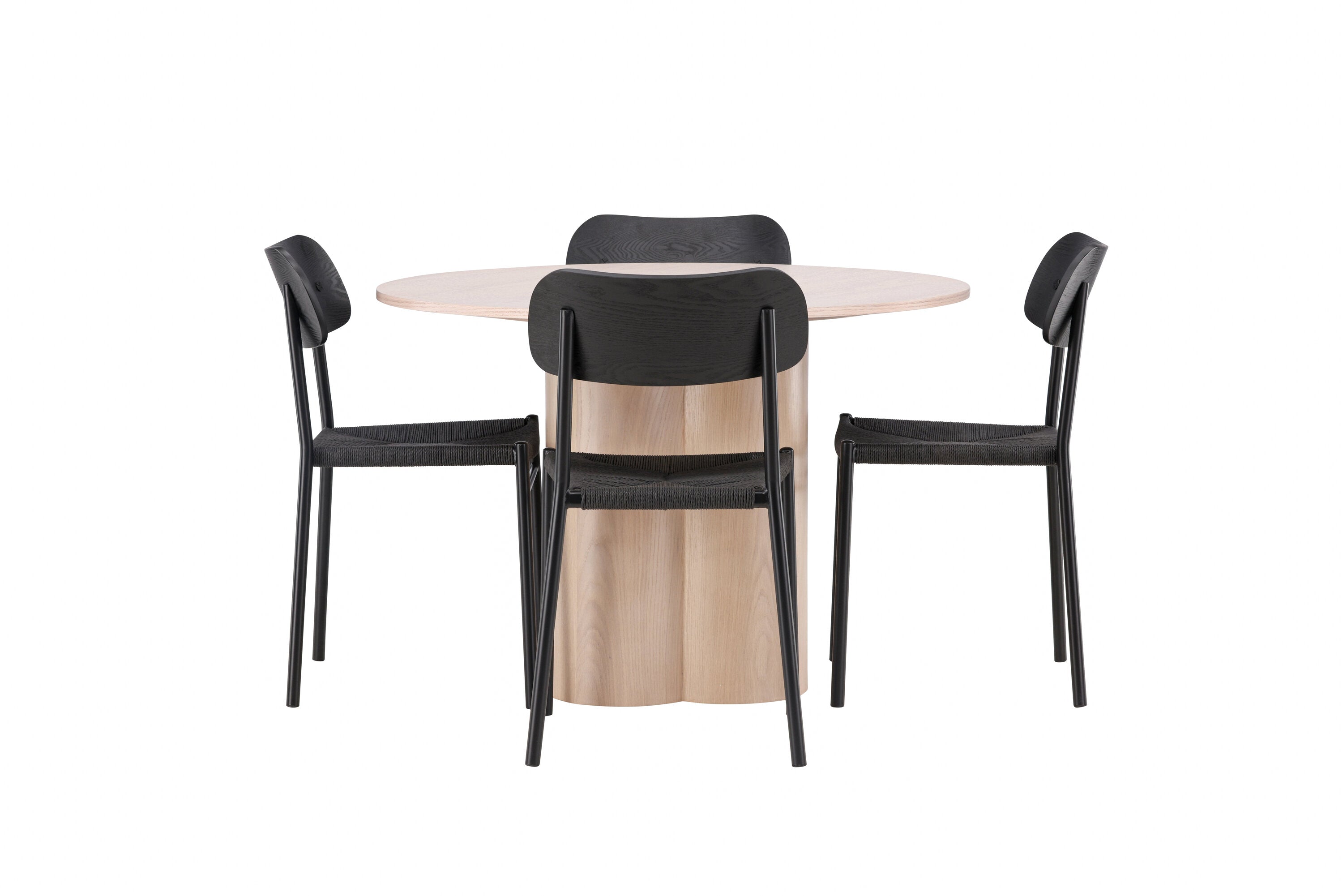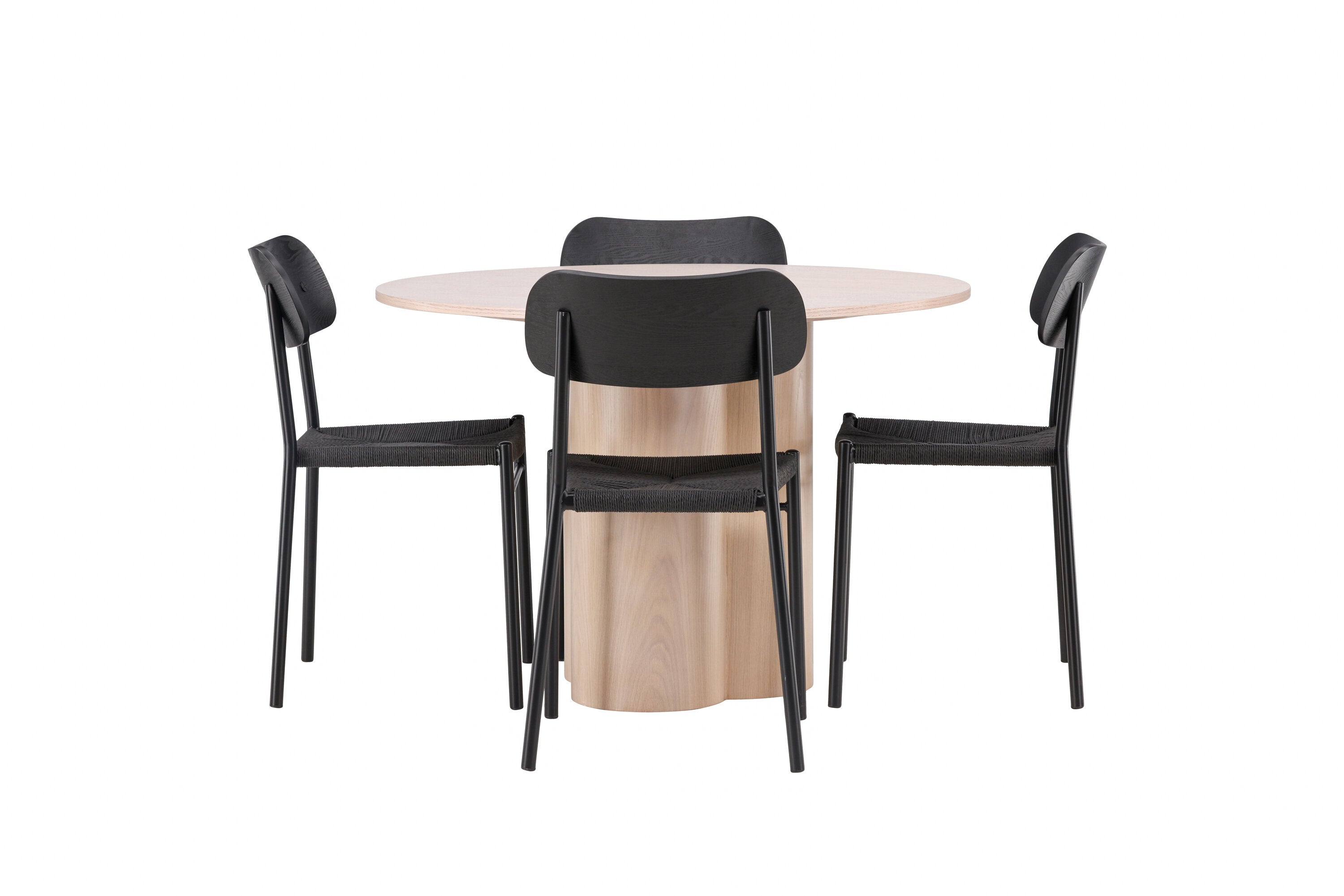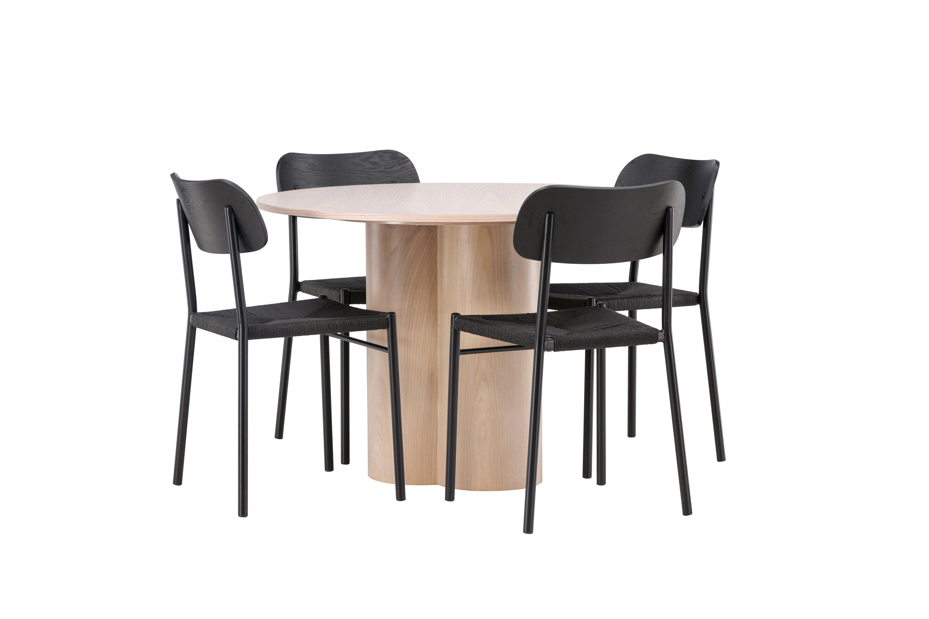 Tato skupina potravin kombinuje klasické tvary s dekorativním designem! Jídelní stůl ze série Olivia má konzistentní celkový design z bílé omítnuté MDF desky s tenkou, kulatou horní deskou a třemi válcovými nohami, které jsou shromážděny pod středem stolu. Barva má světlý kryt na dýhovaném kotouči, díky kterému je materiál viditelný, který dává stolu život a pohyb. Zde společně se 4 jídelními židlemi ze série Polly. Opěradlo židle je z černé MDF s dýhou a sedák z trendy černé látky z přírodních vláken. Nohy židle jsou z kovu s černou práškovou barvou. Srdce nábytkového domu zve!