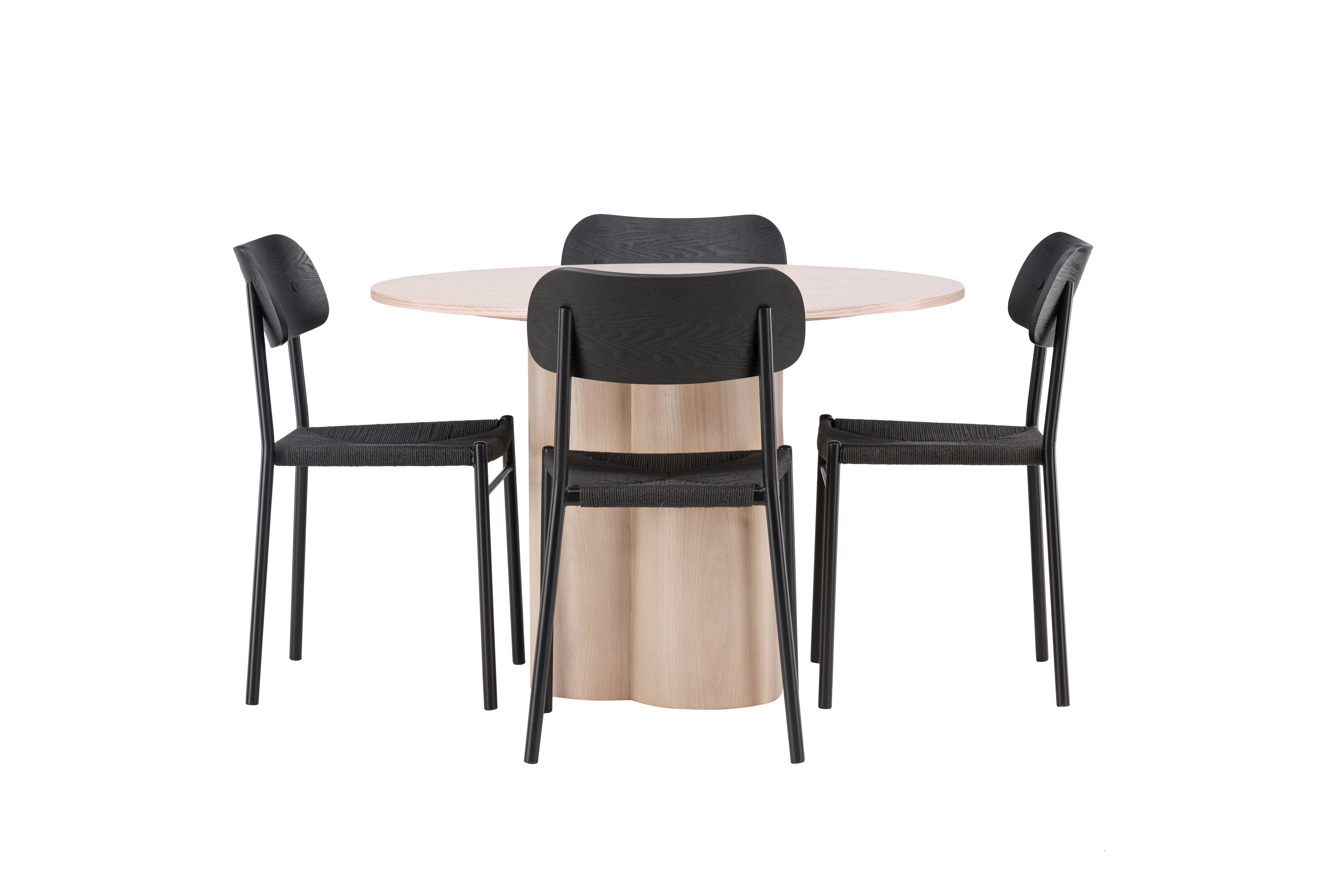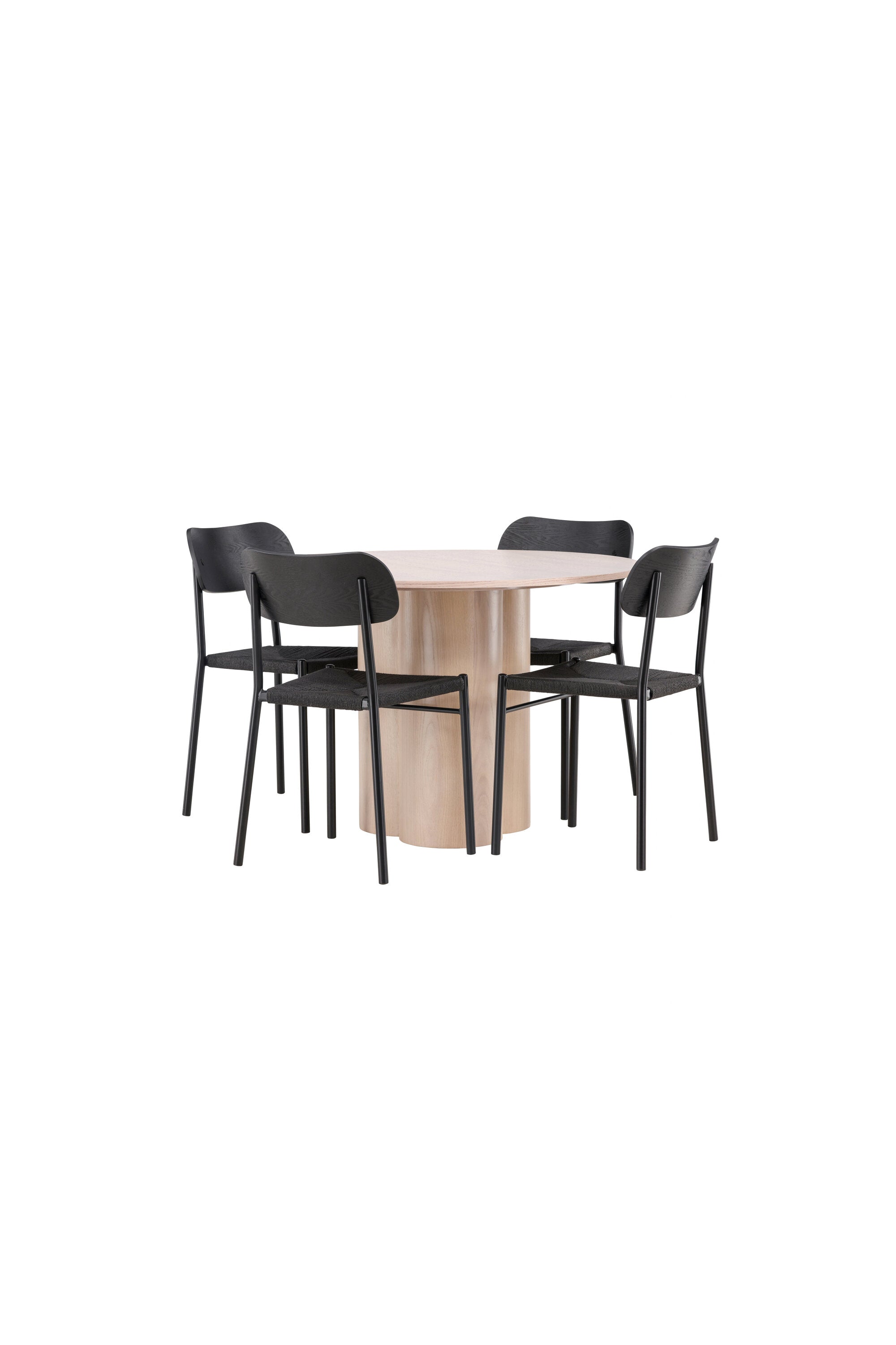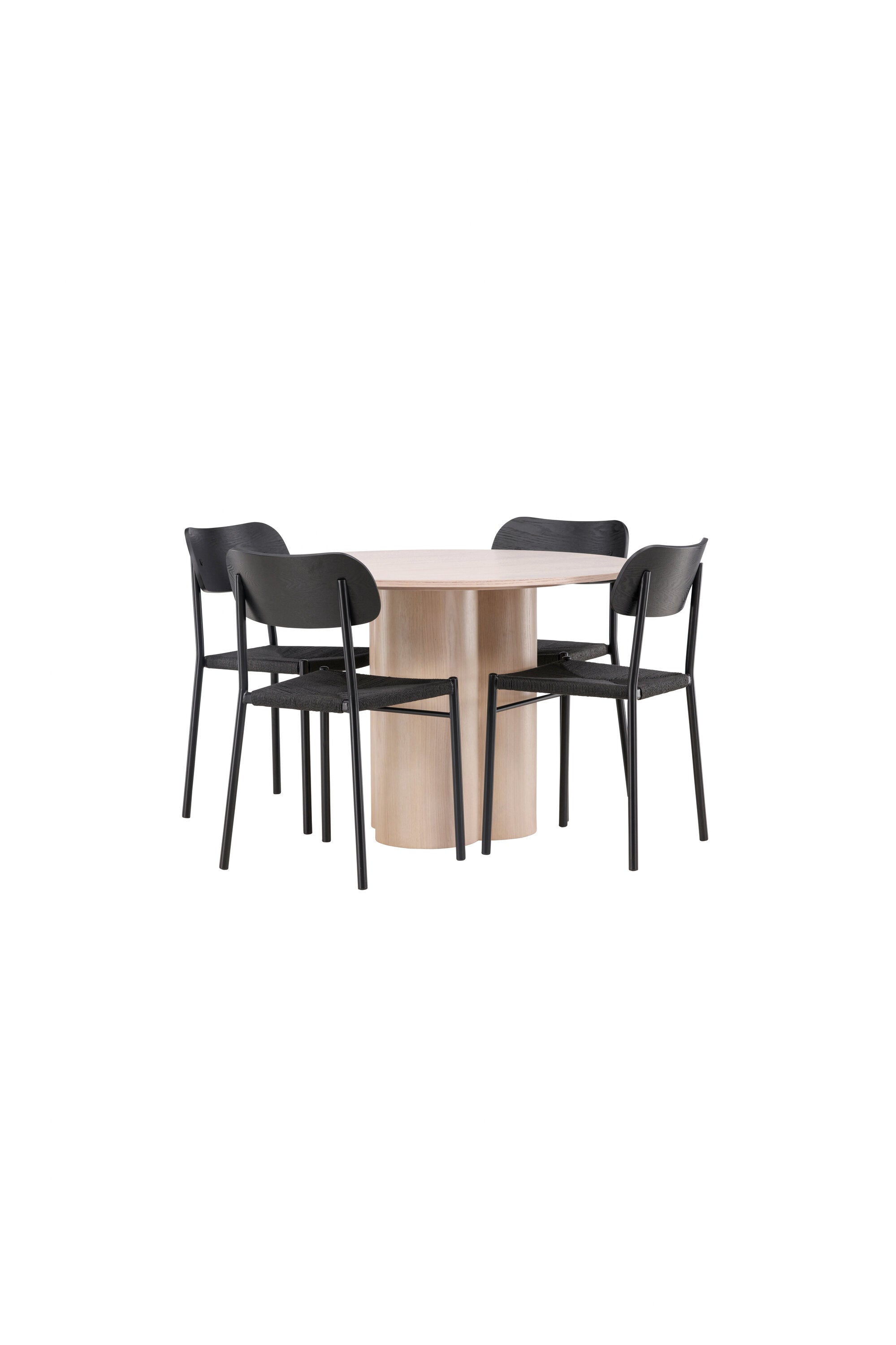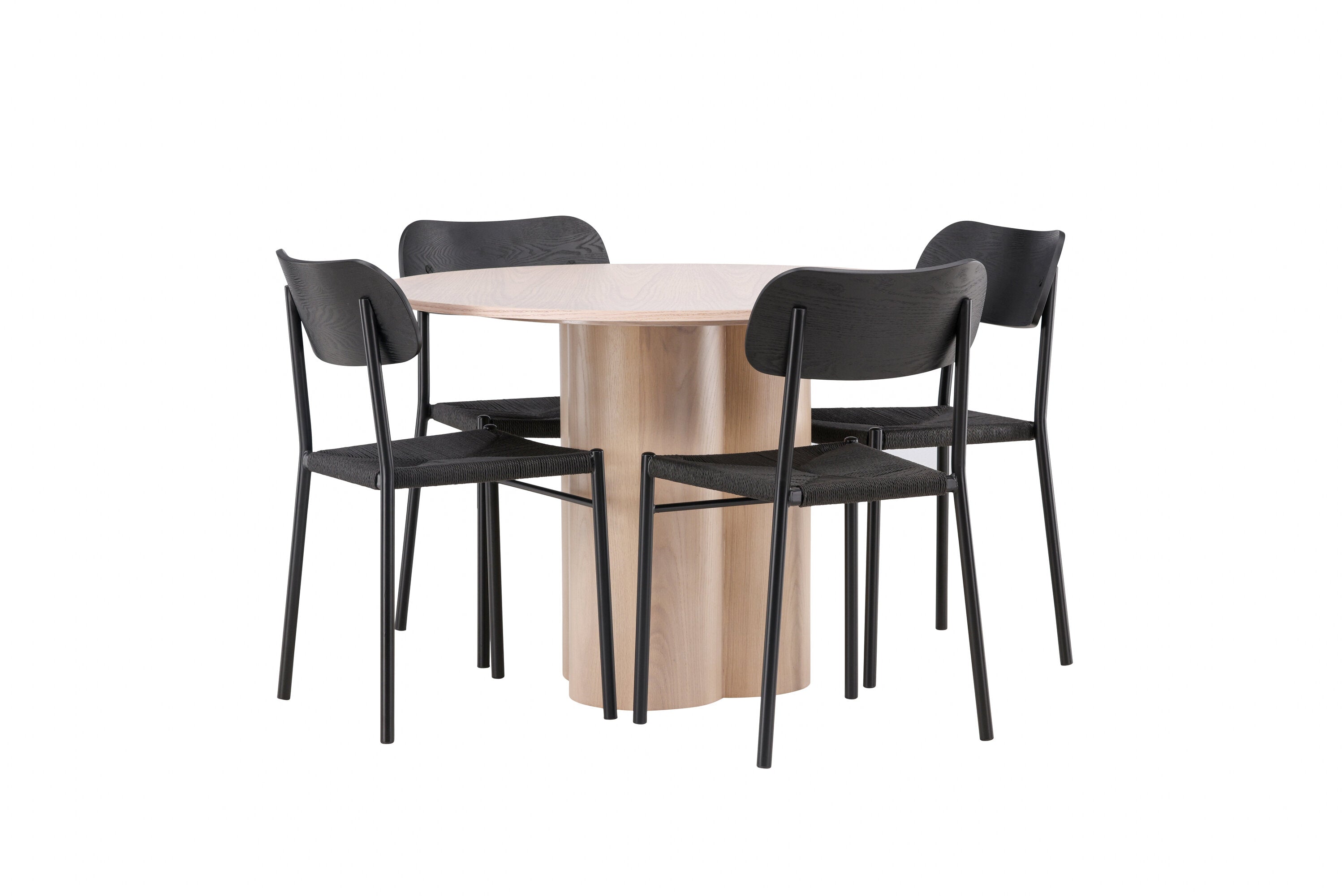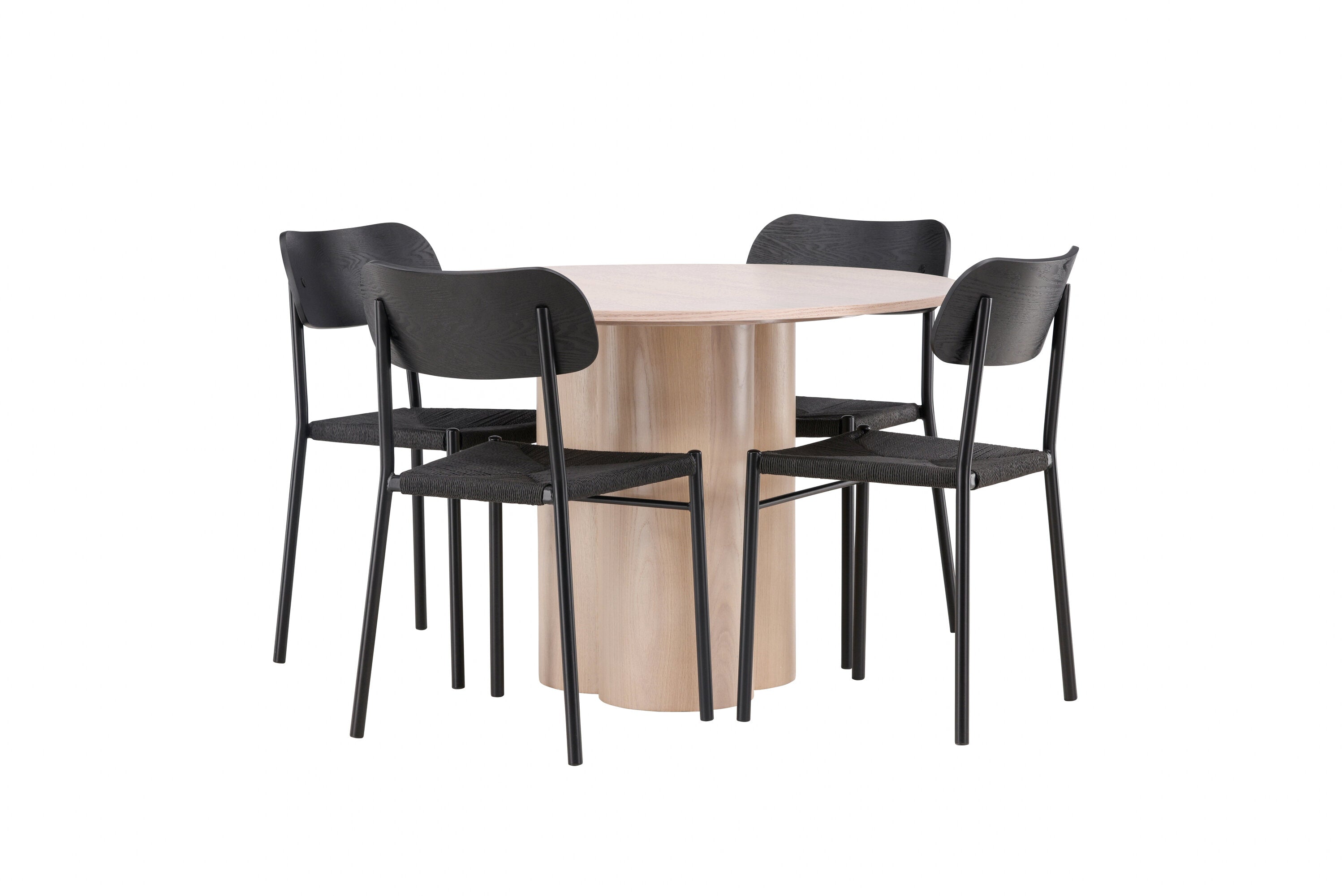 Tato skupina potravin kombinuje klasické tvary s dekorativním designem! Jídelní stůl ze série Olivia má konzistentní celkový design z bílé omítnuté MDF desky s tenkou, kulatou horní deskou a třemi válcovými nohami, které jsou shromážděny pod středem stolu. Barva má světlý kryt na dýhovaném kotouči, díky kterému je materiál viditelný, který dává stolu život a pohyb. Zde společně se 4 jídelními židlemi ze série Polly. Opěradlo židle je z černé MDF s dýhou a sedák z trendy černé látky z přírodních vláken. Nohy židle jsou z kovu s černou práškovou barvou. Srdce nábytkového domu zve!