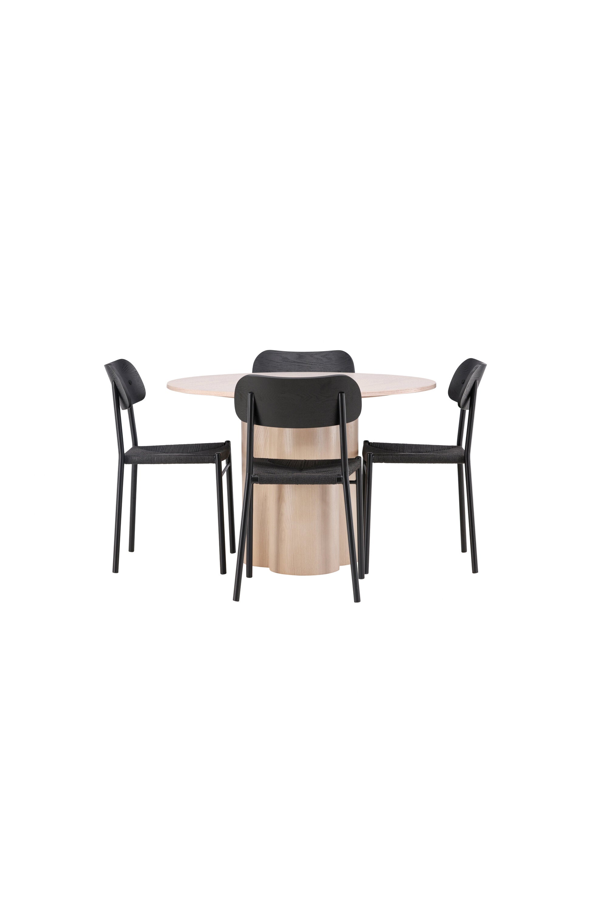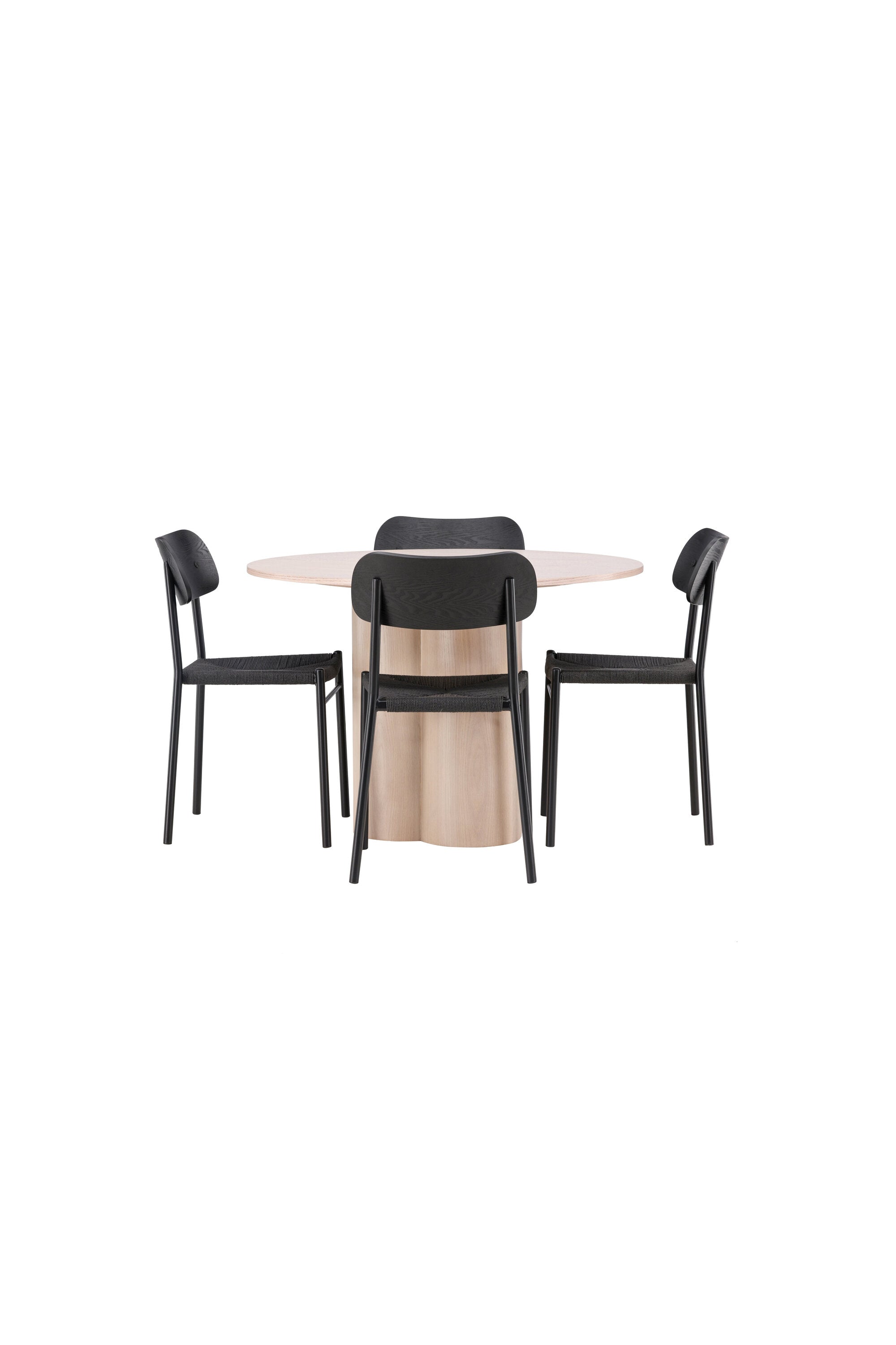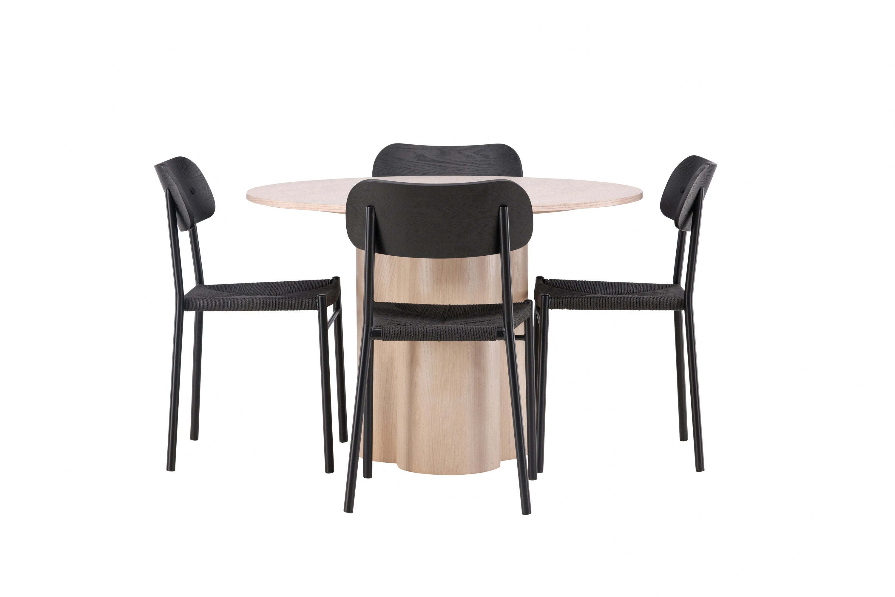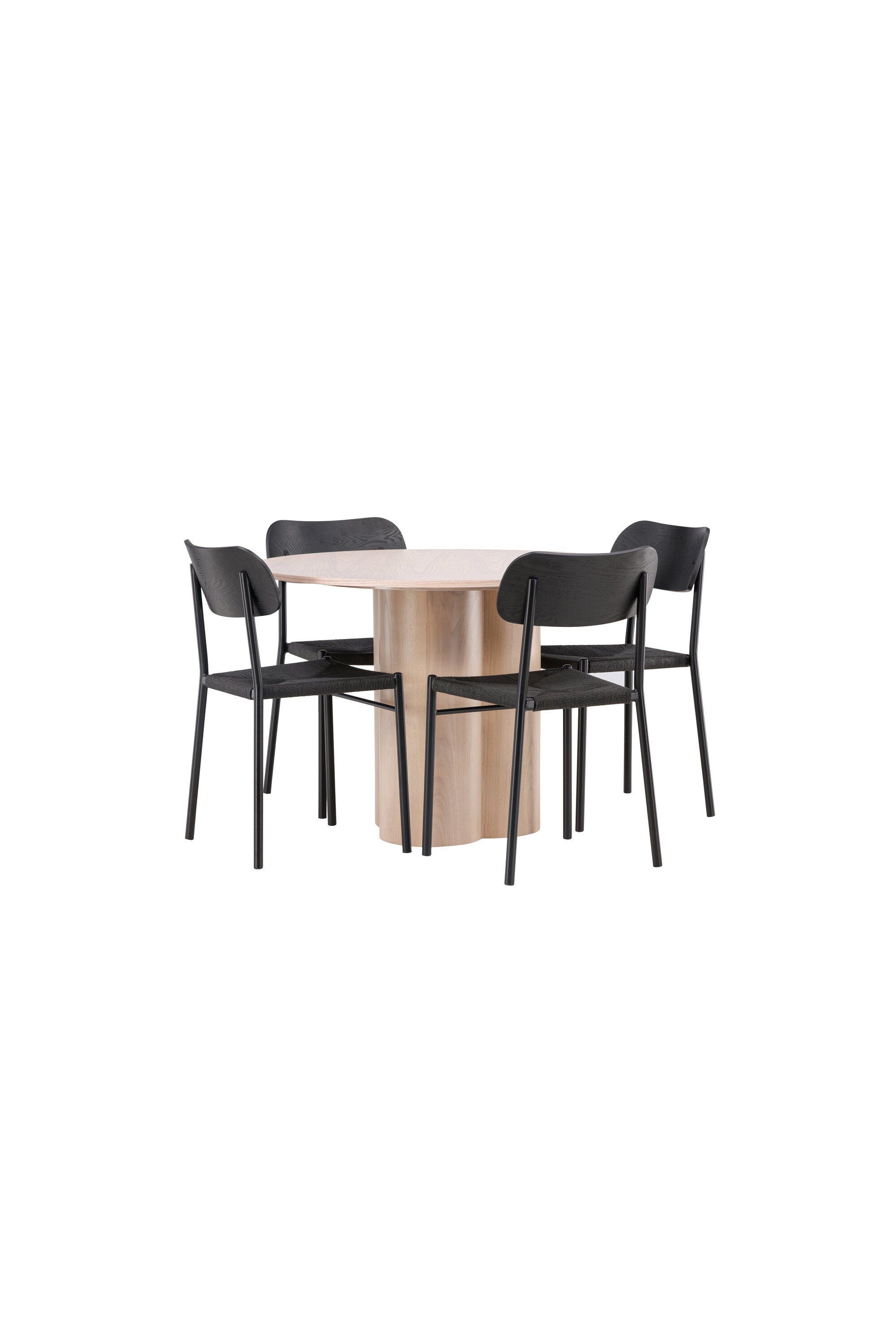 Tato skupina potravin kombinuje klasické tvary s dekorativním designem! Jídelní stůl ze série Olivia má konzistentní celkový design z bílé omítnuté MDF desky s tenkou, kulatou horní deskou a třemi válcovými nohami, které jsou shromážděny pod středem stolu. Barva má světlý kryt na dýhovaném kotouči, díky kterému je materiál viditelný, který dává stolu život a pohyb. Zde společně se 4 jídelními židlemi ze série Polly. Opěradlo židle je z černé MDF s dýhou a sedák z trendy černé látky z přírodních vláken. Nohy židle jsou z kovu s černou práškovou barvou. Srdce nábytkového domu zve!