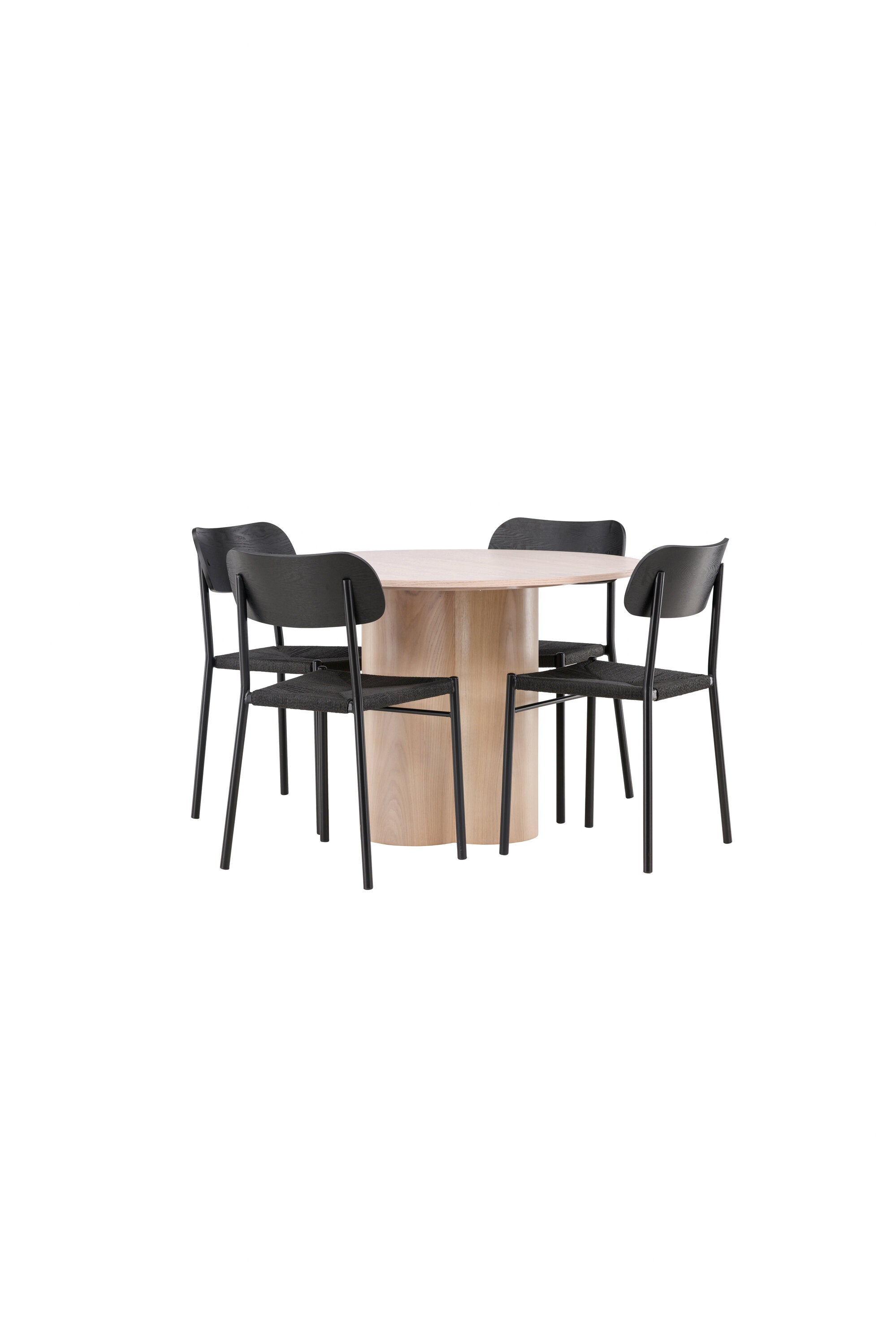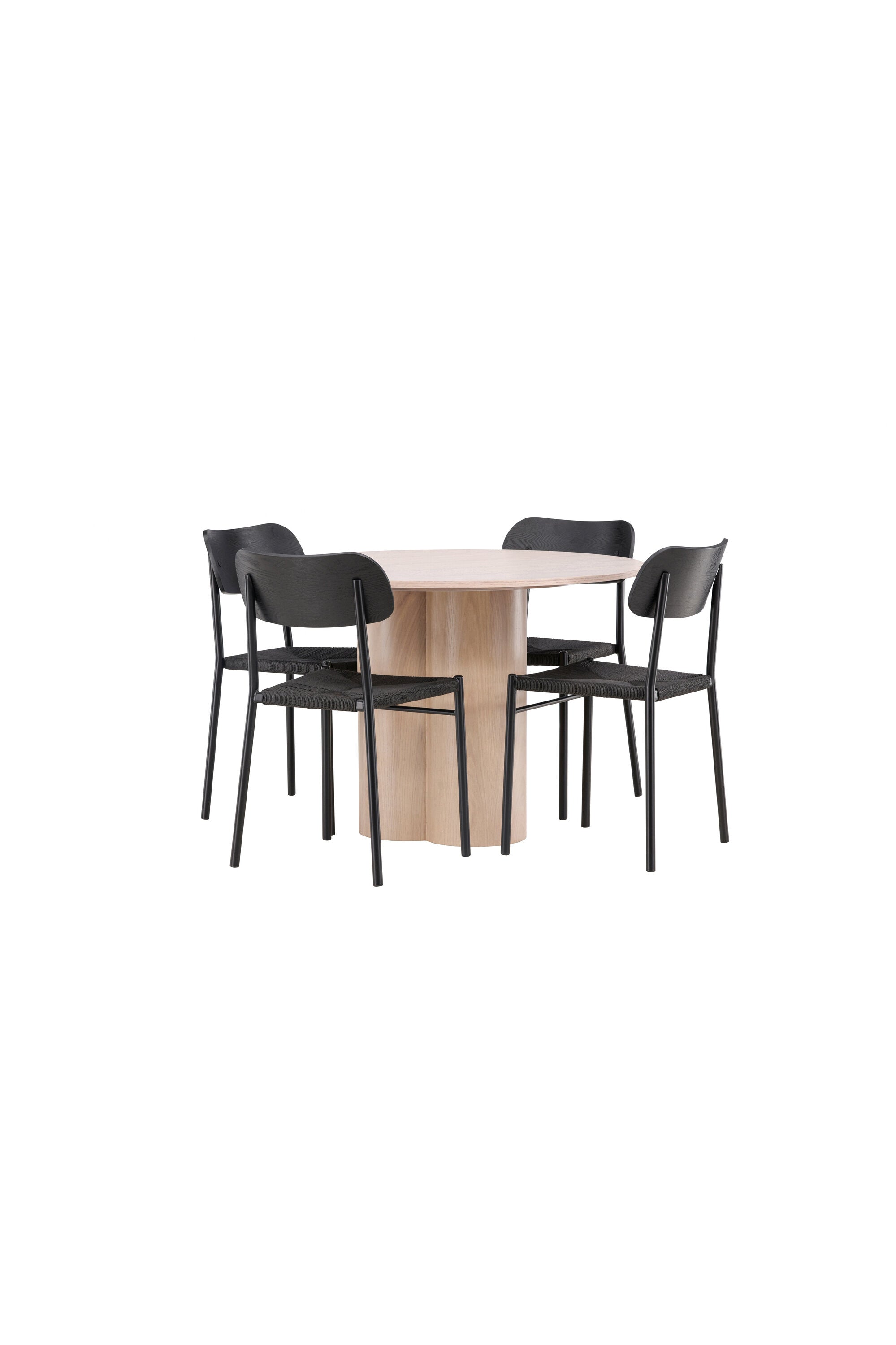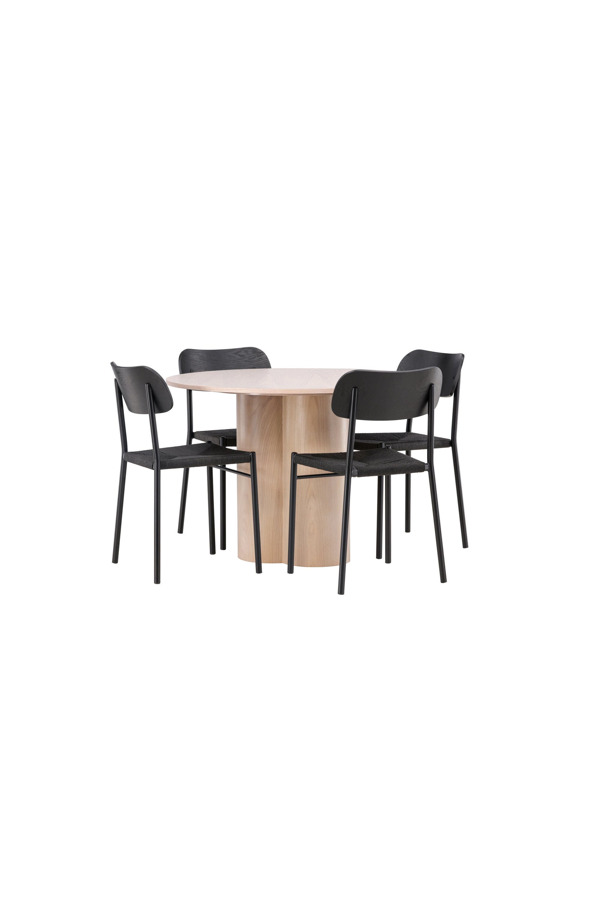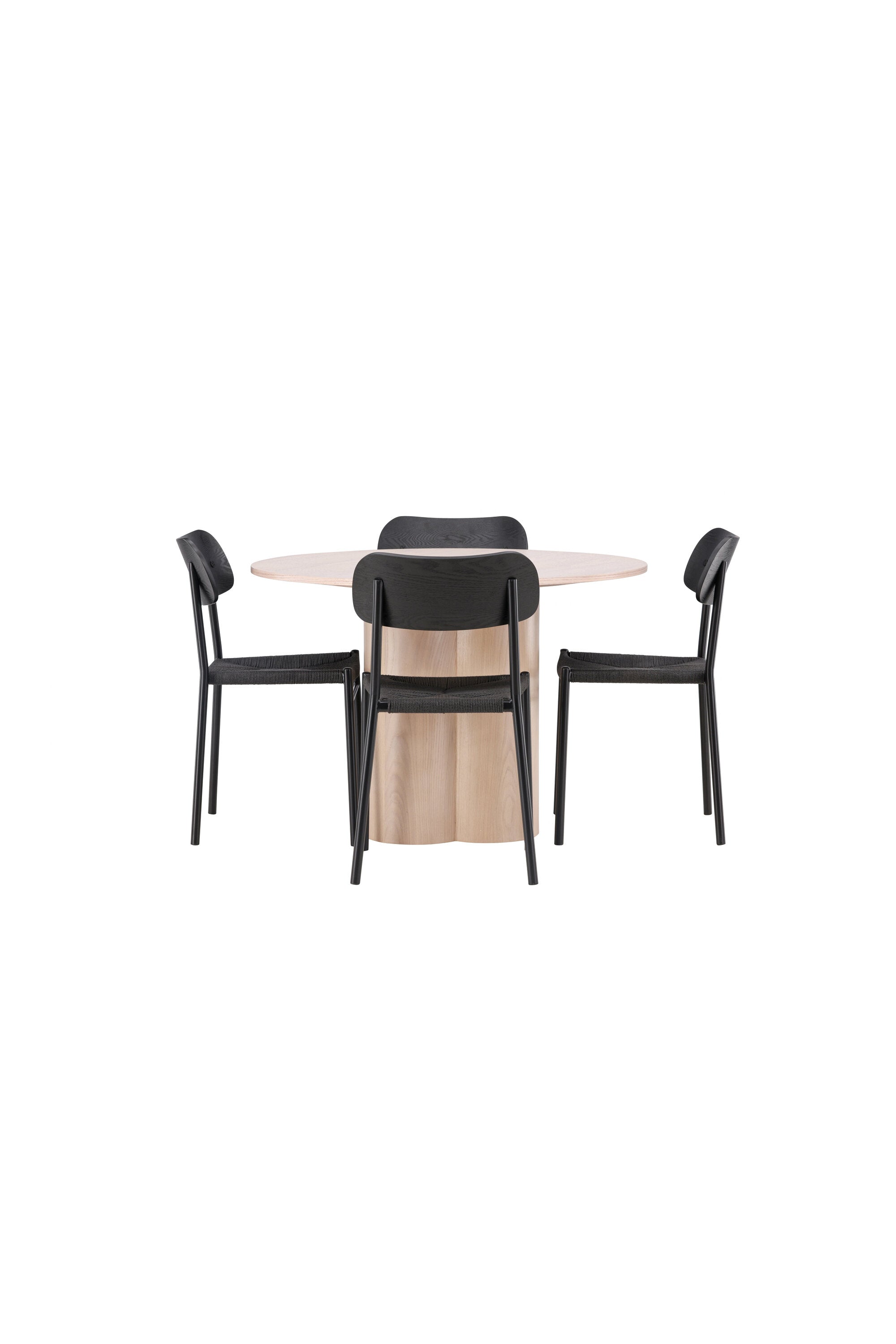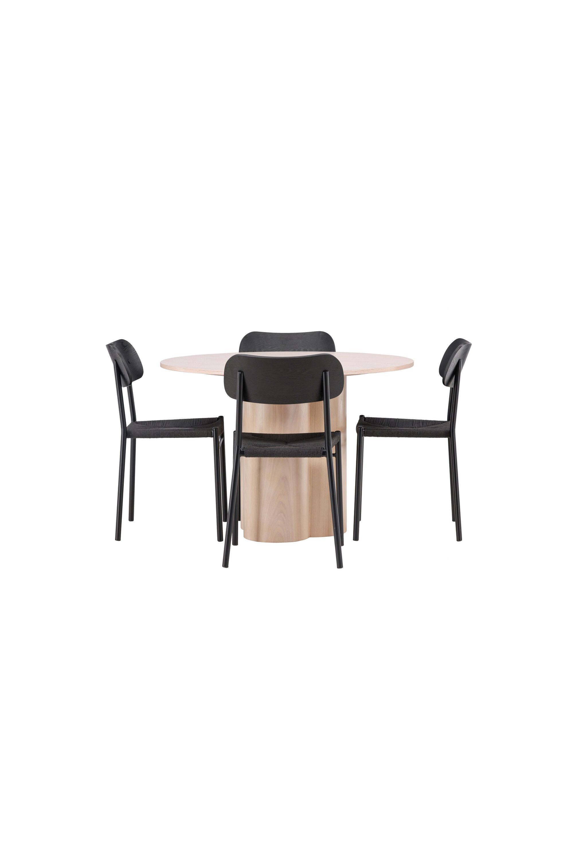 Tato skupina potravin kombinuje klasické tvary s dekorativním designem! Jídelní stůl ze série Olivia má konzistentní celkový design z bílé omítnuté MDF desky s tenkou, kulatou horní deskou a třemi válcovými nohami, které jsou shromážděny pod středem stolu. Barva má světlý kryt na dýhovaném kotouči, díky kterému je materiál viditelný, který dává stolu život a pohyb. Zde společně se 4 jídelními židlemi ze série Polly. Opěradlo židle je z černé MDF s dýhou a sedák z trendy černé látky z přírodních vláken. Nohy židle jsou z kovu s černou práškovou barvou. Srdce nábytkového domu zve!