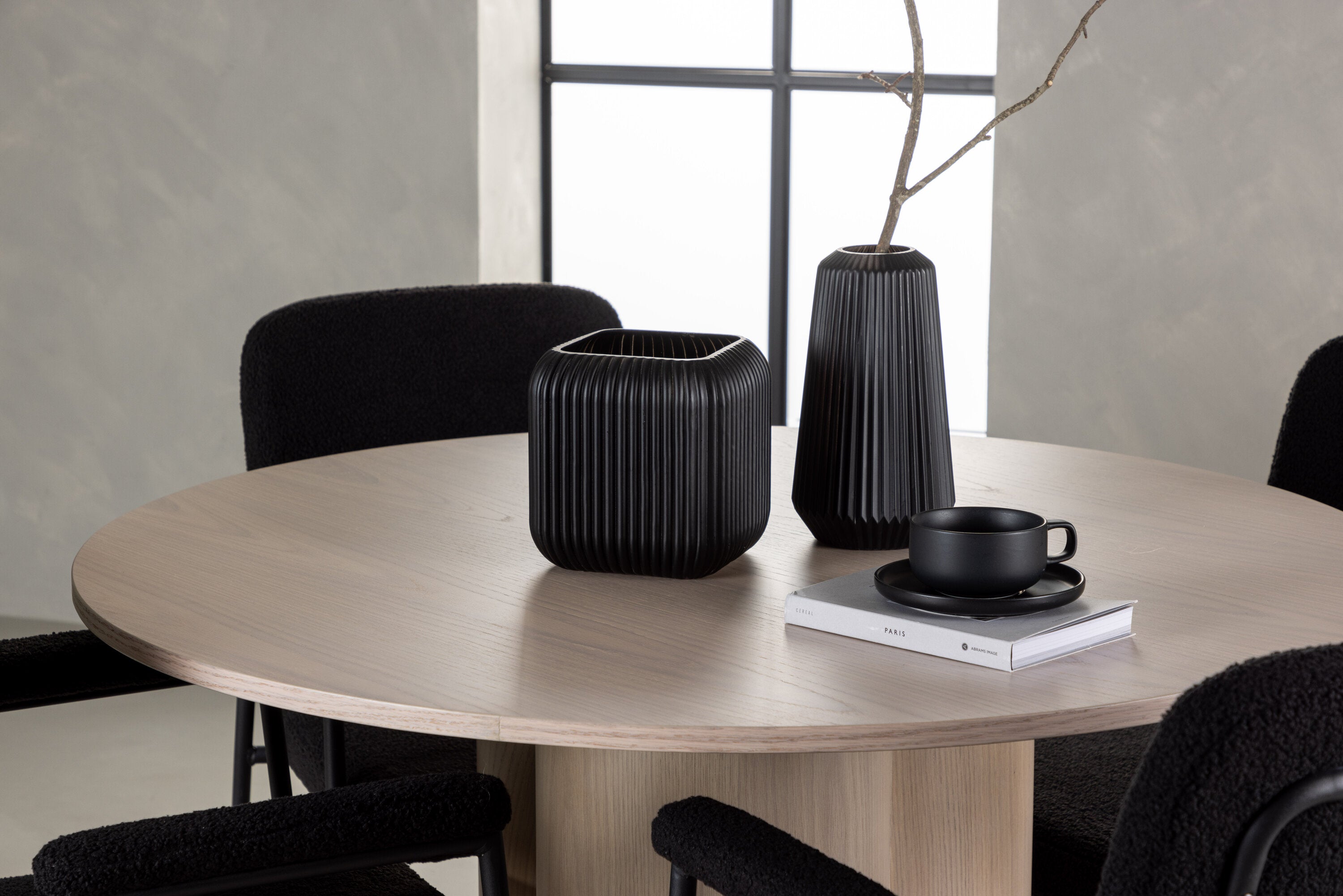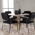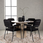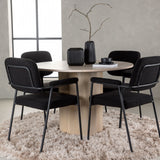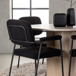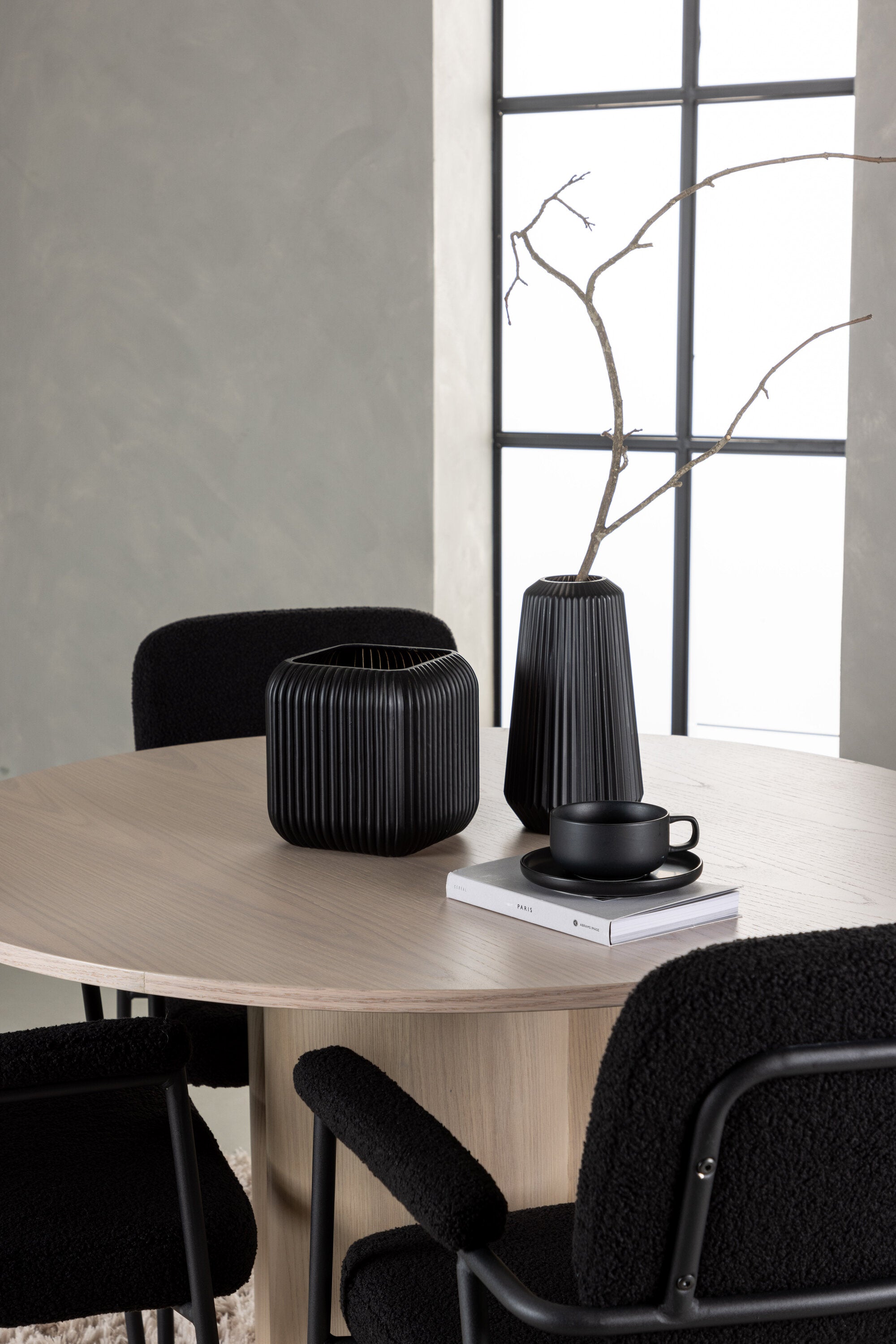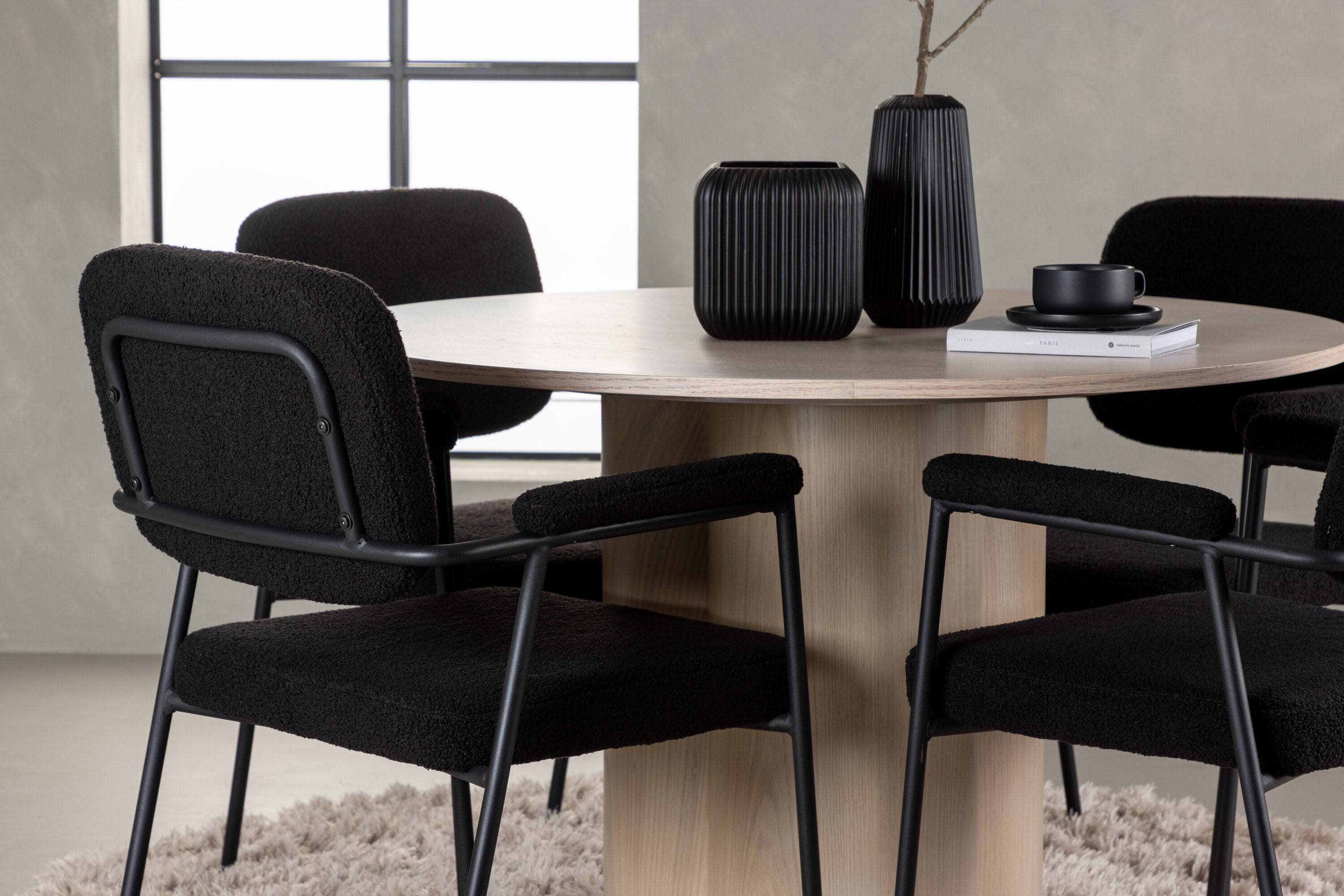 Zde v dokonalé kombinaci s našimi černými jídelními židlemi ze série Yesterday. Židle se vyznačuje elegantním skandinávským designem s celočalouněným sedákem v černé boucle tkanině, který poskytuje luxusní a měkký pocit. Tenké nohy židle s integrovanými područkami v černém kovu nabízejí styl i pohodlí.