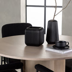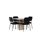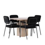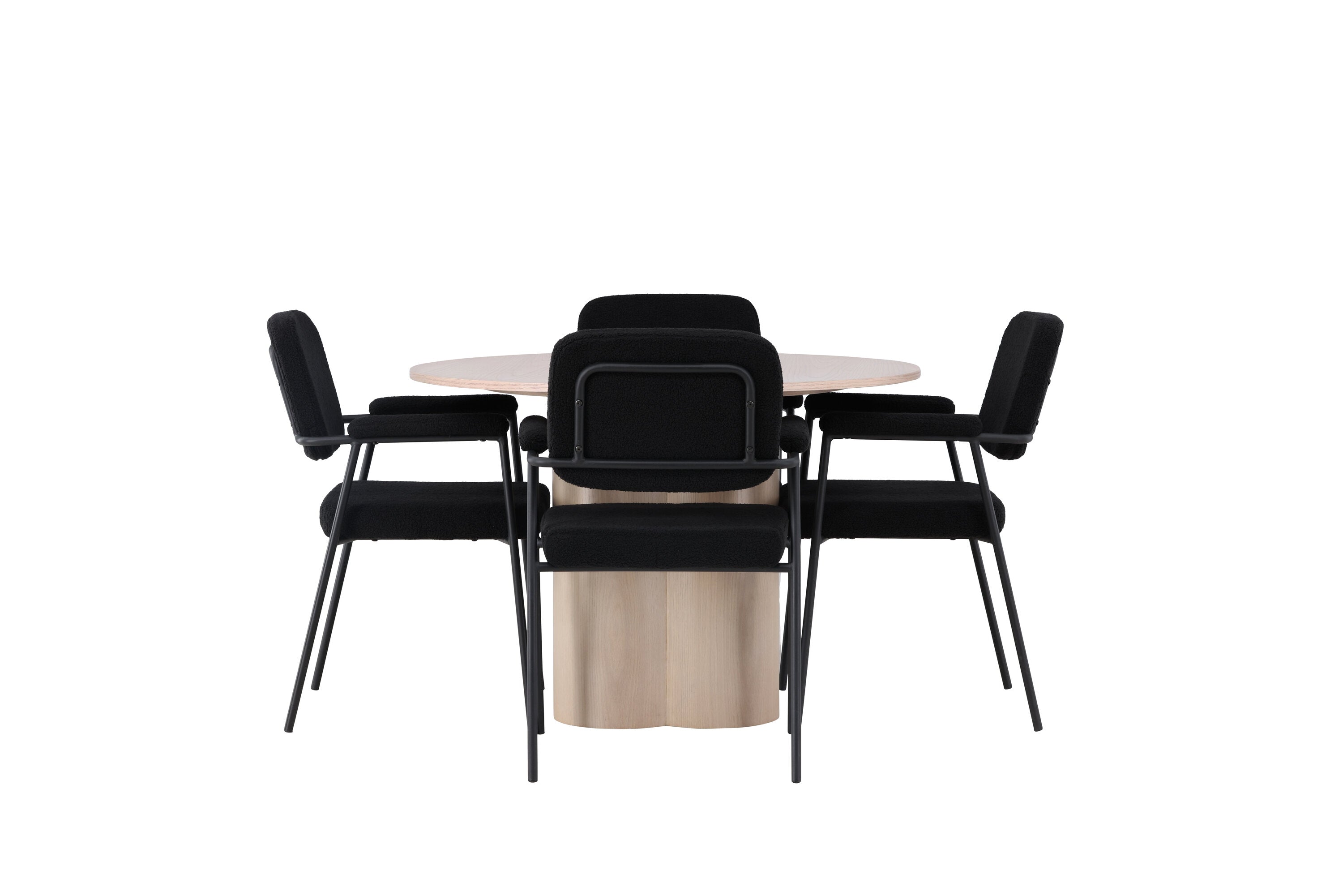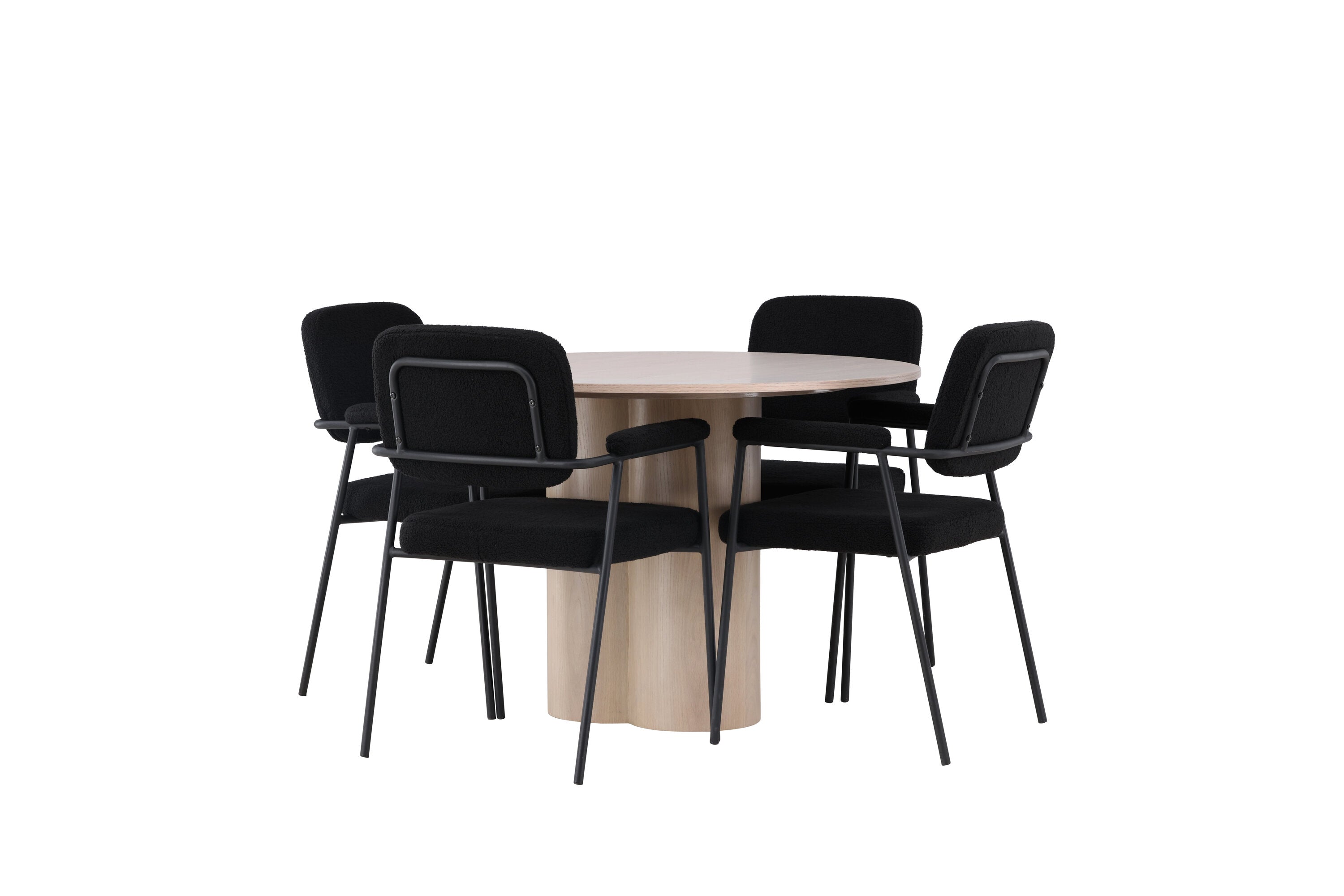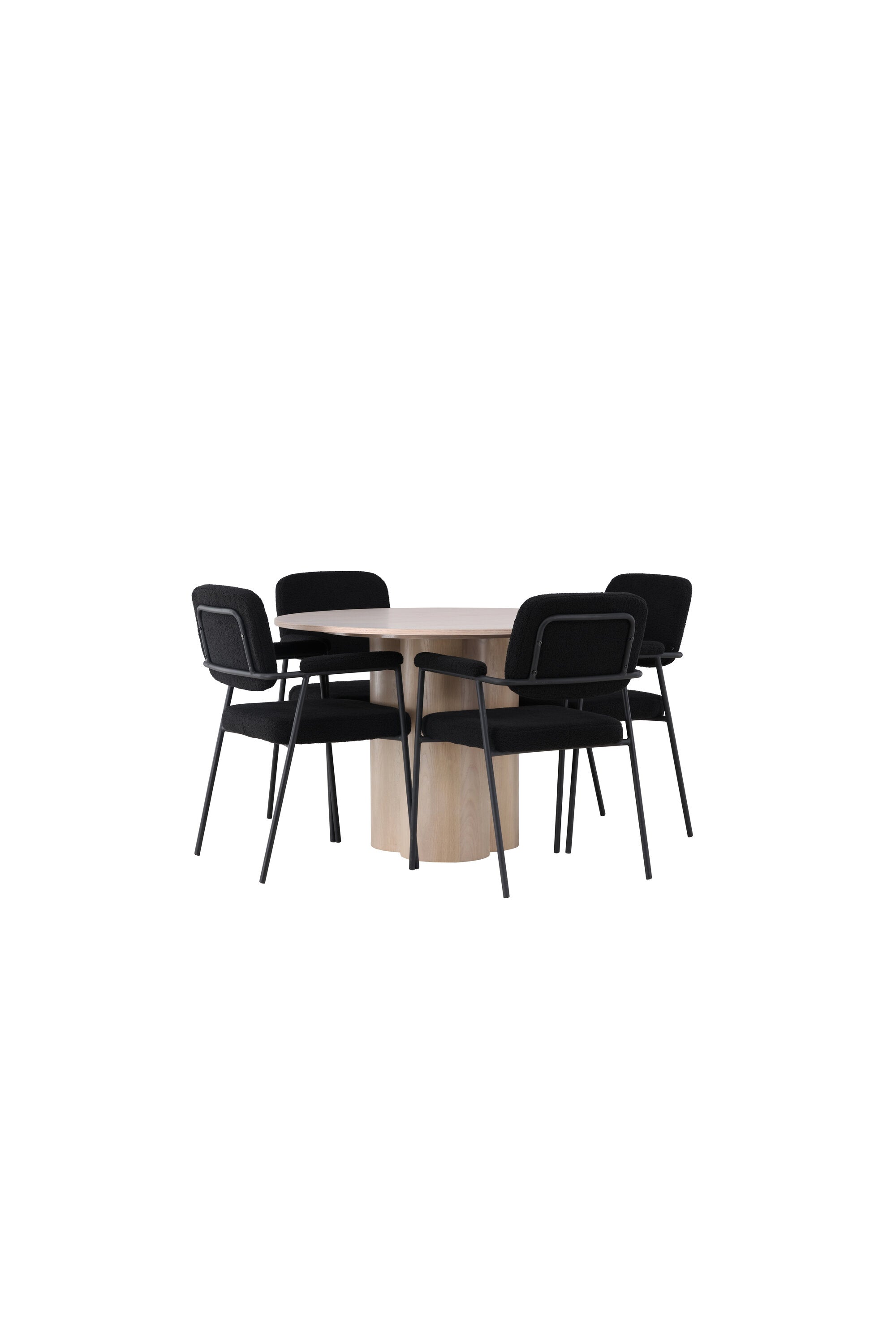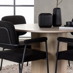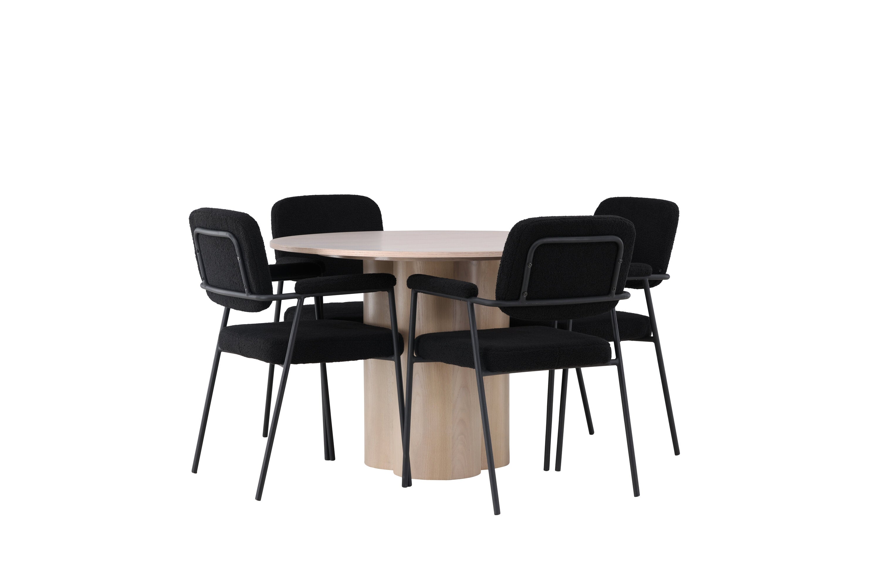 Zde v dokonalé kombinaci s našimi černými jídelními židlemi ze série Yesterday. Židle se vyznačuje elegantním skandinávským designem s celočalouněným sedákem v černé boucle tkanině, který poskytuje luxusní a měkký pocit. Tenké nohy židle s integrovanými područkami v černém kovu nabízejí styl i pohodlí.