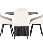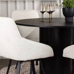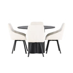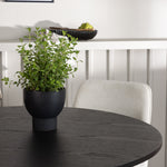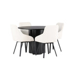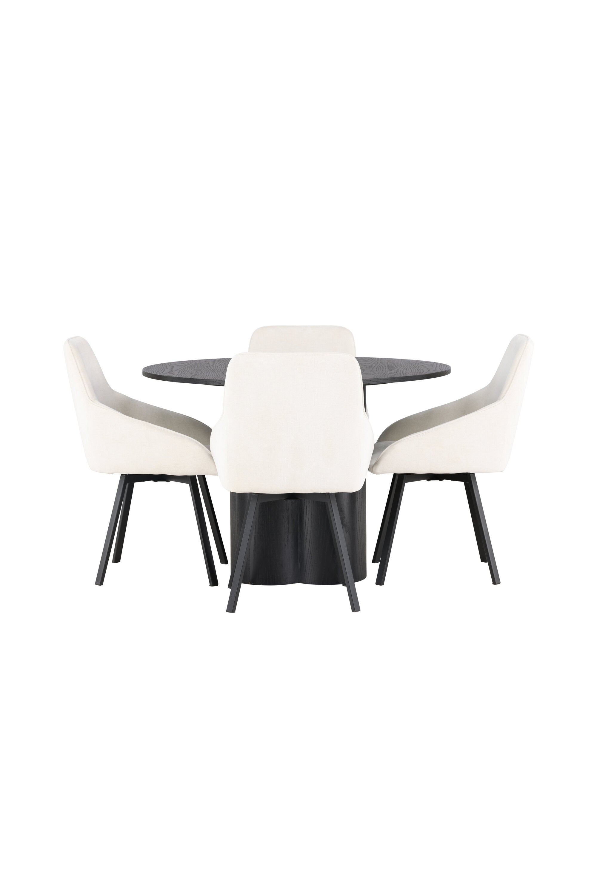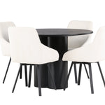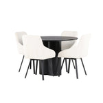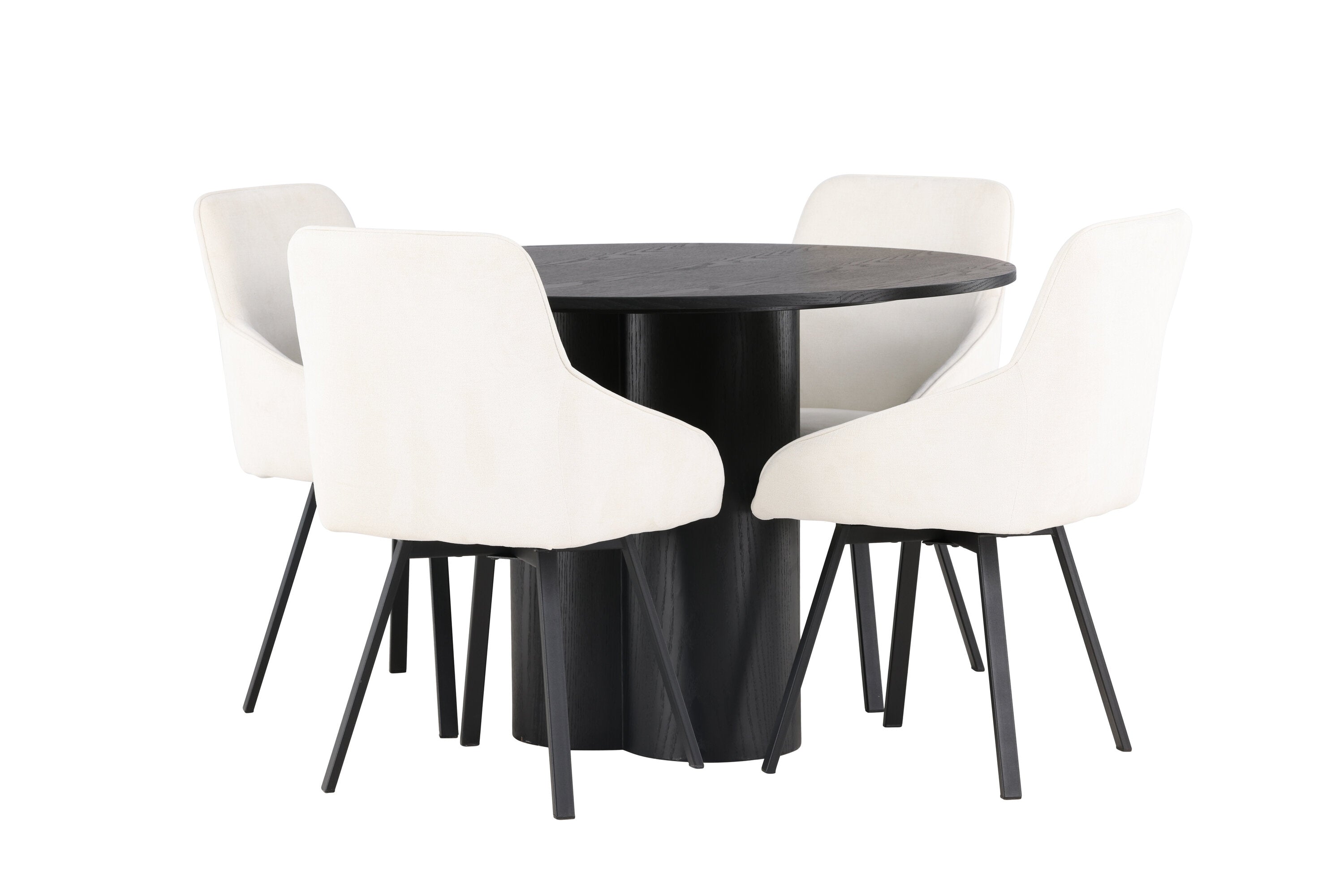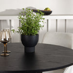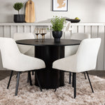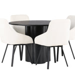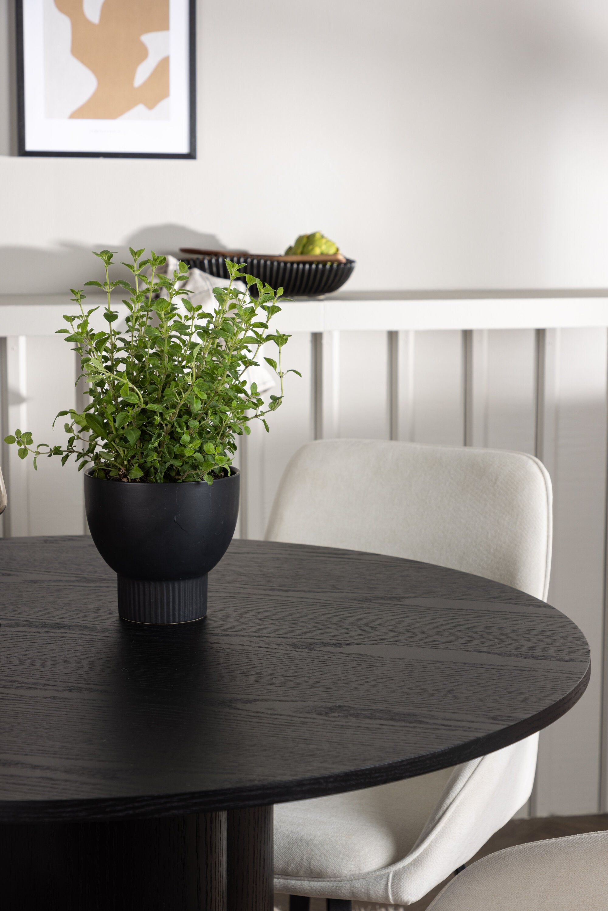 Zvyšte úroveň stylu ve svém domově s jídelním setem navrženým zcela v souladu s aktuálními trendy! Náš kulatý jídelní stůl ze série Olivia potěší oko svou tenkou deskou a černou MDF s dýhou. Lehce krycí barva zvýrazňuje krásný vzor materiálu a stává se stylovým detailem. Se třemi válcovitými nohami shromážděnými pod středem stolu získáte robustní rám, který dlouho vydrží. Rozměry stolu: 110 cm.