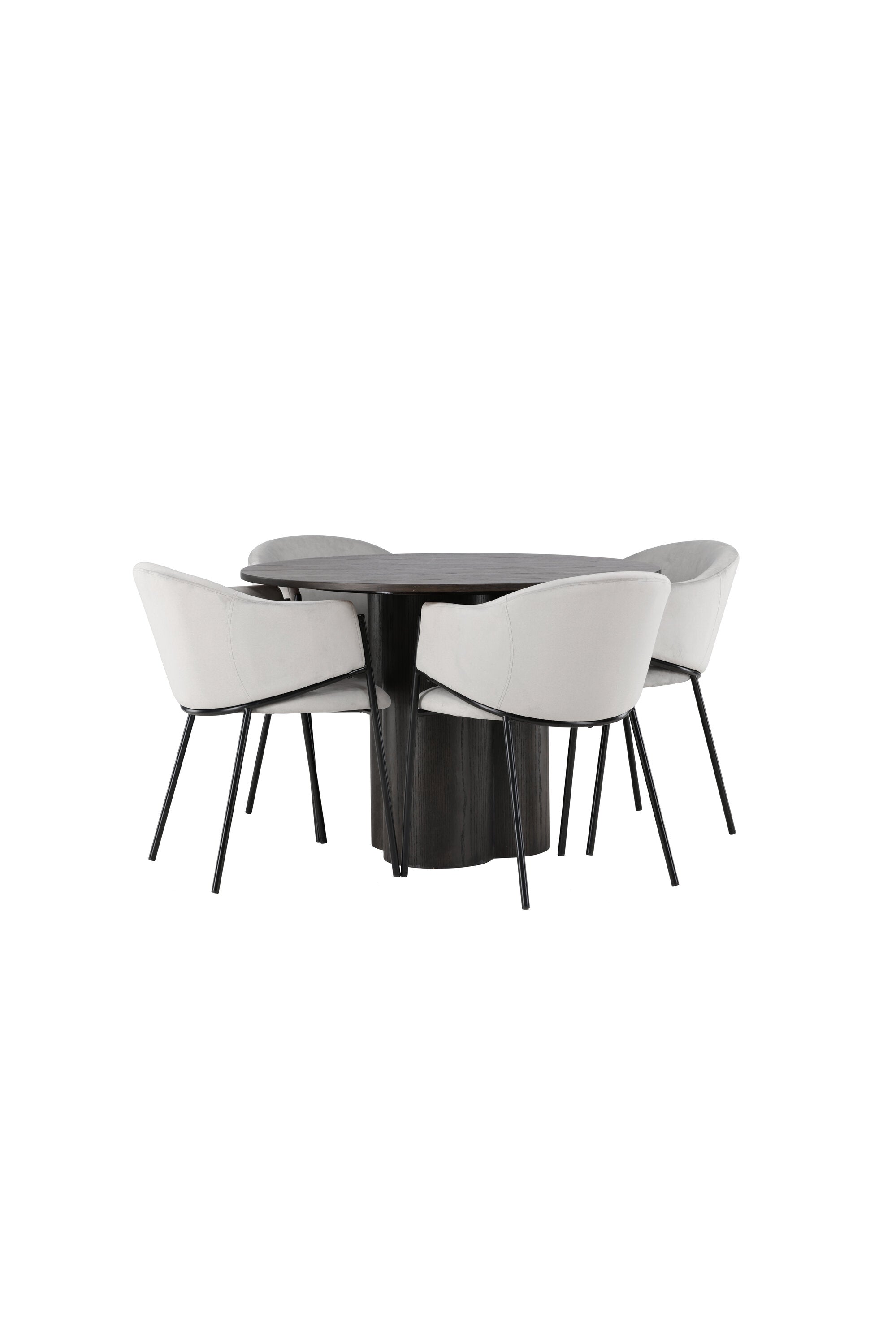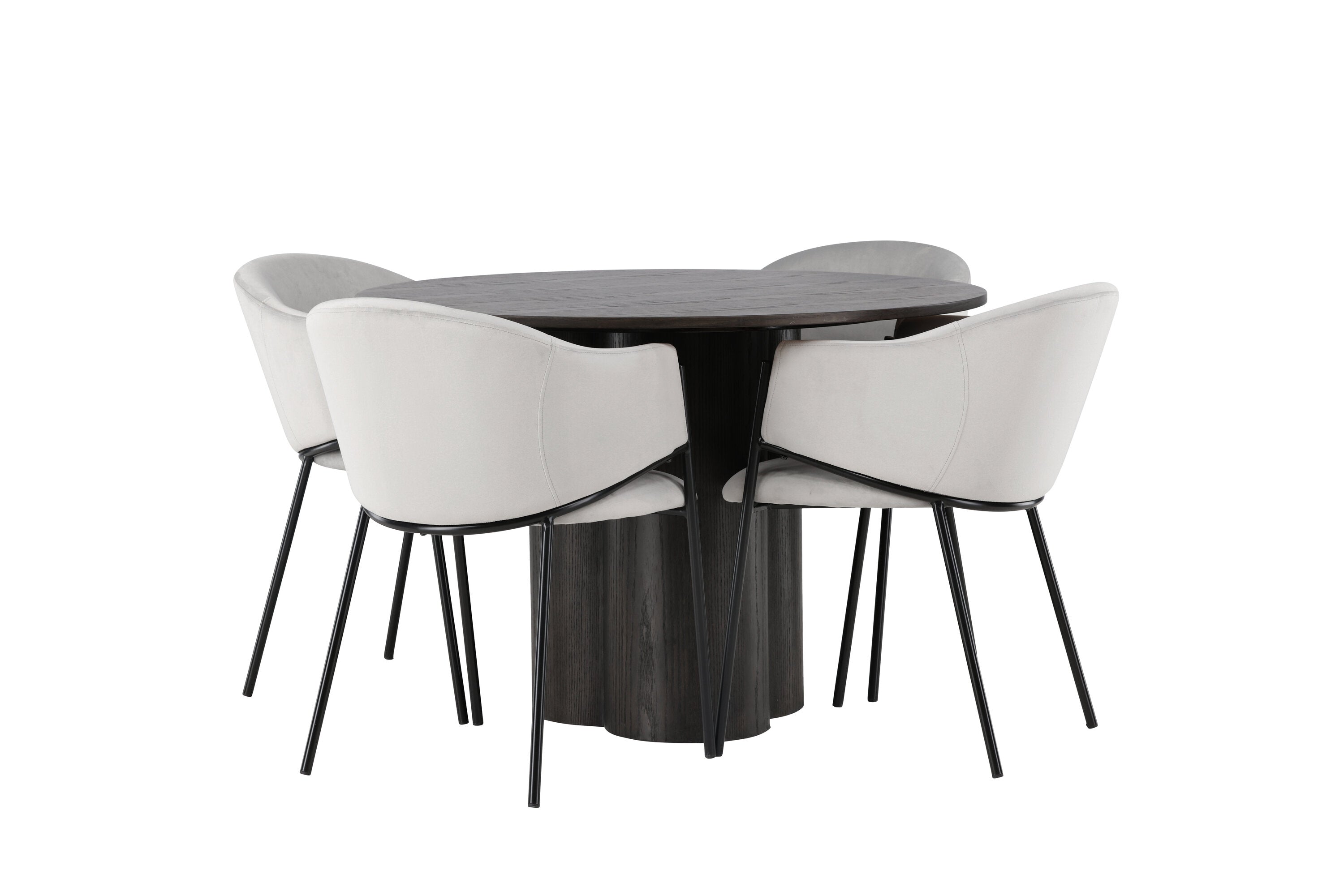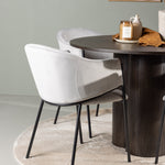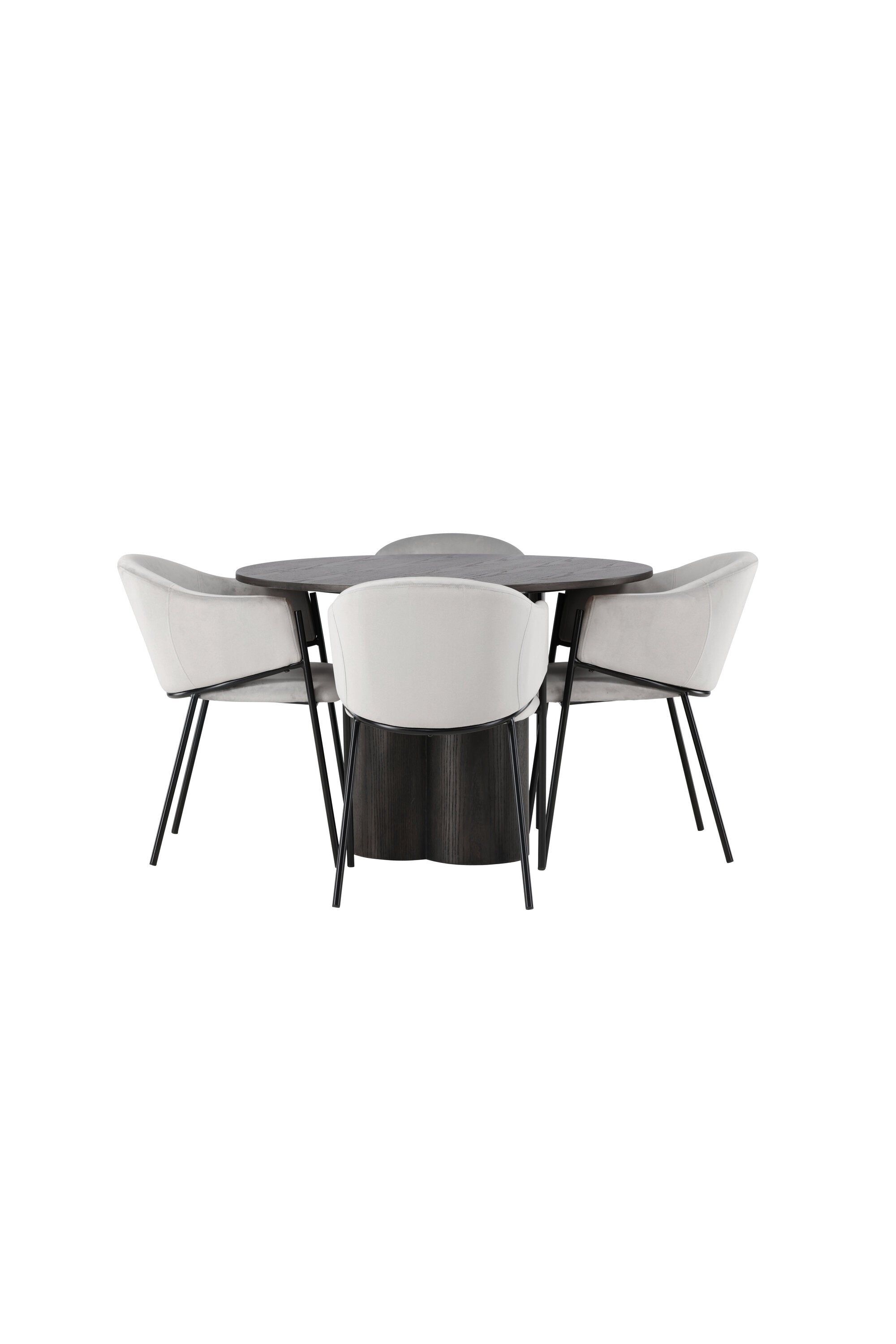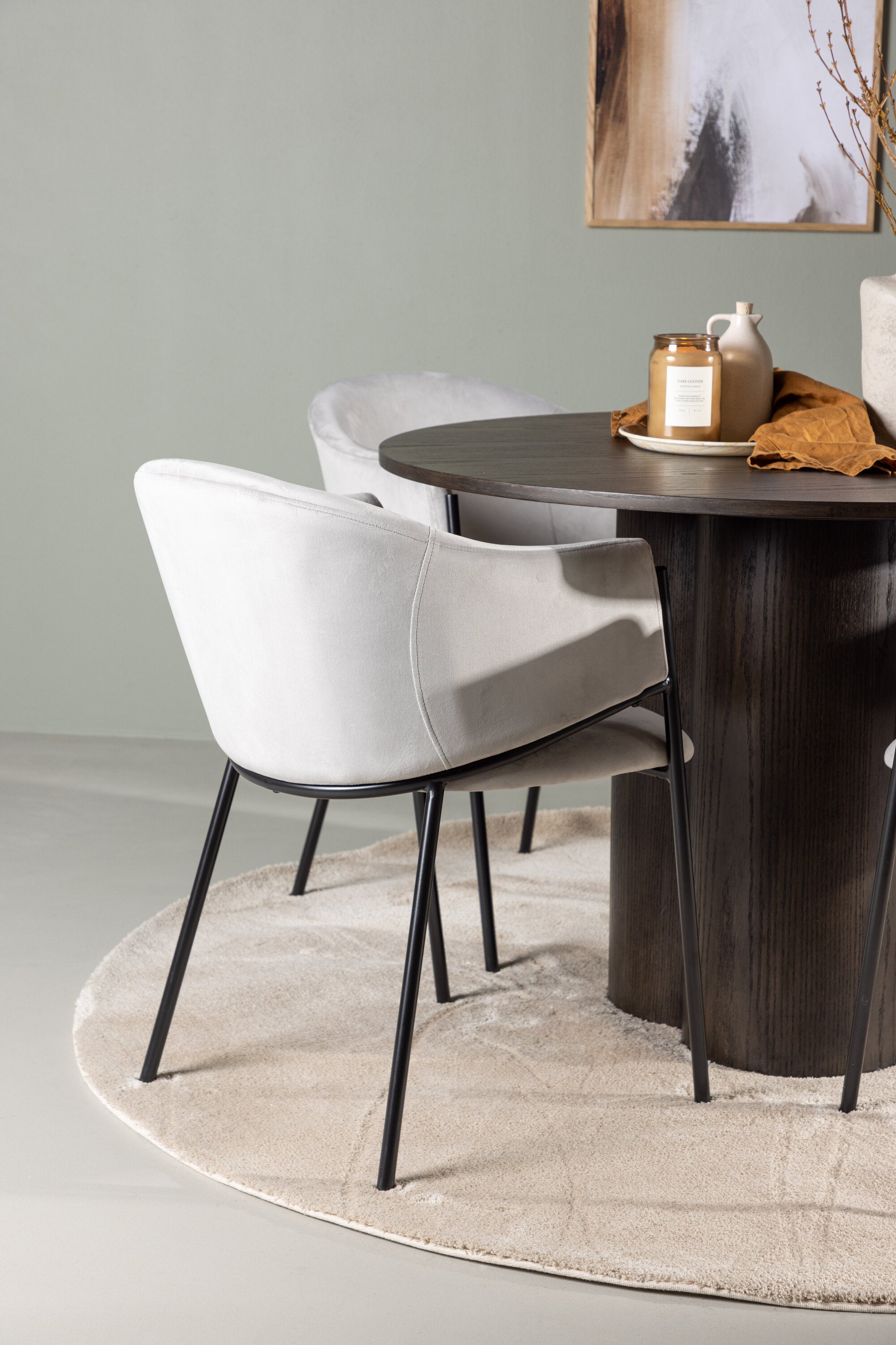 K doplnění tohoto tmavě hnědého jídelního stolu máme světle šedé jídelní židle Evelina. Díky své moderní estetice a pohodlnému designu se tato židle rychle stane oblíbenou v každé domácnosti. Plně čalouněné sedadlo ze světle šedé sametové látky poskytuje luxusní a příjemný pocit, zatímco zaoblené opěradlo dodává extra pohodlí a podporu. Černý ocelový rám s minimalistickým designem a ozdobou dodává židlím ten malý dodatečný nádech.