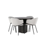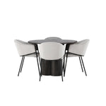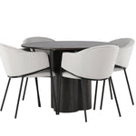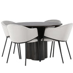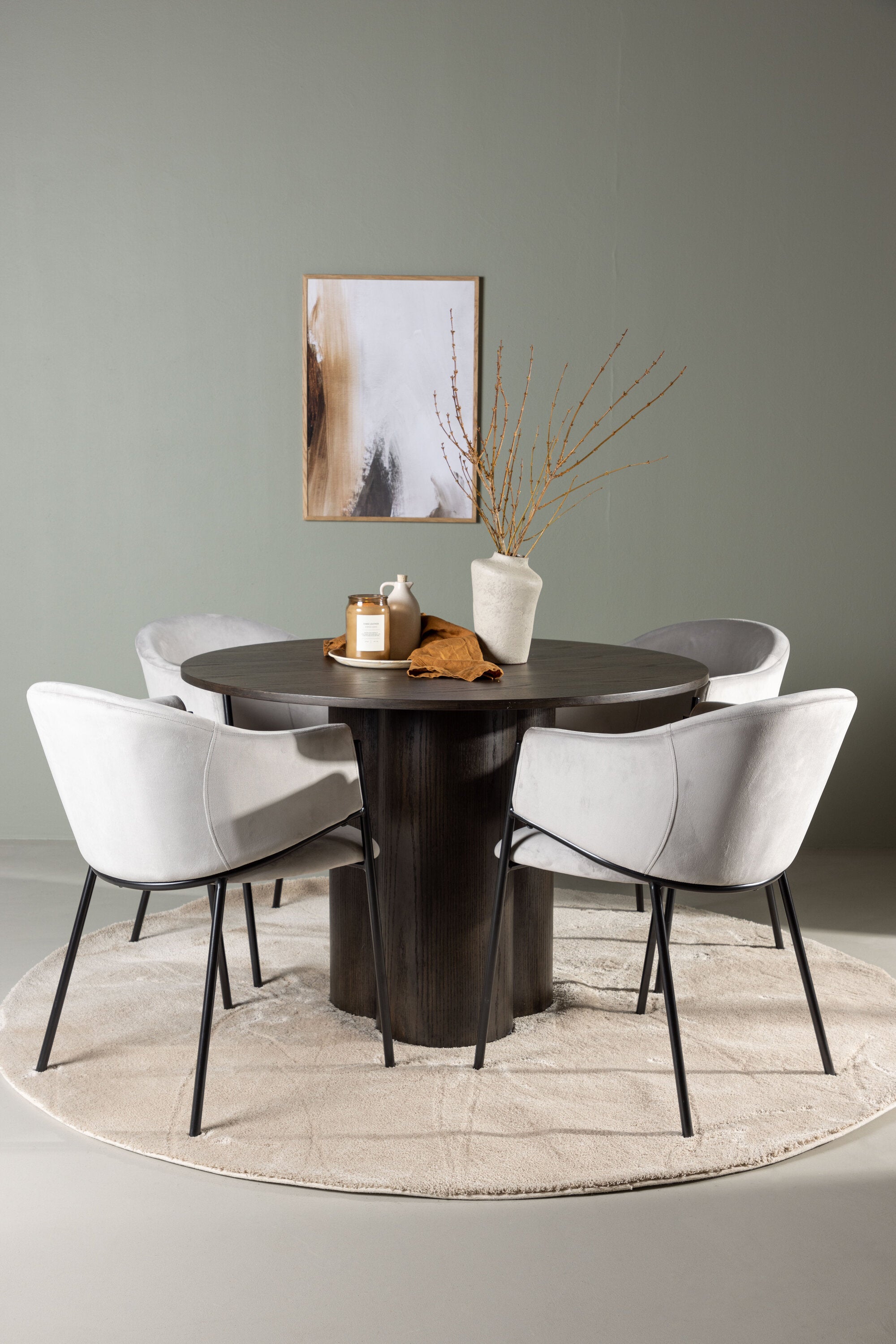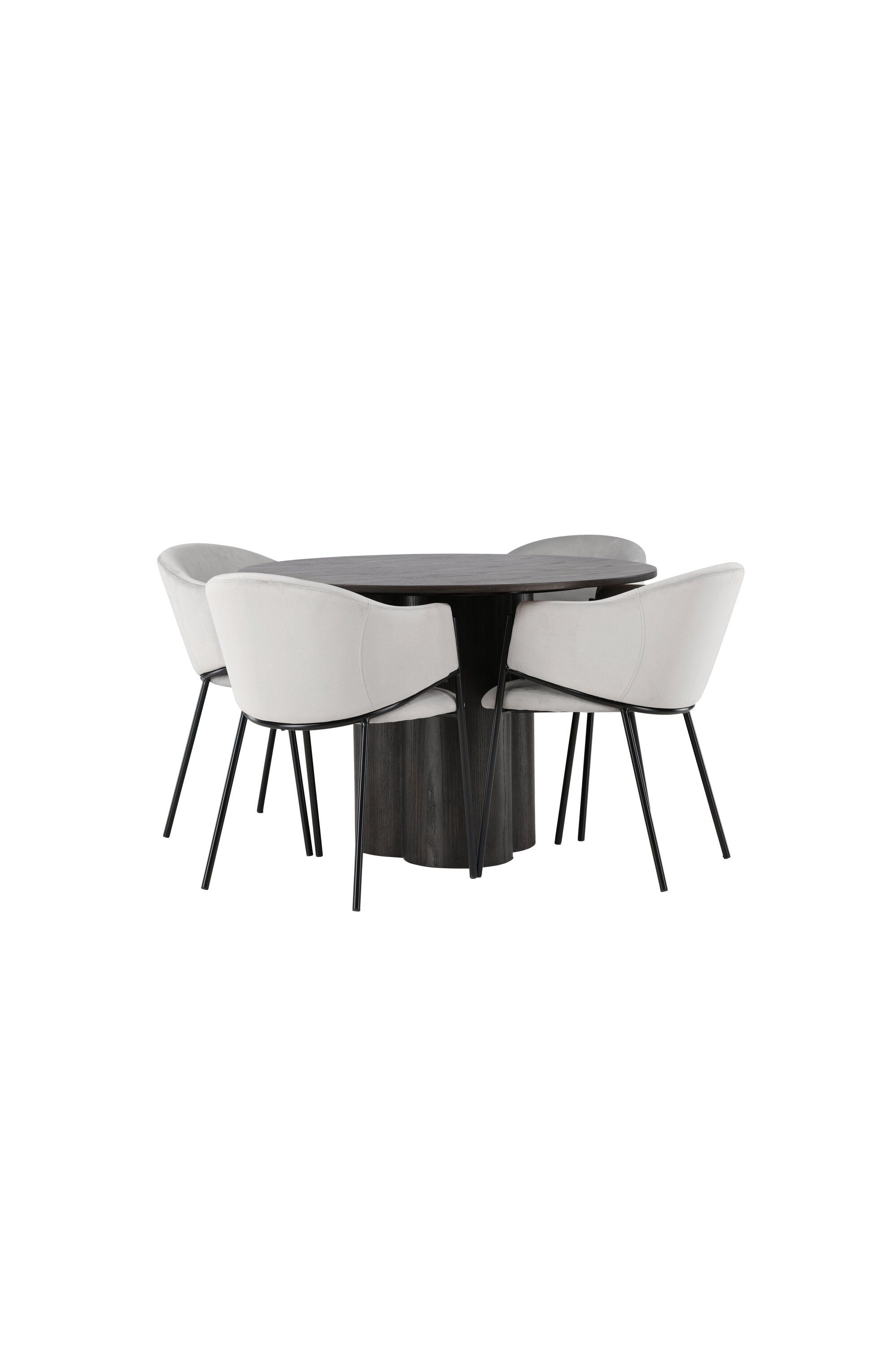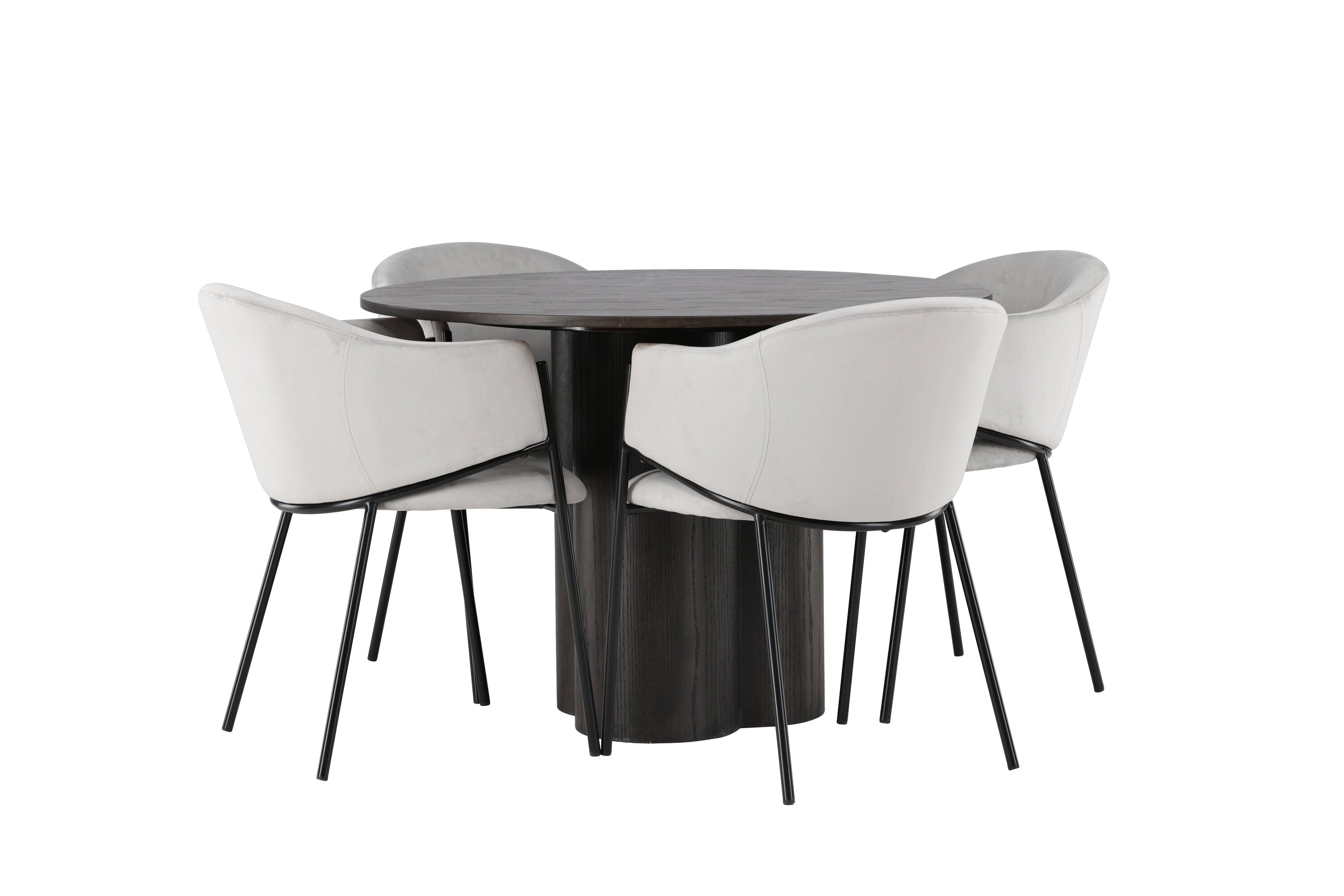 K doplnění tohoto tmavě hnědého jídelního stolu máme světle šedé jídelní židle Evelina. Díky své moderní estetice a pohodlnému designu se tato židle rychle stane oblíbenou v každé domácnosti. Plně čalouněné sedadlo ze světle šedé sametové látky poskytuje luxusní a příjemný pocit, zatímco zaoblené opěradlo dodává extra pohodlí a podporu. Černý ocelový rám s minimalistickým designem a ozdobou dodává židlím ten malý dodatečný nádech.