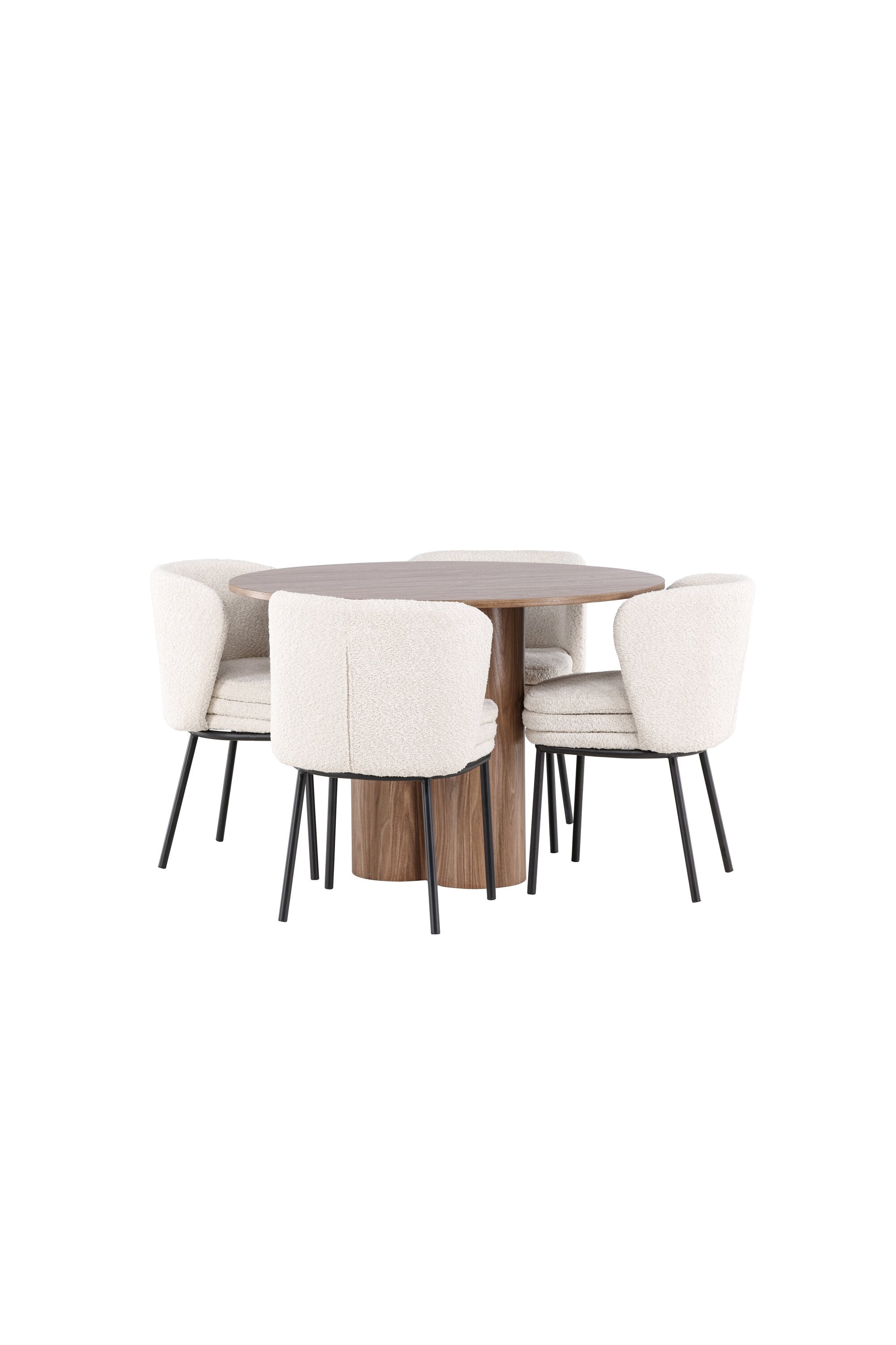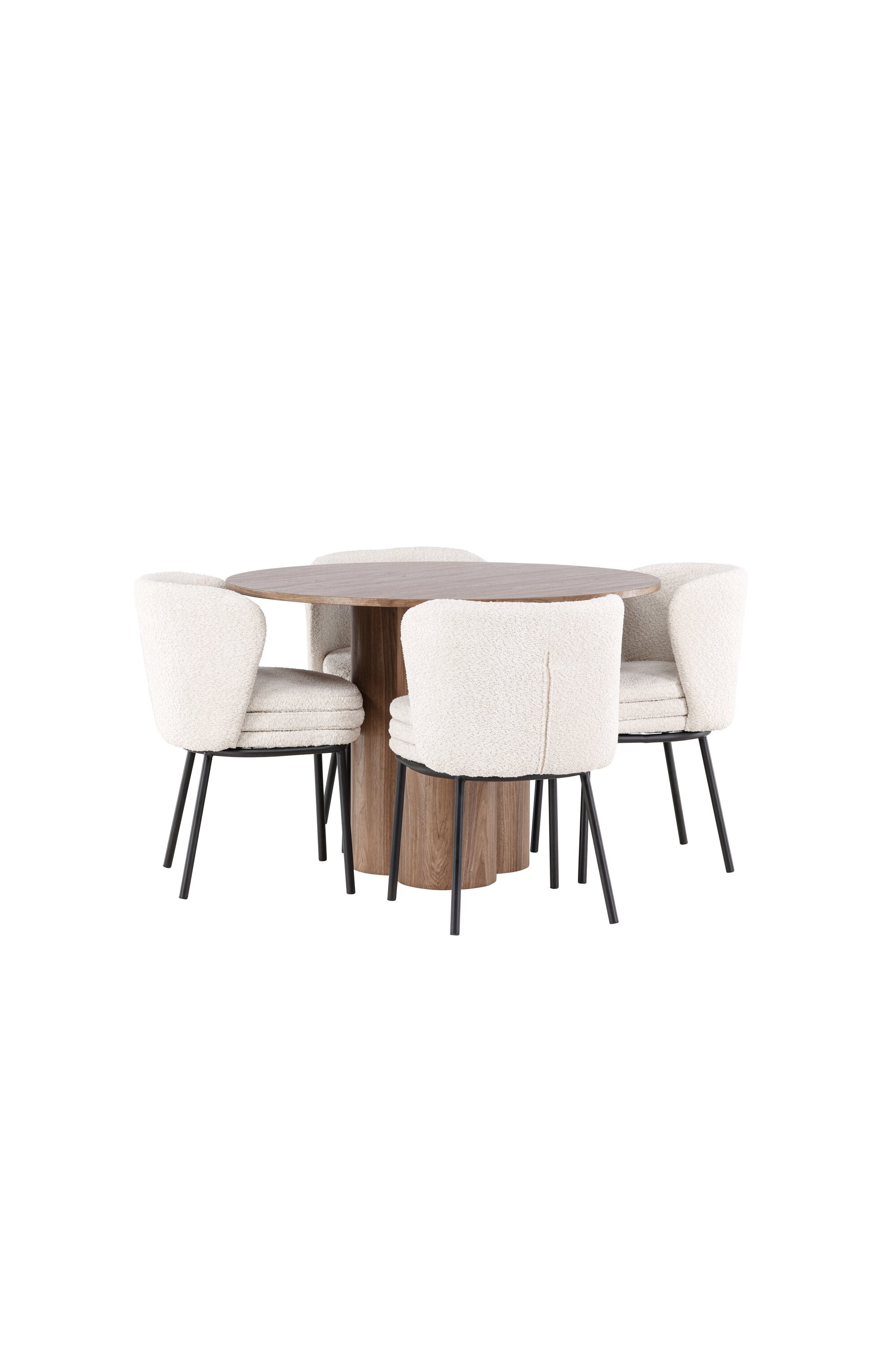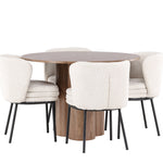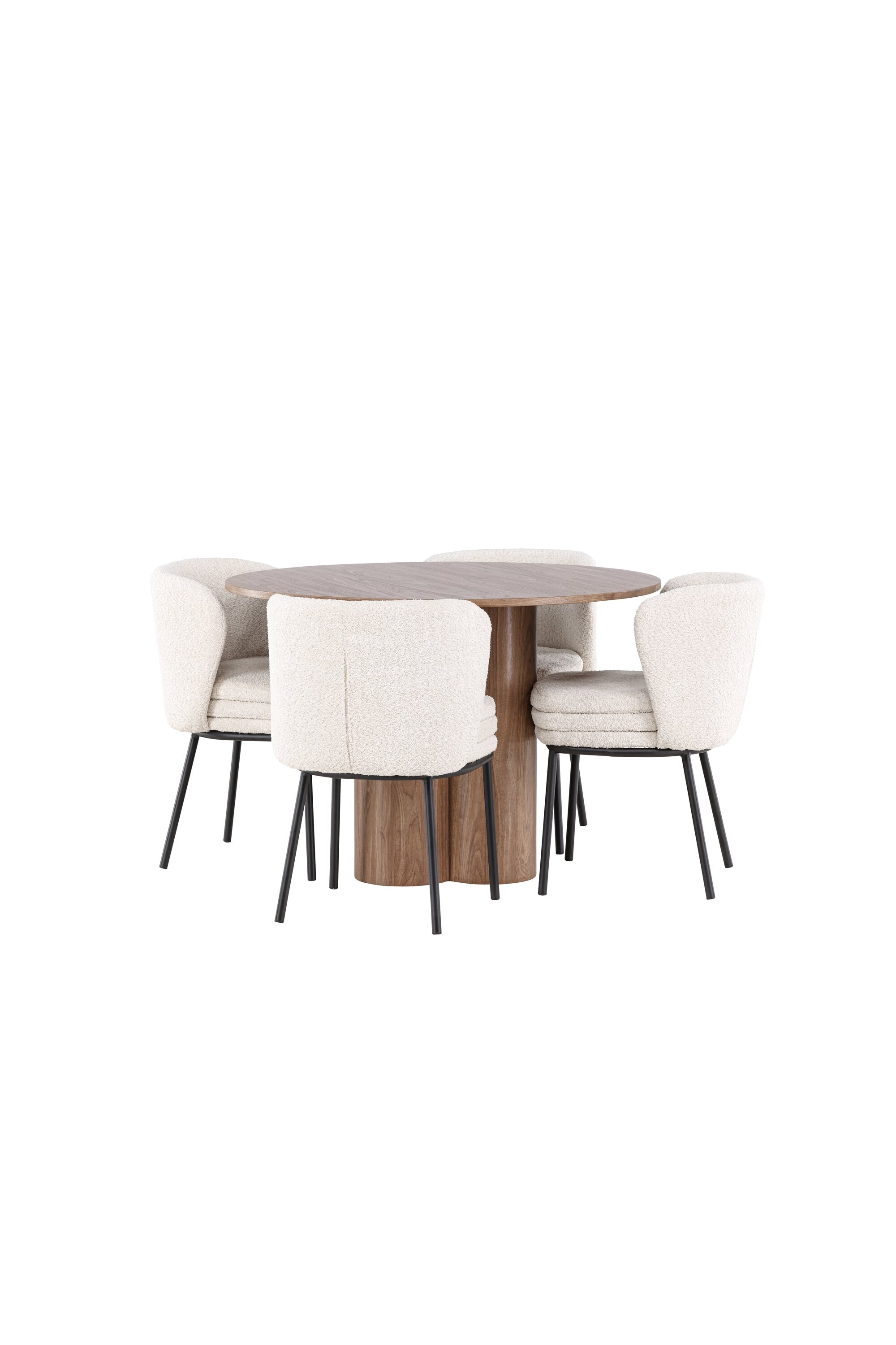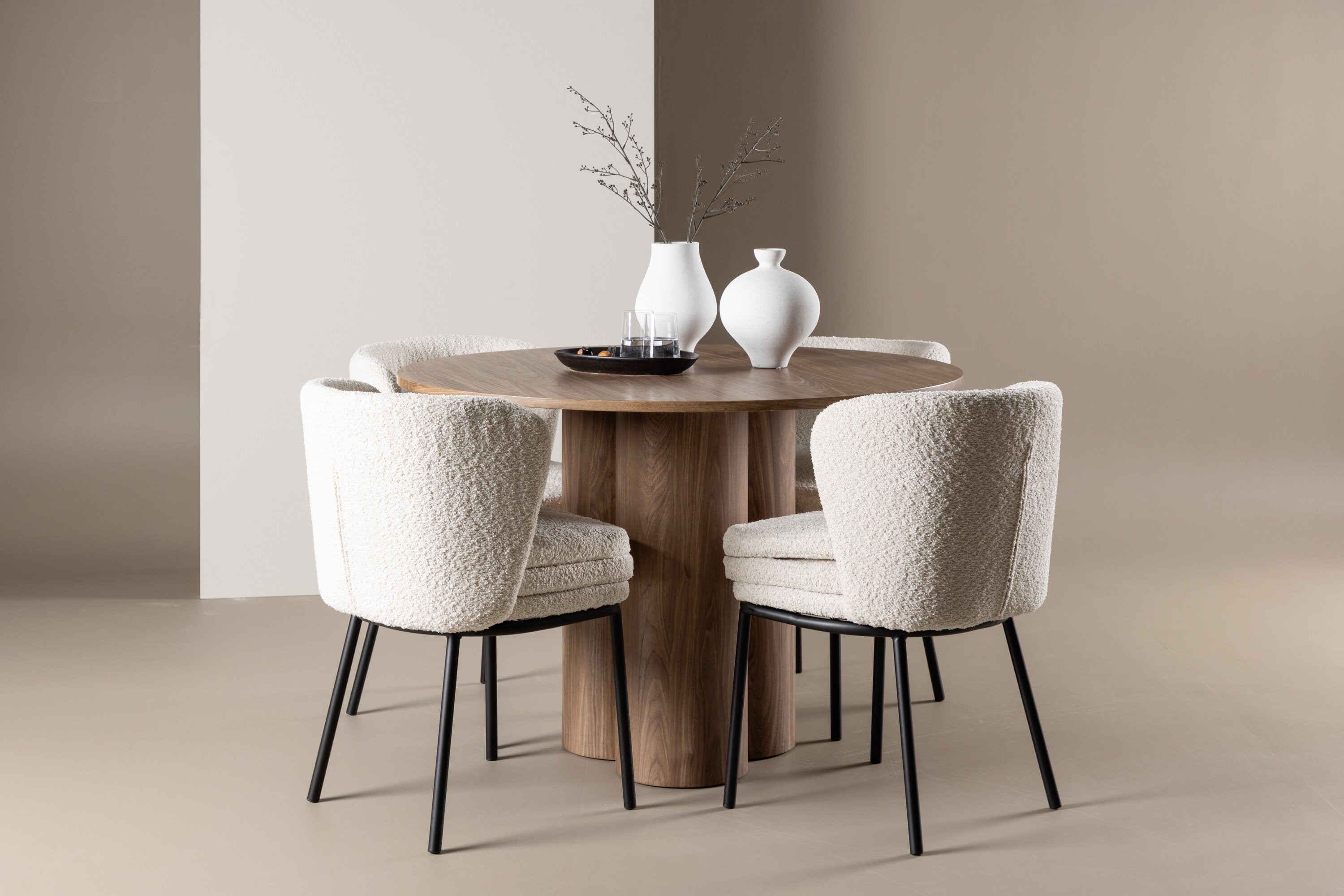 Vytvořte si elegantní a příjemný jídelní kout s naší sofistikovanou jídelní sadou, která kombinuje stylový stůl Olivia s luxusními židlemi Agnes. Tato jídelní sada je ideální pro každodenní večeři i slavnostní příležitosti a dodá vaší jídelně moderní a harmonickou atmosféru. Jídelní stůl Olivia vyrobený z MDF má krásnou moka barvu, která dodá vaší jídelně hřejivý a příjemný pocit. Stůl s průměrem 110 cm nabízí dostatek prostoru pro jídlo a konverzaci, přičemž jeho kulatý tvar vytváří vyvážené a společenské prostředí. Robustní konstrukce stolu zajišťuje dlouhodobé používání a stabilitu. Čtyři židle Agnes skvěle doplňují stůl svými elegantními sedáky čalouněnými bílým buklem. Tyto židle nabízejí pohodlí i styl, takže jsou ideální pro dlouhé a příjemné večeře s rodinou a přáteli. Jejich moderní design s vysokými opěradly a měkkými sedáky dodá vaší jídelně sofistikovaný a moderní nádech. Tato jídelní souprava je dokonalou kombinací estetiky a funkčnosti, takže je vynikající volbou pro ty, kteří hledají elegantní a pohodlný jídelní kout. Vylepšete svou jídelnu kombinací stolu Olivia a židlí Agnes a vytvořte si místo, kde se budou sdílet vzpomínky a radost.