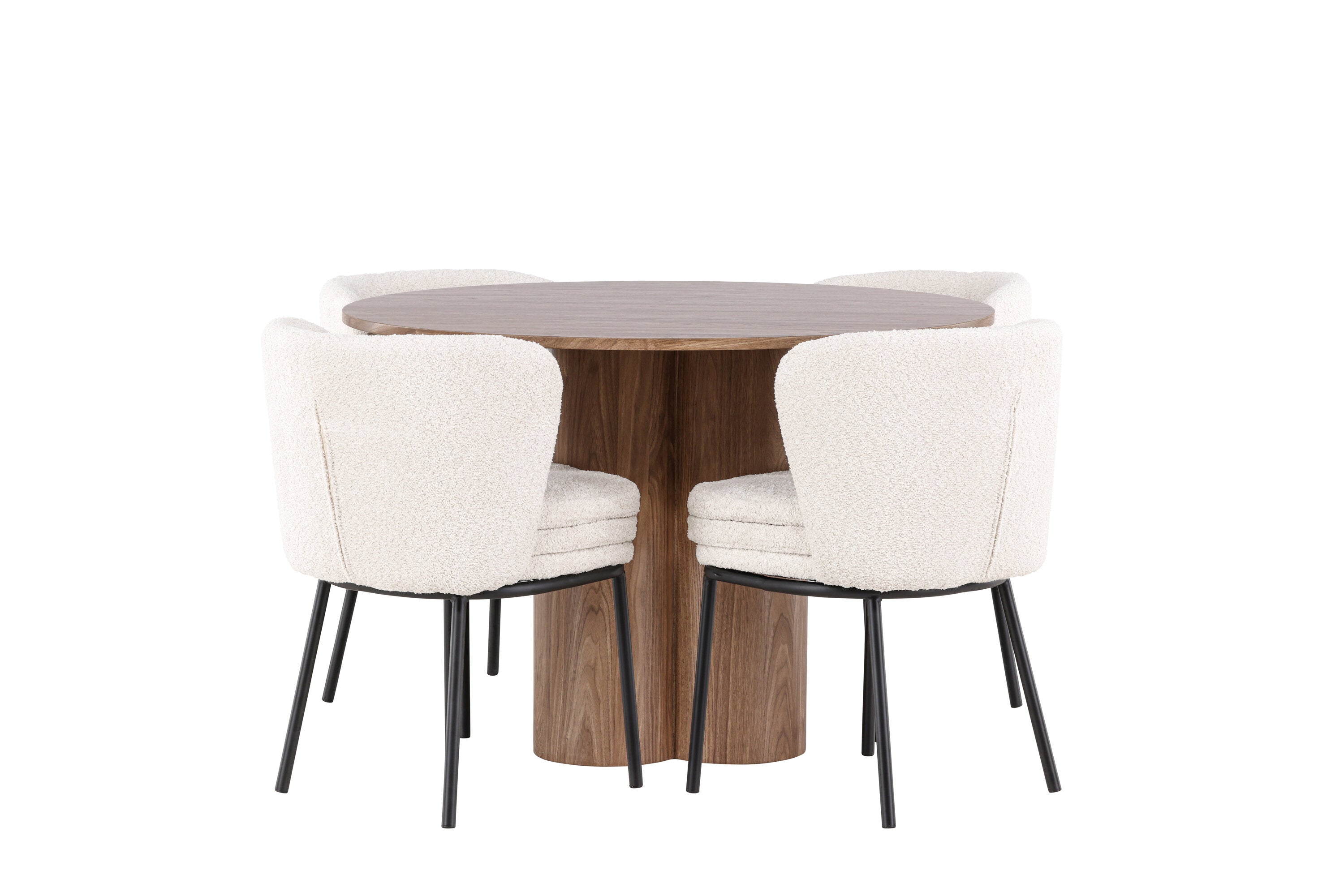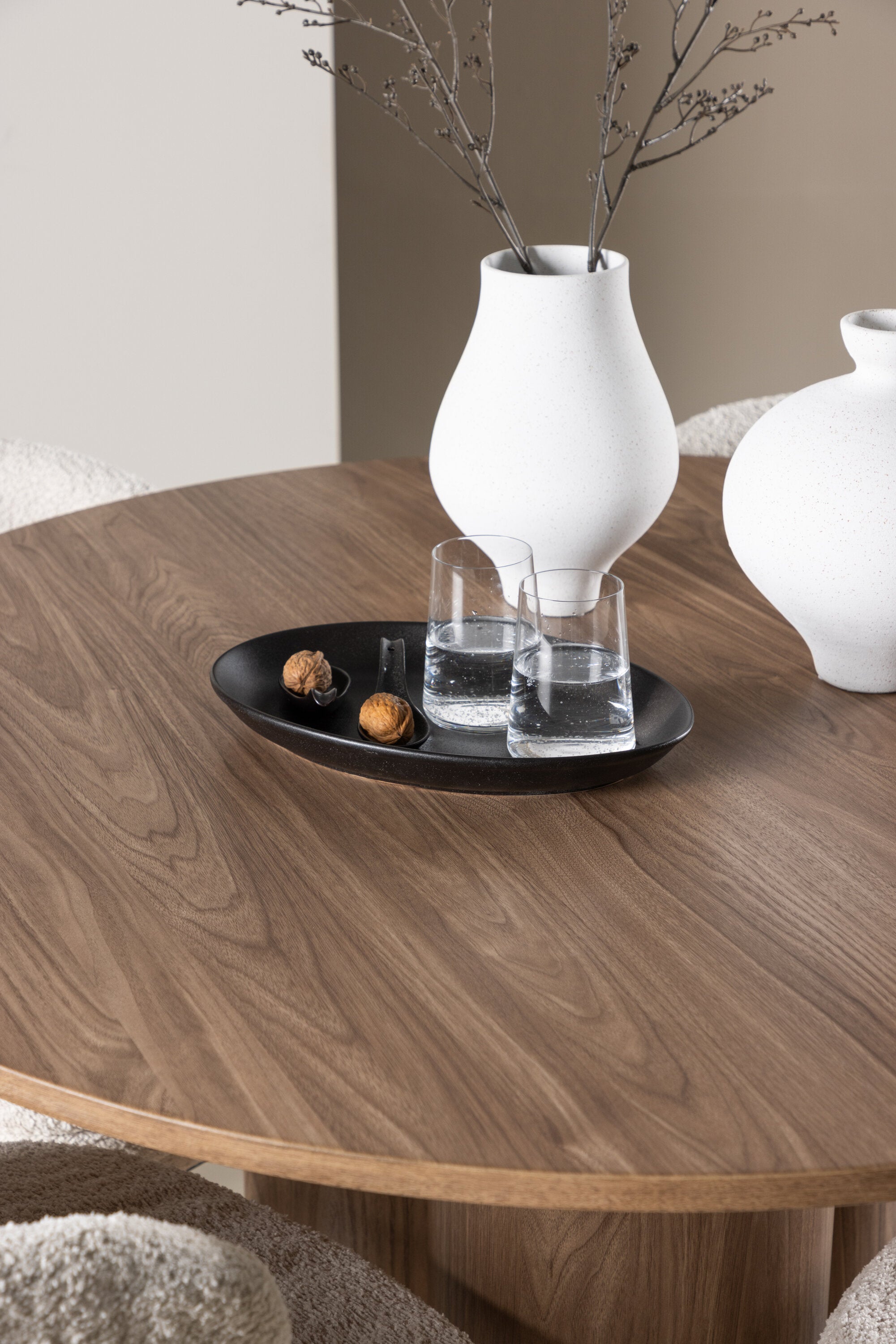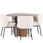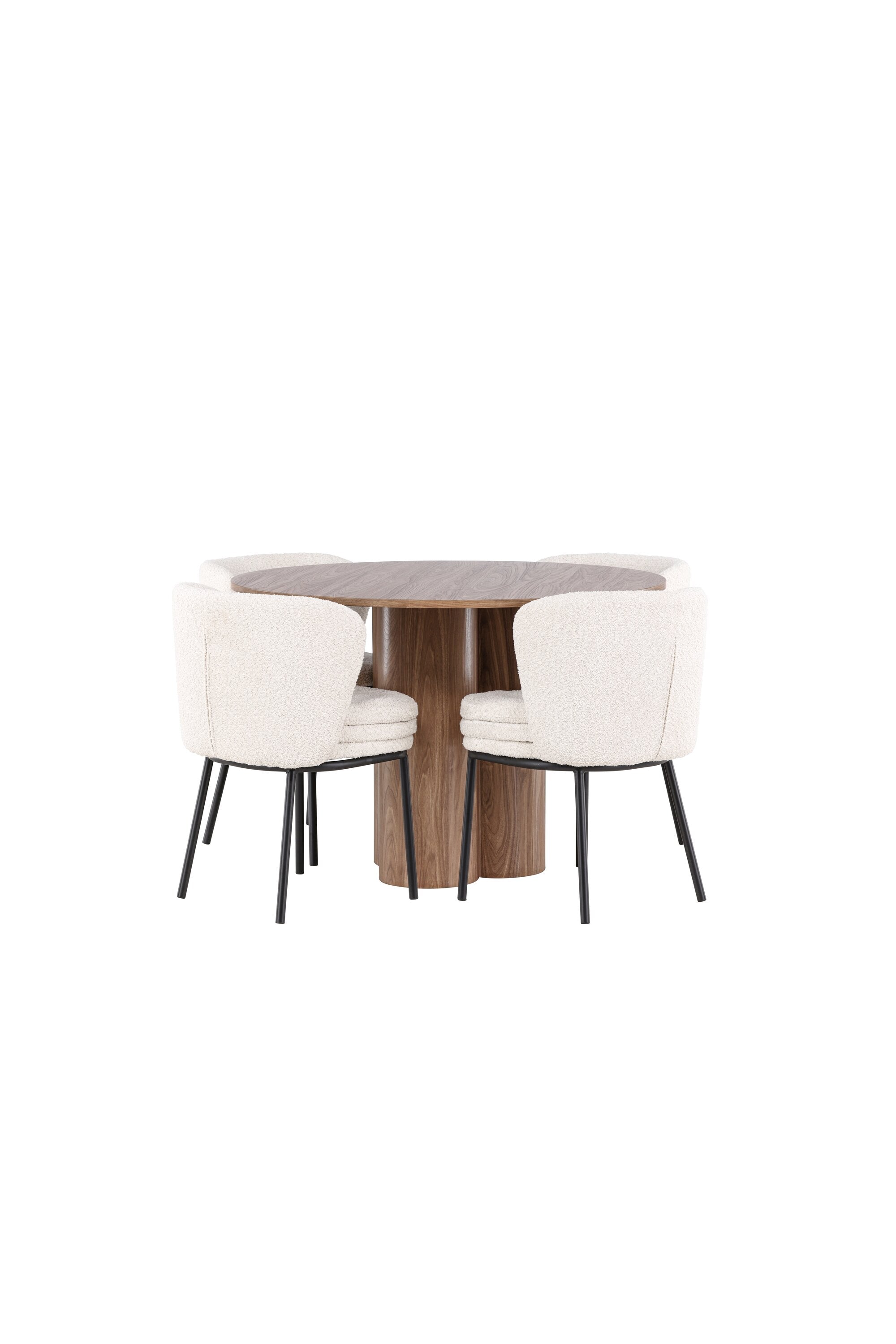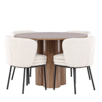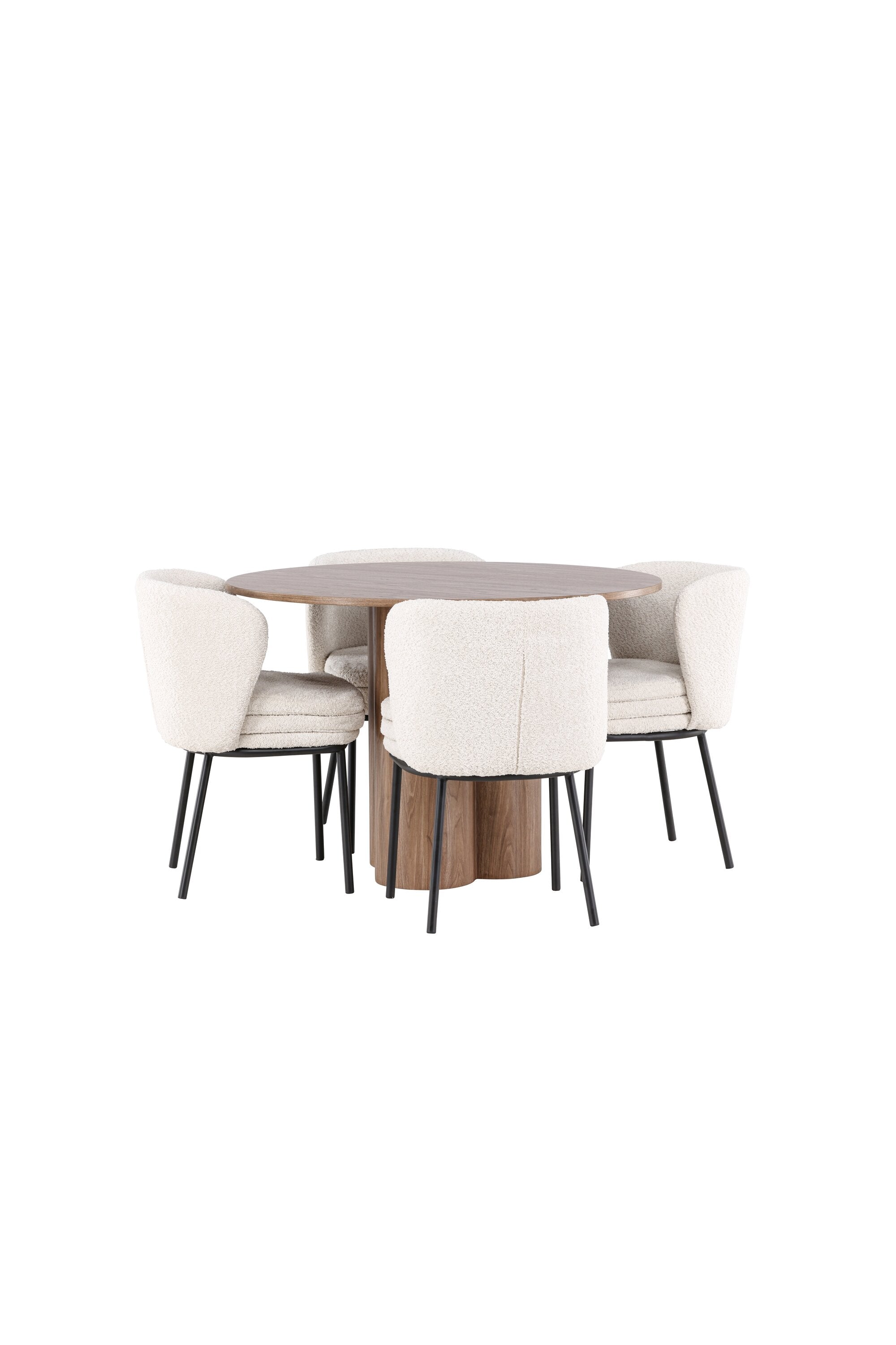 Vytvořte si elegantní a příjemný jídelní kout s naší sofistikovanou jídelní sadou, která kombinuje stylový stůl Olivia s luxusními židlemi Agnes. Tato jídelní sada je ideální pro každodenní večeři i slavnostní příležitosti a dodá vaší jídelně moderní a harmonickou atmosféru. Jídelní stůl Olivia vyrobený z MDF má krásnou moka barvu, která dodá vaší jídelně hřejivý a příjemný pocit. Stůl s průměrem 110 cm nabízí dostatek prostoru pro jídlo a konverzaci, přičemž jeho kulatý tvar vytváří vyvážené a společenské prostředí. Robustní konstrukce stolu zajišťuje dlouhodobé používání a stabilitu. Čtyři židle Agnes skvěle doplňují stůl svými elegantními sedáky čalouněnými bílým buklem. Tyto židle nabízejí pohodlí i styl, takže jsou ideální pro dlouhé a příjemné večeře s rodinou a přáteli. Jejich moderní design s vysokými opěradly a měkkými sedáky dodá vaší jídelně sofistikovaný a moderní nádech. Tato jídelní souprava je dokonalou kombinací estetiky a funkčnosti, takže je vynikající volbou pro ty, kteří hledají elegantní a pohodlný jídelní kout. Vylepšete svou jídelnu kombinací stolu Olivia a židlí Agnes a vytvořte si místo, kde se budou sdílet vzpomínky a radost.