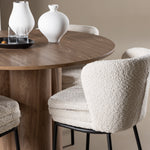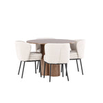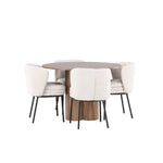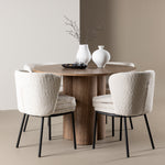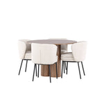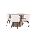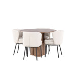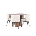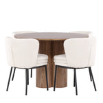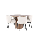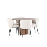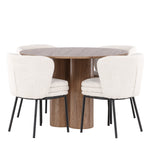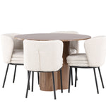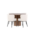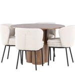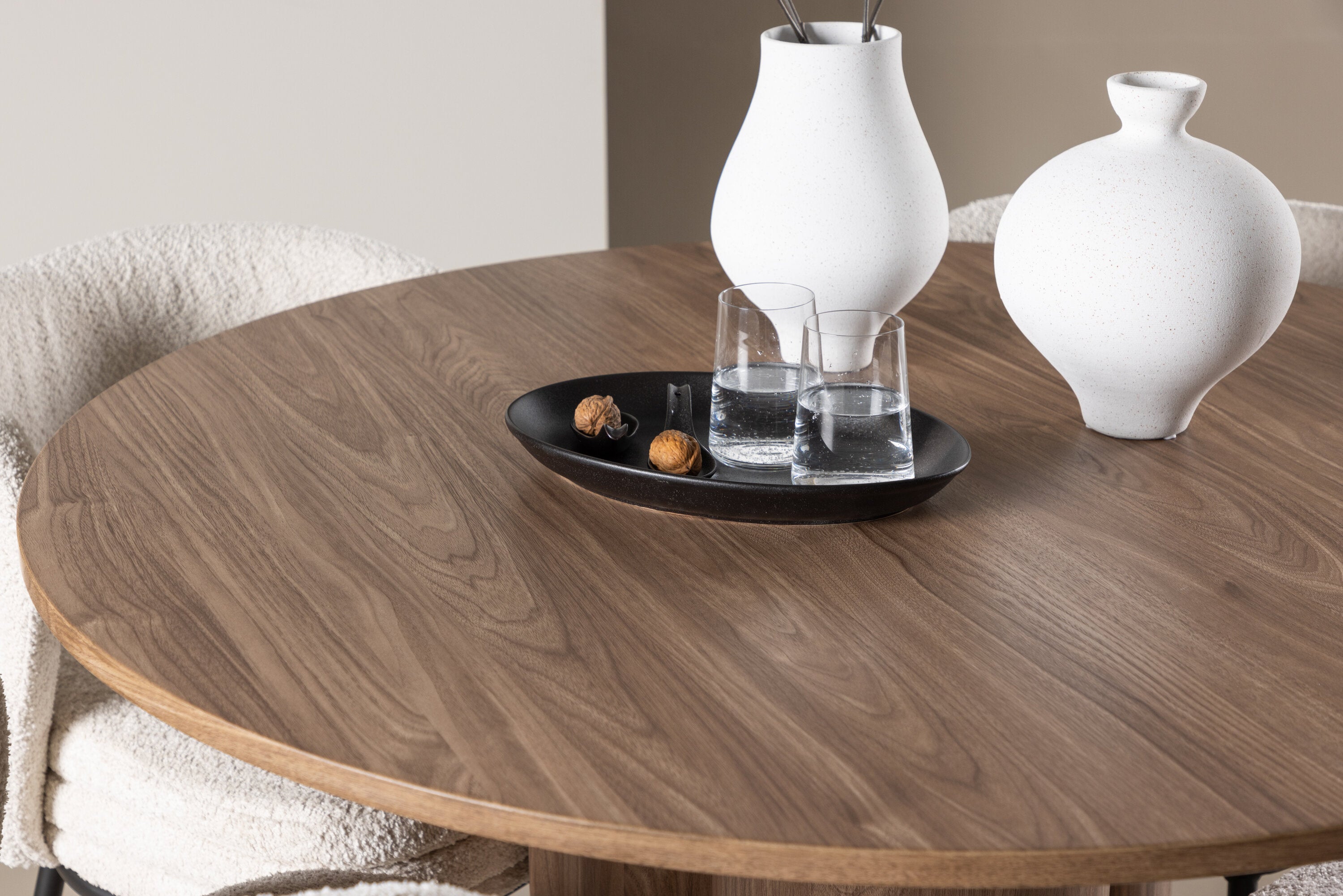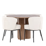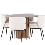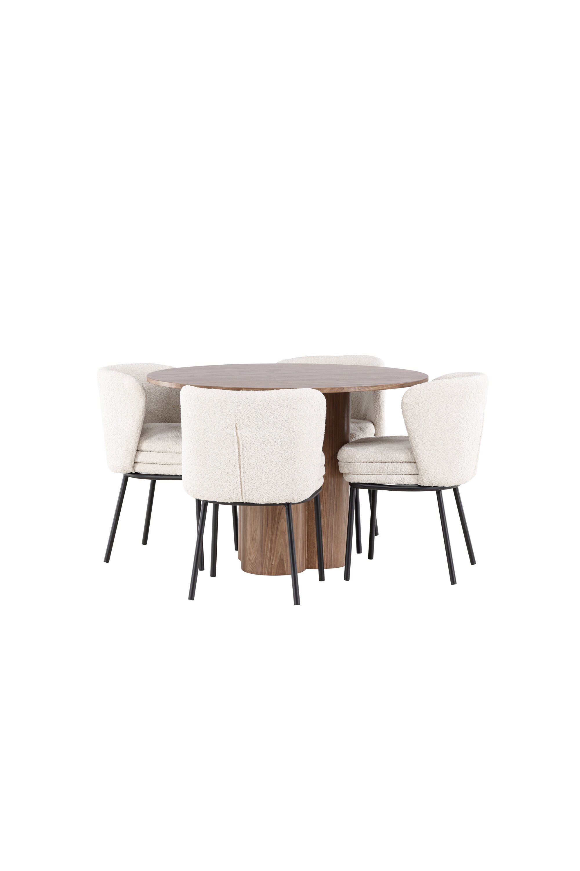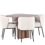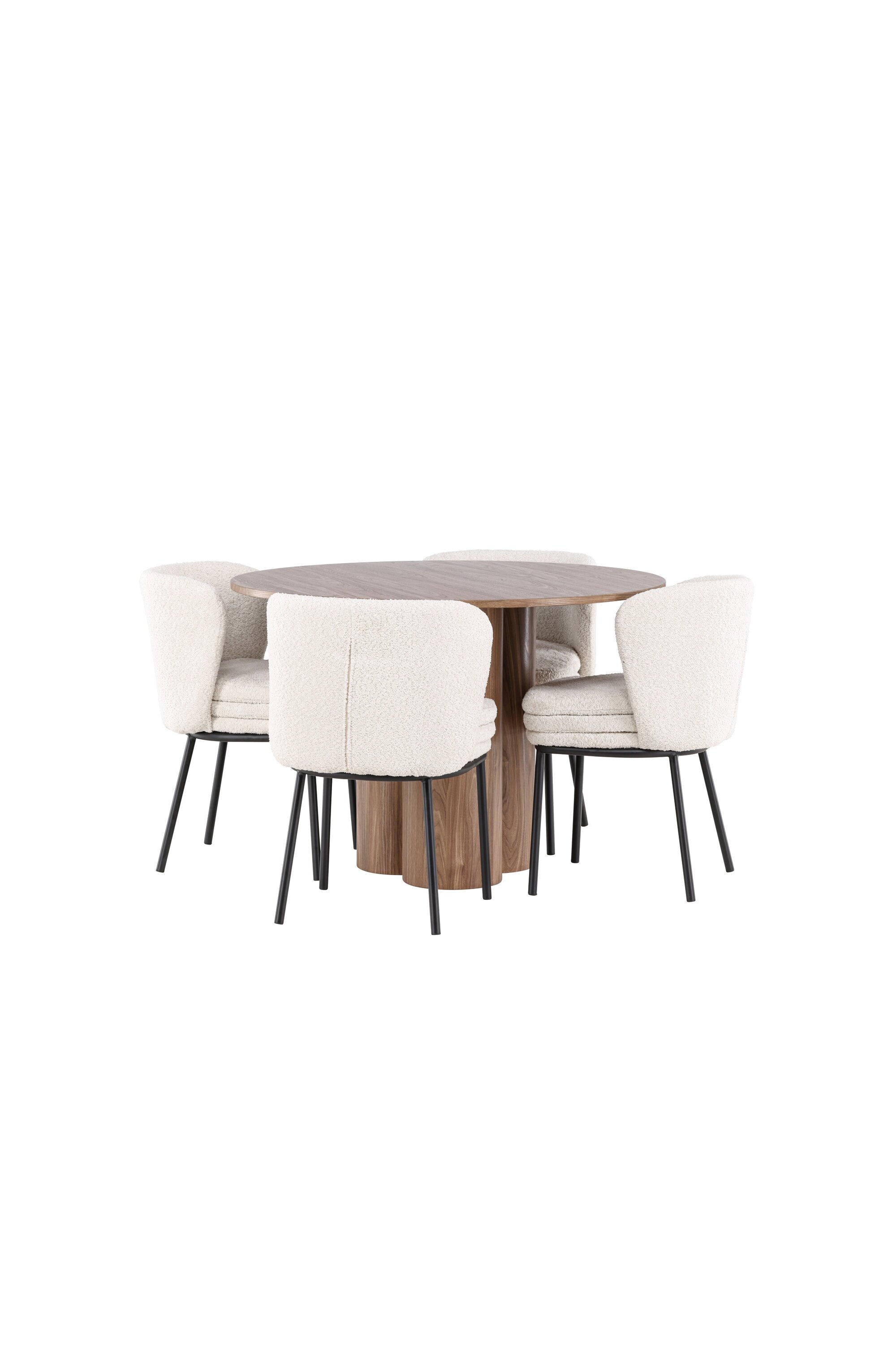 Vytvořte si elegantní a příjemný jídelní kout s naší sofistikovanou jídelní sadou, která kombinuje stylový stůl Olivia s luxusními židlemi Agnes. Tato jídelní sada je ideální pro každodenní večeři i slavnostní příležitosti a dodá vaší jídelně moderní a harmonickou atmosféru. Jídelní stůl Olivia vyrobený z MDF má krásnou moka barvu, která dodá vaší jídelně hřejivý a příjemný pocit. Stůl s průměrem 110 cm nabízí dostatek prostoru pro jídlo a konverzaci, přičemž jeho kulatý tvar vytváří vyvážené a společenské prostředí. Robustní konstrukce stolu zajišťuje dlouhodobé používání a stabilitu. Čtyři židle Agnes skvěle doplňují stůl svými elegantními sedáky čalouněnými bílým buklem. Tyto židle nabízejí pohodlí i styl, takže jsou ideální pro dlouhé a příjemné večeře s rodinou a přáteli. Jejich moderní design s vysokými opěradly a měkkými sedáky dodá vaší jídelně sofistikovaný a moderní nádech. Tato jídelní souprava je dokonalou kombinací estetiky a funkčnosti, takže je vynikající volbou pro ty, kteří hledají elegantní a pohodlný jídelní kout. Vylepšete svou jídelnu kombinací stolu Olivia a židlí Agnes a vytvořte si místo, kde se budou sdílet vzpomínky a radost.