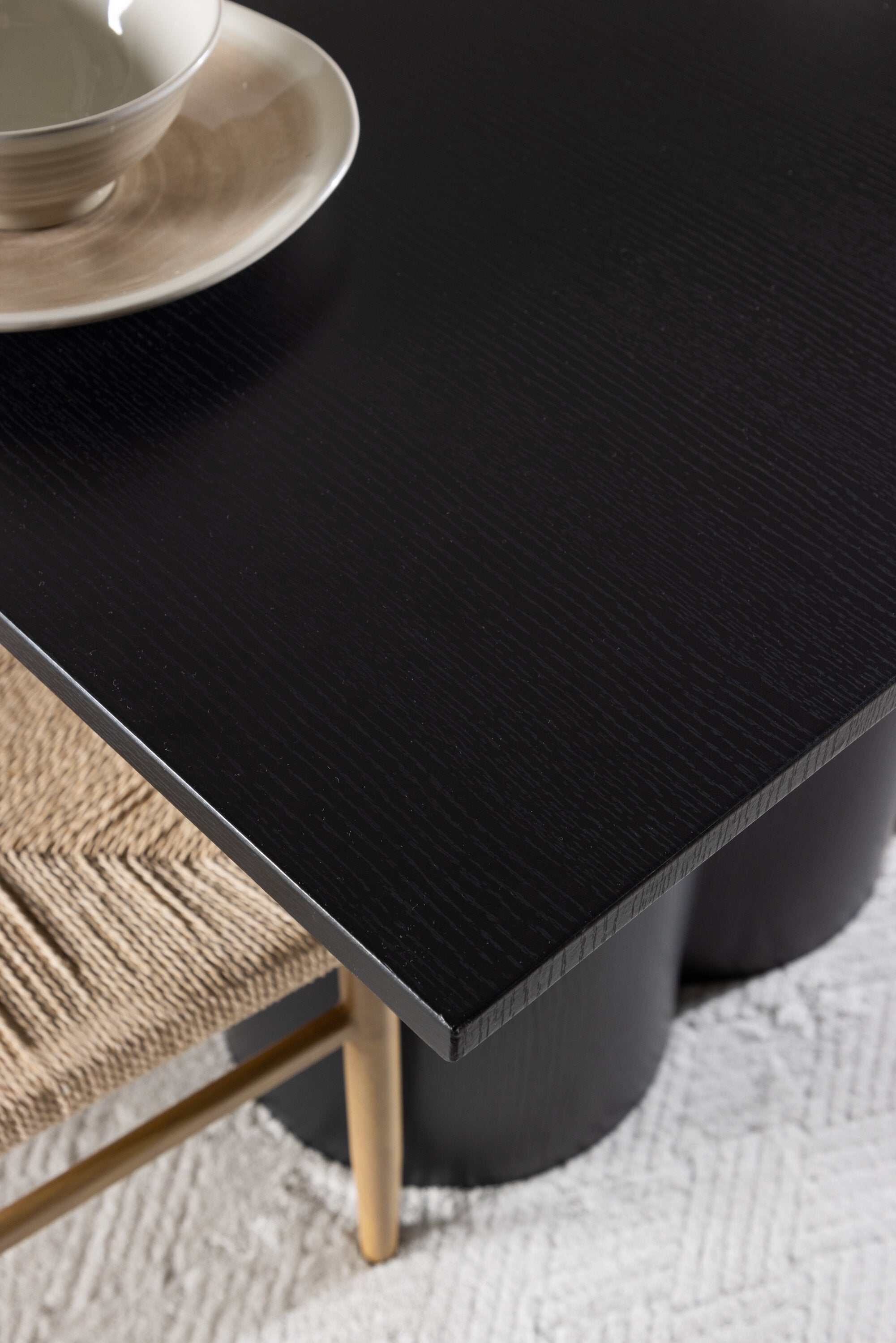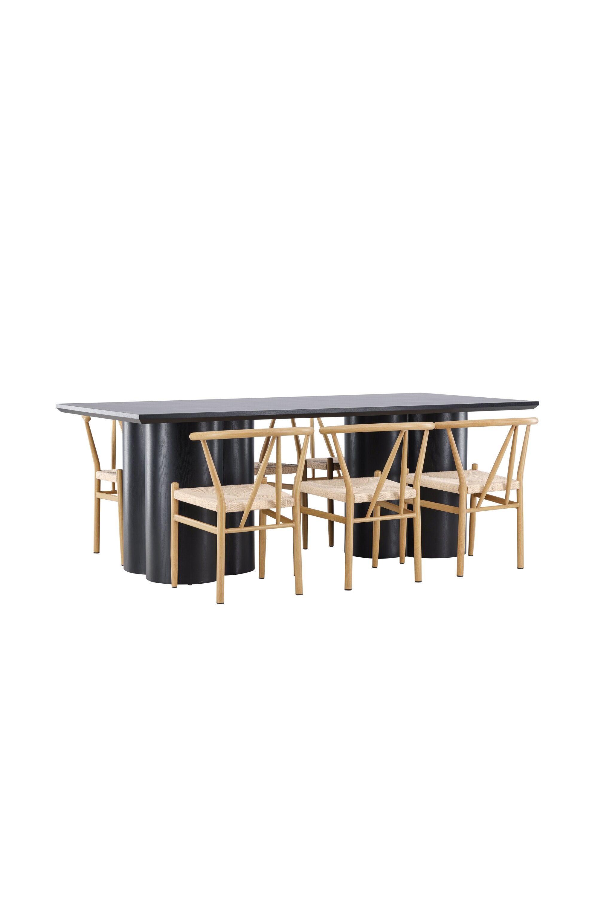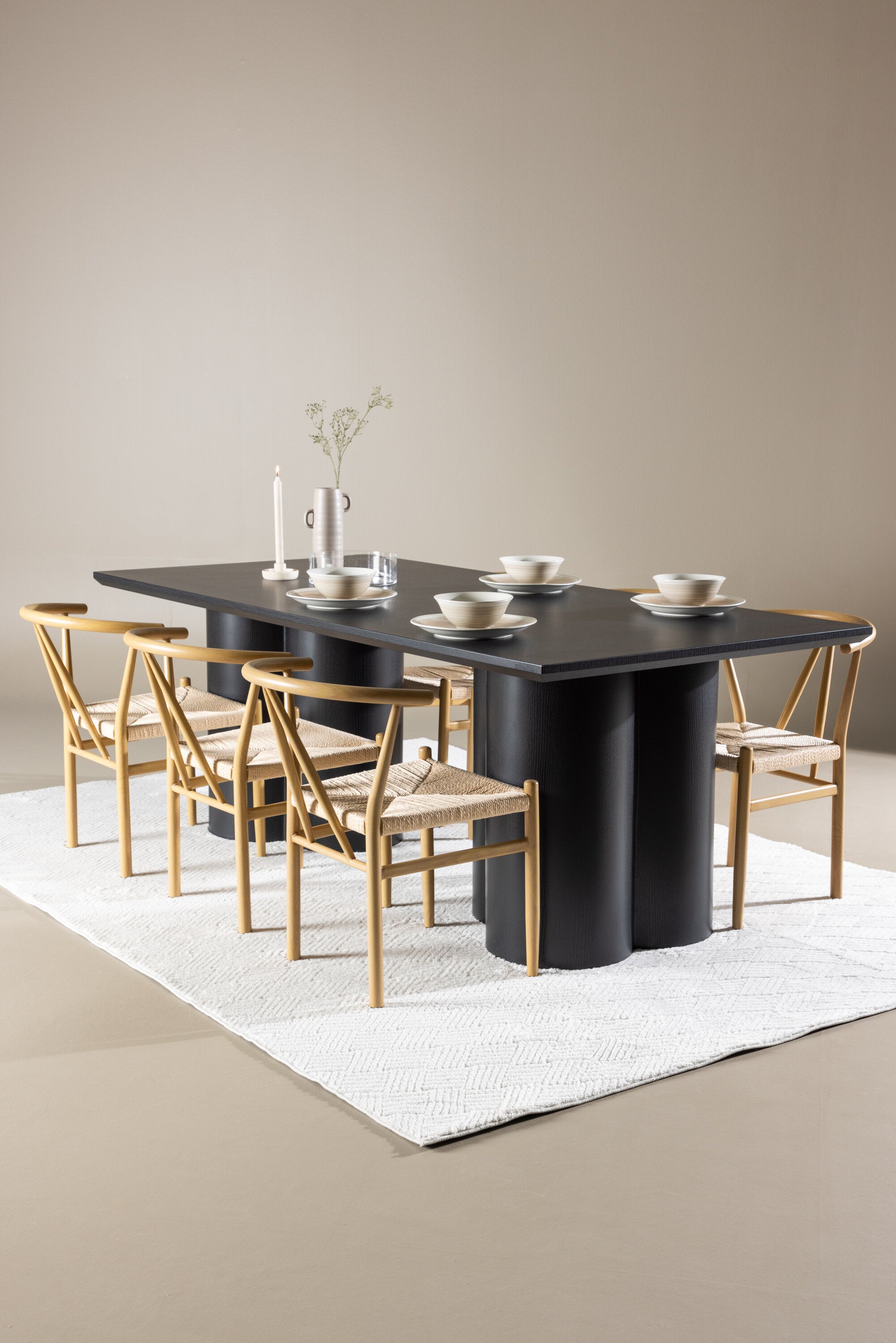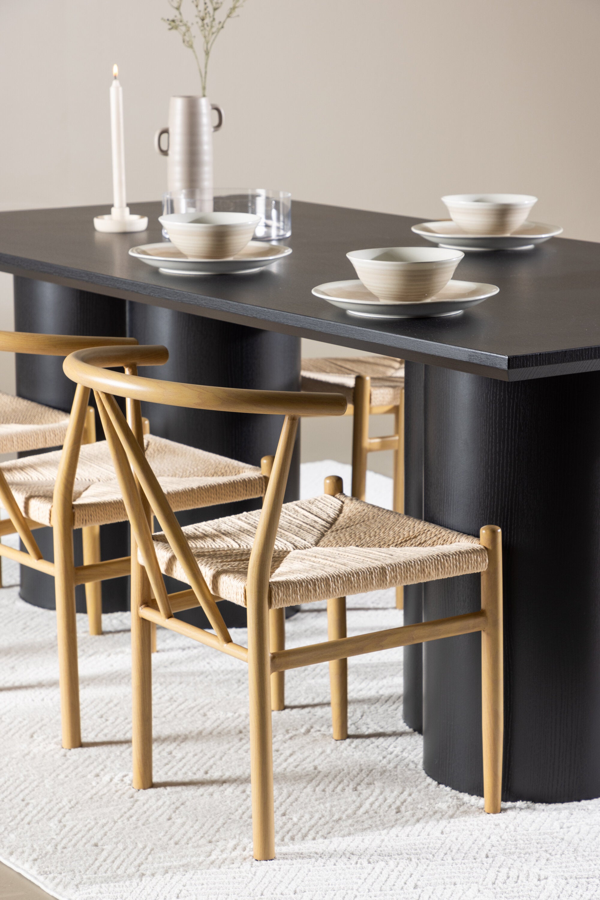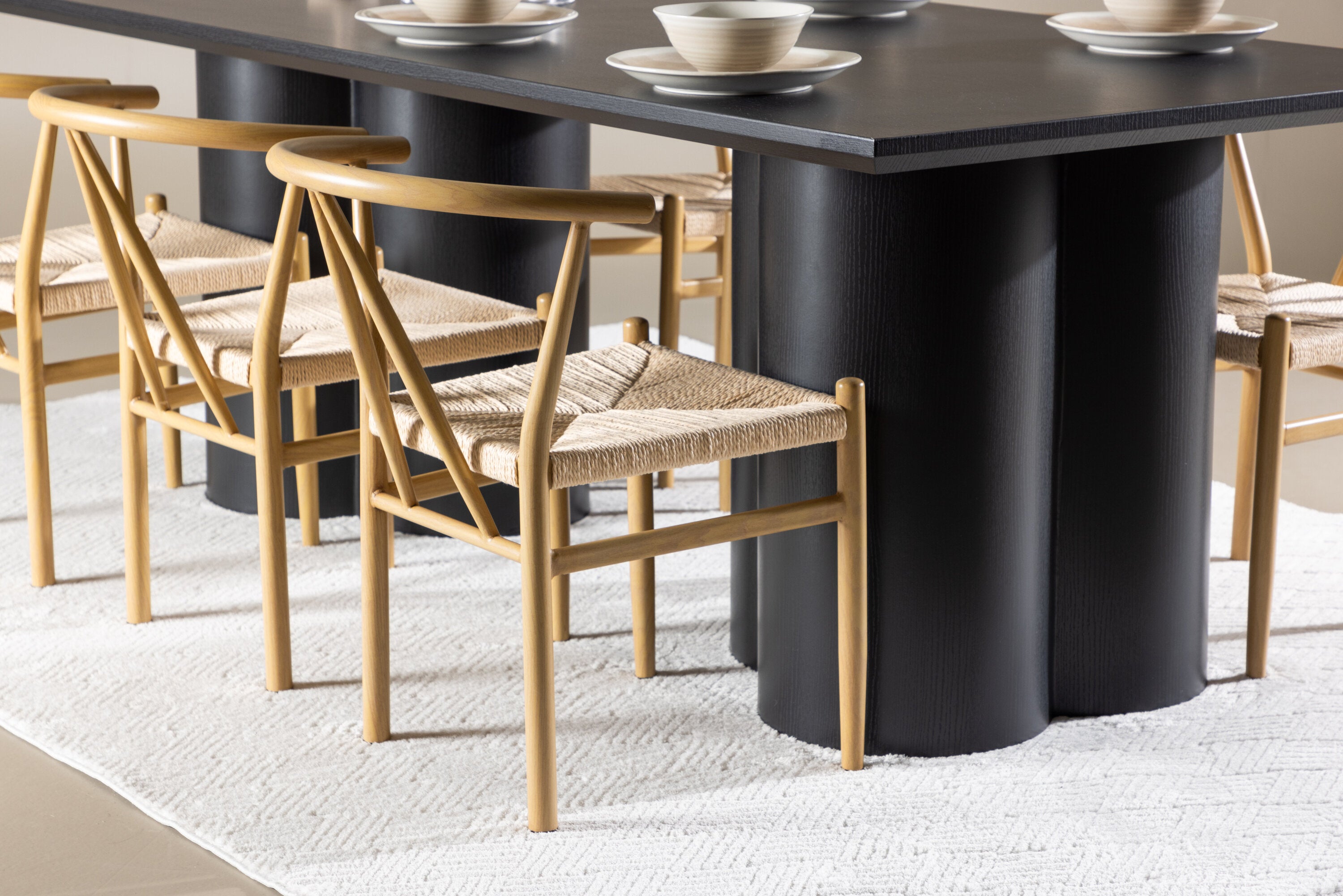 Vytvořte ve svém domově elegantní a příjemnou atmosféru s naší sofistikovanou jídelní sadou, která kombinuje moderní design a nadčasové kouzlo. Tento jídelní set se skládá z elegantních židlí Alfons a působivého jídelního stolu Olivia. Objevte židli Alfons - dokonalou směs modernosti a nadčasové elegance. Alfons, vyrobený z ratanu v přírodním barevném tónu s ocelovými nohami, poskytuje svěží a uvolněný pocit do každé místnosti. Díky svému trendovému designu a neutrálnímu vzhledu se Alfons bez problémů hodí do různých stylů interiéru. Jeho elegantní silueta a tkaná struktura vytváří ve vašem domově vzdušnou a příjemnou atmosféru. Křeslo Alfons není jen pohodlným sezením, ale také místem pro společnost a společenský život. Nechte Alfonse být vaším společníkem během dlouhých rozhovorů nebo příjemných chvil s přáteli a rodinou. Díky svému šarmu a všestrannosti je židle Alfons nezbytnou součástí každého moderního domova. Zažijte eleganci a funkčnost s jídelním stolem Olivia. Se svými velkorysými rozměry 210x100 cm je tento stůl ideální pro vítání přátel a rodiny při společném jídle a posezení. Jídelní stůl Olivia v sofistikovaném černém odstínu vyzařuje eleganci a modernost. Jeho robustní konstrukce zaručuje stabilitu po mnoho let. Vytvořte ve svém domově trendy atmosféru s jídelním stolem Olivia. Díky svému elegantnímu designu a nadčasové barvě se perfektně hodí do různých stylů interiéru. Nechte jídelní stůl Olivia vytvářet vaše společenská setkání a vzpomínky a zároveň sdílet jídla a konverzovat se svými blízkými. Se židlemi Alfons a jídelním stolem Olivia získáte jídelní set, který v nejlepší míře kombinuje estetiku a funkčnost. Dodejte svému domovu dotek elegance a soudržnosti s touto působivou a všestrannou jídelní sadou.
