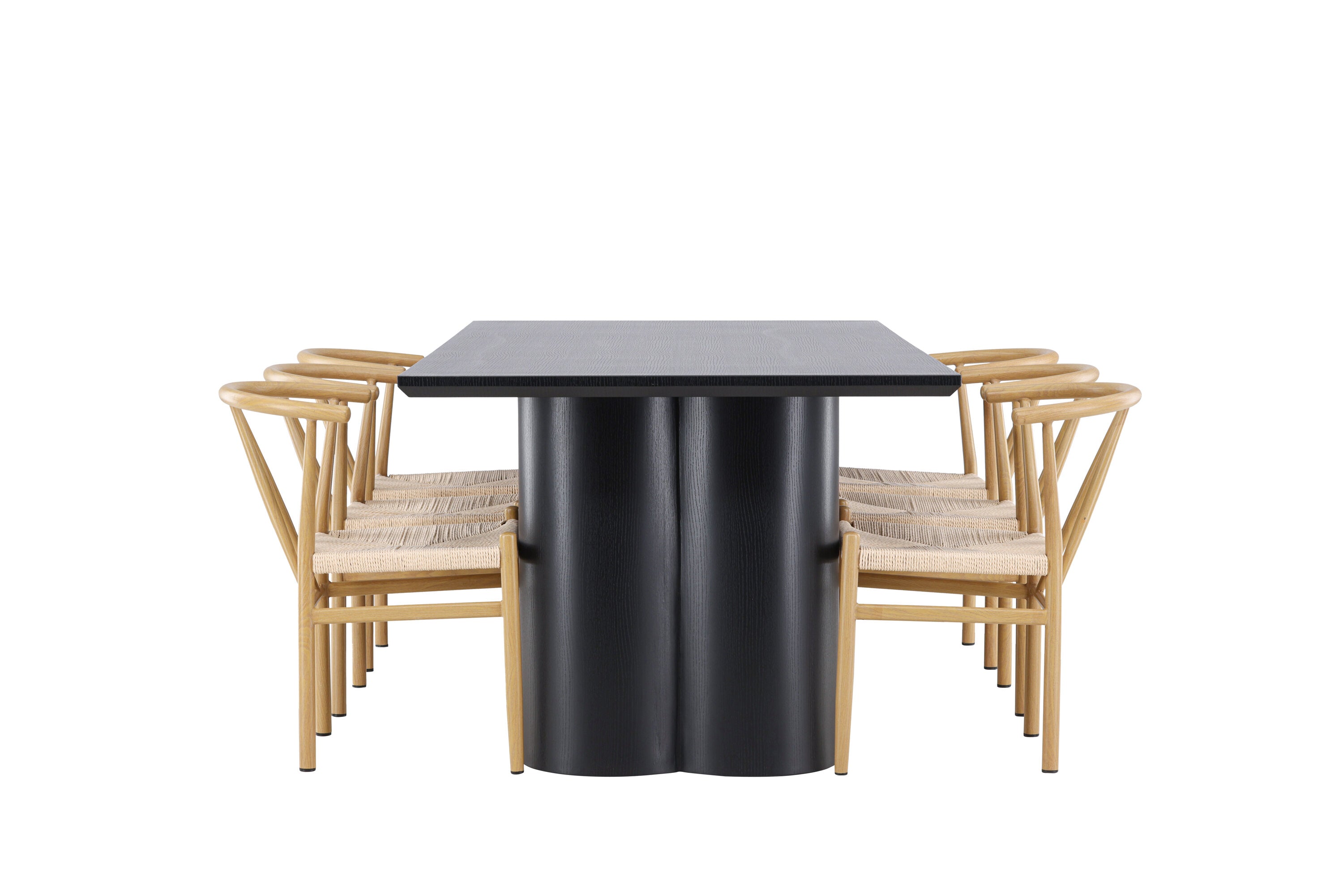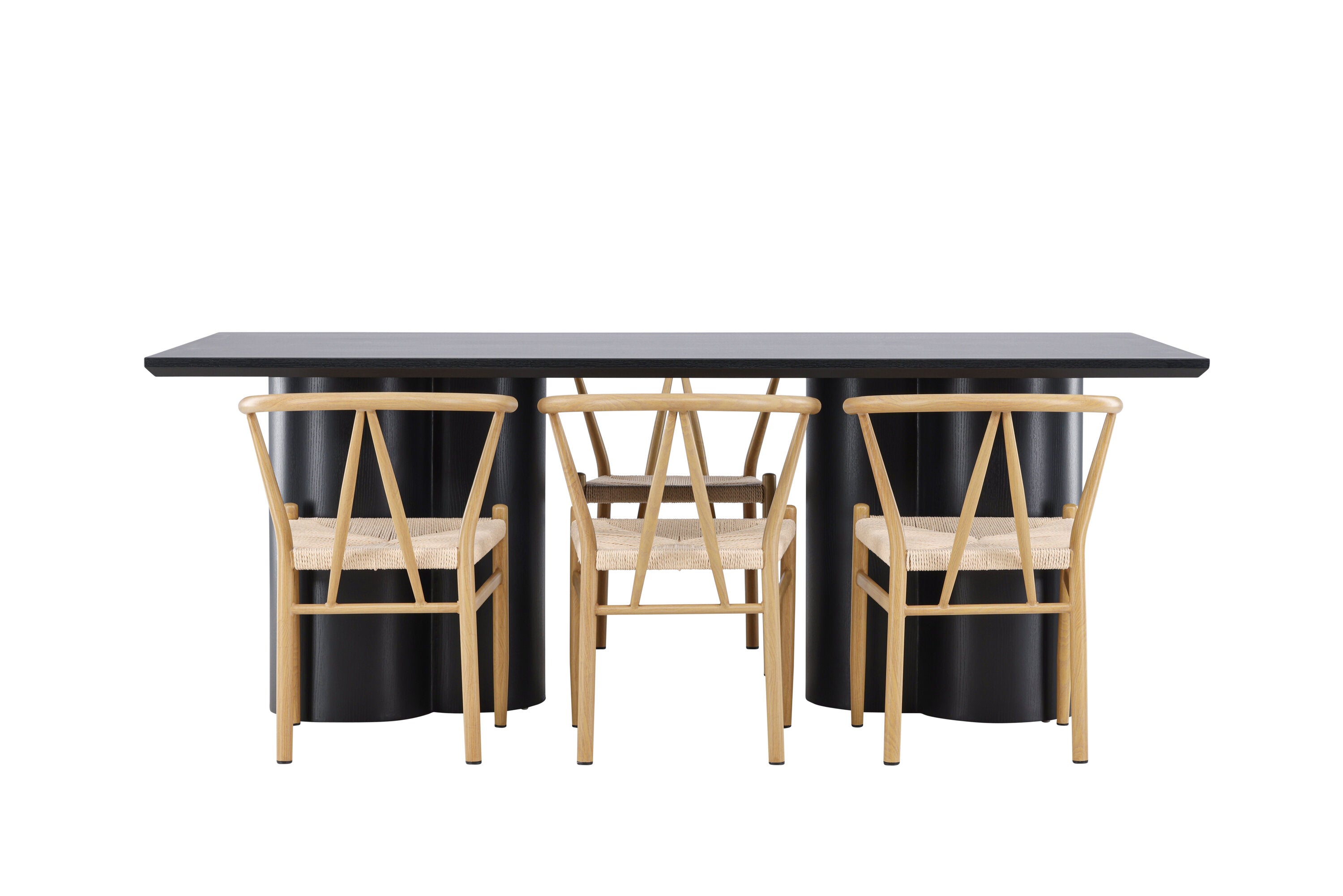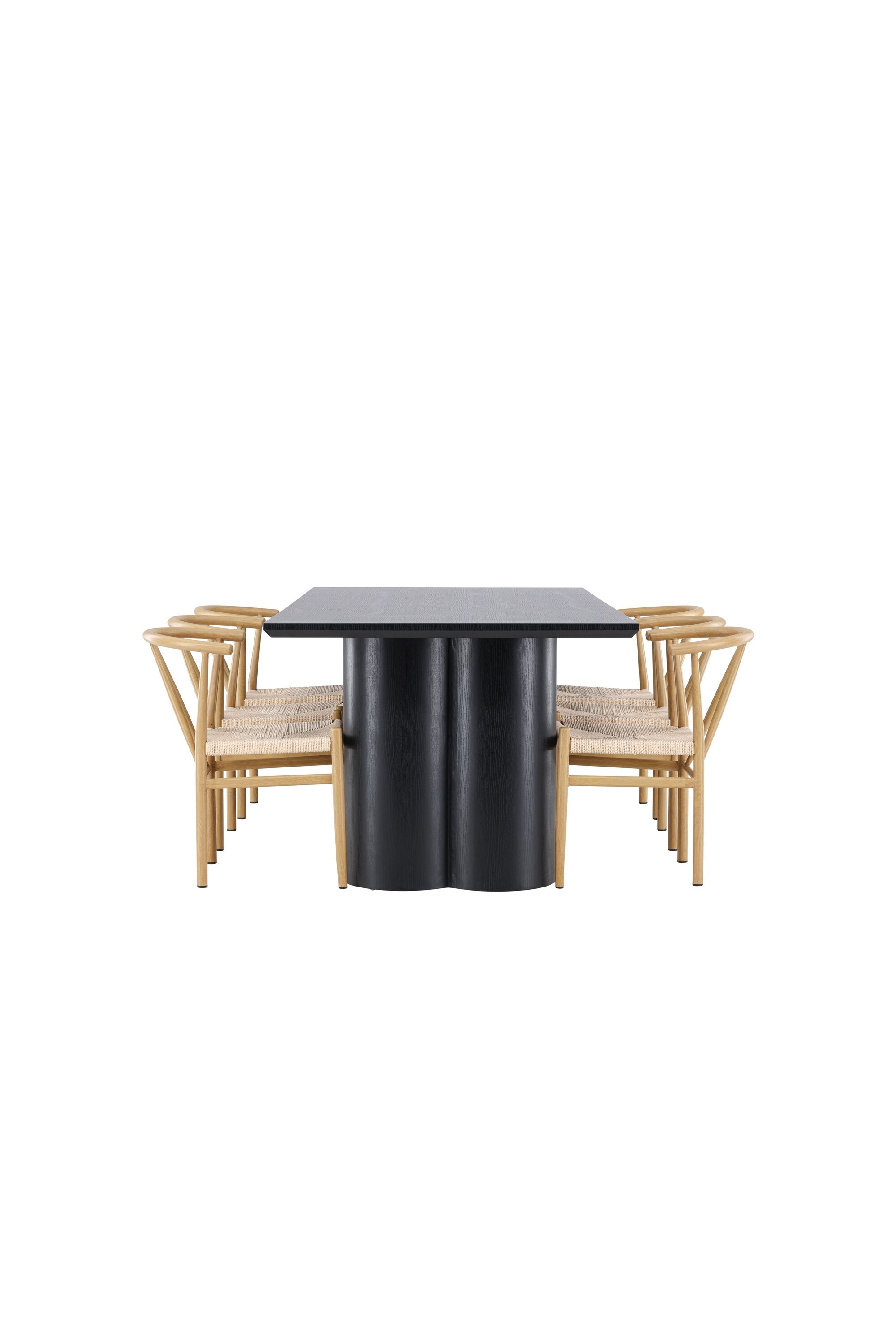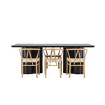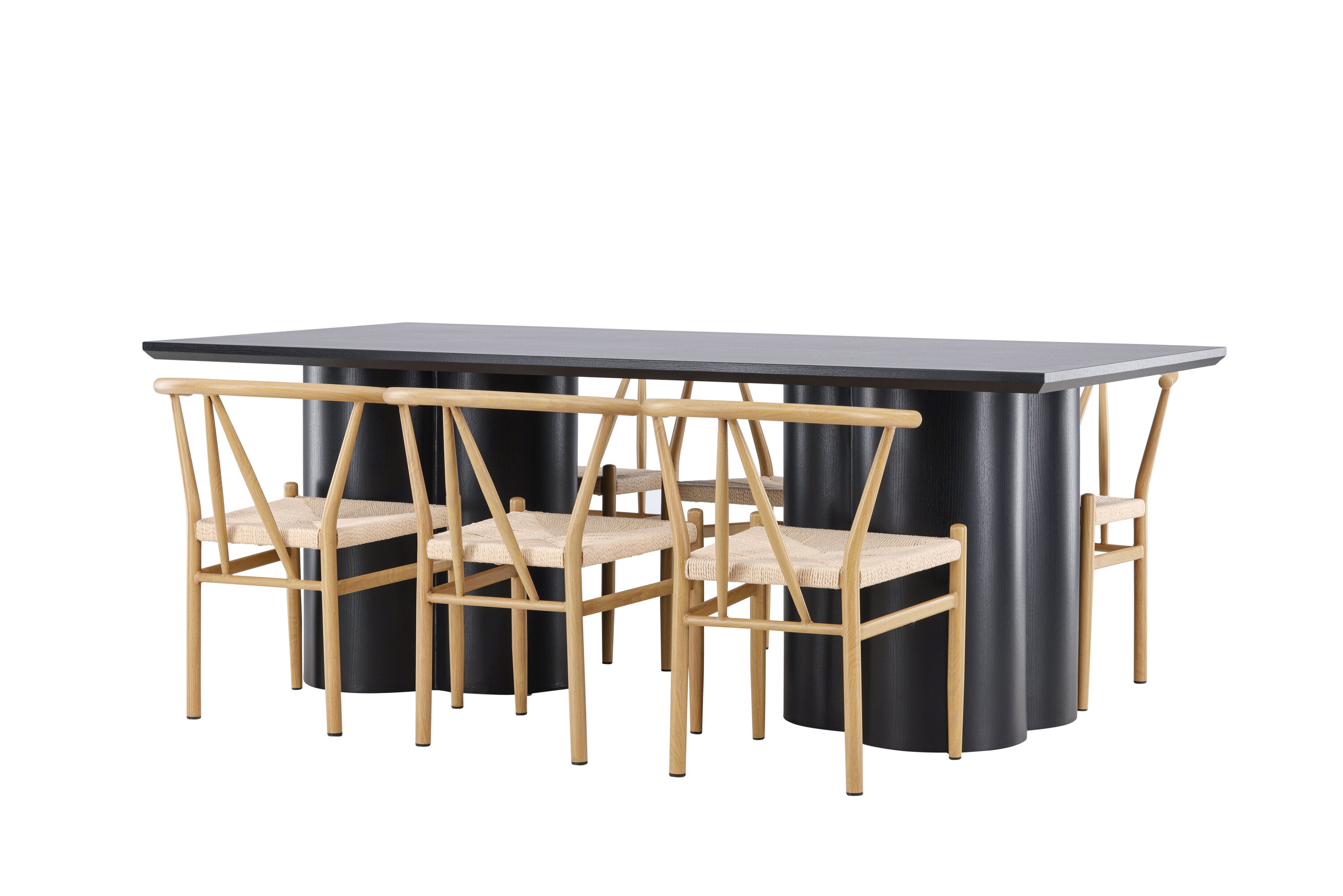 Vytvořte ve svém domově elegantní a příjemnou atmosféru s naší sofistikovanou jídelní sadou, která kombinuje moderní design a nadčasové kouzlo. Tento jídelní set se skládá z elegantních židlí Alfons a působivého jídelního stolu Olivia. Objevte židli Alfons - dokonalou směs modernosti a nadčasové elegance. Alfons, vyrobený z ratanu v přírodním barevném tónu s ocelovými nohami, poskytuje svěží a uvolněný pocit do každé místnosti. Díky svému trendovému designu a neutrálnímu vzhledu se Alfons bez problémů hodí do různých stylů interiéru. Jeho elegantní silueta a tkaná struktura vytváří ve vašem domově vzdušnou a příjemnou atmosféru. Křeslo Alfons není jen pohodlným sezením, ale také místem pro společnost a společenský život. Nechte Alfonse být vaším společníkem během dlouhých rozhovorů nebo příjemných chvil s přáteli a rodinou. Díky svému šarmu a všestrannosti je židle Alfons nezbytnou součástí každého moderního domova. Zažijte eleganci a funkčnost s jídelním stolem Olivia. Se svými velkorysými rozměry 210x100 cm je tento stůl ideální pro vítání přátel a rodiny při společném jídle a posezení. Jídelní stůl Olivia v sofistikovaném černém odstínu vyzařuje eleganci a modernost. Jeho robustní konstrukce zaručuje stabilitu po mnoho let. Vytvořte ve svém domově trendy atmosféru s jídelním stolem Olivia. Díky svému elegantnímu designu a nadčasové barvě se perfektně hodí do různých stylů interiéru. Nechte jídelní stůl Olivia vytvářet vaše společenská setkání a vzpomínky a zároveň sdílet jídla a konverzovat se svými blízkými. Se židlemi Alfons a jídelním stolem Olivia získáte jídelní set, který v nejlepší míře kombinuje estetiku a funkčnost. Dodejte svému domovu dotek elegance a soudržnosti s touto působivou a všestrannou jídelní sadou.
