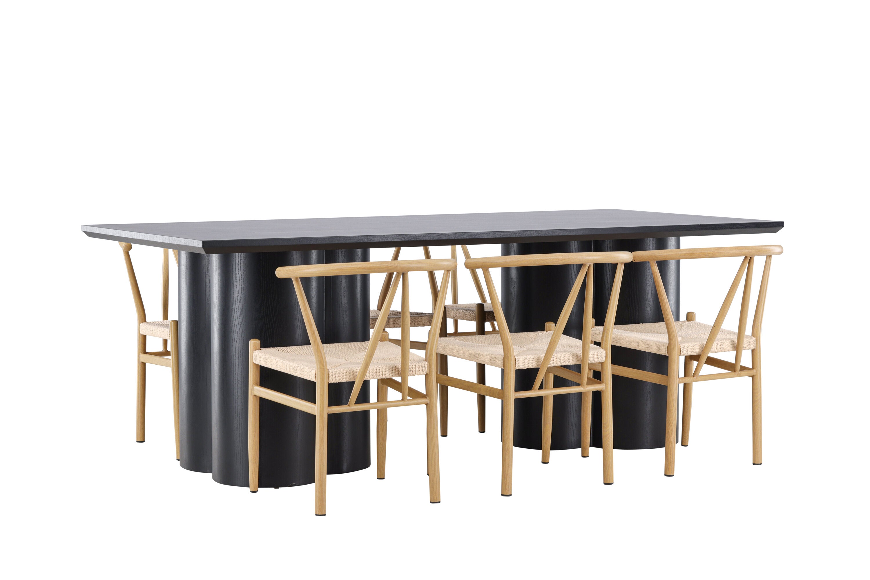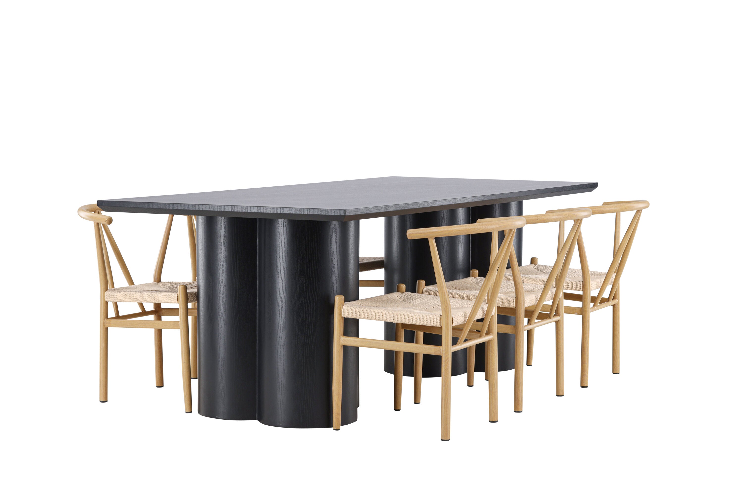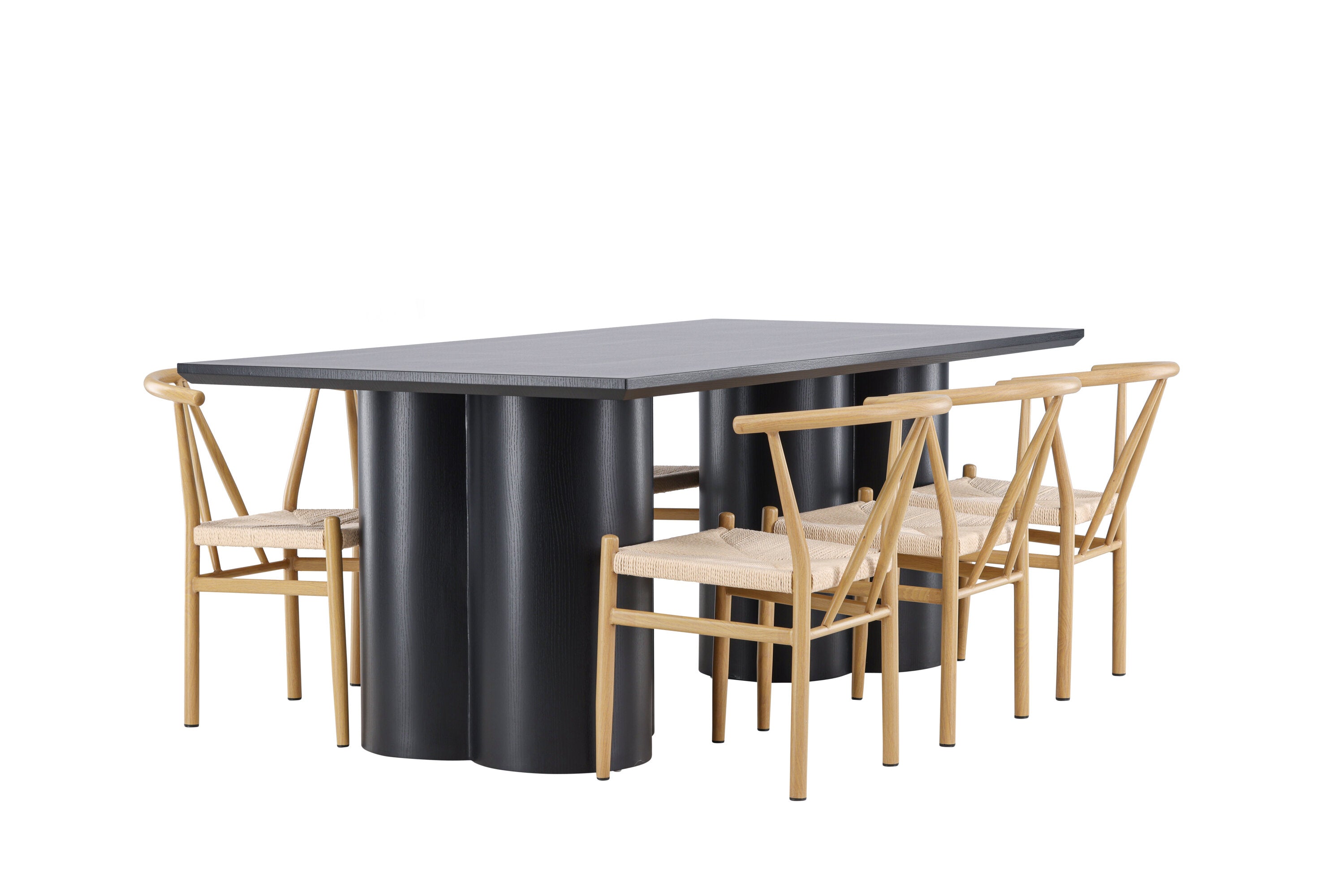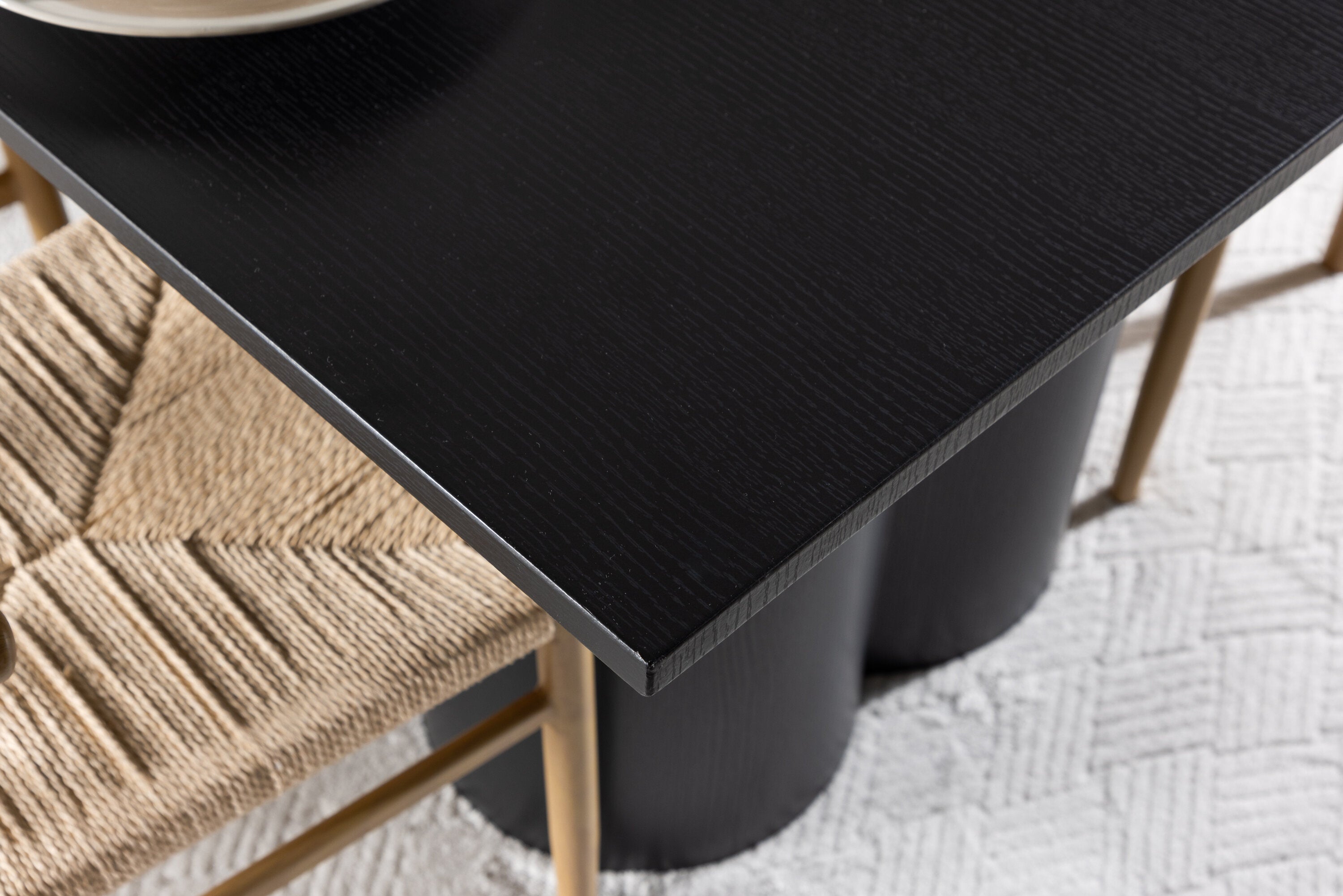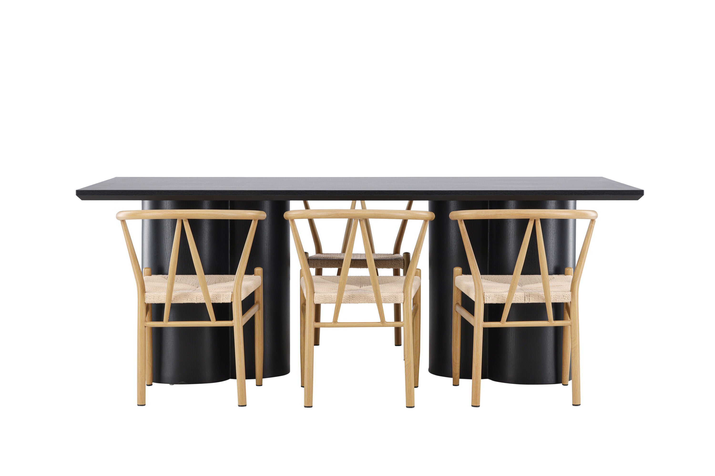 Vytvořte ve svém domově elegantní a příjemnou atmosféru s naší sofistikovanou jídelní sadou, která kombinuje moderní design a nadčasové kouzlo. Tento jídelní set se skládá z elegantních židlí Alfons a působivého jídelního stolu Olivia. Objevte židli Alfons - dokonalou směs modernosti a nadčasové elegance. Alfons, vyrobený z ratanu v přírodním barevném tónu s ocelovými nohami, poskytuje svěží a uvolněný pocit do každé místnosti. Díky svému trendovému designu a neutrálnímu vzhledu se Alfons bez problémů hodí do různých stylů interiéru. Jeho elegantní silueta a tkaná struktura vytváří ve vašem domově vzdušnou a příjemnou atmosféru. Křeslo Alfons není jen pohodlným sezením, ale také místem pro společnost a společenský život. Nechte Alfonse být vaším společníkem během dlouhých rozhovorů nebo příjemných chvil s přáteli a rodinou. Díky svému šarmu a všestrannosti je židle Alfons nezbytnou součástí každého moderního domova. Zažijte eleganci a funkčnost s jídelním stolem Olivia. Se svými velkorysými rozměry 210x100 cm je tento stůl ideální pro vítání přátel a rodiny při společném jídle a posezení. Jídelní stůl Olivia v sofistikovaném černém odstínu vyzařuje eleganci a modernost. Jeho robustní konstrukce zaručuje stabilitu po mnoho let. Vytvořte ve svém domově trendy atmosféru s jídelním stolem Olivia. Díky svému elegantnímu designu a nadčasové barvě se perfektně hodí do různých stylů interiéru. Nechte jídelní stůl Olivia vytvářet vaše společenská setkání a vzpomínky a zároveň sdílet jídla a konverzovat se svými blízkými. Se židlemi Alfons a jídelním stolem Olivia získáte jídelní set, který v nejlepší míře kombinuje estetiku a funkčnost. Dodejte svému domovu dotek elegance a soudržnosti s touto působivou a všestrannou jídelní sadou.