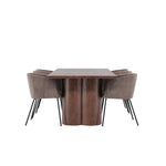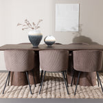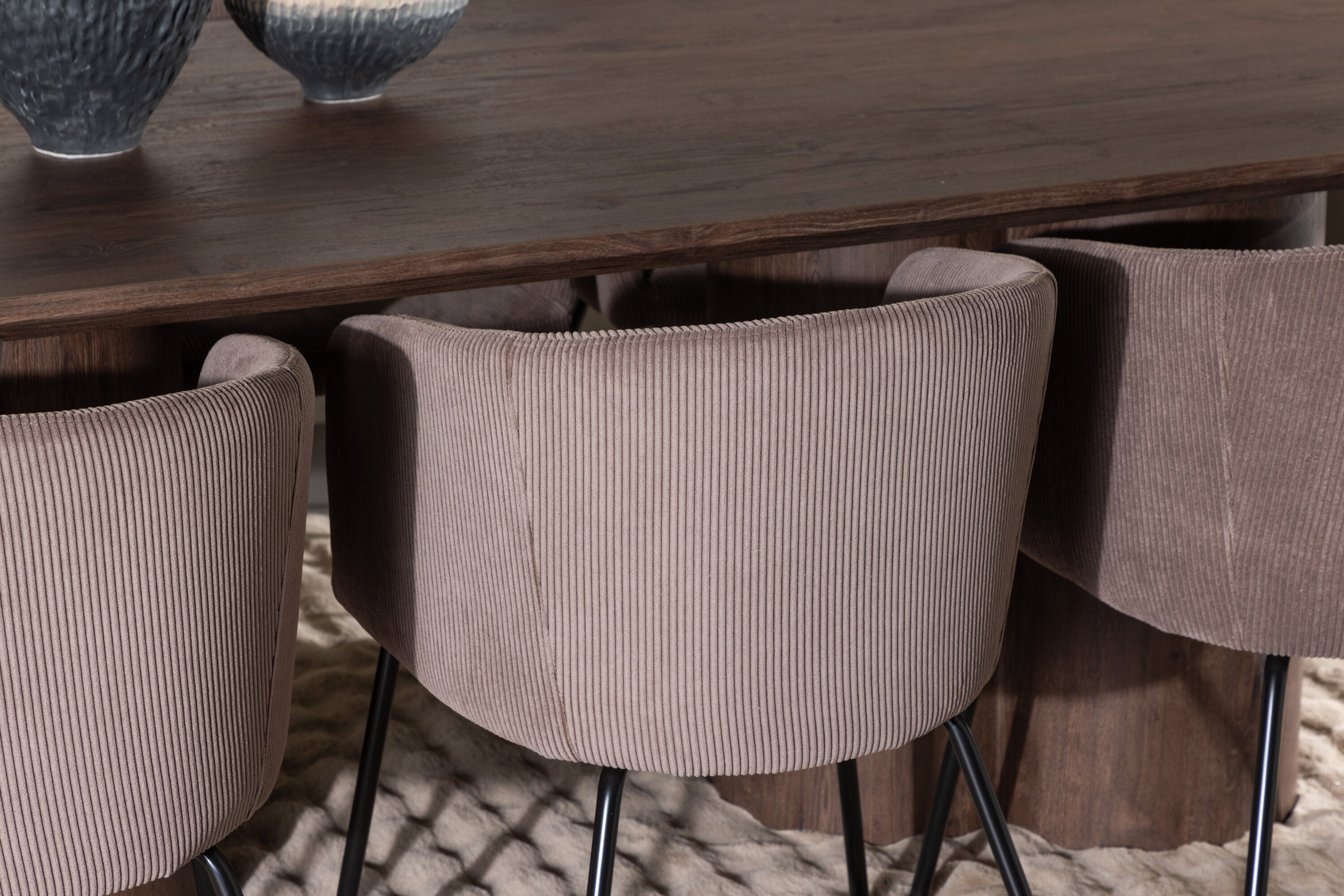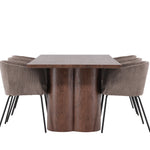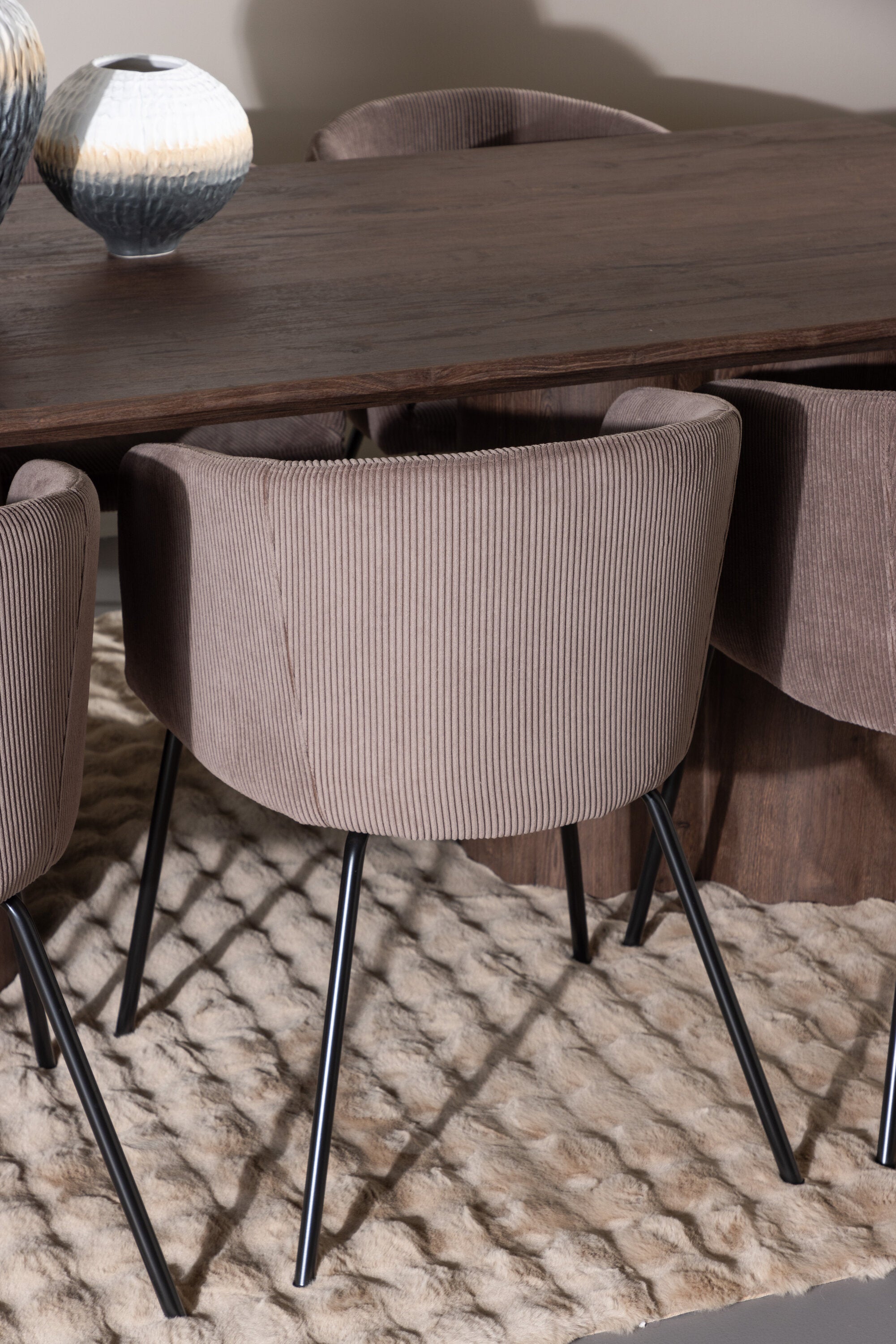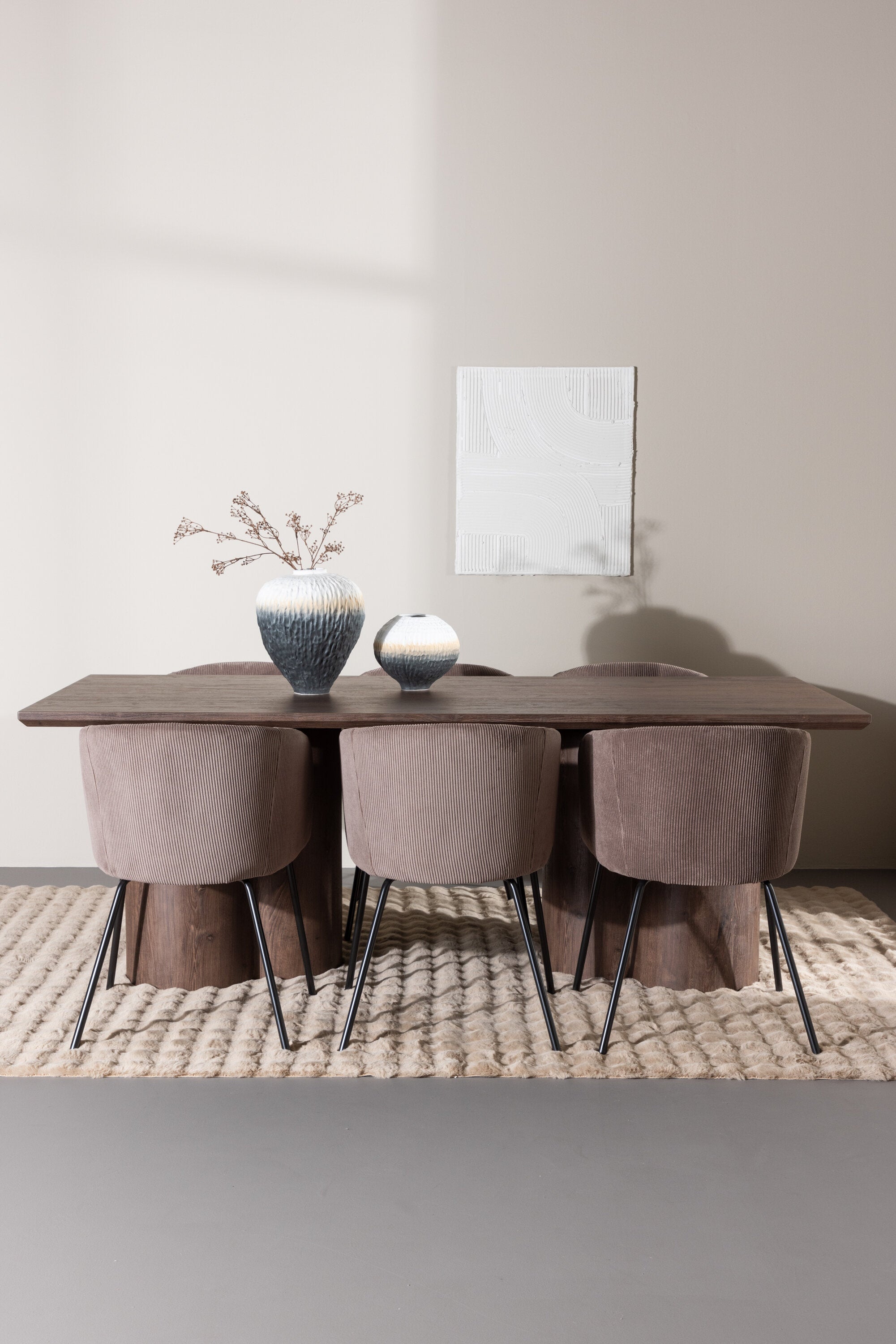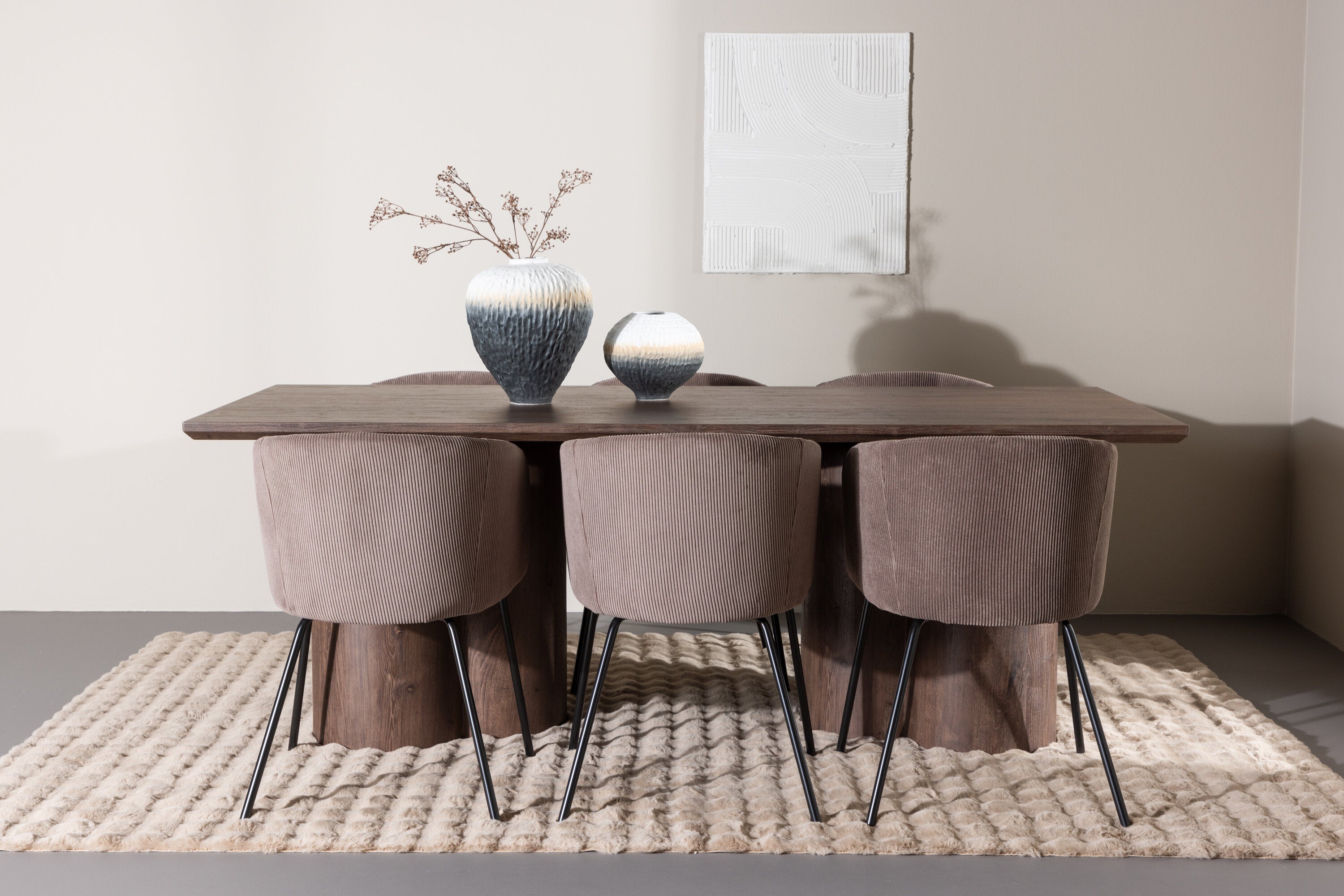 Proměňte svou jídelnu pomocí našeho sofistikovaného jídelního setu, který kombinuje moderní design a vynikající pohodlí. Tato jídelní souprava se skládá ze stylových židlí Berit a elegantního jídelního stolu Olivia, takže je ideální pro všechny druhy jídel a setkání. Seznamte se s jídelní židlí Berit - perfektní volbou pro moderní a stylovou výzdobu jídelny. Berit je dokonalou kombinací stylu a pohodlí pro váš domov. Díky své elegantní hnědé barvě a měkkému materiálu z polyesterového manšestru nabízí Berit luxusní a pohodlné sezení u jídelního stolu. Její jednoduchý a moderní design doplňují nohy z černé oceli, které poskytují robustní a elegantní základnu židle. Jídelní židle Berit je nejen stylová, ale také funkční a všestranná. Jeho hluboké sedátko umožňuje pohodlné sezení během dlouhých jídel nebo konverzací u stolu, takže je dokonalým společníkem pro každodenní i speciální příležitosti. Objevte jídelní stůl Olivia - harmonické spojení stylu a funkčnosti. S velkorysými rozměry 100x210 cm nabízí Olivia dostatek prostoru pro setkávání blízkých při večeřích a společenských akcích. Olivia, vyrobená z MDF materiálu a s povrchovou úpravou v barvě moka, přináší do vašeho domova teplou a příjemnou atmosféru. Jeho neutrální design umožňuje, aby dobře zapadl do různých stylů interiéru a zároveň vytvořil klidný a přívětivý pocit. Jídelní stůl Olivia je víc než jen kus nábytku; je to místo, kde se vytvářejí vzpomínky s přáteli a rodinou. Nechte Olivii, aby byla středobodem vašich setkání a vytvářejte společně teplé a nezapomenutelné chvíle. Se židlemi Berit a jídelním stolem Olivia získáte jídelní set, který kombinuje estetiku a funkčnost tím nejlepším možným způsobem. Dopřejte své jídelně vylepšení s tímto elegantním a všestranným jídelním setem.