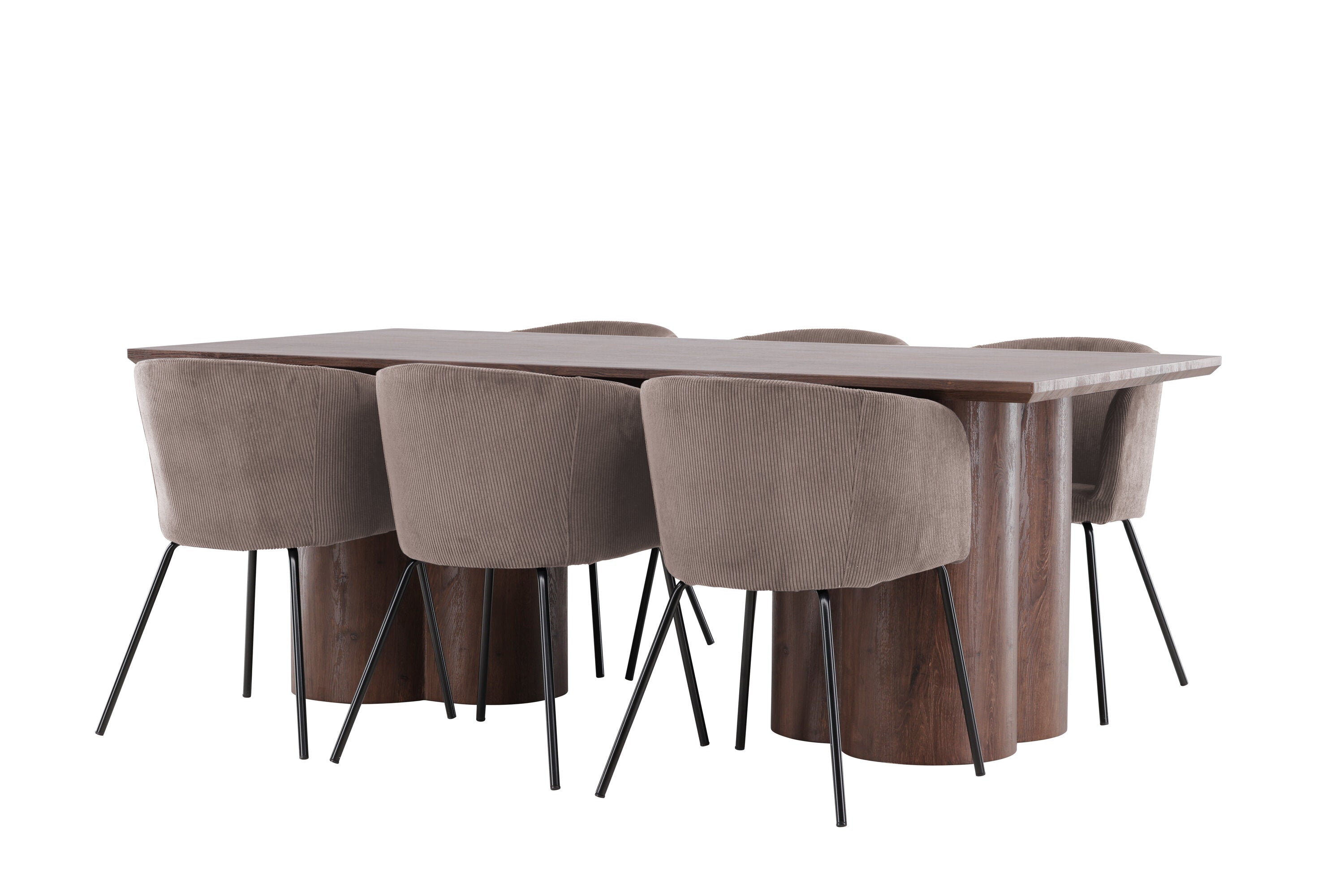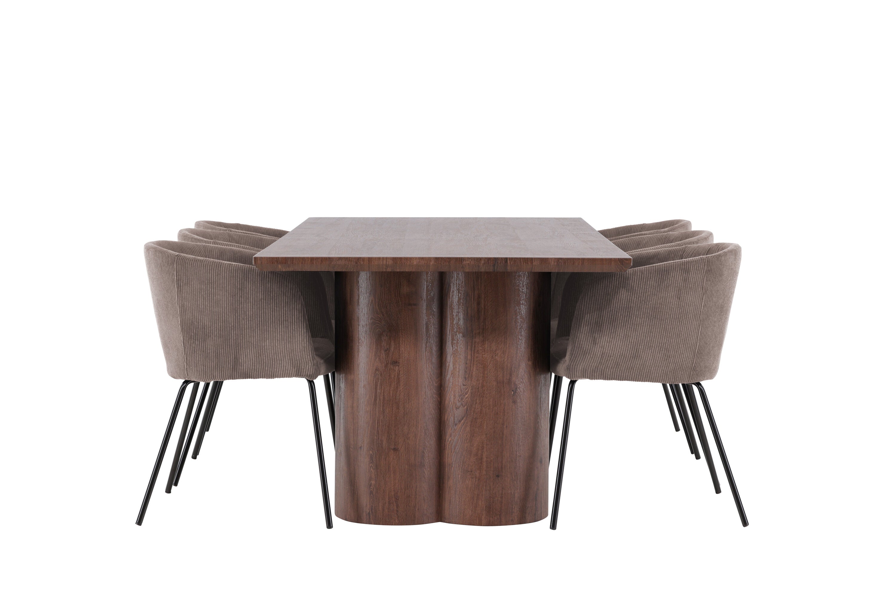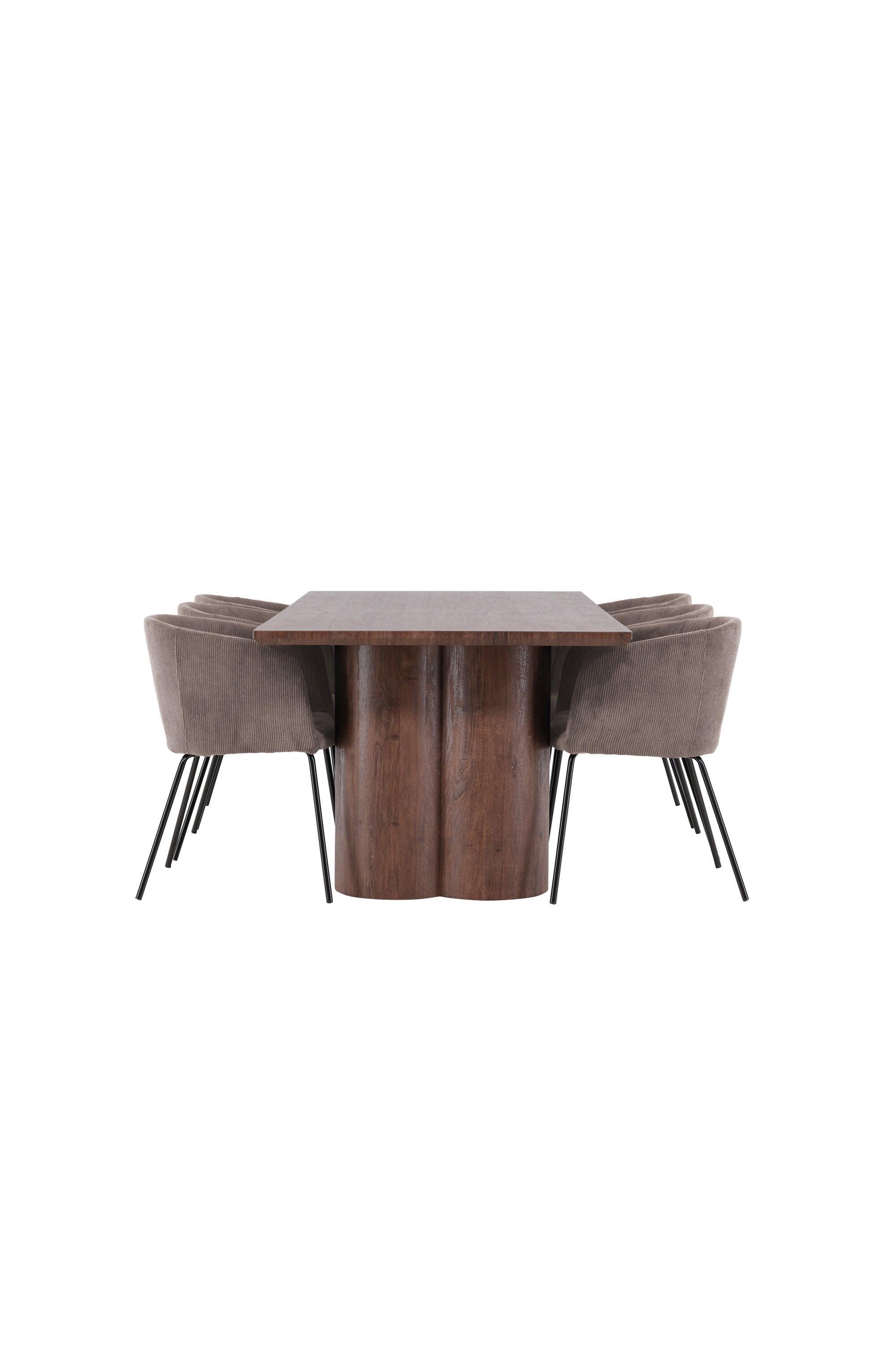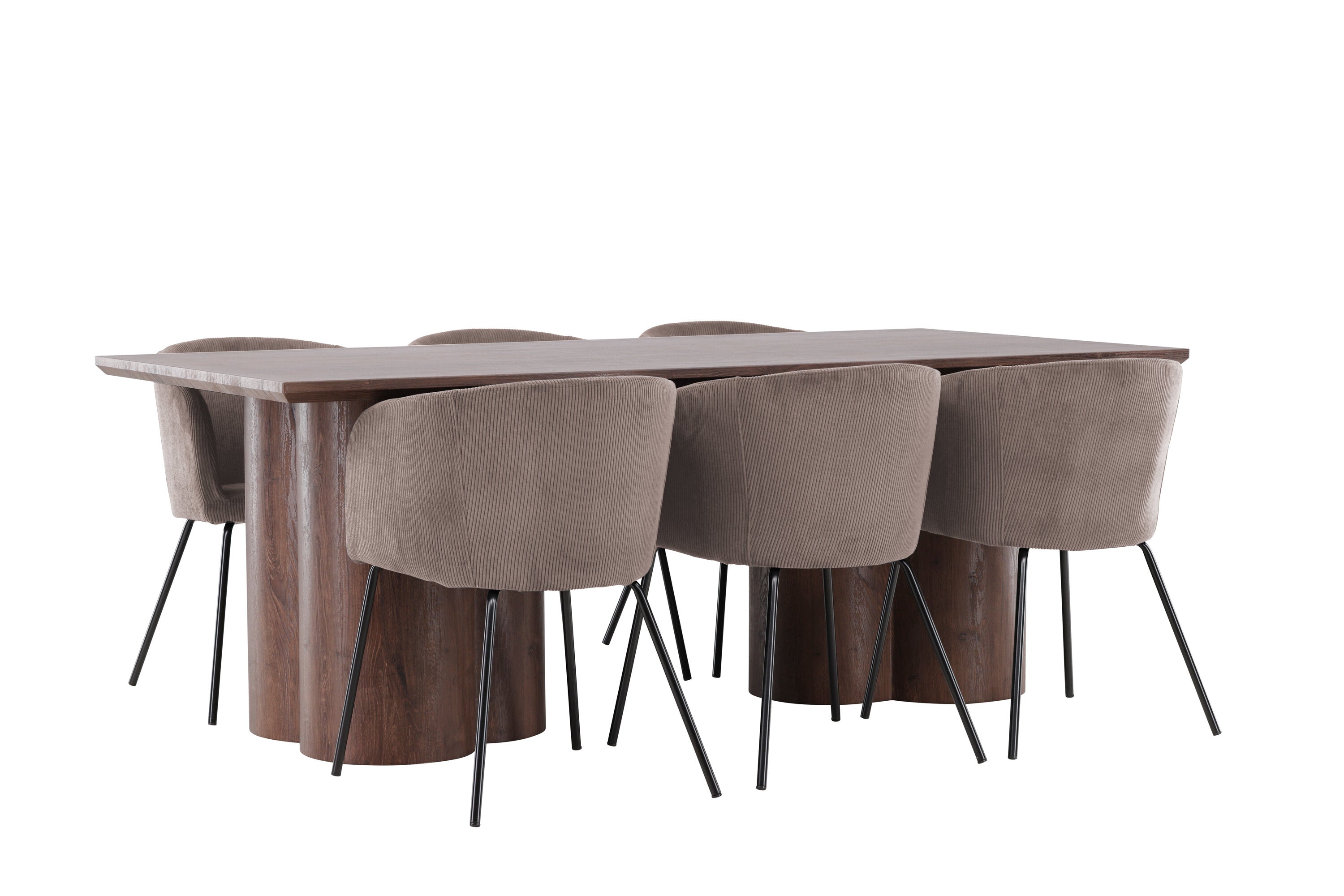 Proměňte svou jídelnu pomocí našeho sofistikovaného jídelního setu, který kombinuje moderní design a vynikající pohodlí. Tato jídelní souprava se skládá ze stylových židlí Berit a elegantního jídelního stolu Olivia, takže je ideální pro všechny druhy jídel a setkání. Seznamte se s jídelní židlí Berit - perfektní volbou pro moderní a stylovou výzdobu jídelny. Berit je dokonalou kombinací stylu a pohodlí pro váš domov. Díky své elegantní hnědé barvě a měkkému materiálu z polyesterového manšestru nabízí Berit luxusní a pohodlné sezení u jídelního stolu. Její jednoduchý a moderní design doplňují nohy z černé oceli, které poskytují robustní a elegantní základnu židle. Jídelní židle Berit je nejen stylová, ale také funkční a všestranná. Jeho hluboké sedátko umožňuje pohodlné sezení během dlouhých jídel nebo konverzací u stolu, takže je dokonalým společníkem pro každodenní i speciální příležitosti. Objevte jídelní stůl Olivia - harmonické spojení stylu a funkčnosti. S velkorysými rozměry 100x210 cm nabízí Olivia dostatek prostoru pro setkávání blízkých při večeřích a společenských akcích. Olivia, vyrobená z MDF materiálu a s povrchovou úpravou v barvě moka, přináší do vašeho domova teplou a příjemnou atmosféru. Jeho neutrální design umožňuje, aby dobře zapadl do různých stylů interiéru a zároveň vytvořil klidný a přívětivý pocit. Jídelní stůl Olivia je víc než jen kus nábytku; je to místo, kde se vytvářejí vzpomínky s přáteli a rodinou. Nechte Olivii, aby byla středobodem vašich setkání a vytvářejte společně teplé a nezapomenutelné chvíle. Se židlemi Berit a jídelním stolem Olivia získáte jídelní set, který kombinuje estetiku a funkčnost tím nejlepším možným způsobem. Dopřejte své jídelně vylepšení s tímto elegantním a všestranným jídelním setem.