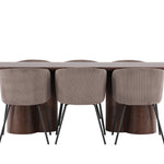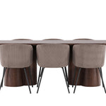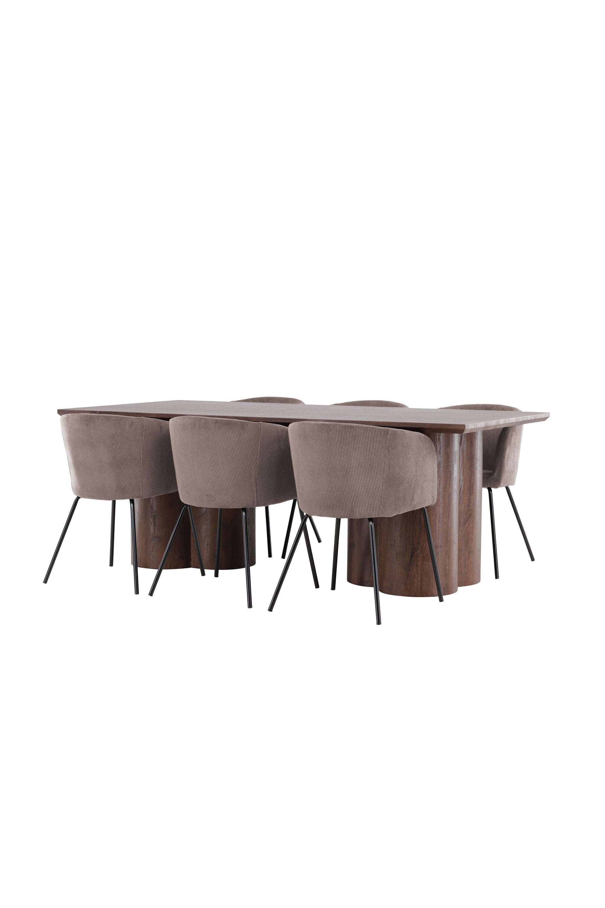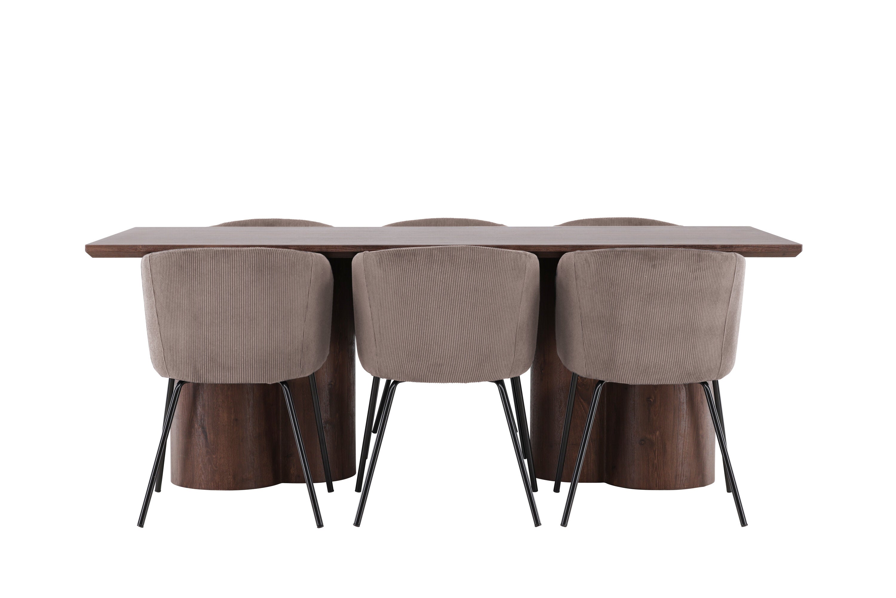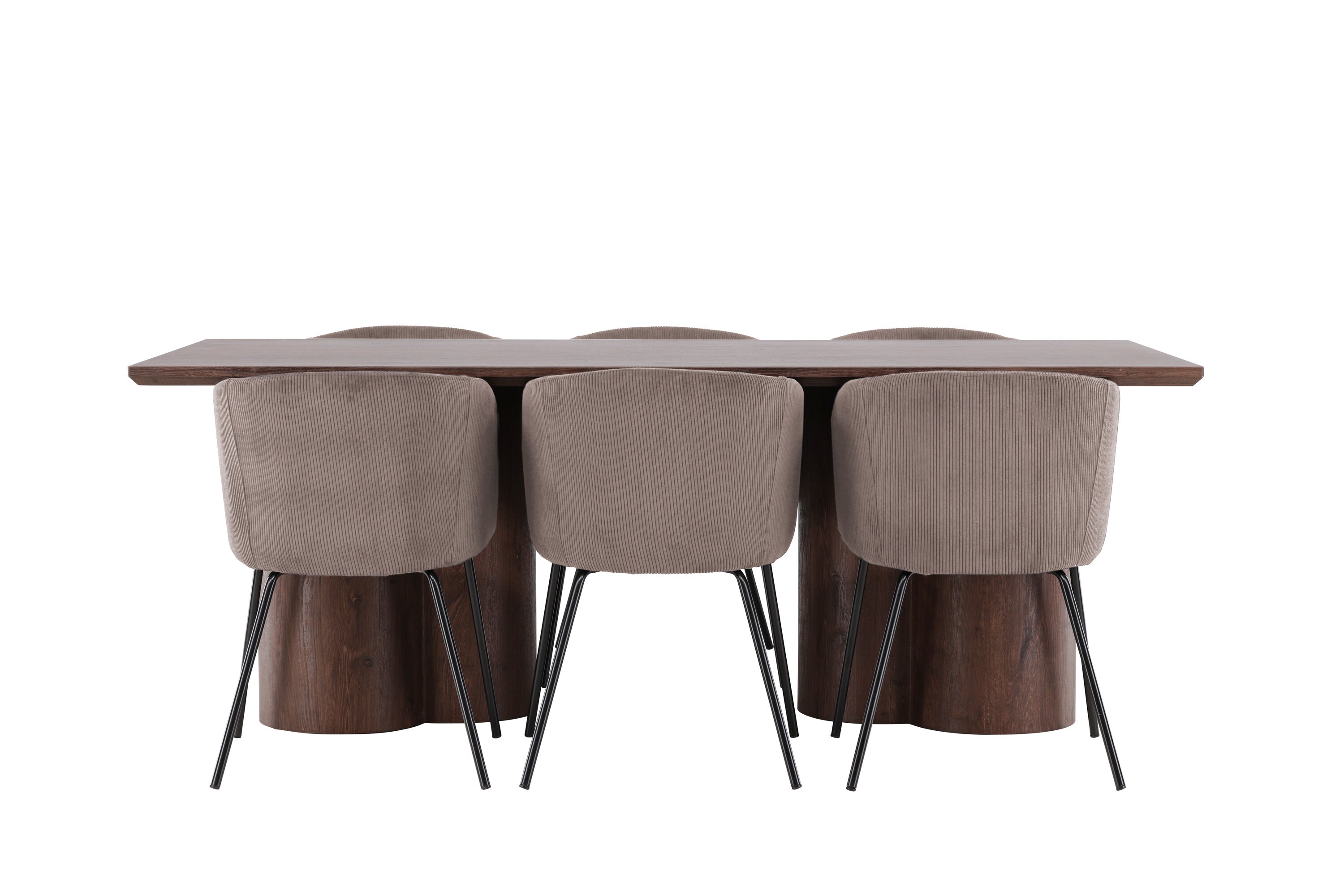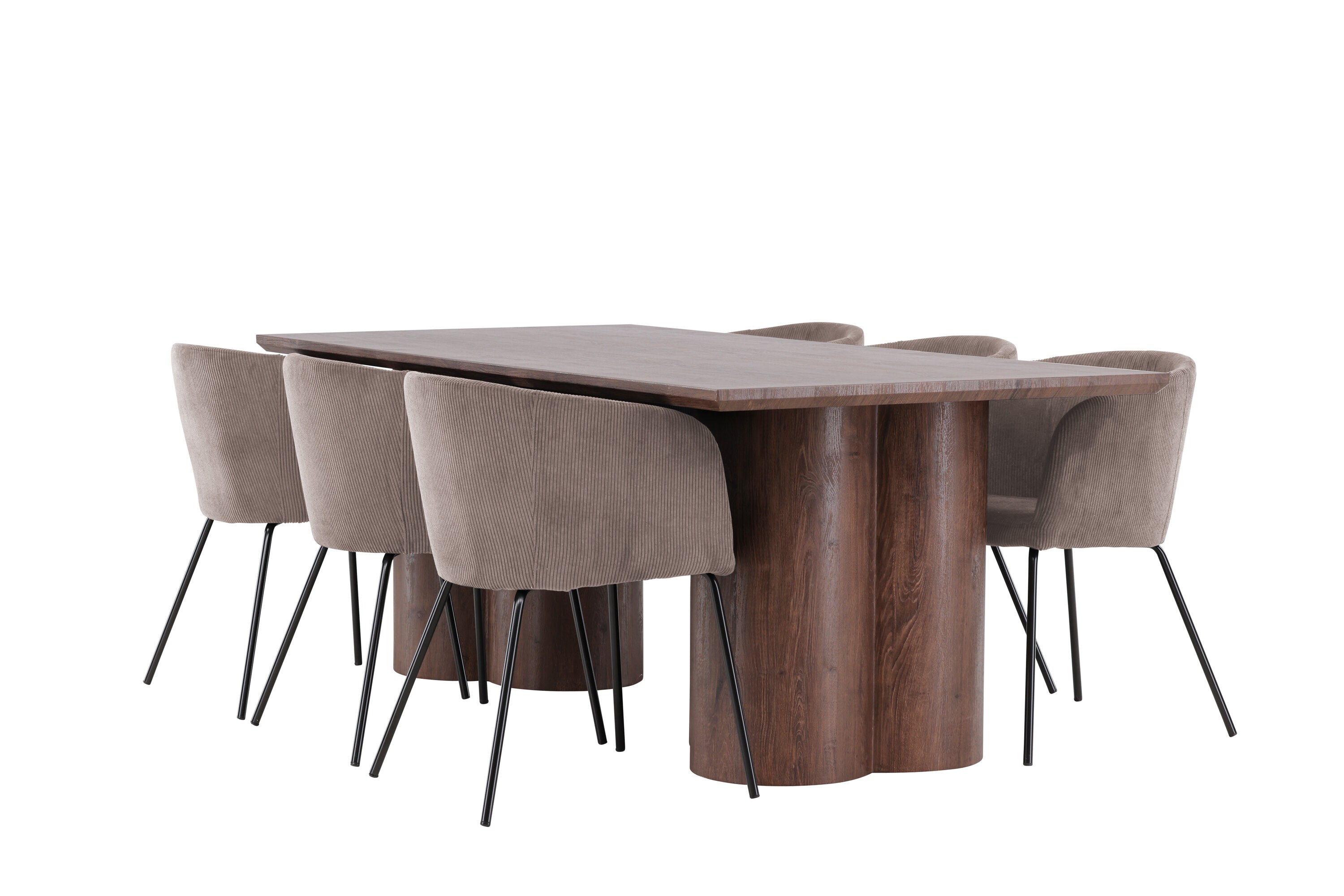 Proměňte svou jídelnu pomocí našeho sofistikovaného jídelního setu, který kombinuje moderní design a vynikající pohodlí. Tato jídelní souprava se skládá ze stylových židlí Berit a elegantního jídelního stolu Olivia, takže je ideální pro všechny druhy jídel a setkání. Seznamte se s jídelní židlí Berit - perfektní volbou pro moderní a stylovou výzdobu jídelny. Berit je dokonalou kombinací stylu a pohodlí pro váš domov. Díky své elegantní hnědé barvě a měkkému materiálu z polyesterového manšestru nabízí Berit luxusní a pohodlné sezení u jídelního stolu. Její jednoduchý a moderní design doplňují nohy z černé oceli, které poskytují robustní a elegantní základnu židle. Jídelní židle Berit je nejen stylová, ale také funkční a všestranná. Jeho hluboké sedátko umožňuje pohodlné sezení během dlouhých jídel nebo konverzací u stolu, takže je dokonalým společníkem pro každodenní i speciální příležitosti. Objevte jídelní stůl Olivia - harmonické spojení stylu a funkčnosti. S velkorysými rozměry 100x210 cm nabízí Olivia dostatek prostoru pro setkávání blízkých při večeřích a společenských akcích. Olivia, vyrobená z MDF materiálu a s povrchovou úpravou v barvě moka, přináší do vašeho domova teplou a příjemnou atmosféru. Jeho neutrální design umožňuje, aby dobře zapadl do různých stylů interiéru a zároveň vytvořil klidný a přívětivý pocit. Jídelní stůl Olivia je víc než jen kus nábytku; je to místo, kde se vytvářejí vzpomínky s přáteli a rodinou. Nechte Olivii, aby byla středobodem vašich setkání a vytvářejte společně teplé a nezapomenutelné chvíle. Se židlemi Berit a jídelním stolem Olivia získáte jídelní set, který kombinuje estetiku a funkčnost tím nejlepším možným způsobem. Dopřejte své jídelně vylepšení s tímto elegantním a všestranným jídelním setem.