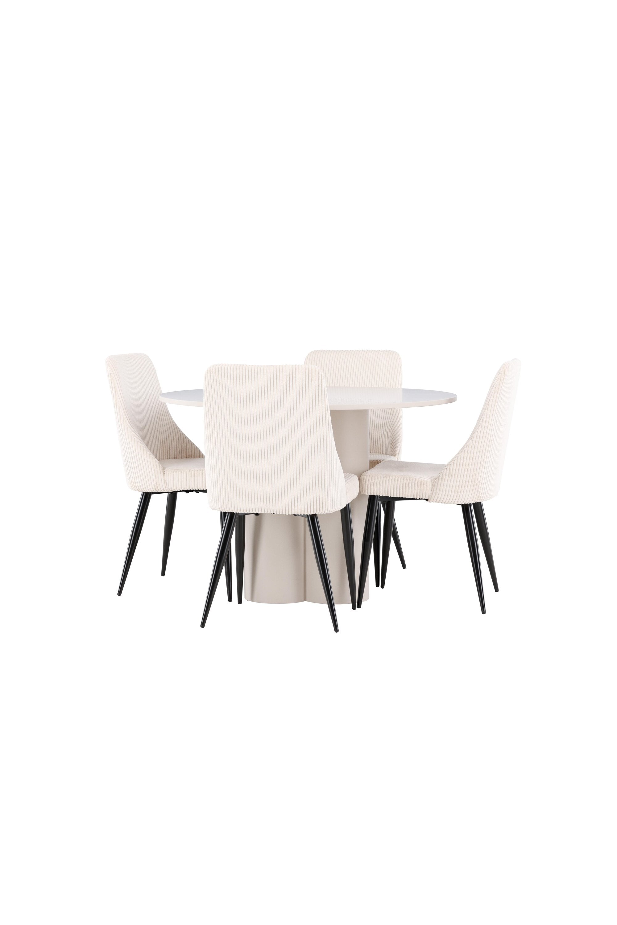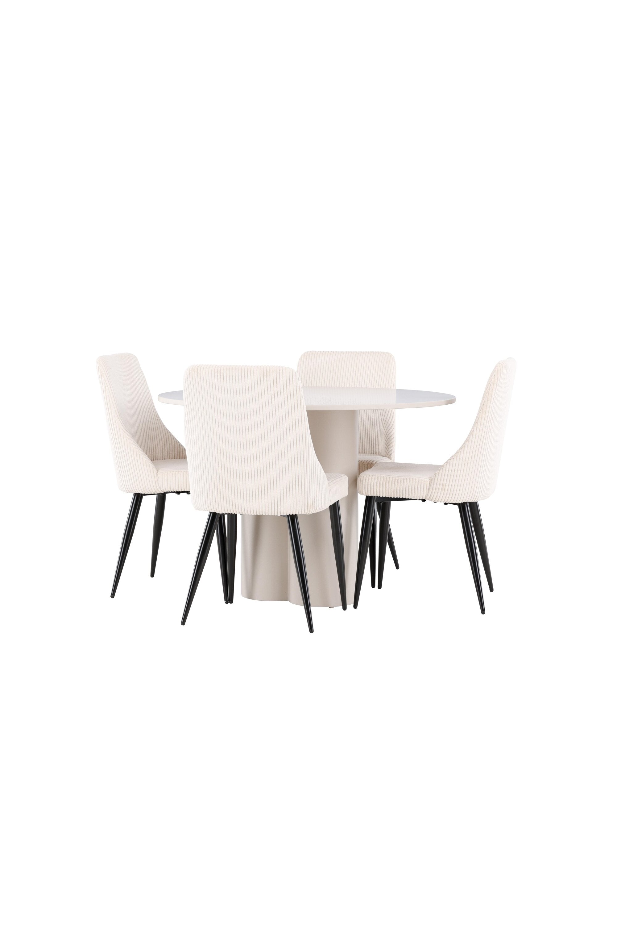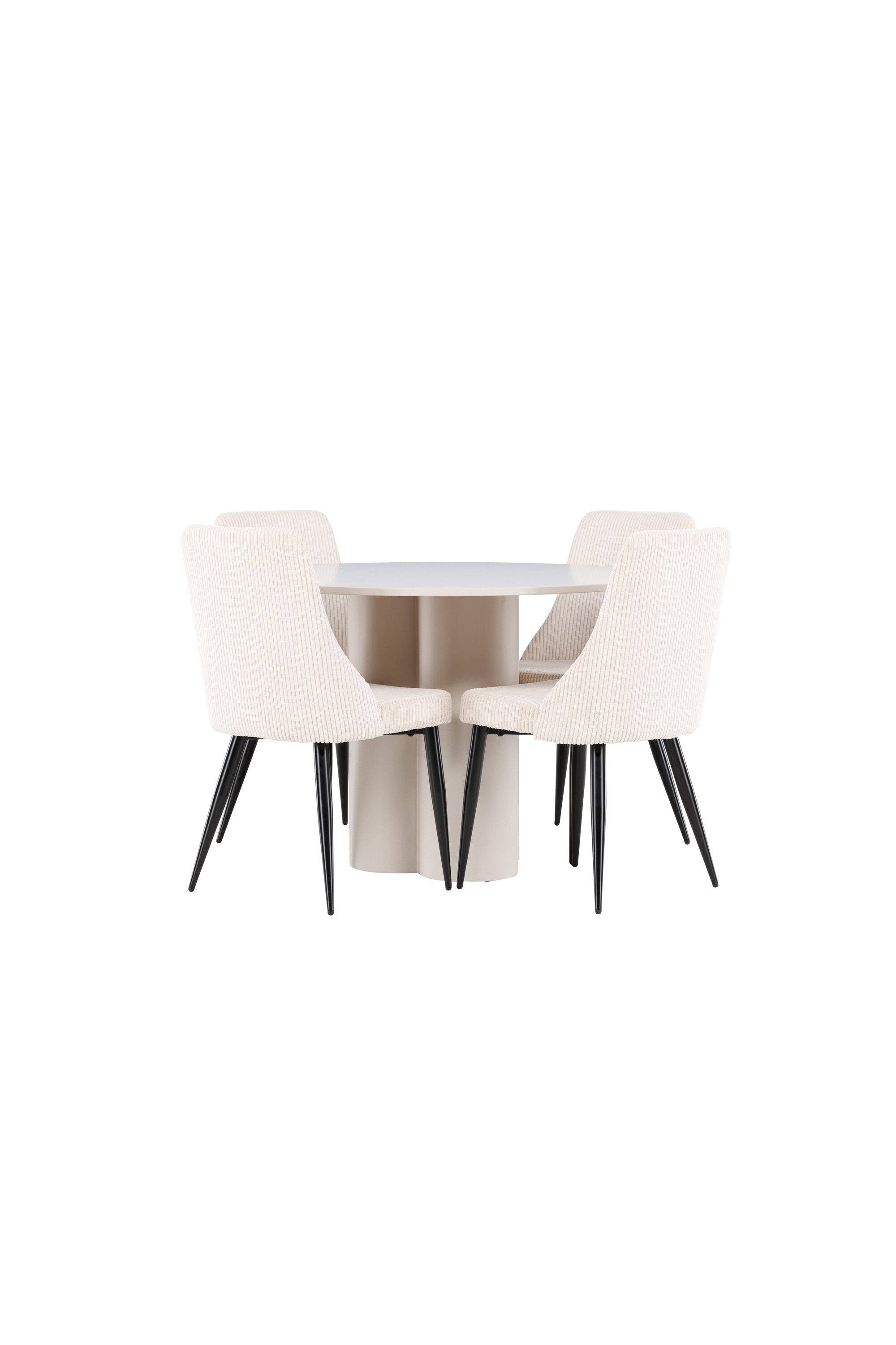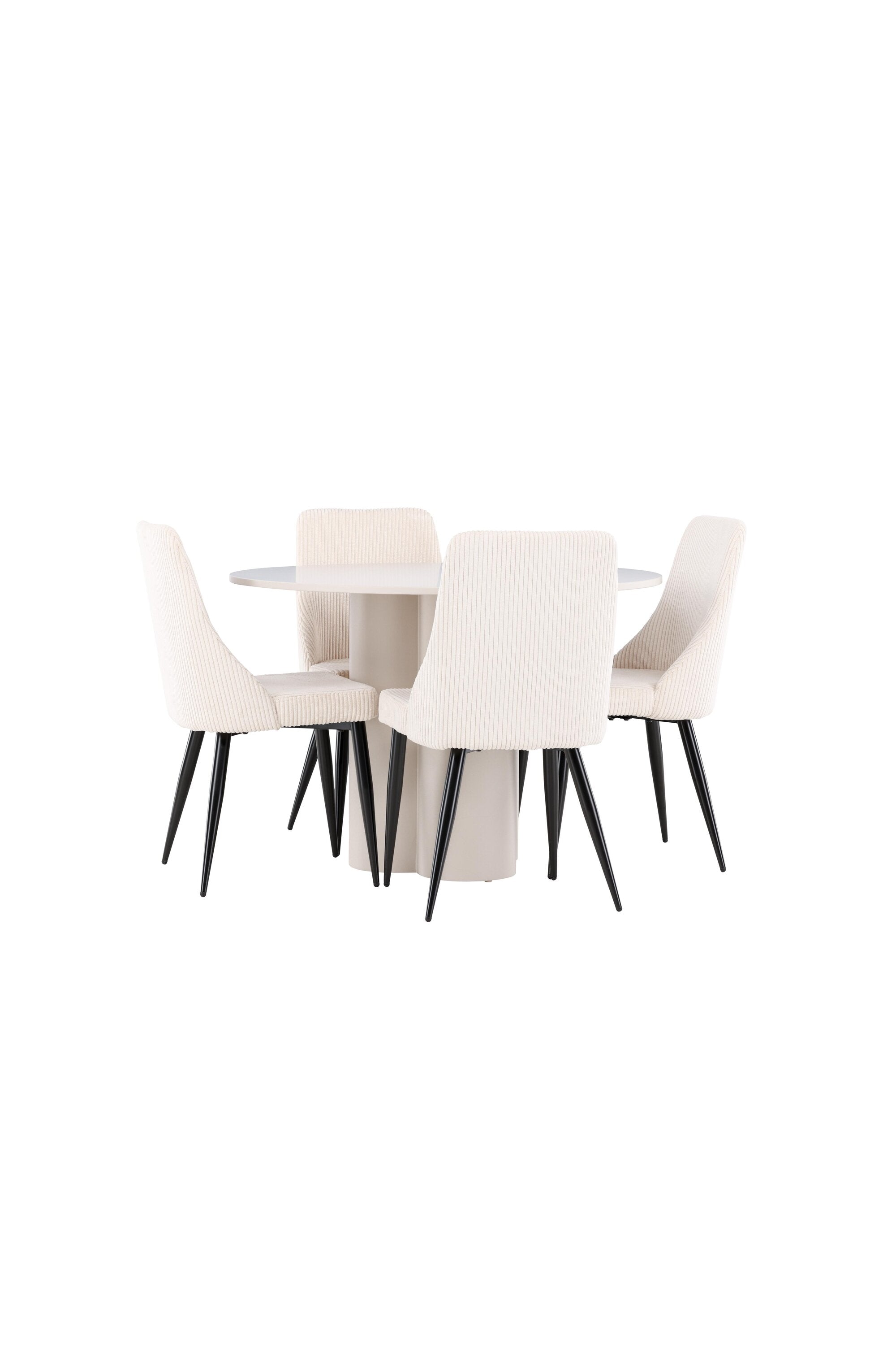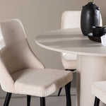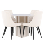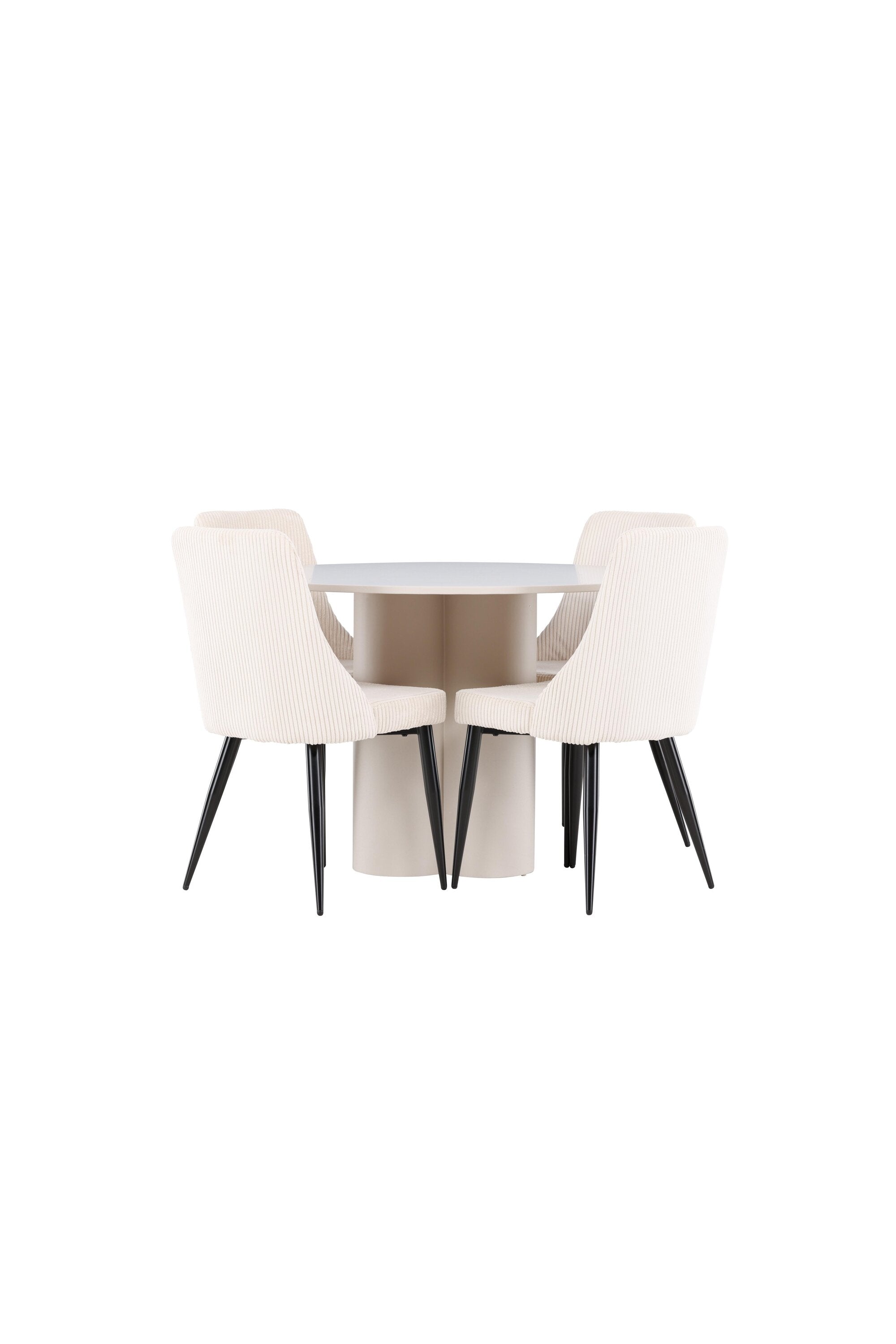 Vytvořte si elegantní a příjemný jídelní kout s naší stylovou jídelní sestavou, která kombinuje stůl Olivia se sofistikovanými židlemi Leone. Tato jídelní sestava, která je ideální jak pro každodenní večeři, tak pro slavnostní příležitosti, dodá vaší jídelně moderní a harmonickou atmosféru. Stůl Olivia vyrobený z MDF má světle béžovou barvu, která dodá vaší jídelně hřejivý a příjemný pocit. Stůl s průměrem 110 cm nabízí dostatek prostoru pro jídlo a rozhovory, přičemž jeho kulatý tvar vytváří vyvážené a společenské prostředí. Robustní konstrukce stolu zajišťuje dlouhodobé používání a stabilitu. Čtyři židle Leone skvěle doplňují stůl svými elegantními sedáky potaženými béžovým manšestrem. Tyto židle nabízejí pohodlí i styl, takže jsou ideální pro dlouhé a příjemné večeře s rodinou a přáteli. Jejich moderní design s vysokými opěradly a měkkými sedáky dodá vaší jídelně sofistikovaný a moderní nádech. Tato jídelní sestava je dokonalou kombinací estetiky a funkčnosti, díky čemuž je vynikající volbou pro ty, kteří hledají elegantní a pohodlný jídelní kout. Vylepšete svou jídelnu kombinací stolu Olivia a židlí Leone a vytvořte si místo, kde se budou sdílet vzpomínky a radost.