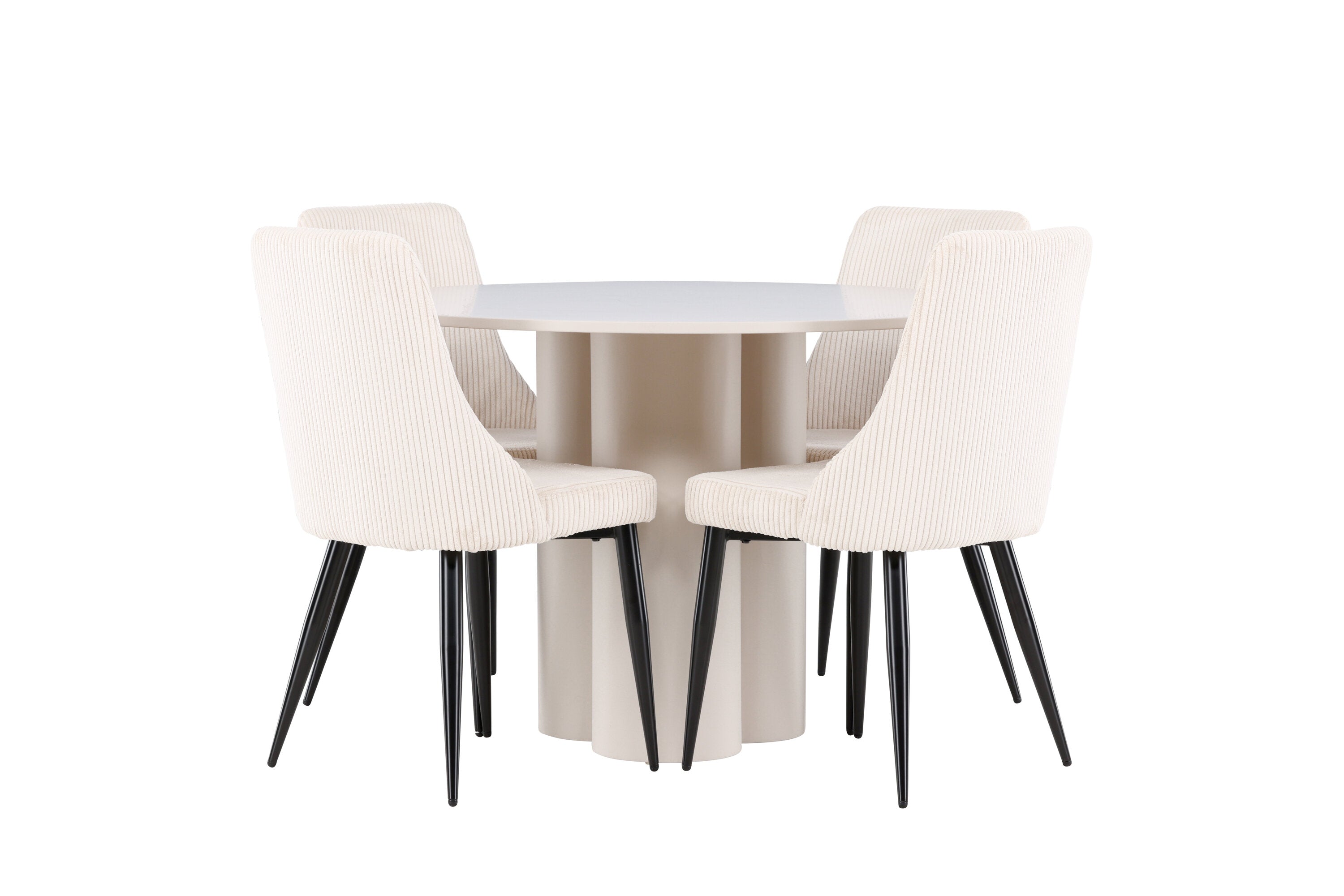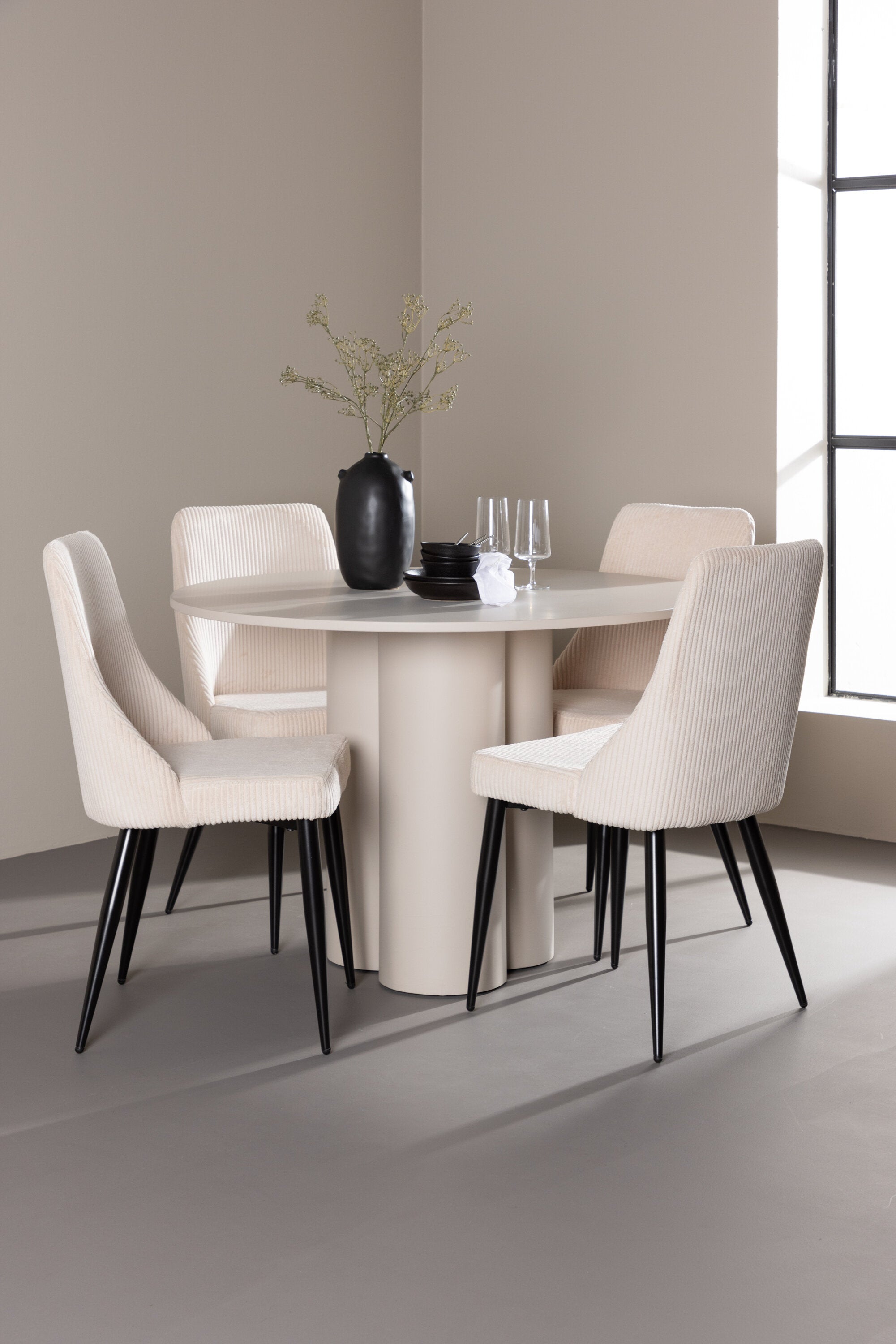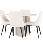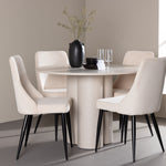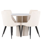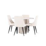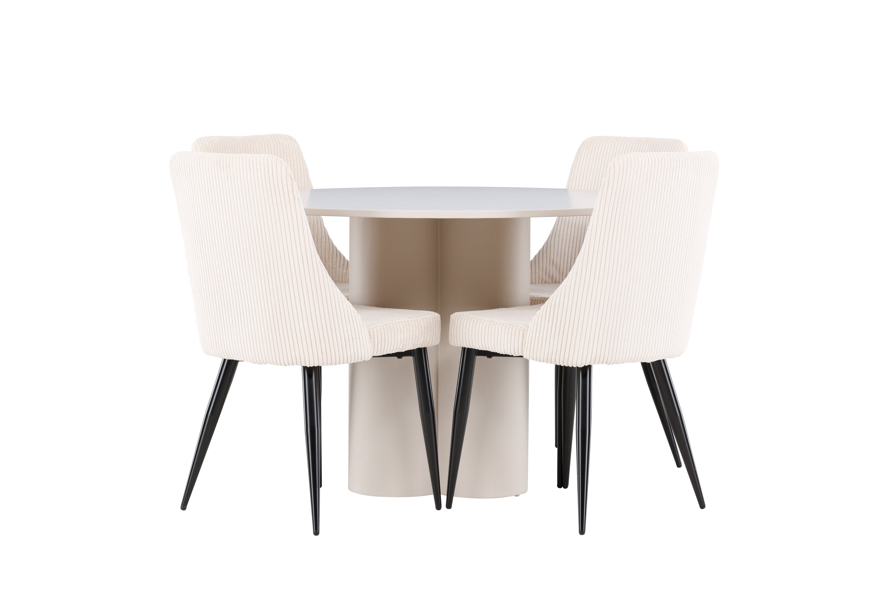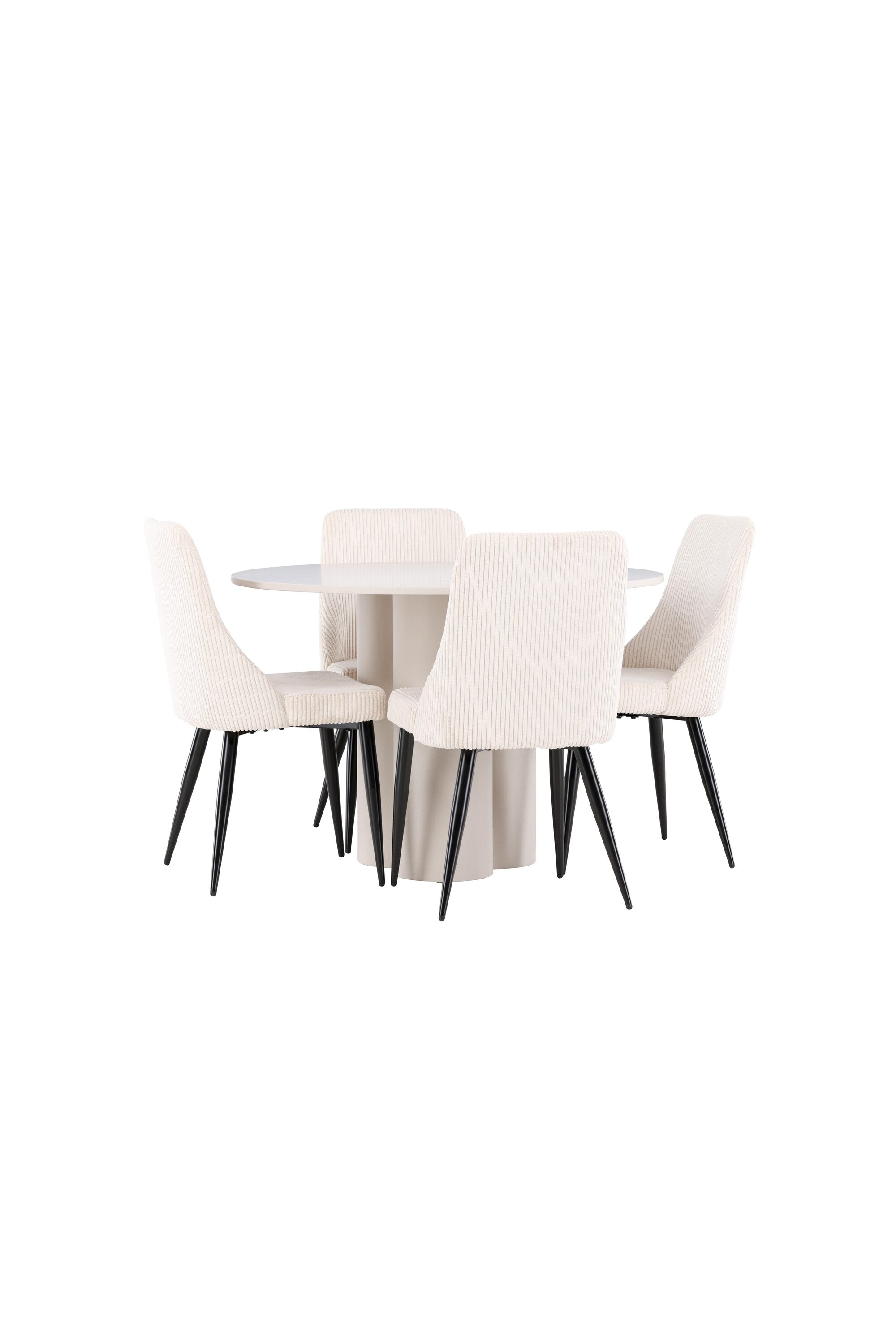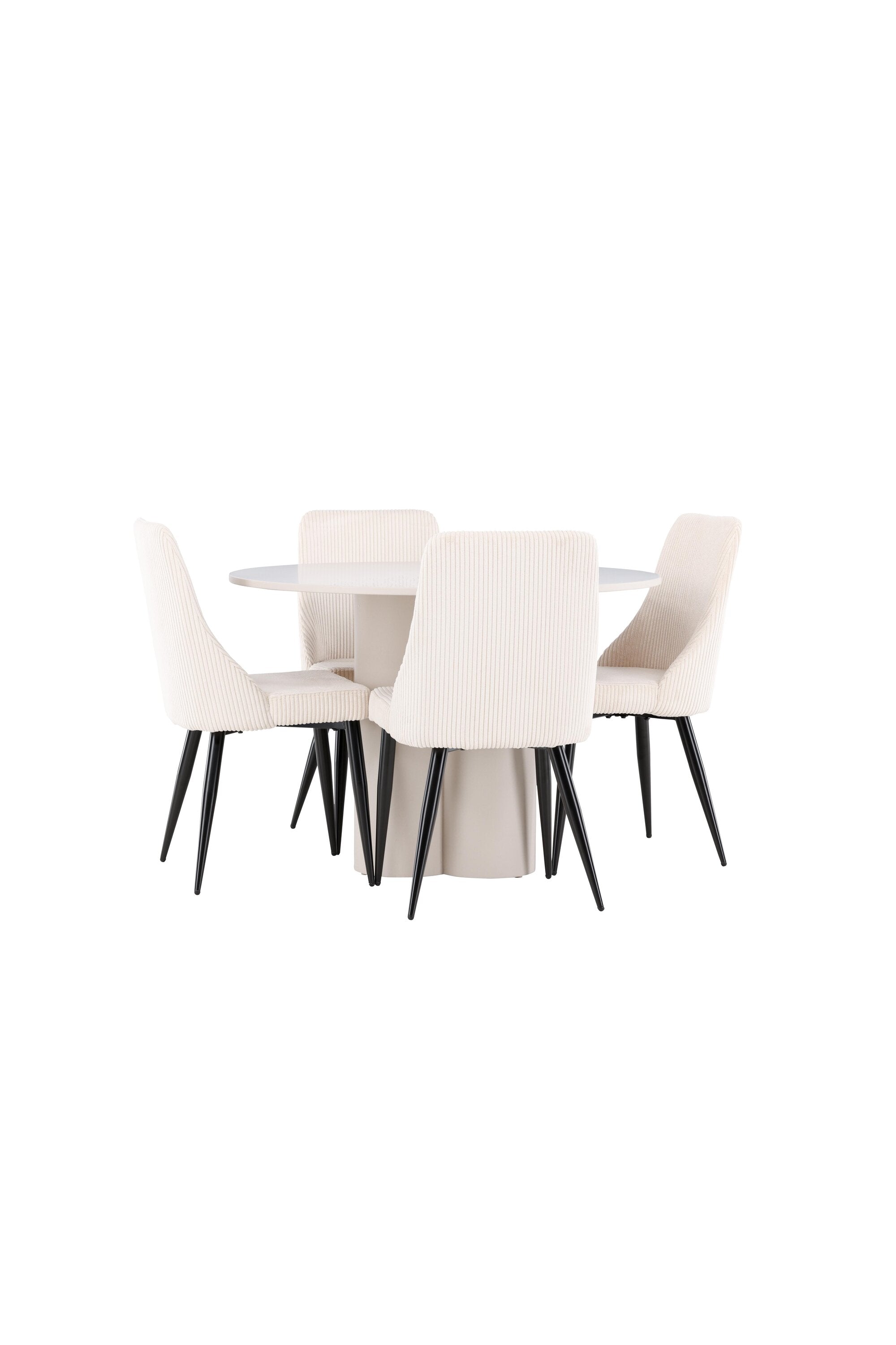 Vytvořte si elegantní a příjemný jídelní kout s naší stylovou jídelní sestavou, která kombinuje stůl Olivia se sofistikovanými židlemi Leone. Tato jídelní sestava, která je ideální jak pro každodenní večeři, tak pro slavnostní příležitosti, dodá vaší jídelně moderní a harmonickou atmosféru. Stůl Olivia vyrobený z MDF má světle béžovou barvu, která dodá vaší jídelně hřejivý a příjemný pocit. Stůl s průměrem 110 cm nabízí dostatek prostoru pro jídlo a rozhovory, přičemž jeho kulatý tvar vytváří vyvážené a společenské prostředí. Robustní konstrukce stolu zajišťuje dlouhodobé používání a stabilitu. Čtyři židle Leone skvěle doplňují stůl svými elegantními sedáky potaženými béžovým manšestrem. Tyto židle nabízejí pohodlí i styl, takže jsou ideální pro dlouhé a příjemné večeře s rodinou a přáteli. Jejich moderní design s vysokými opěradly a měkkými sedáky dodá vaší jídelně sofistikovaný a moderní nádech. Tato jídelní sestava je dokonalou kombinací estetiky a funkčnosti, díky čemuž je vynikající volbou pro ty, kteří hledají elegantní a pohodlný jídelní kout. Vylepšete svou jídelnu kombinací stolu Olivia a židlí Leone a vytvořte si místo, kde se budou sdílet vzpomínky a radost.