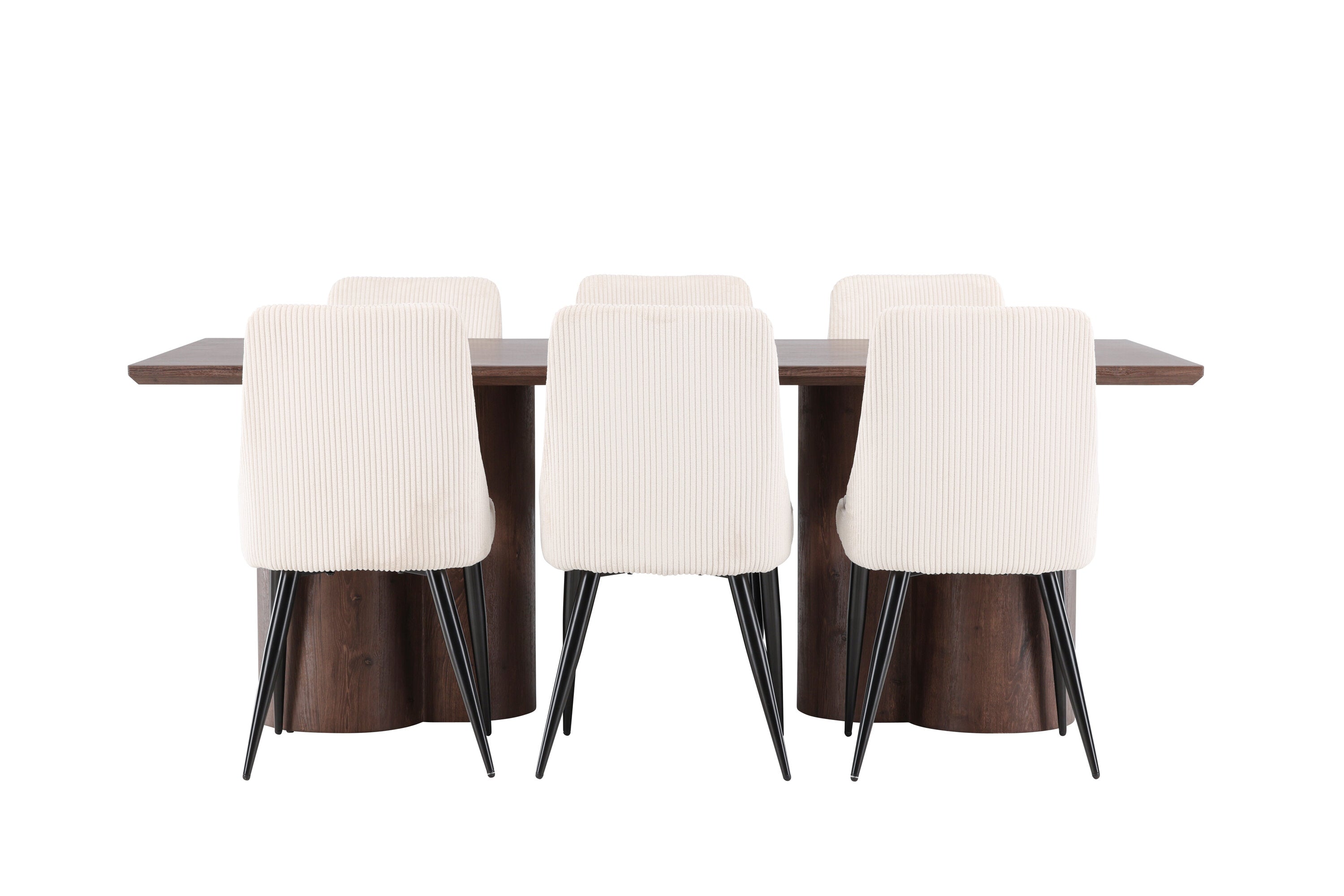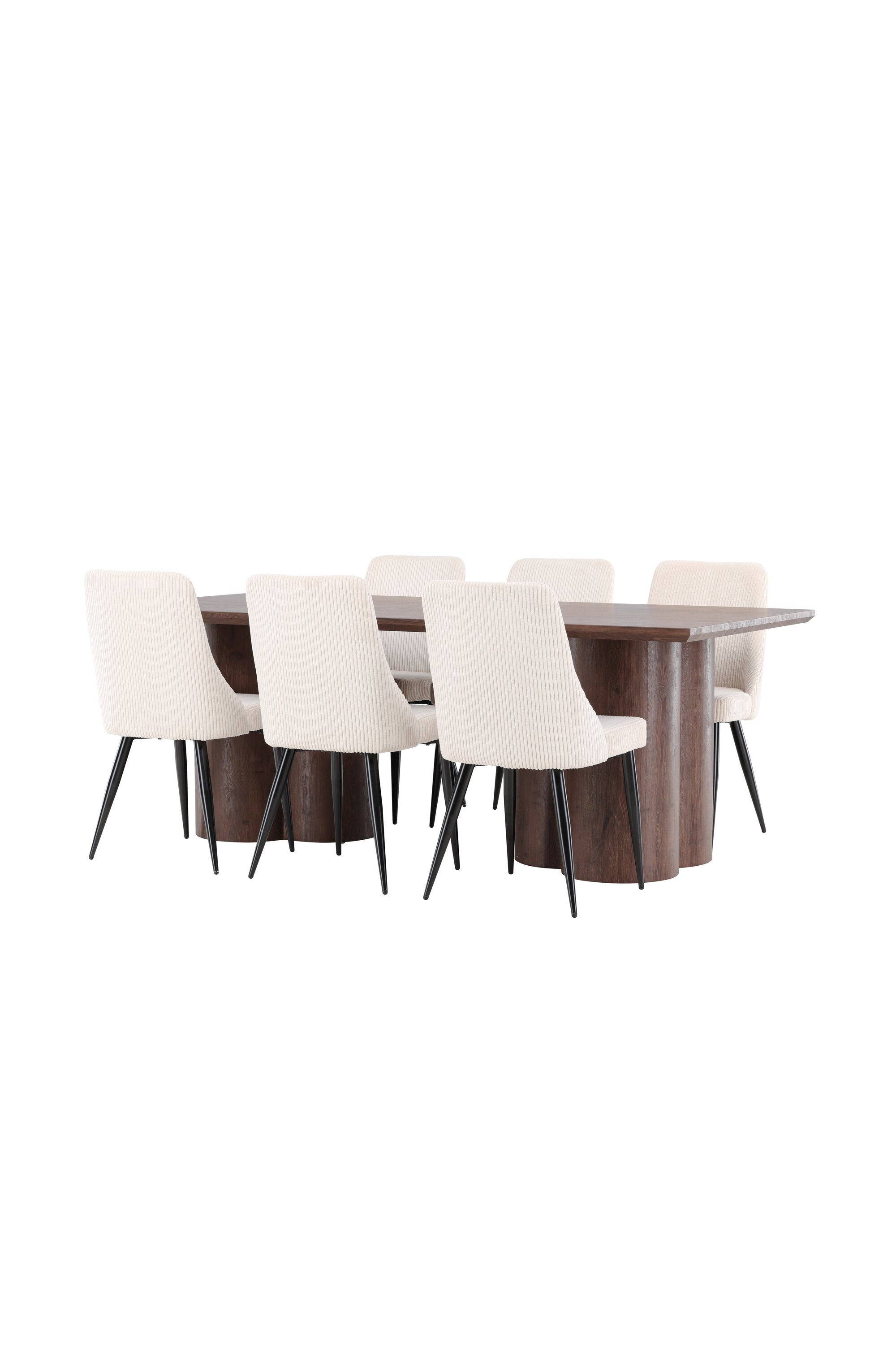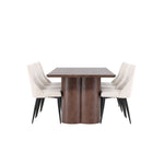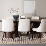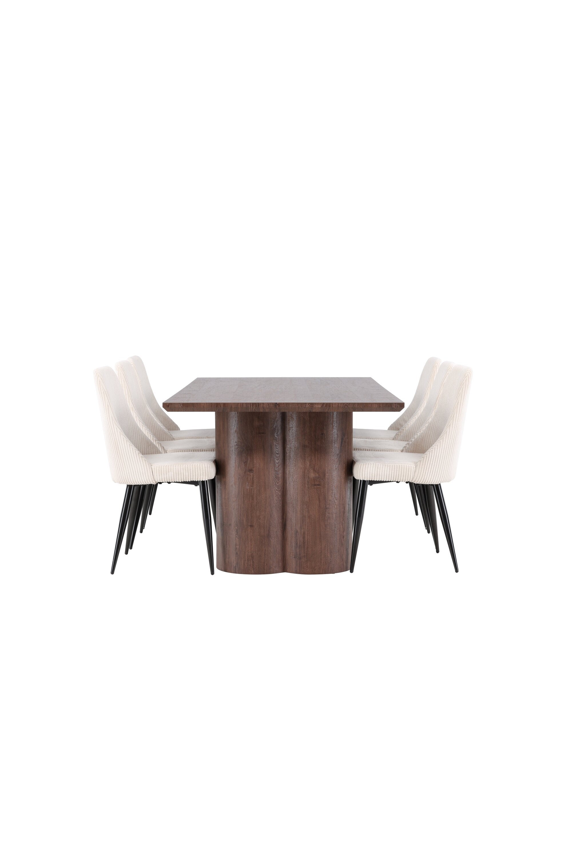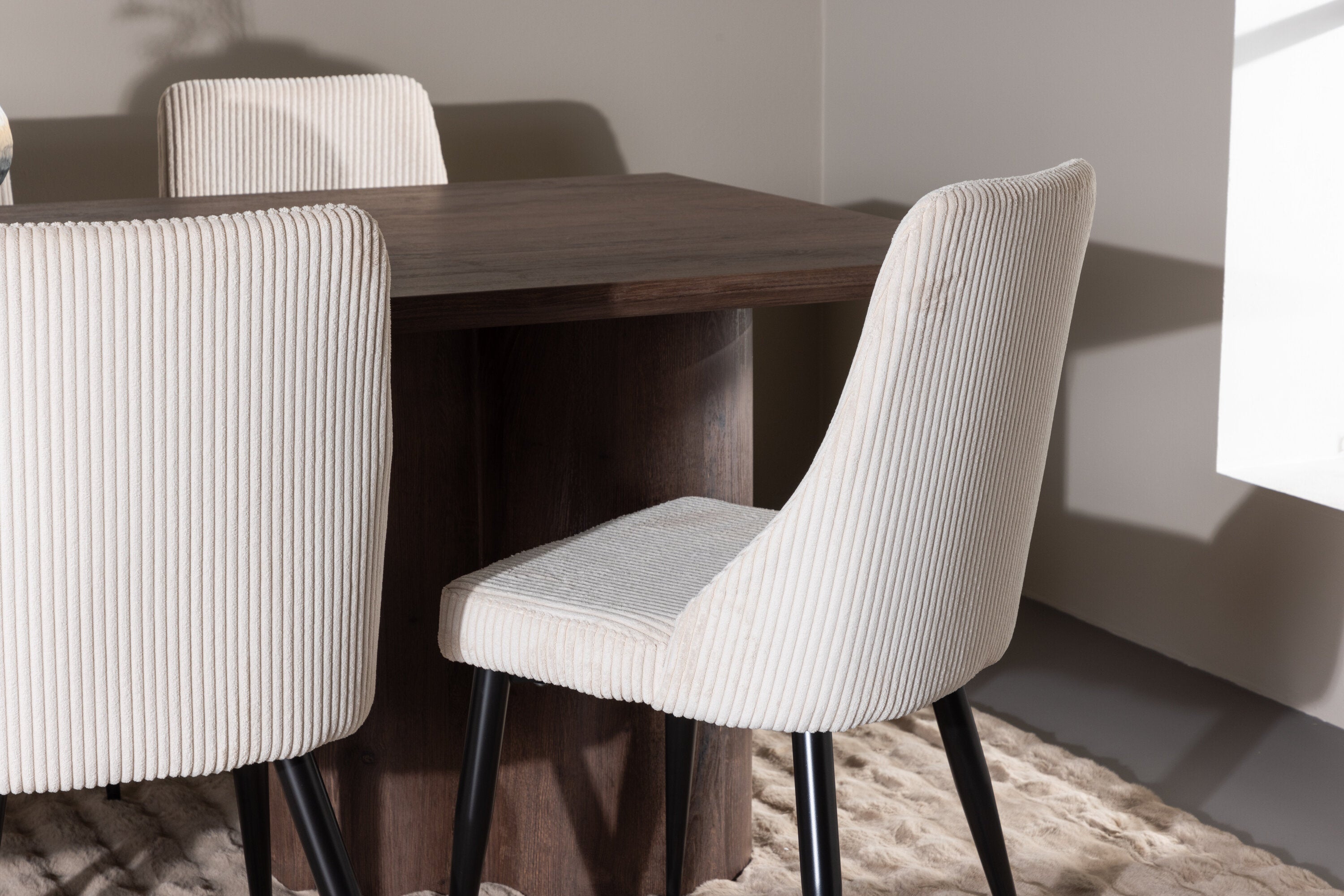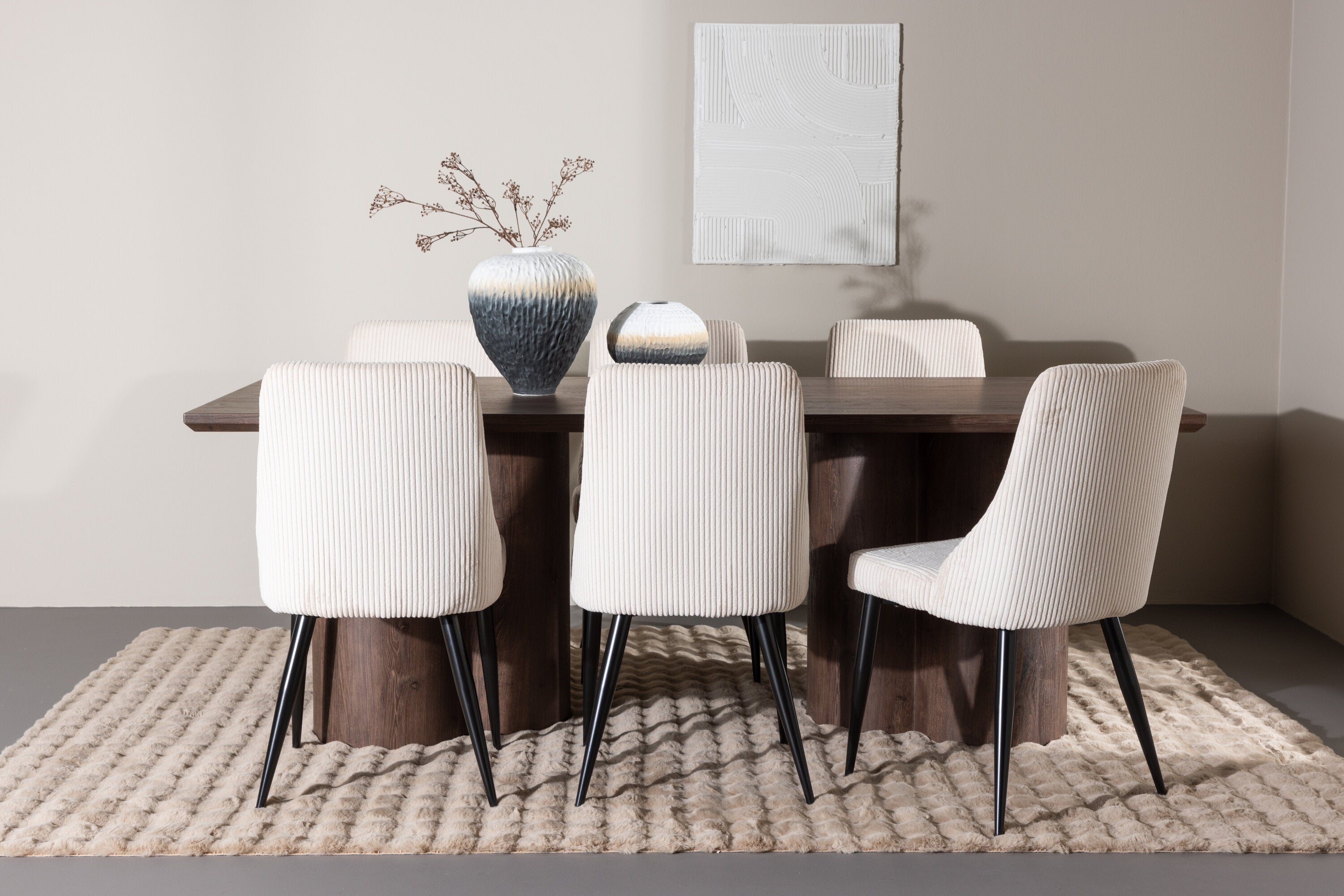 Jídelní židle Leone a jídelní stůl Olivia dohromady tvoří perfektní jídelní set, který elegantním způsobem spojuje styl a pohodlí. Židle má certifikaci FSC® (FSC®C177288), což znamená, že se skládá ze dřeva z odpovědného lesnictví, lesnictví, které bere ohled na lidi a životní prostředí. Leone je vyroben ze sametu s ocelovými nohami a nabízí dokonalou rovnováhu mezi funkcí a estetikou. Jemná béžová barva působí hřejivě a příjemně a díky jednoduchému designu je židle všestranná a vhodná do různých stylů interiéru. Leone usnadňuje vytvoření jednotné a harmonické atmosféry kolem vašeho jídelního prostoru, ať už pro každodenní jídlo nebo speciální příležitosti. Jídelní stůl Olivia s velkorysými rozměry 100x210 cm nabízí dostatek prostoru pro setkávání blízkých u večeří a společenských setkání. Olivia, vyrobená z MDF materiálu a s povrchem v barvě mocha, dodá vašemu domovu teplou a příjemnou atmosféru. Jeho neutrální design umožňuje, aby dobře zapadl do různých stylů interiéru a zároveň vytvořil klidný a přívětivý pocit. Jídelní stůl Olivia je víc než jen kus nábytku, je to místo, kde vznikají vzpomínky s přáteli a rodinou. Jídelní židle Leone a jídelní stůl Olivia společně tvoří elegantní a funkční jídelní set, který bude srdcem vašeho domova, kde vzkvétají nezapomenutelné okamžiky a komunita.