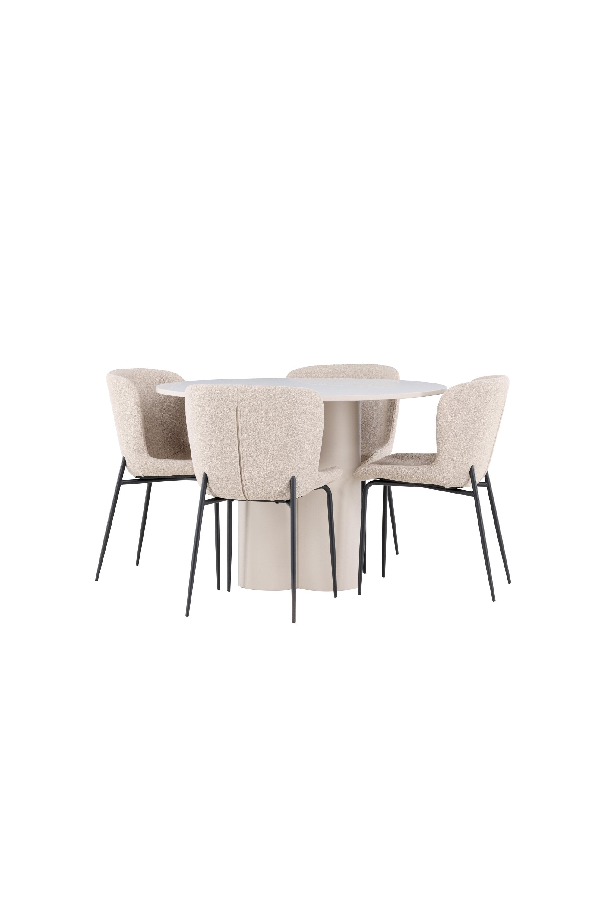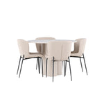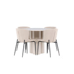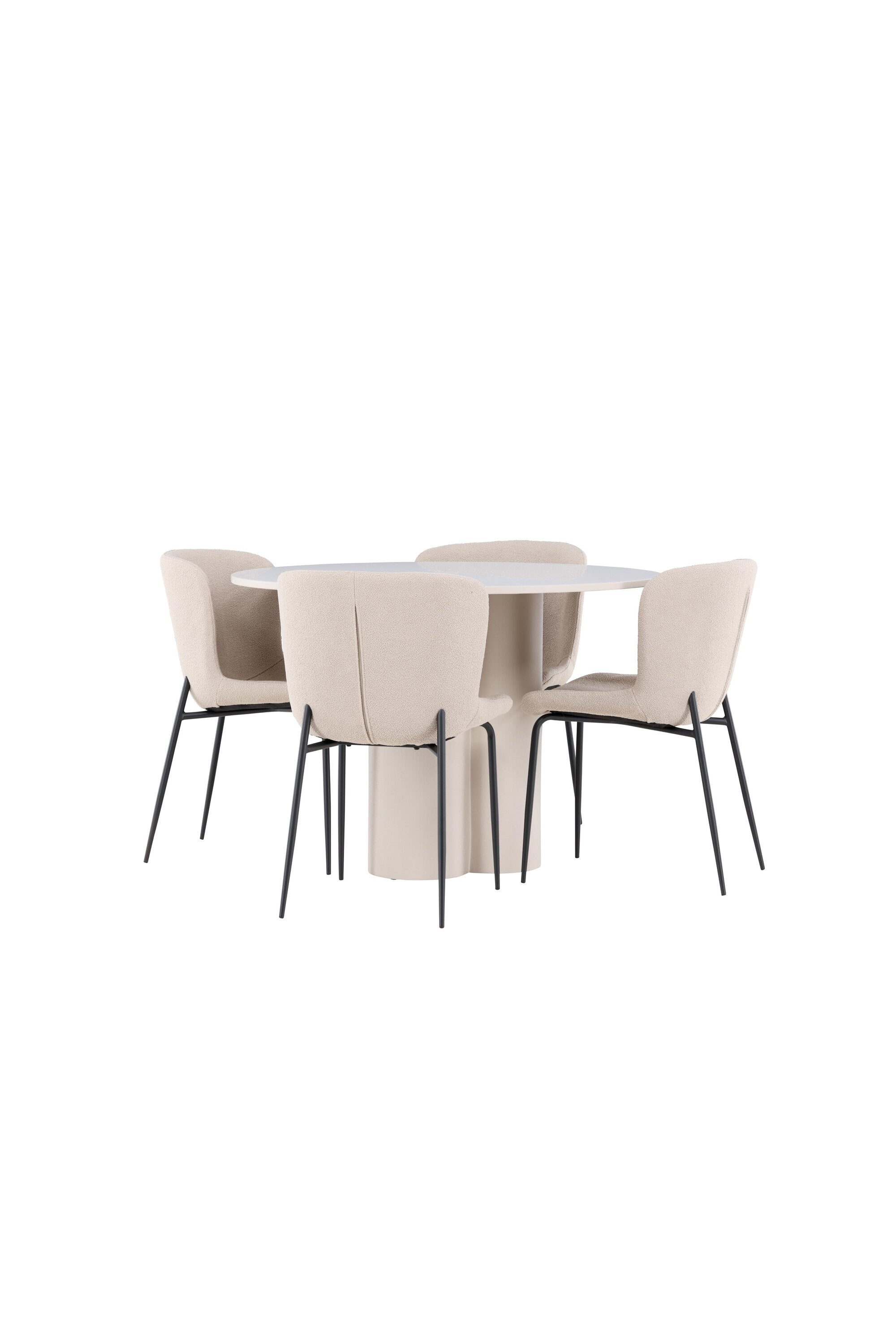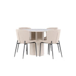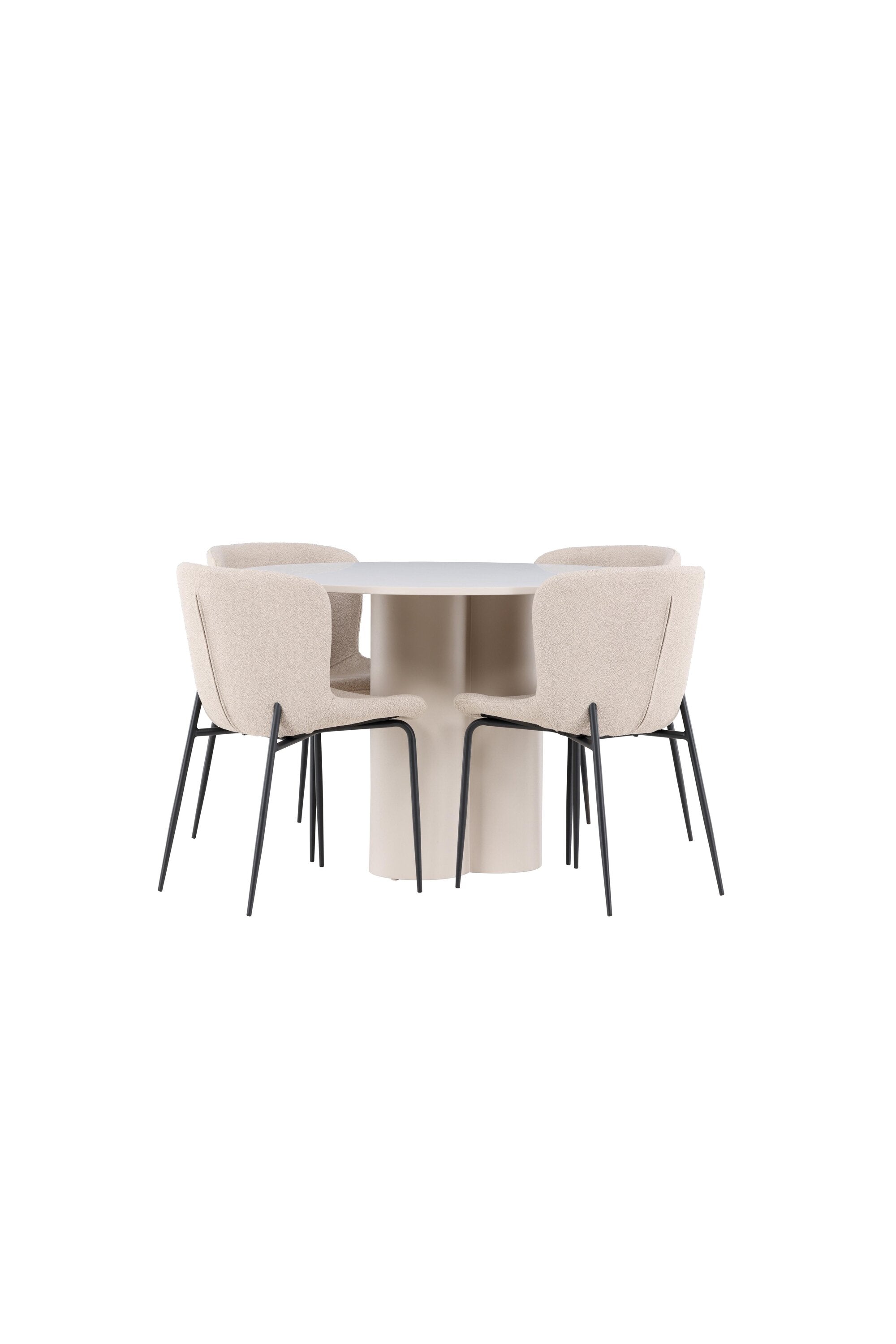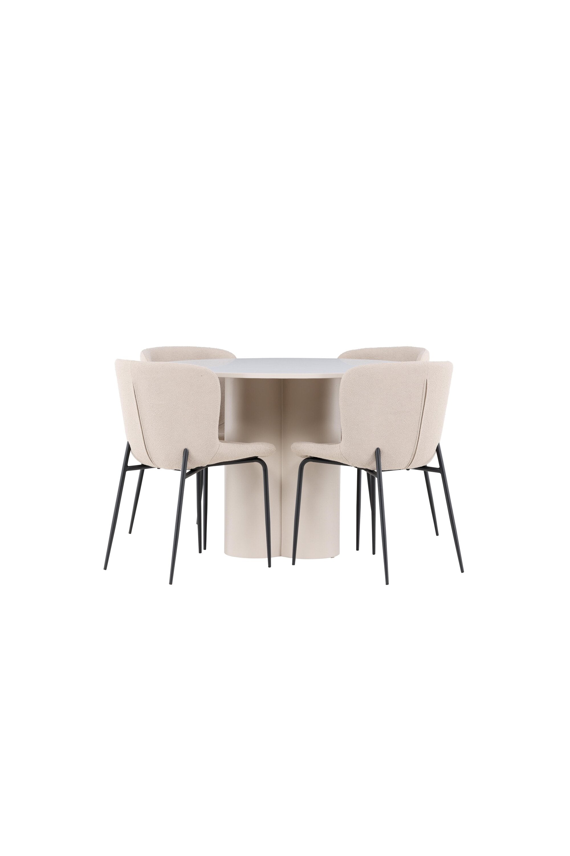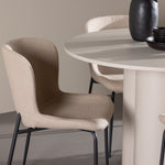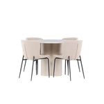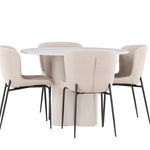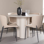 Vytvořte si stylový a příjemný jídelní kout s naší elegantní jídelní sadou, která kombinuje stůl Olivia s pohodlnými židlemi Modesto. Tato jídelní souprava je ideální pro každodenní stravování i slavnostní příležitosti a dodá vaší jídelně moderní a harmonickou atmosféru. Stůl Olivia vyrobený z MDF má světle béžovou barvu, která dodá vaší jídelně hřejivý a příjemný pocit. Stůl s průměrem 110 cm nabízí dostatek prostoru pro jídlo a rozhovory, přičemž jeho kulatý tvar vytváří vyvážené a společenské prostředí. Robustní konstrukce stolu zajišťuje dlouhodobé používání a stabilitu. Čtyři židle Modesto skvěle doplňují stůl svými elegantními sedadly čalouněnými béžovým buklem a elegantními černými nohami. Tyto židle nabízejí pohodlí i styl, takže jsou ideální pro dlouhé a příjemné večeře s rodinou a přáteli. Jejich moderní design s vysokými opěradly a měkkými sedáky dodá vaší jídelně sofistikovaný a moderní nádech. Tato jídelní souprava je dokonalou kombinací estetiky a funkčnosti, takže je vynikající volbou pro ty, kteří hledají elegantní a pohodlný jídelní kout. Vylepšete svou jídelnu kombinací stolu Olivia a židlí Modesto a vytvořte si místo, kde se budou sdílet vzpomínky a radost.
