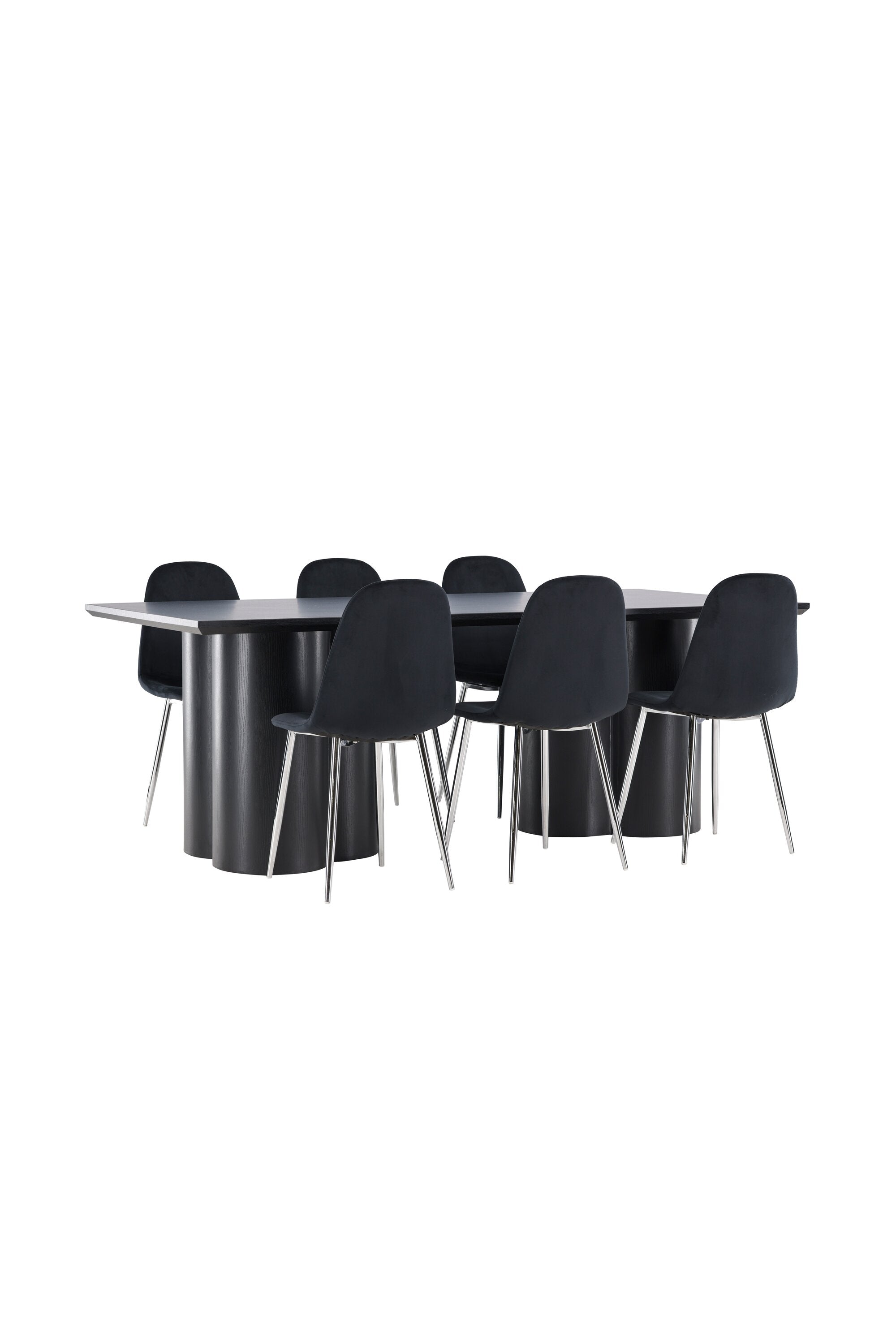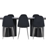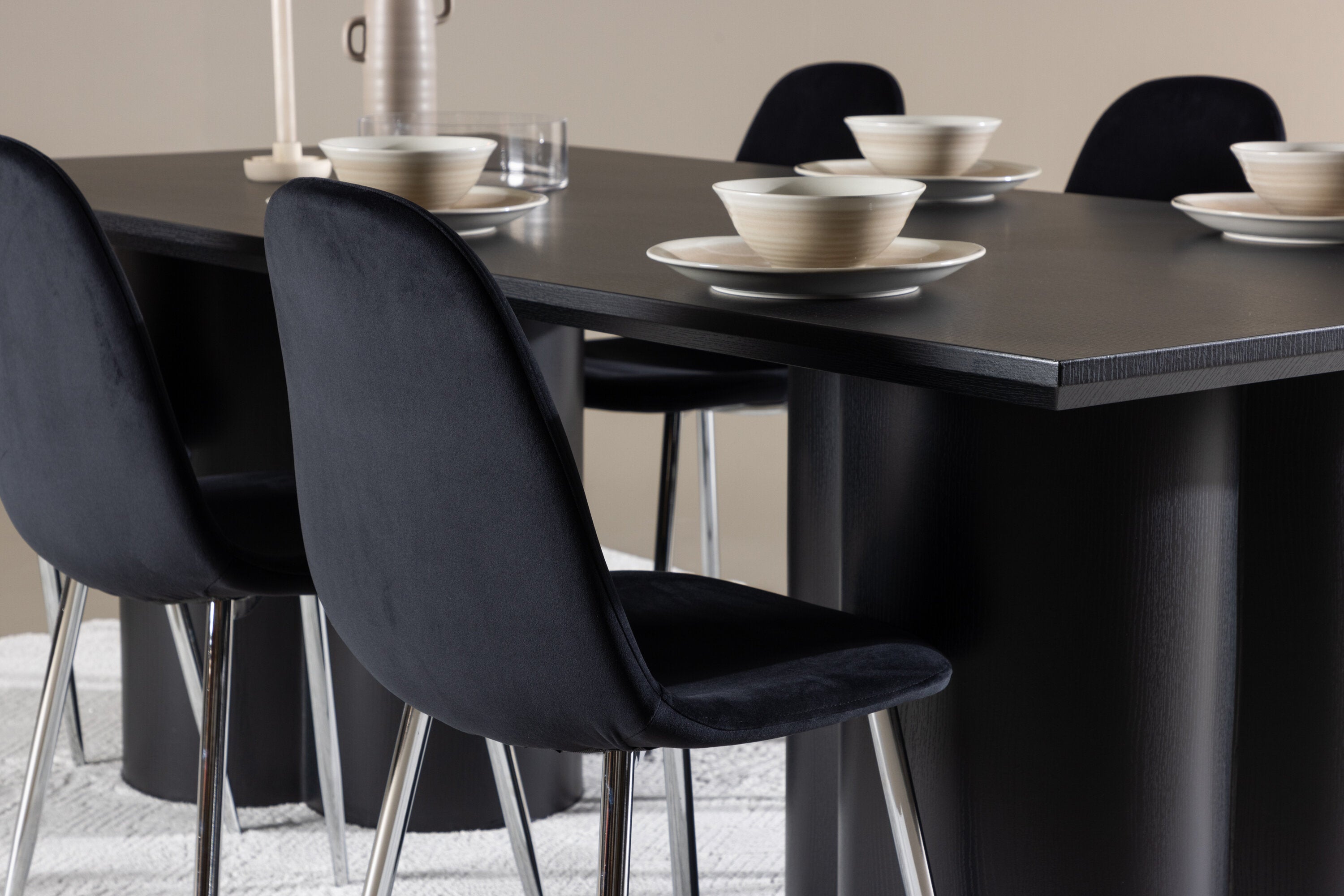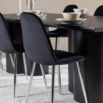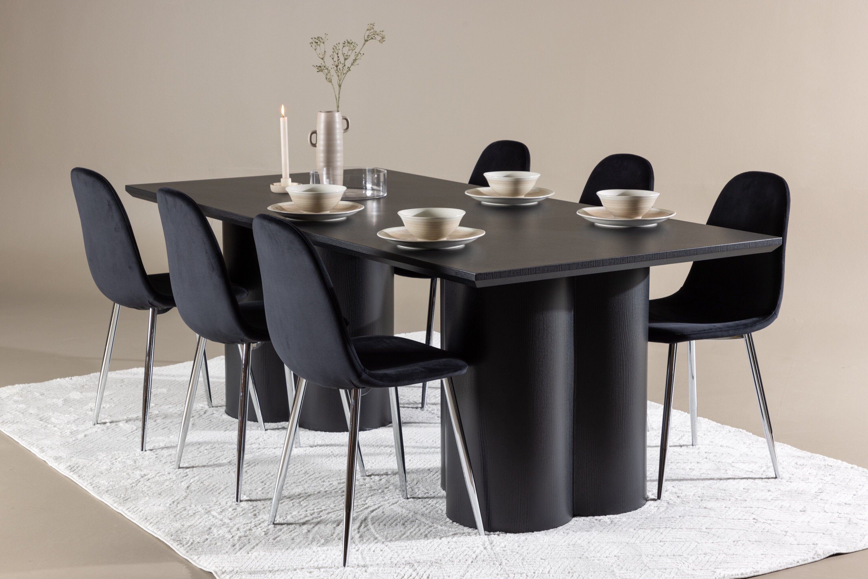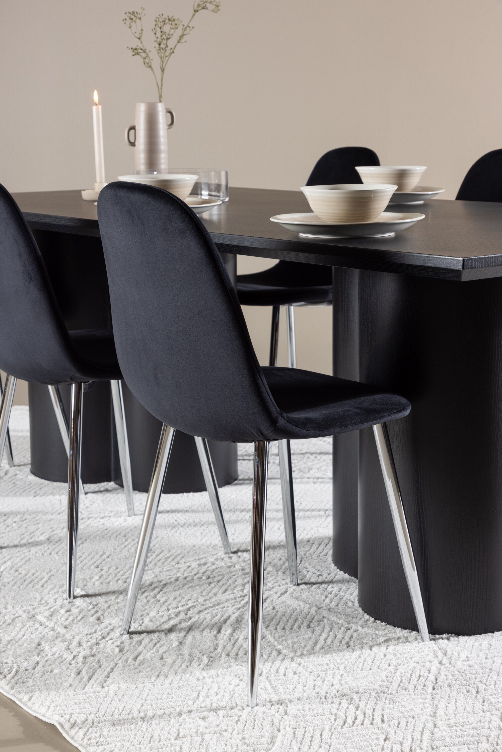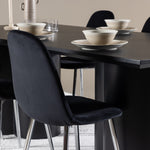 Objevte perfektní jídelní set s jídelní židlí Polar a jídelním stolem Olivia – kombinaci, která vyzařuje eleganci i funkčnost pro váš domov. Polar je elegantní jídelní židle v luxusním duchu s celočalouněným designem, který má chromované kovové nohy, mírně zaoblené opěradlo a elegantní sedák z černé sametové látky s měkkým polstrováním pro extra pohodlí. Zde nemusíte dělat kompromisy mezi pohodlím a designem. Spojte Polar s jídelním stolem Olivia pro kompletní jídelní set pro srdce vašeho domova! Jídelní stůl Olivia se svými velkorysými rozměry 210x100 cm je perfektní pro vítání přátel a rodiny při společném jídle a posezení. Stůl v sofistikovaném černém odstínu vyzařuje eleganci a modernost a jeho robustní konstrukce zajišťuje dlouhodobou stabilitu. Dodejte své jídelně pocit luxusu a modernosti s jídelní židlí Polar a jídelním stolem Olivia. Tento jídelní set vytváří harmonickou atmosféru a zanechává trvalý dojem. Tato kombinace je ideální jak pro každodenní večeři, tak pro slavnostní příležitosti, nabízí rovnováhu mezi nadčasovým designem a moderními detaily, díky čemuž je perfektní volbou pro všechna vaše společenská setkání.
