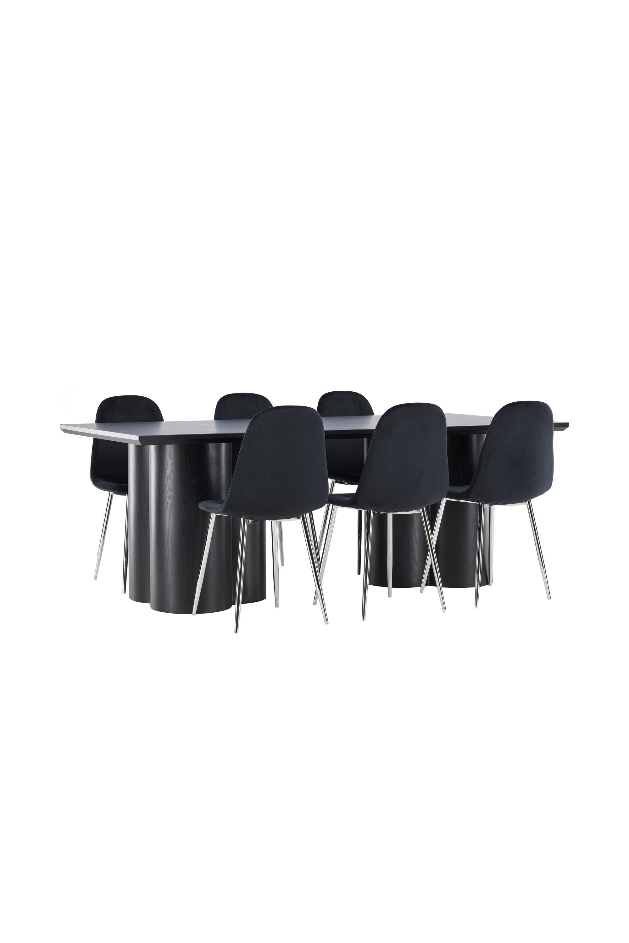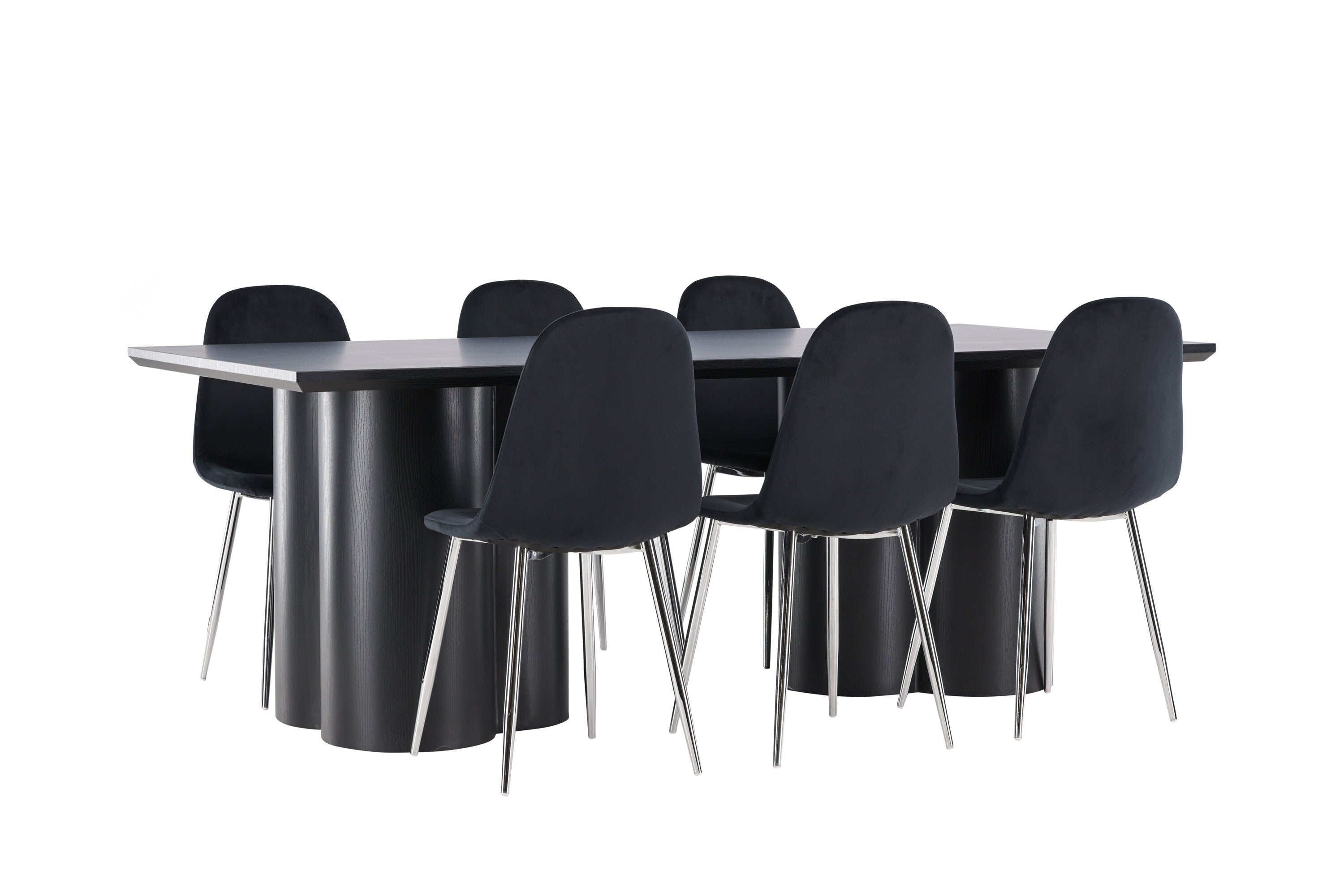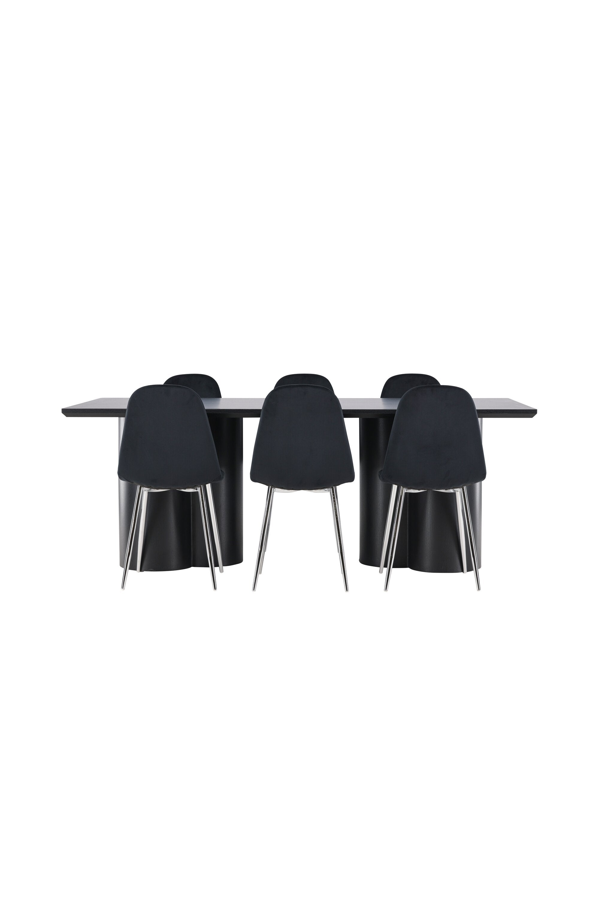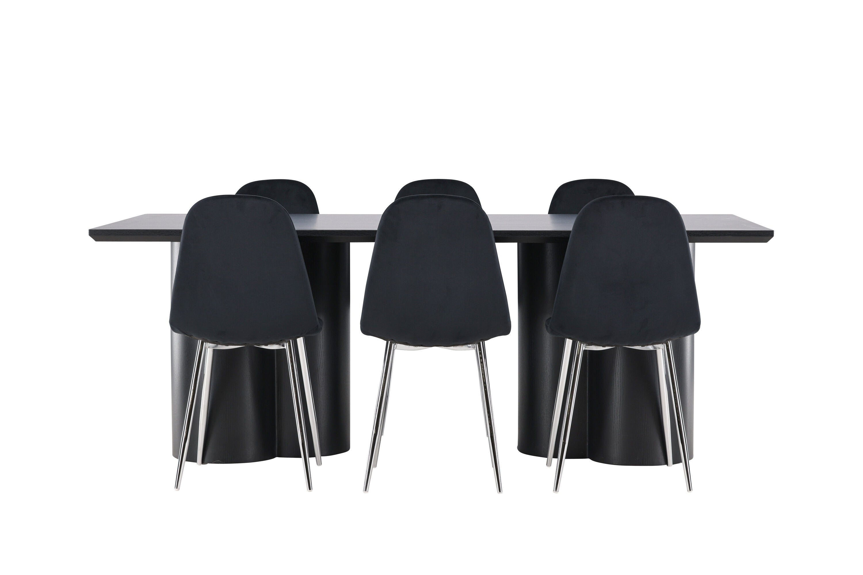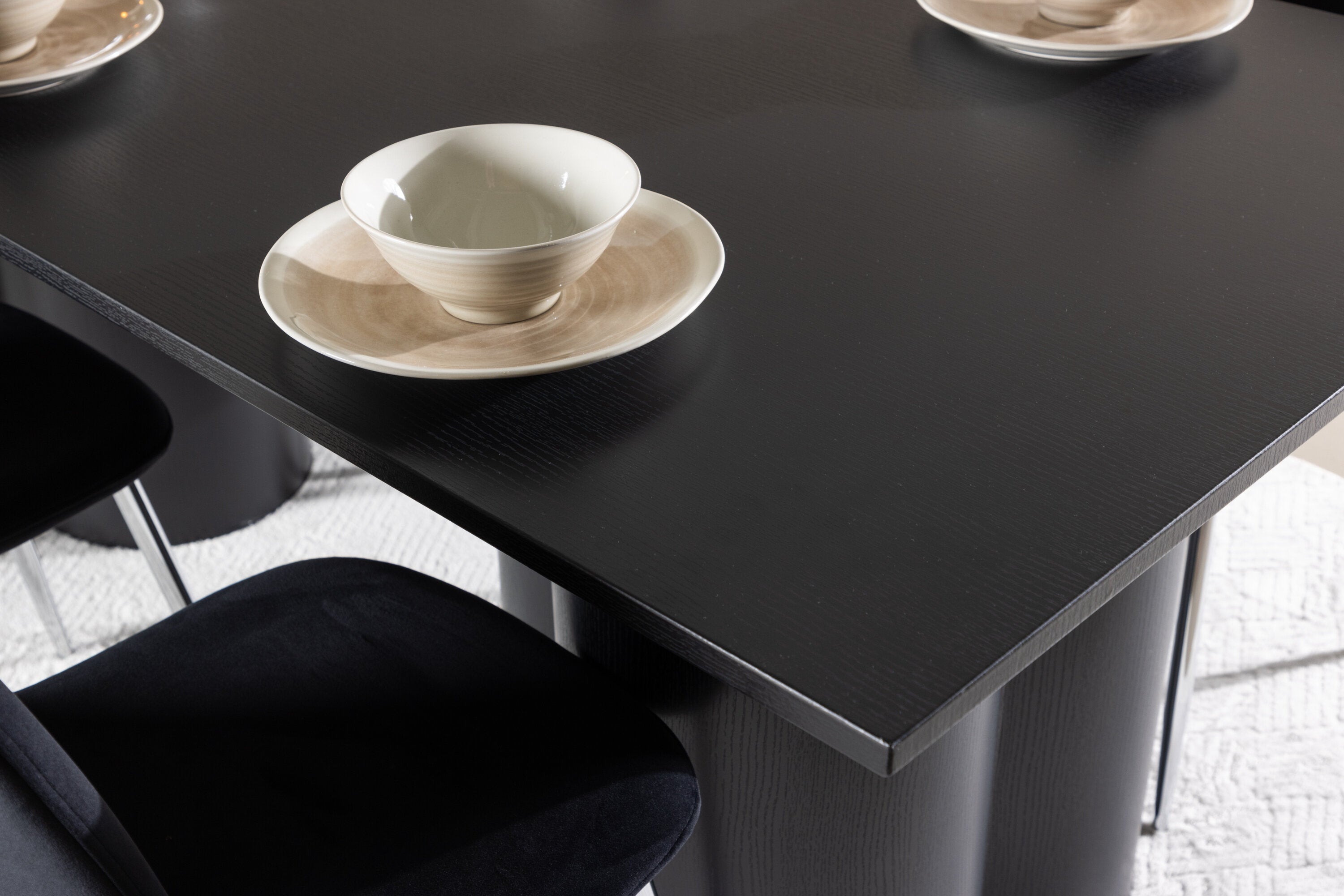 Objevte perfektní jídelní set s jídelní židlí Polar a jídelním stolem Olivia – kombinaci, která vyzařuje eleganci i funkčnost pro váš domov. Polar je elegantní jídelní židle v luxusním duchu s celočalouněným designem, který má chromované kovové nohy, mírně zaoblené opěradlo a elegantní sedák z černé sametové látky s měkkým polstrováním pro extra pohodlí. Zde nemusíte dělat kompromisy mezi pohodlím a designem. Spojte Polar s jídelním stolem Olivia pro kompletní jídelní set pro srdce vašeho domova! Jídelní stůl Olivia se svými velkorysými rozměry 210x100 cm je perfektní pro vítání přátel a rodiny při společném jídle a posezení. Stůl v sofistikovaném černém odstínu vyzařuje eleganci a modernost a jeho robustní konstrukce zajišťuje dlouhodobou stabilitu. Dodejte své jídelně pocit luxusu a modernosti s jídelní židlí Polar a jídelním stolem Olivia. Tento jídelní set vytváří harmonickou atmosféru a zanechává trvalý dojem. Tato kombinace je ideální jak pro každodenní večeři, tak pro slavnostní příležitosti, nabízí rovnováhu mezi nadčasovým designem a moderními detaily, díky čemuž je perfektní volbou pro všechna vaše společenská setkání.