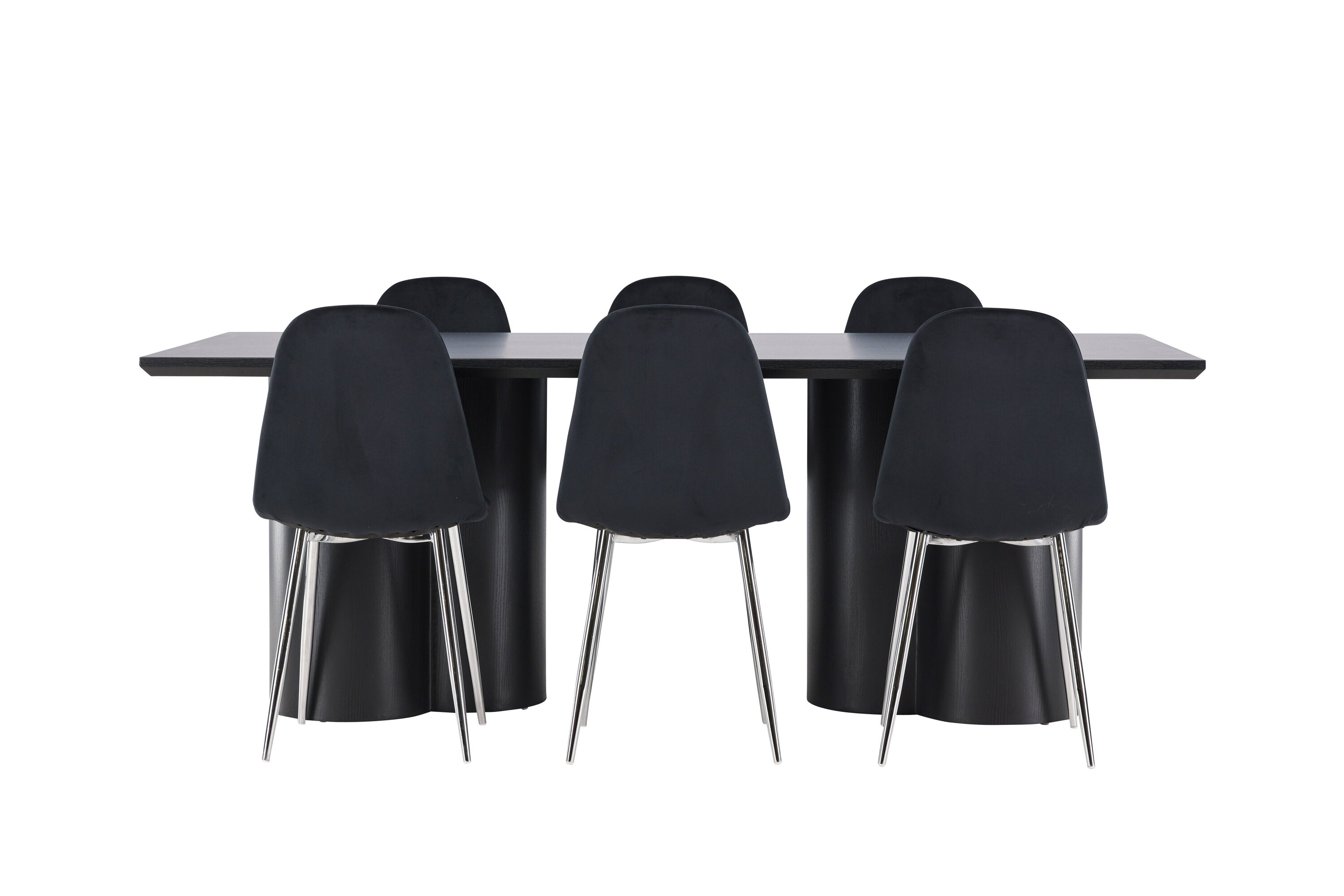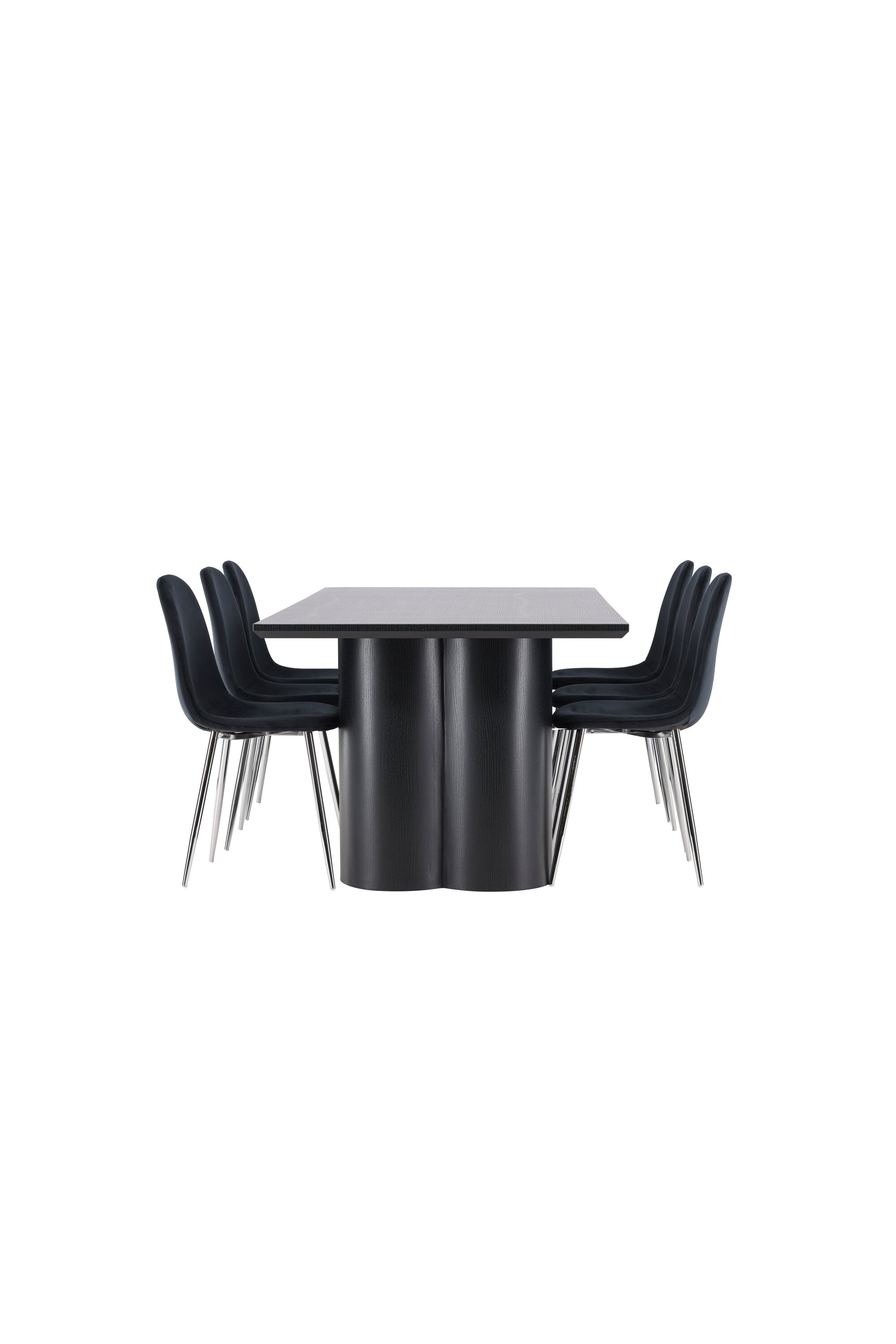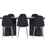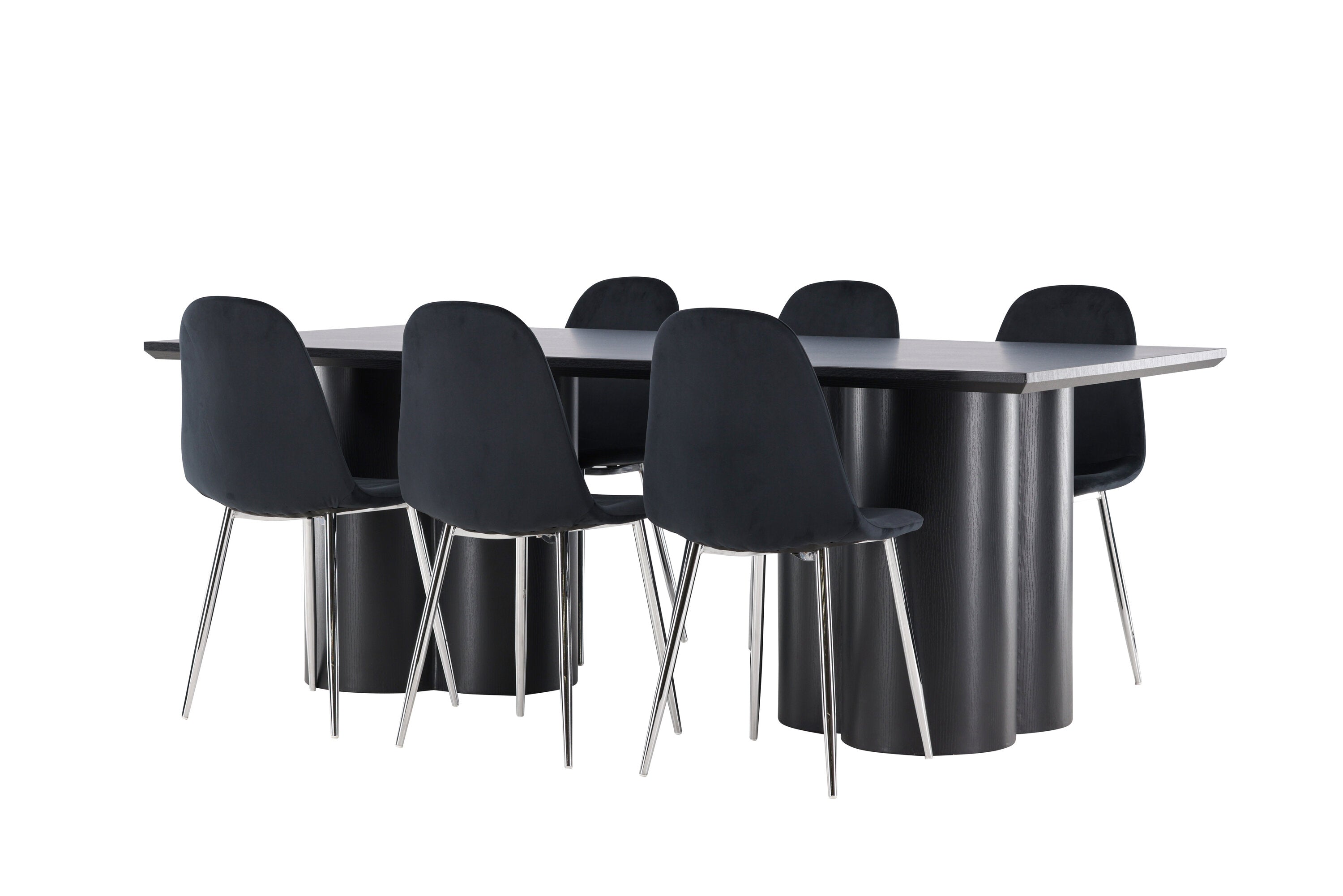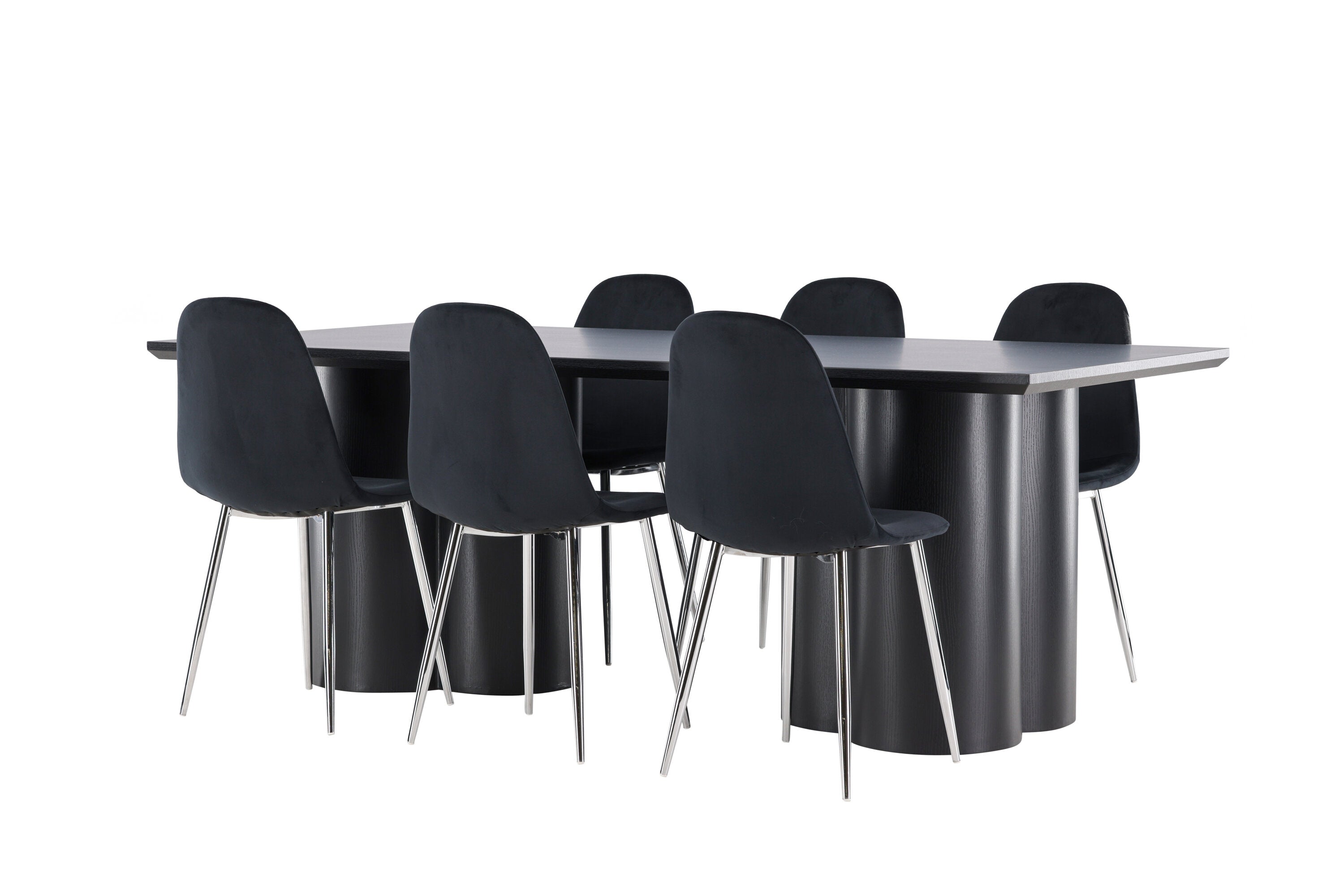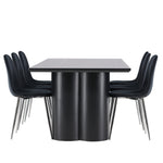 Objevte perfektní jídelní set s jídelní židlí Polar a jídelním stolem Olivia – kombinaci, která vyzařuje eleganci i funkčnost pro váš domov. Polar je elegantní jídelní židle v luxusním duchu s celočalouněným designem, který má chromované kovové nohy, mírně zaoblené opěradlo a elegantní sedák z černé sametové látky s měkkým polstrováním pro extra pohodlí. Zde nemusíte dělat kompromisy mezi pohodlím a designem. Spojte Polar s jídelním stolem Olivia pro kompletní jídelní set pro srdce vašeho domova! Jídelní stůl Olivia se svými velkorysými rozměry 210x100 cm je perfektní pro vítání přátel a rodiny při společném jídle a posezení. Stůl v sofistikovaném černém odstínu vyzařuje eleganci a modernost a jeho robustní konstrukce zajišťuje dlouhodobou stabilitu. Dodejte své jídelně pocit luxusu a modernosti s jídelní židlí Polar a jídelním stolem Olivia. Tento jídelní set vytváří harmonickou atmosféru a zanechává trvalý dojem. Tato kombinace je ideální jak pro každodenní večeři, tak pro slavnostní příležitosti, nabízí rovnováhu mezi nadčasovým designem a moderními detaily, díky čemuž je perfektní volbou pro všechna vaše společenská setkání.