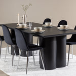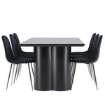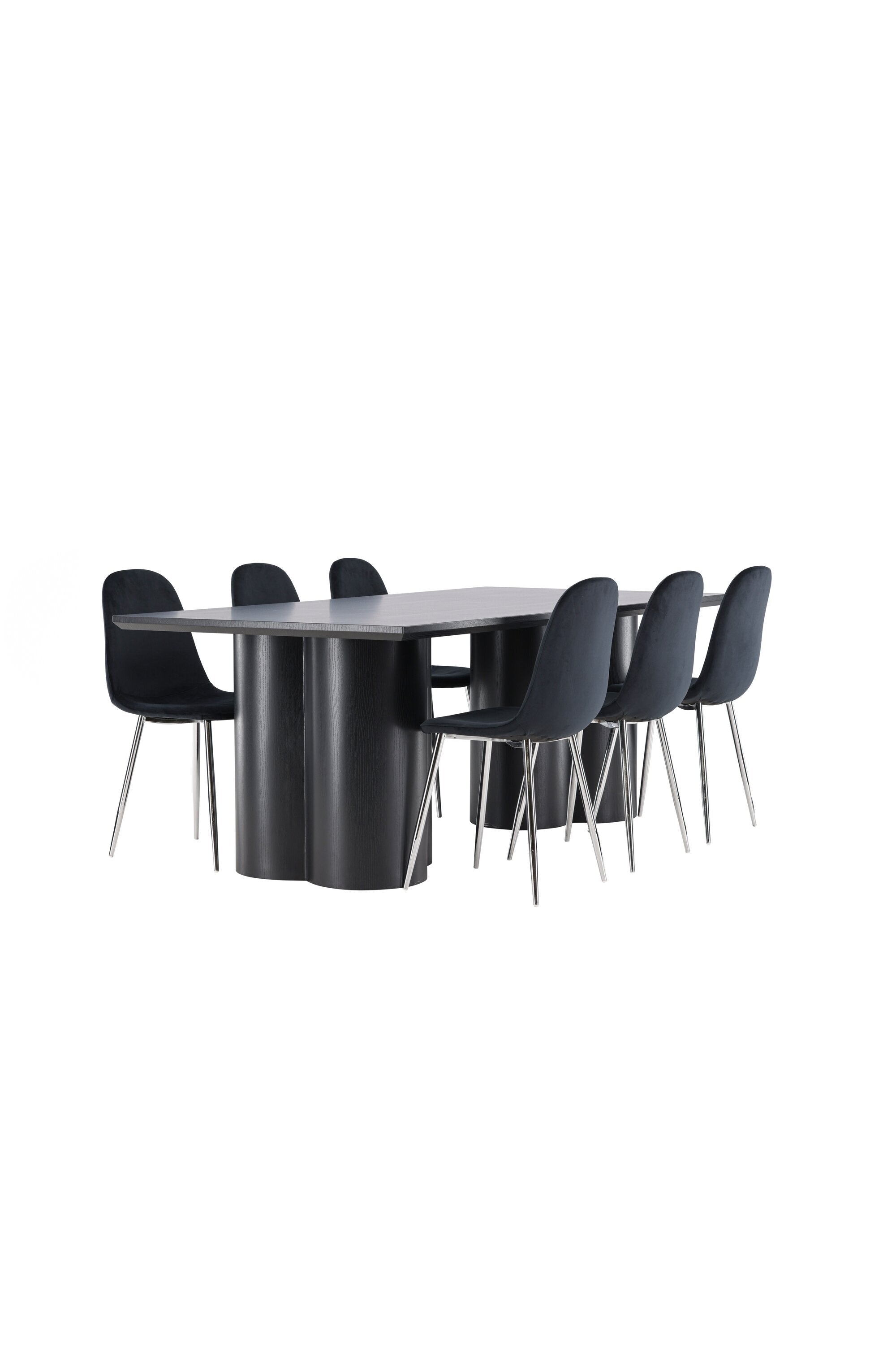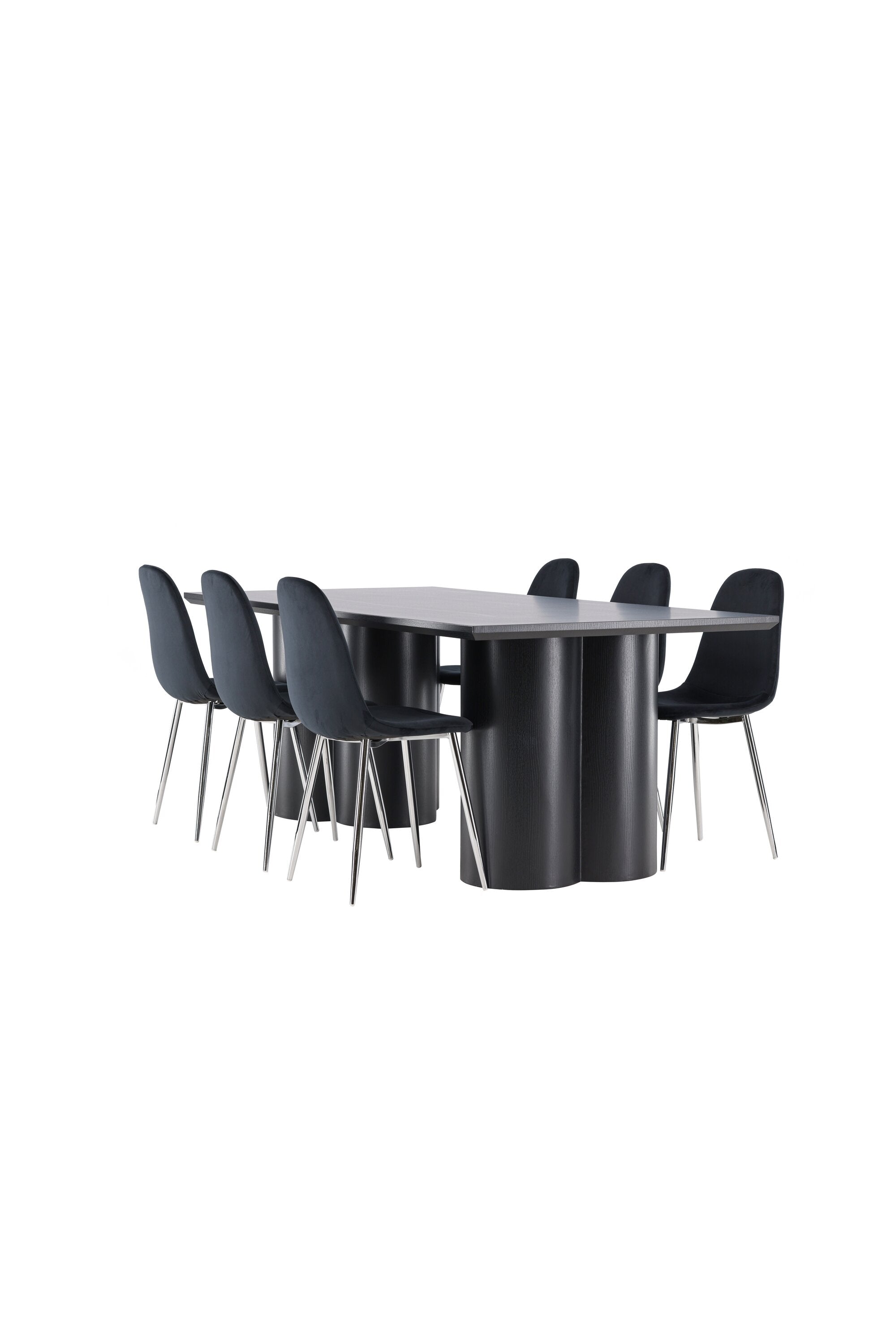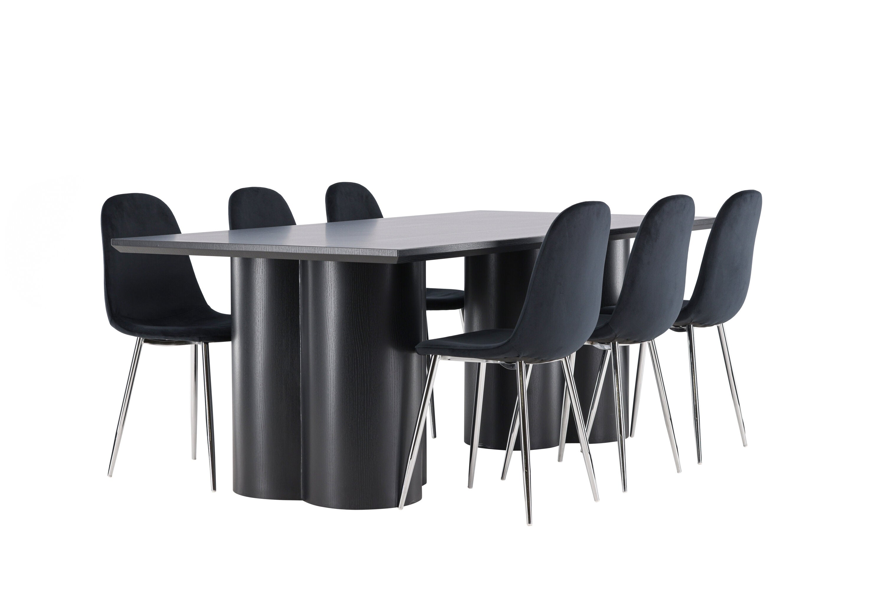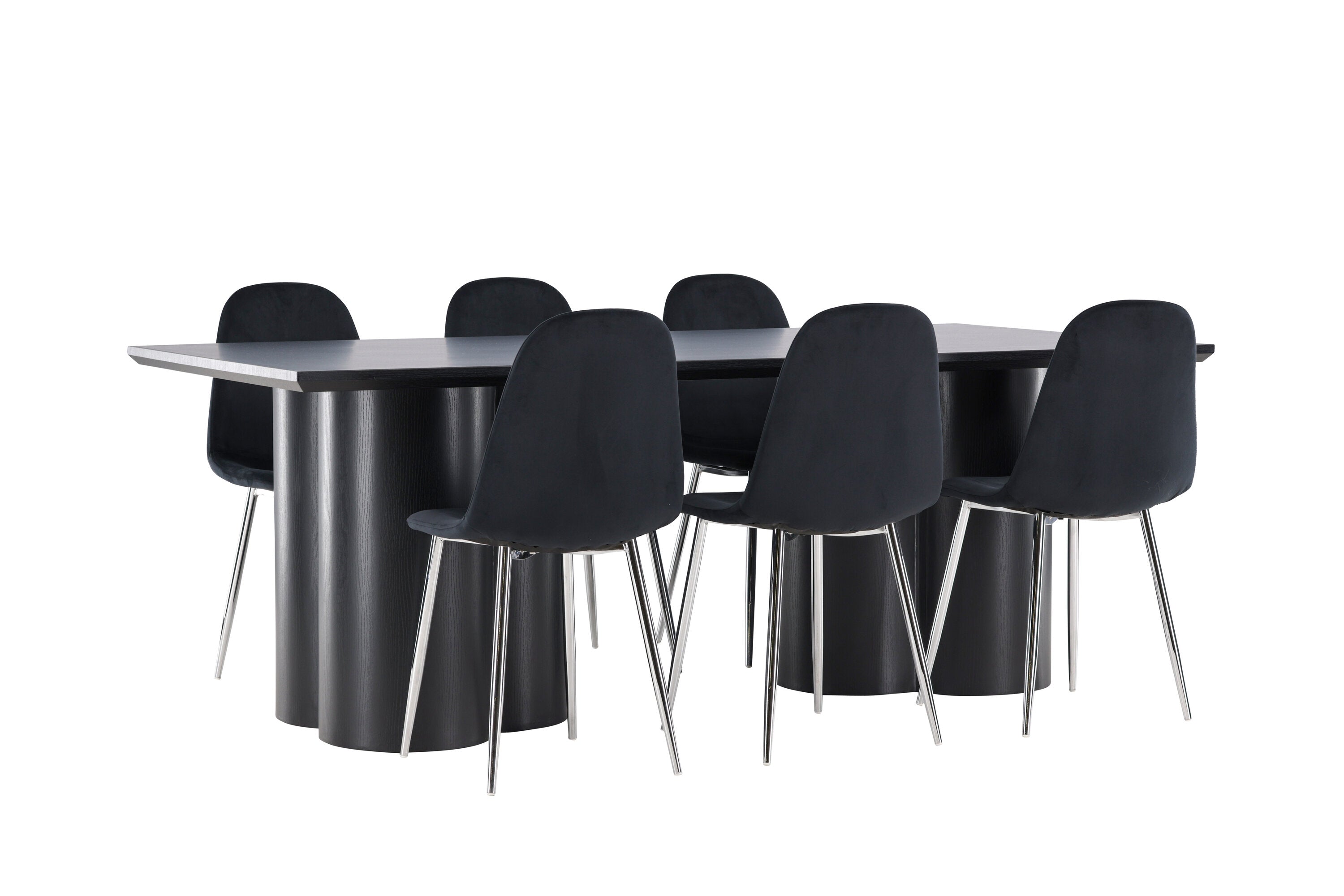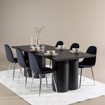 Objevte perfektní jídelní set s jídelní židlí Polar a jídelním stolem Olivia – kombinaci, která vyzařuje eleganci i funkčnost pro váš domov. Polar je elegantní jídelní židle v luxusním duchu s celočalouněným designem, který má chromované kovové nohy, mírně zaoblené opěradlo a elegantní sedák z černé sametové látky s měkkým polstrováním pro extra pohodlí. Zde nemusíte dělat kompromisy mezi pohodlím a designem. Spojte Polar s jídelním stolem Olivia pro kompletní jídelní set pro srdce vašeho domova! Jídelní stůl Olivia se svými velkorysými rozměry 210x100 cm je perfektní pro vítání přátel a rodiny při společném jídle a posezení. Stůl v sofistikovaném černém odstínu vyzařuje eleganci a modernost a jeho robustní konstrukce zajišťuje dlouhodobou stabilitu. Dodejte své jídelně pocit luxusu a modernosti s jídelní židlí Polar a jídelním stolem Olivia. Tento jídelní set vytváří harmonickou atmosféru a zanechává trvalý dojem. Tato kombinace je ideální jak pro každodenní večeři, tak pro slavnostní příležitosti, nabízí rovnováhu mezi nadčasovým designem a moderními detaily, díky čemuž je perfektní volbou pro všechna vaše společenská setkání.