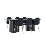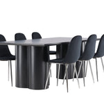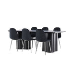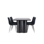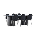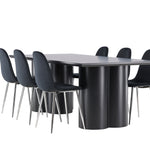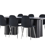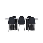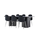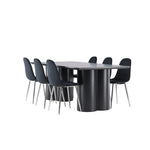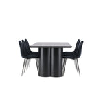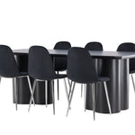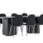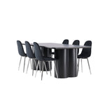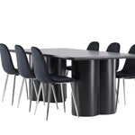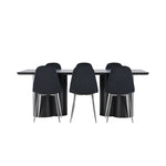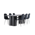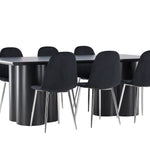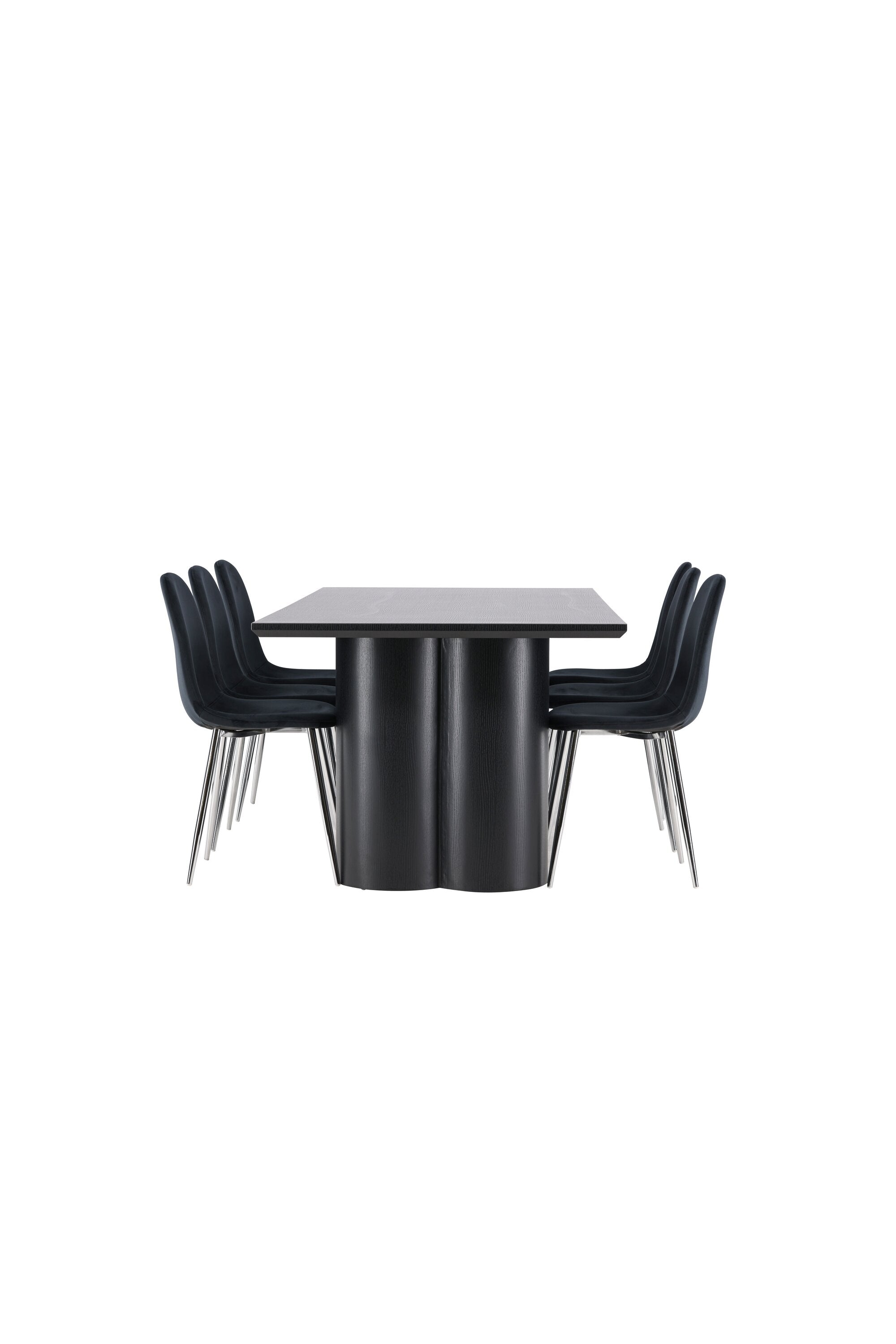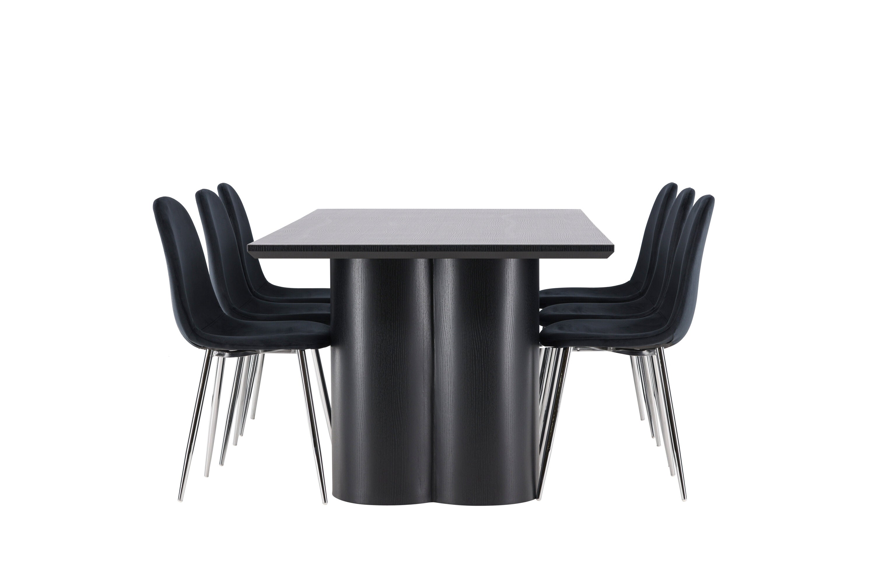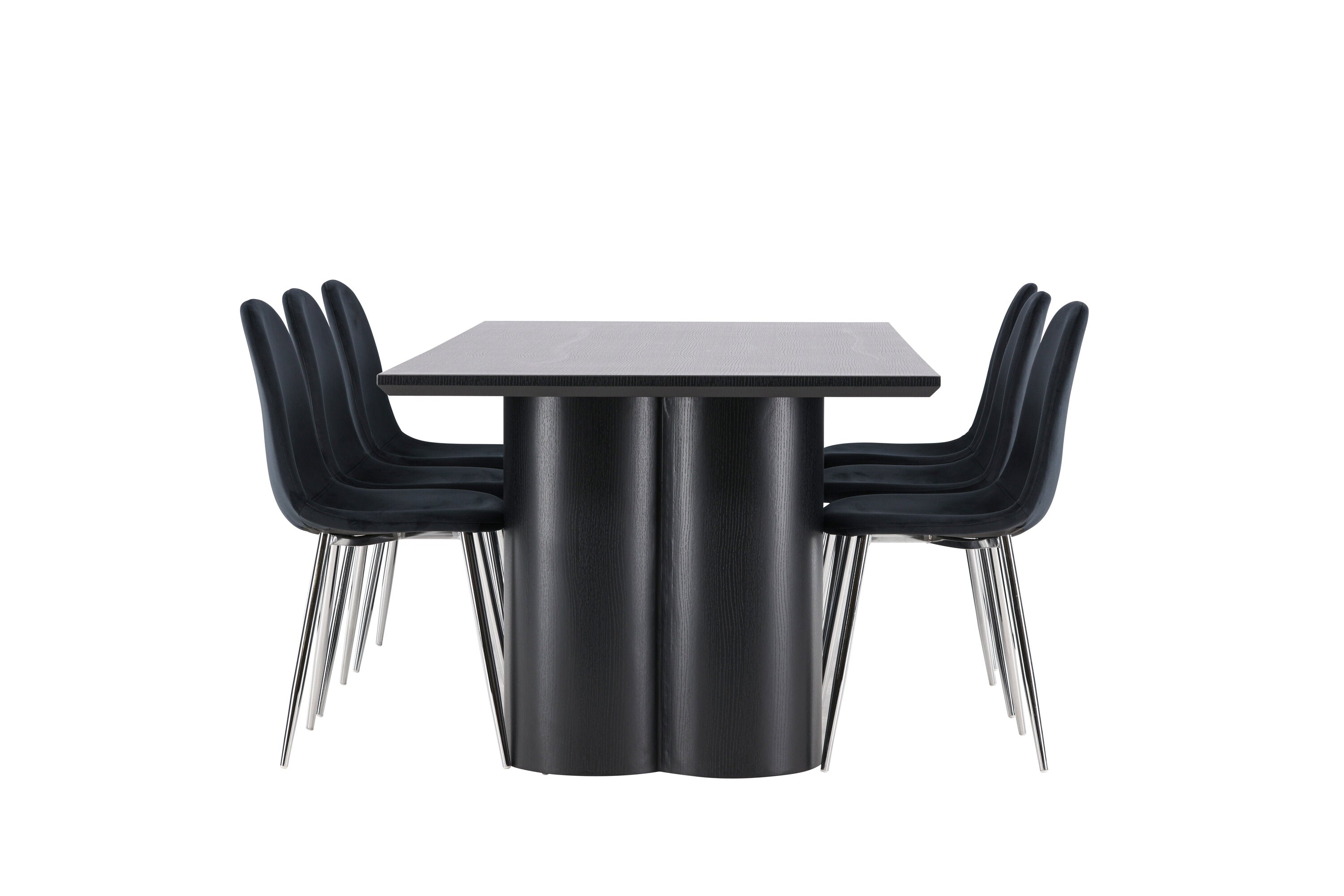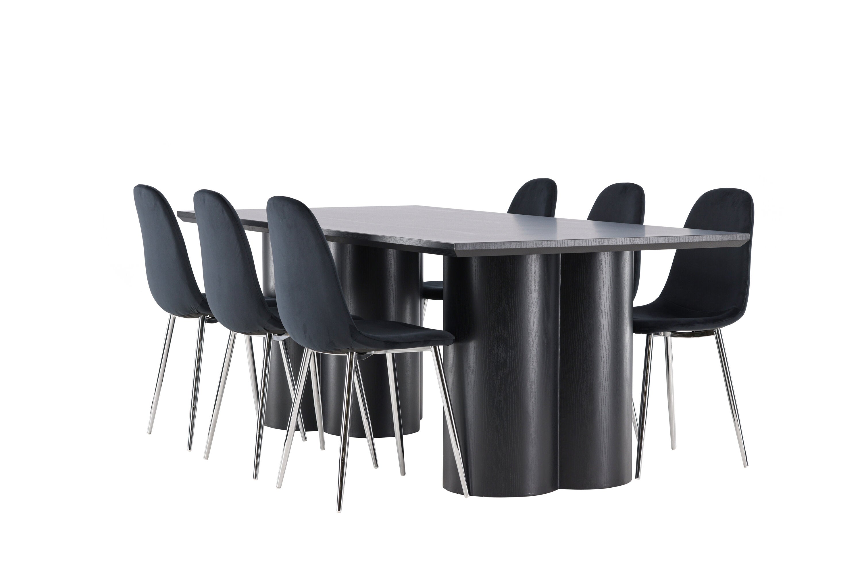 Objevte perfektní jídelní set s jídelní židlí Polar a jídelním stolem Olivia – kombinaci, která vyzařuje eleganci i funkčnost pro váš domov. Polar je elegantní jídelní židle v luxusním duchu s celočalouněným designem, který má chromované kovové nohy, mírně zaoblené opěradlo a elegantní sedák z černé sametové látky s měkkým polstrováním pro extra pohodlí. Zde nemusíte dělat kompromisy mezi pohodlím a designem. Spojte Polar s jídelním stolem Olivia pro kompletní jídelní set pro srdce vašeho domova! Jídelní stůl Olivia se svými velkorysými rozměry 210x100 cm je perfektní pro vítání přátel a rodiny při společném jídle a posezení. Stůl v sofistikovaném černém odstínu vyzařuje eleganci a modernost a jeho robustní konstrukce zajišťuje dlouhodobou stabilitu. Dodejte své jídelně pocit luxusu a modernosti s jídelní židlí Polar a jídelním stolem Olivia. Tento jídelní set vytváří harmonickou atmosféru a zanechává trvalý dojem. Tato kombinace je ideální jak pro každodenní večeři, tak pro slavnostní příležitosti, nabízí rovnováhu mezi nadčasovým designem a moderními detaily, díky čemuž je perfektní volbou pro všechna vaše společenská setkání.