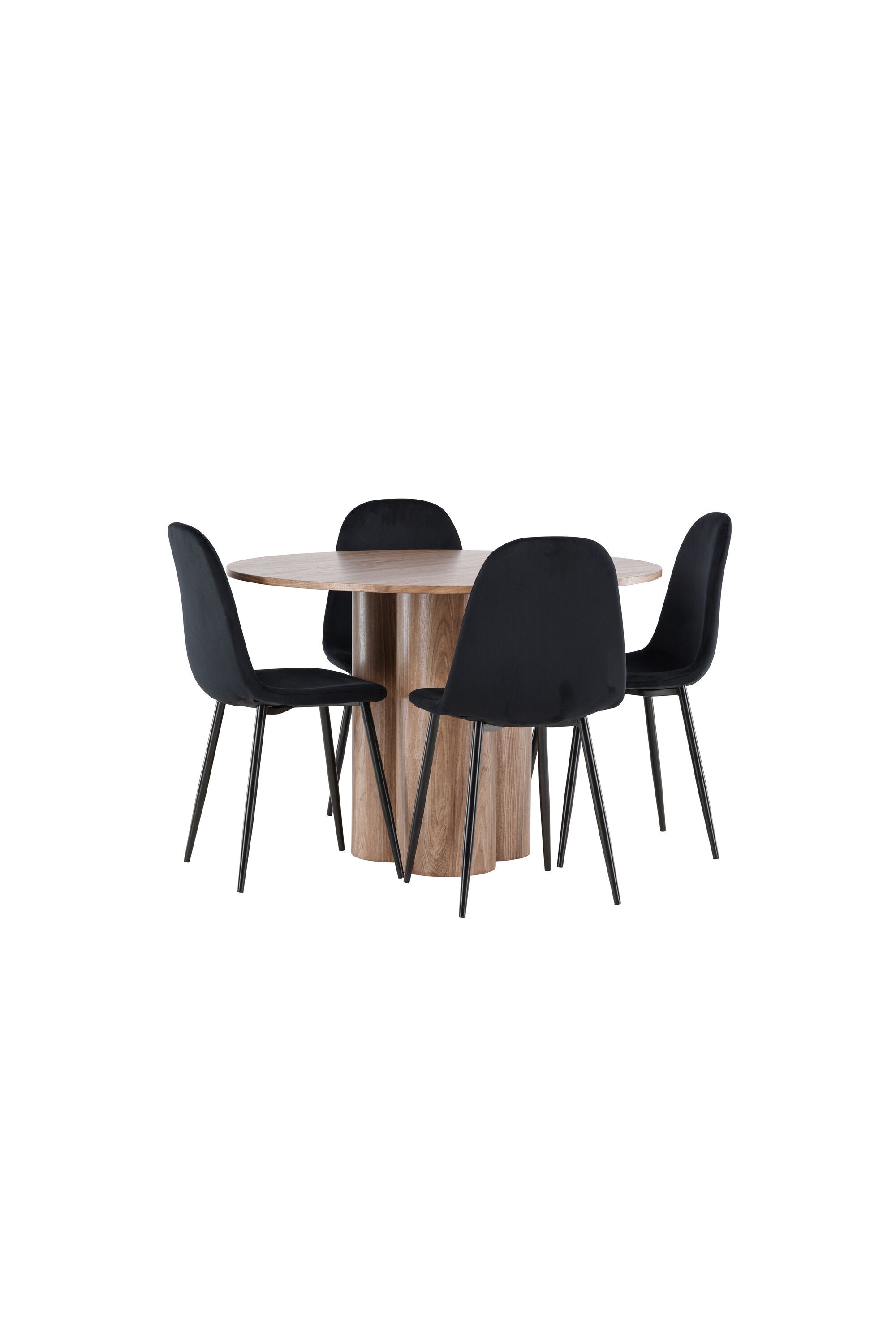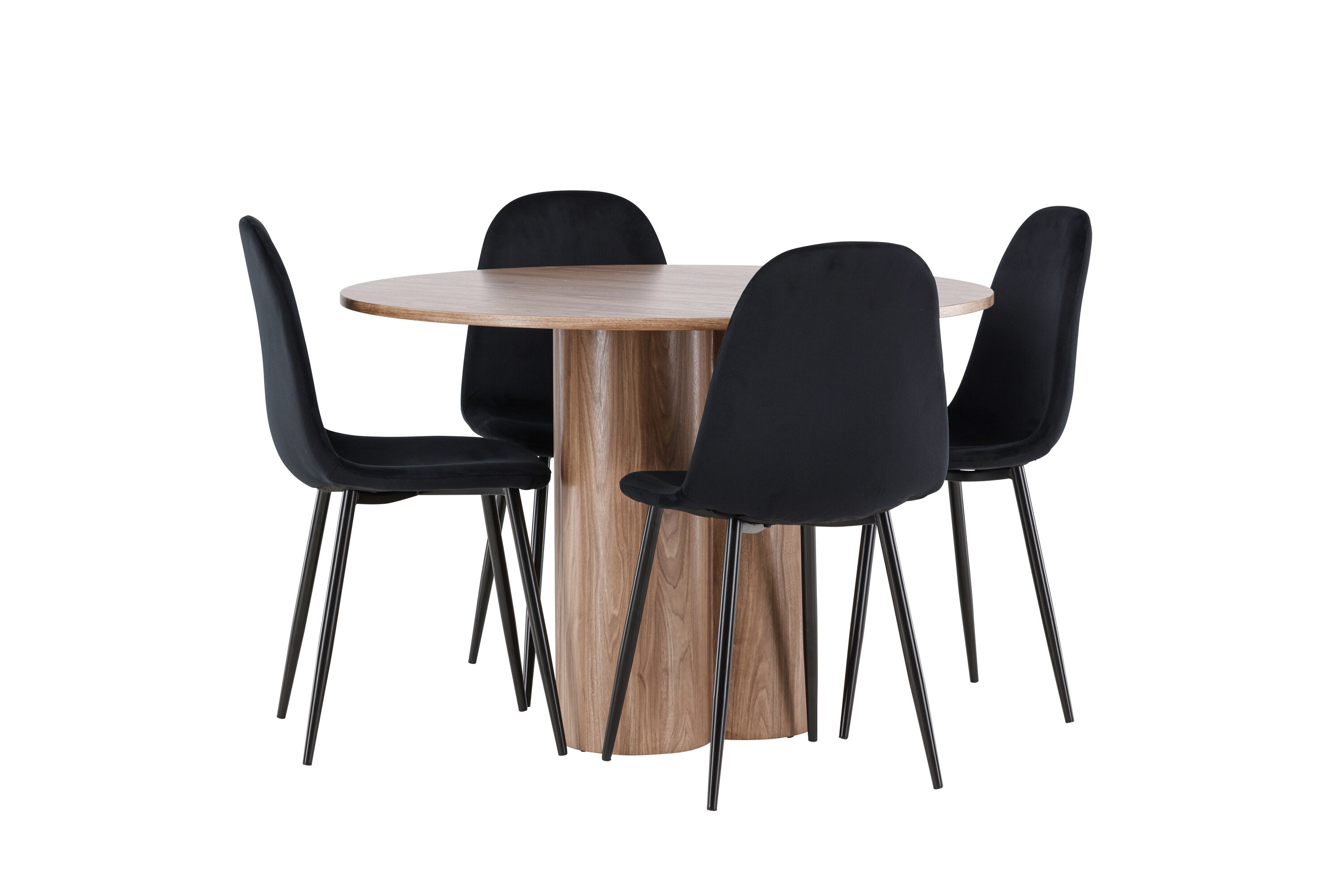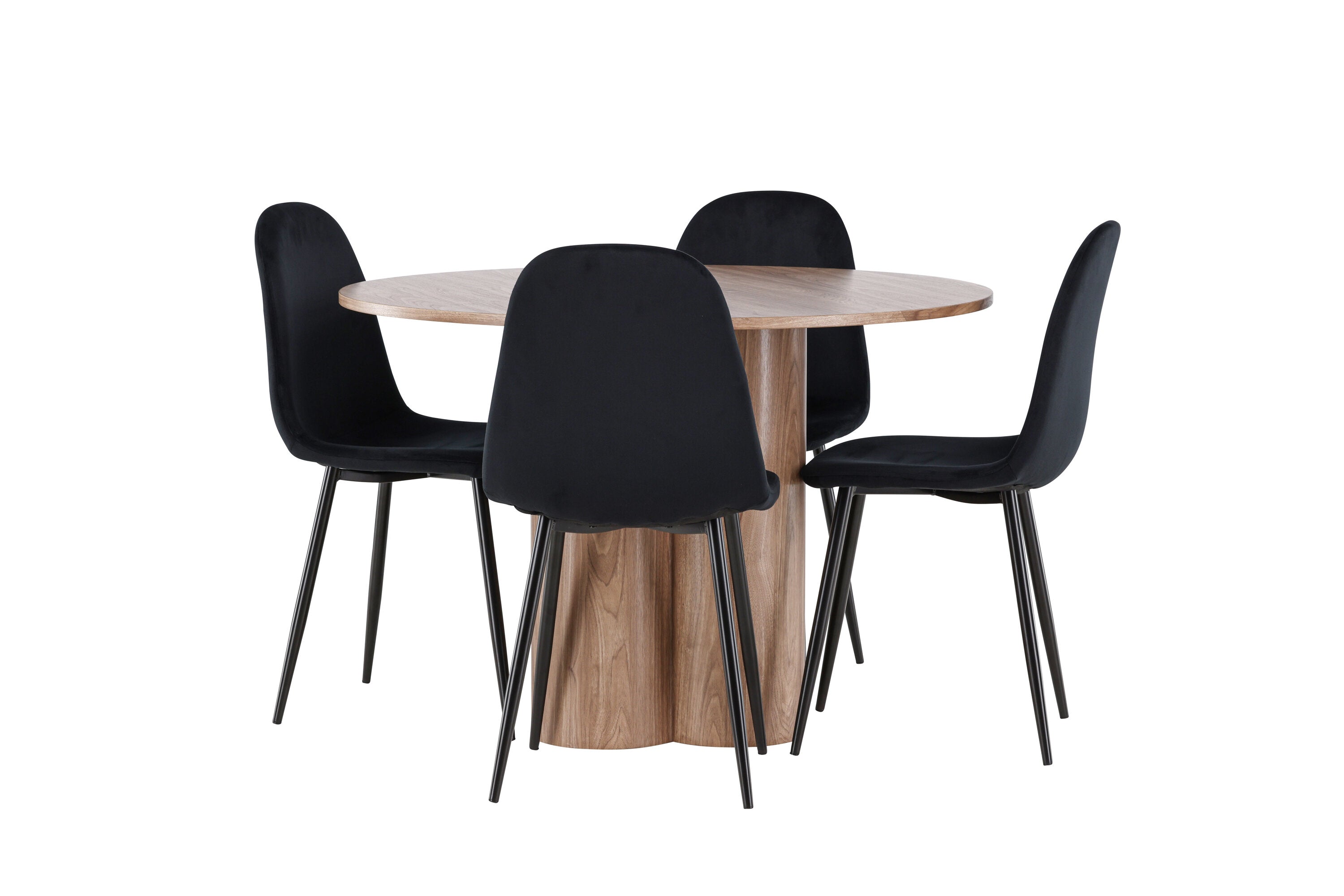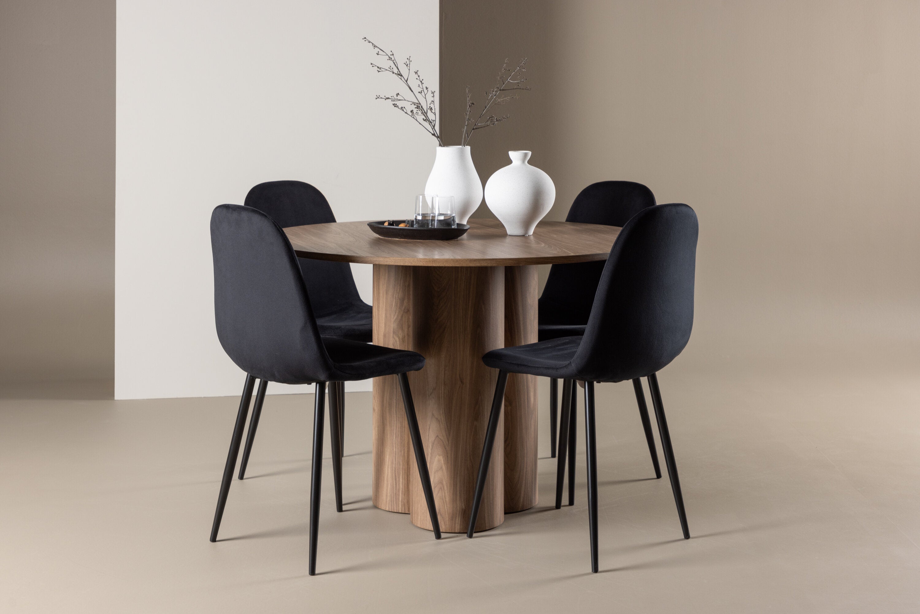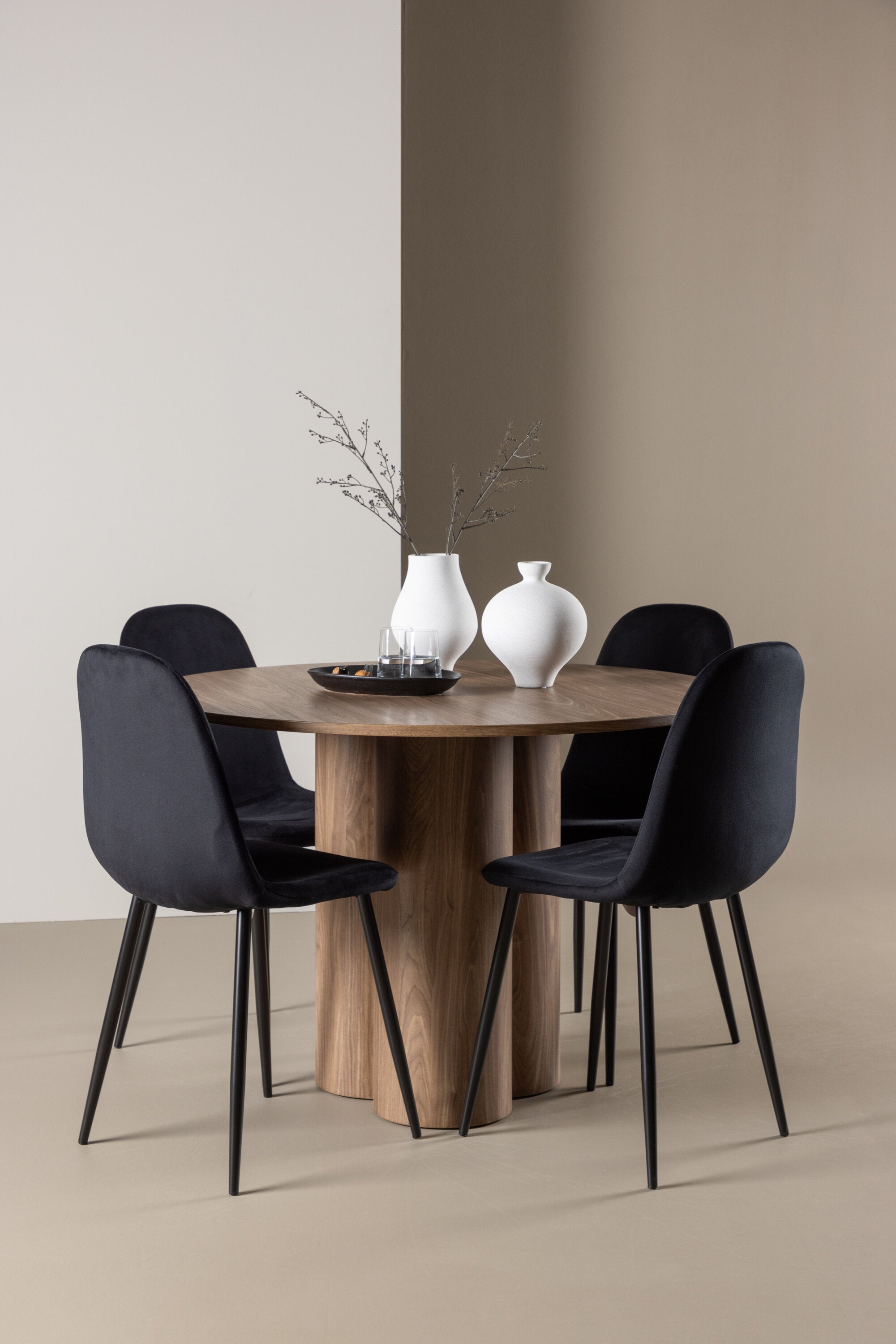 Proměňte svou jídelnu pomocí elegantního jídelního setu, který obsahuje stůl Olivia a židle Polar. Tato sofistikovaná kombinace moderního designu a luxusních materiálů vytváří dokonalé prostředí jak pro každodenní stolování, tak pro slavnostní příležitosti. Stůl Olivia je stylovým a nadčasovým doplňkem vašeho domova. Díky své mocha barvě a MDF konstrukci působí stůl teplým a příjemným dojmem. Deska stolu má průměr 110 cm, poskytuje dostatek prostoru pro pohodlné usazení čtyř osob a přitom je stále dostatečně kompaktní, aby se vešla i do menších prostor. Stůl Olivia stojí stabilně na pevné základně a snadno se čistí, takže je praktický i elegantní. Židle Polar svým luxusním designem doplňují stůl Olivia. Tyto židle jsou čalouněné černým sametem a mají elegantní černé nohy, které nabízejí exkluzivní a pohodlné sezení. Jemný samet v kombinaci s moka tónem stolu vytváří harmonickou a elegantní atmosféru ve vaší jídelně. Židle Polar jsou navrženy s ohledem na estetiku i pohodlí, takže jsou ideální pro dlouhé a příjemné večeře. S jídelním setem Olivia a židlemi Polar získáte kompletní jídelní kout, který kombinuje funkčnost s elegantním designem. Tato jídelní souprava se nepochybně stane ústředním bodem vašeho domova, kde se může scházet rodina a přátelé u lahodného jídla a příjemné společnosti.