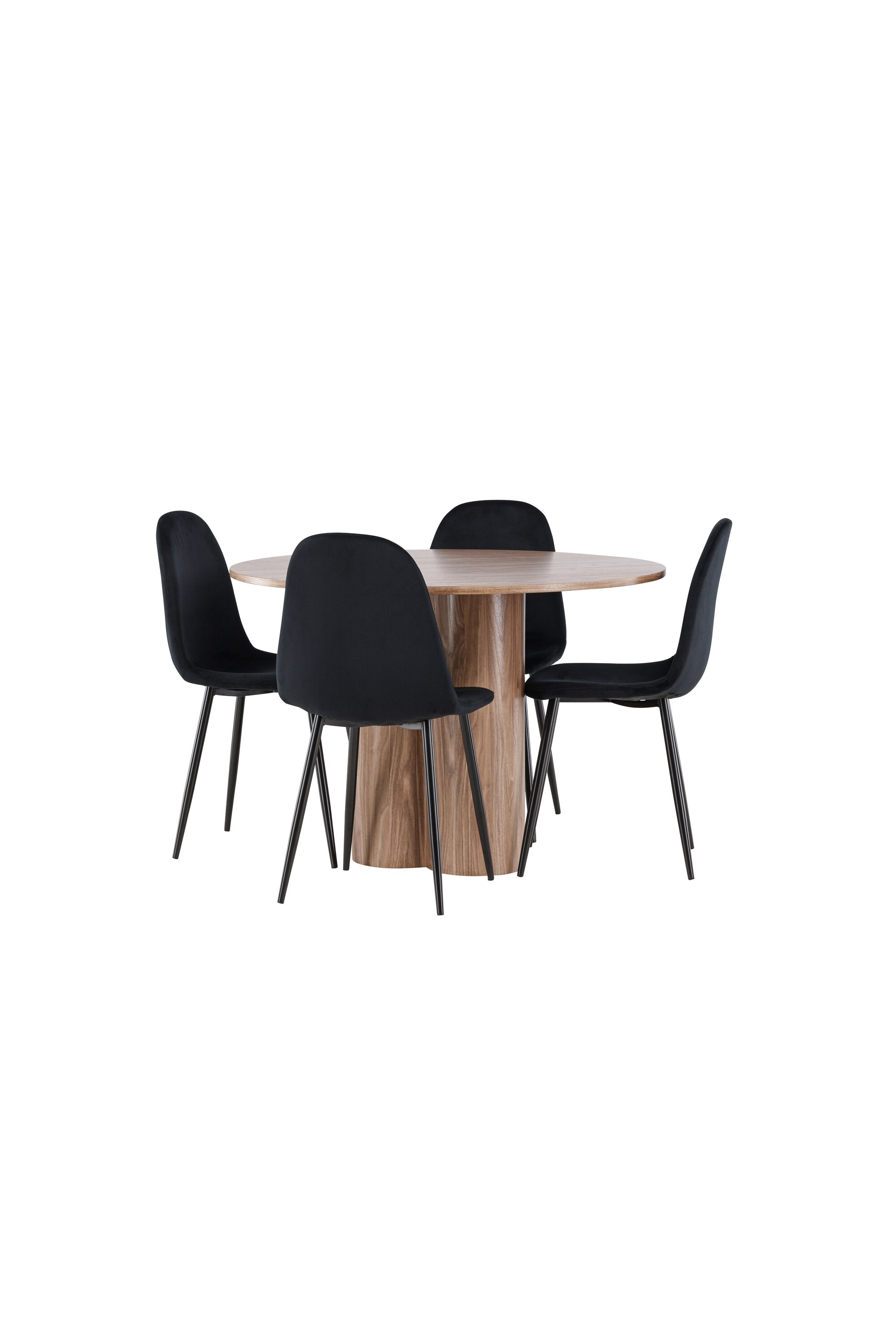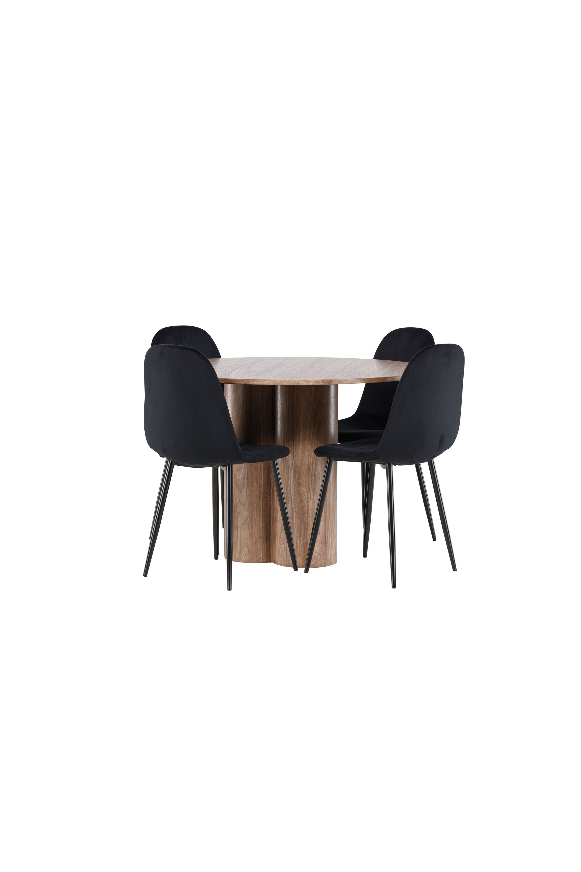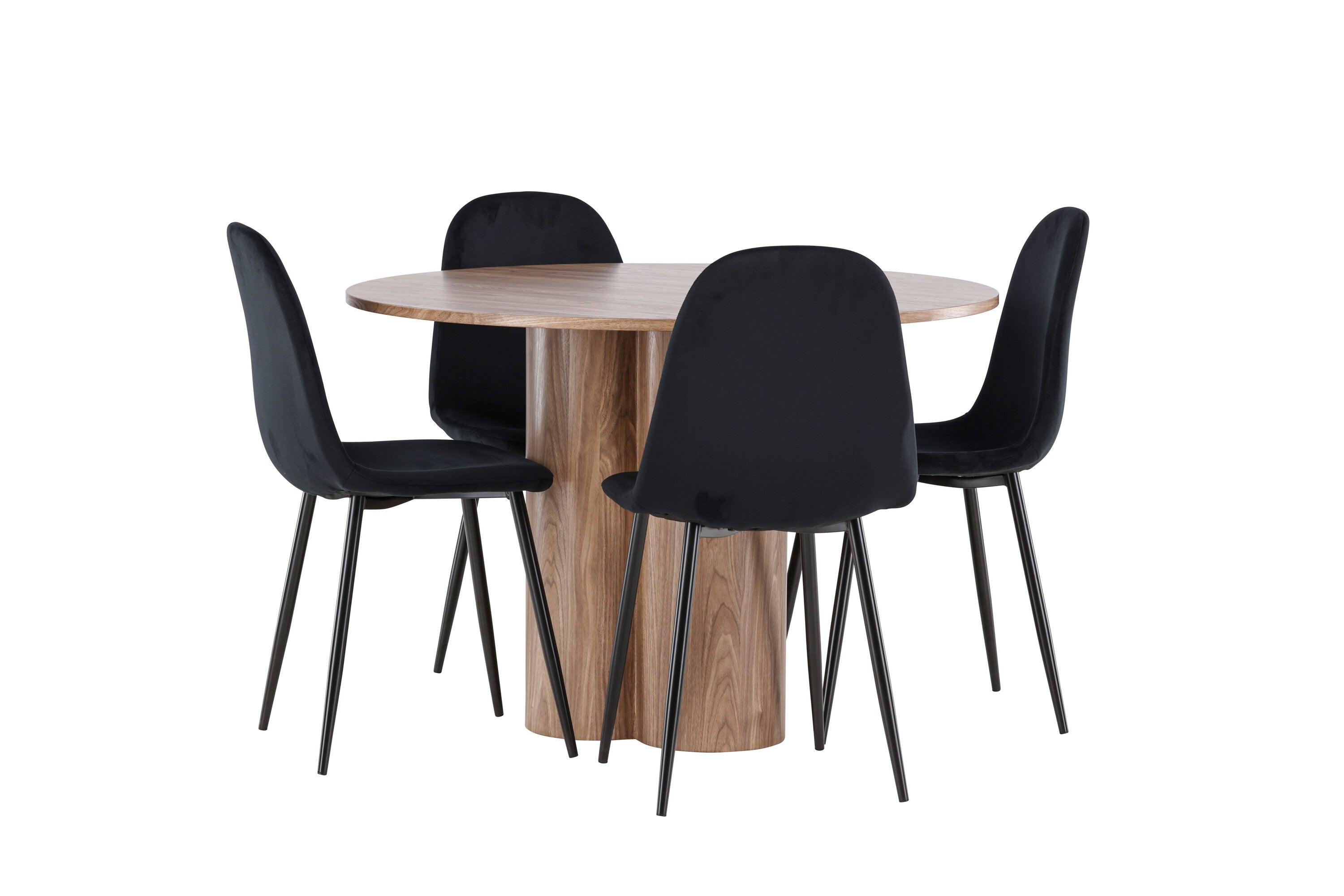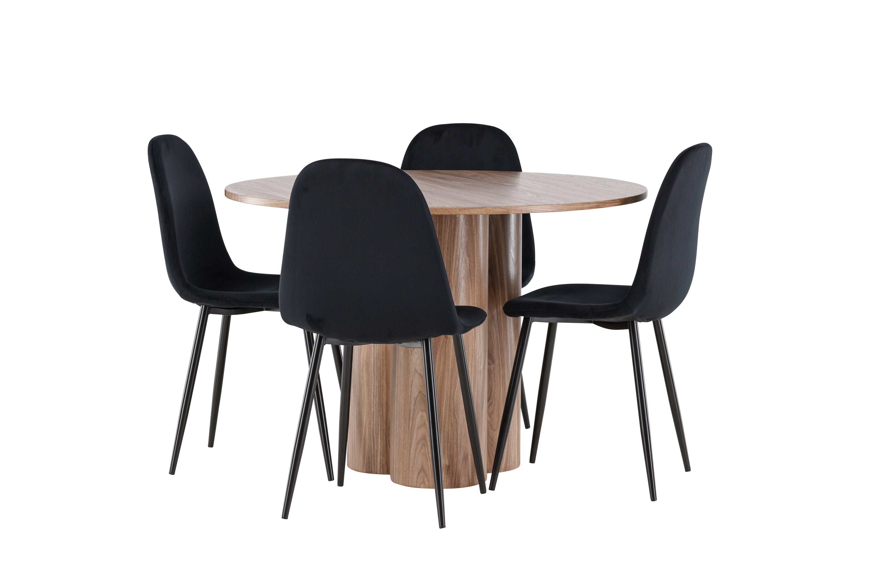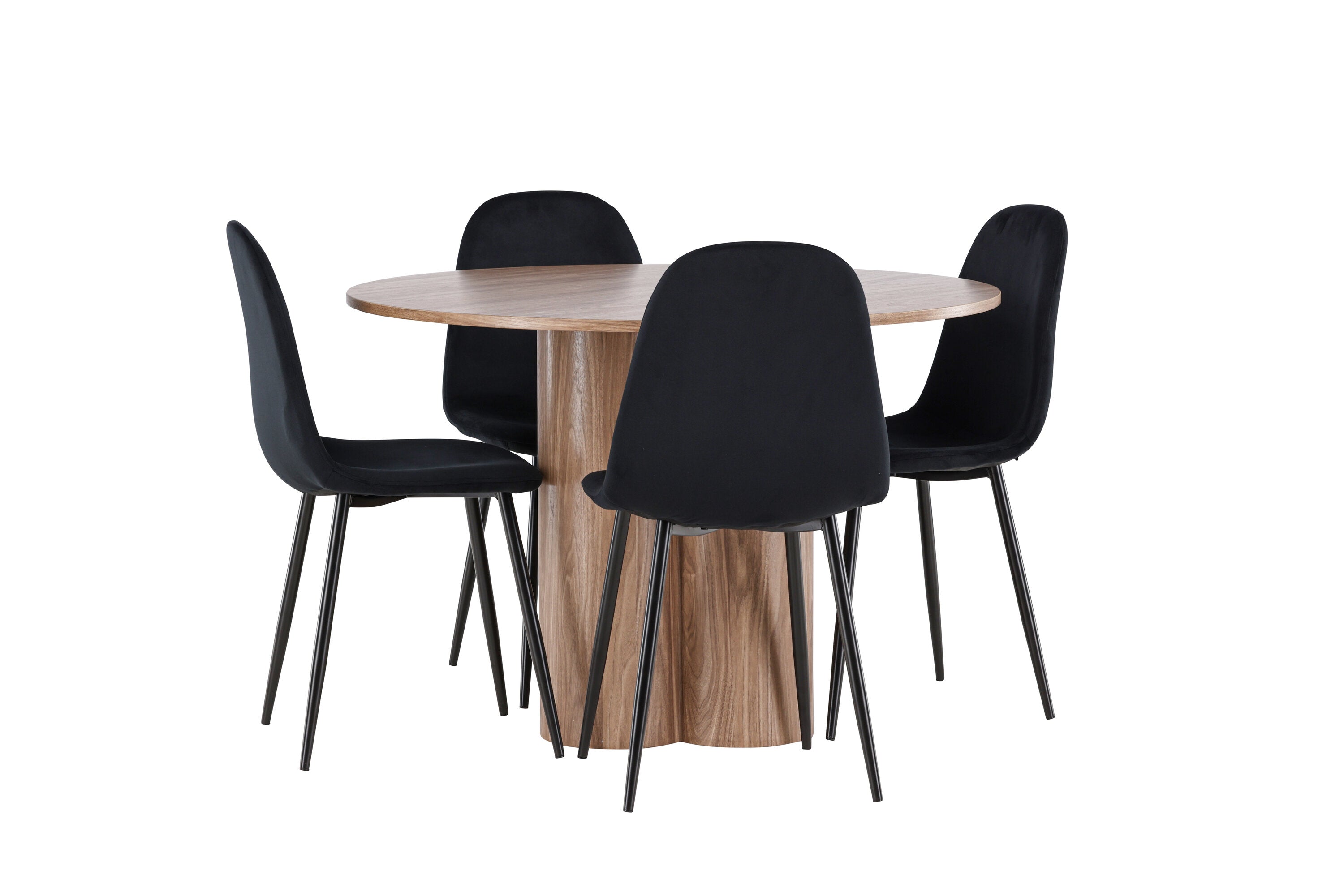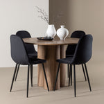 Proměňte svou jídelnu pomocí elegantního jídelního setu, který obsahuje stůl Olivia a židle Polar. Tato sofistikovaná kombinace moderního designu a luxusních materiálů vytváří dokonalé prostředí jak pro každodenní stolování, tak pro slavnostní příležitosti. Stůl Olivia je stylovým a nadčasovým doplňkem vašeho domova. Díky své mocha barvě a MDF konstrukci působí stůl teplým a příjemným dojmem. Deska stolu má průměr 110 cm, poskytuje dostatek prostoru pro pohodlné usazení čtyř osob a přitom je stále dostatečně kompaktní, aby se vešla i do menších prostor. Stůl Olivia stojí stabilně na pevné základně a snadno se čistí, takže je praktický i elegantní. Židle Polar svým luxusním designem doplňují stůl Olivia. Tyto židle jsou čalouněné černým sametem a mají elegantní černé nohy, které nabízejí exkluzivní a pohodlné sezení. Jemný samet v kombinaci s moka tónem stolu vytváří harmonickou a elegantní atmosféru ve vaší jídelně. Židle Polar jsou navrženy s ohledem na estetiku i pohodlí, takže jsou ideální pro dlouhé a příjemné večeře. S jídelním setem Olivia a židlemi Polar získáte kompletní jídelní kout, který kombinuje funkčnost s elegantním designem. Tato jídelní souprava se nepochybně stane ústředním bodem vašeho domova, kde se může scházet rodina a přátelé u lahodného jídla a příjemné společnosti.