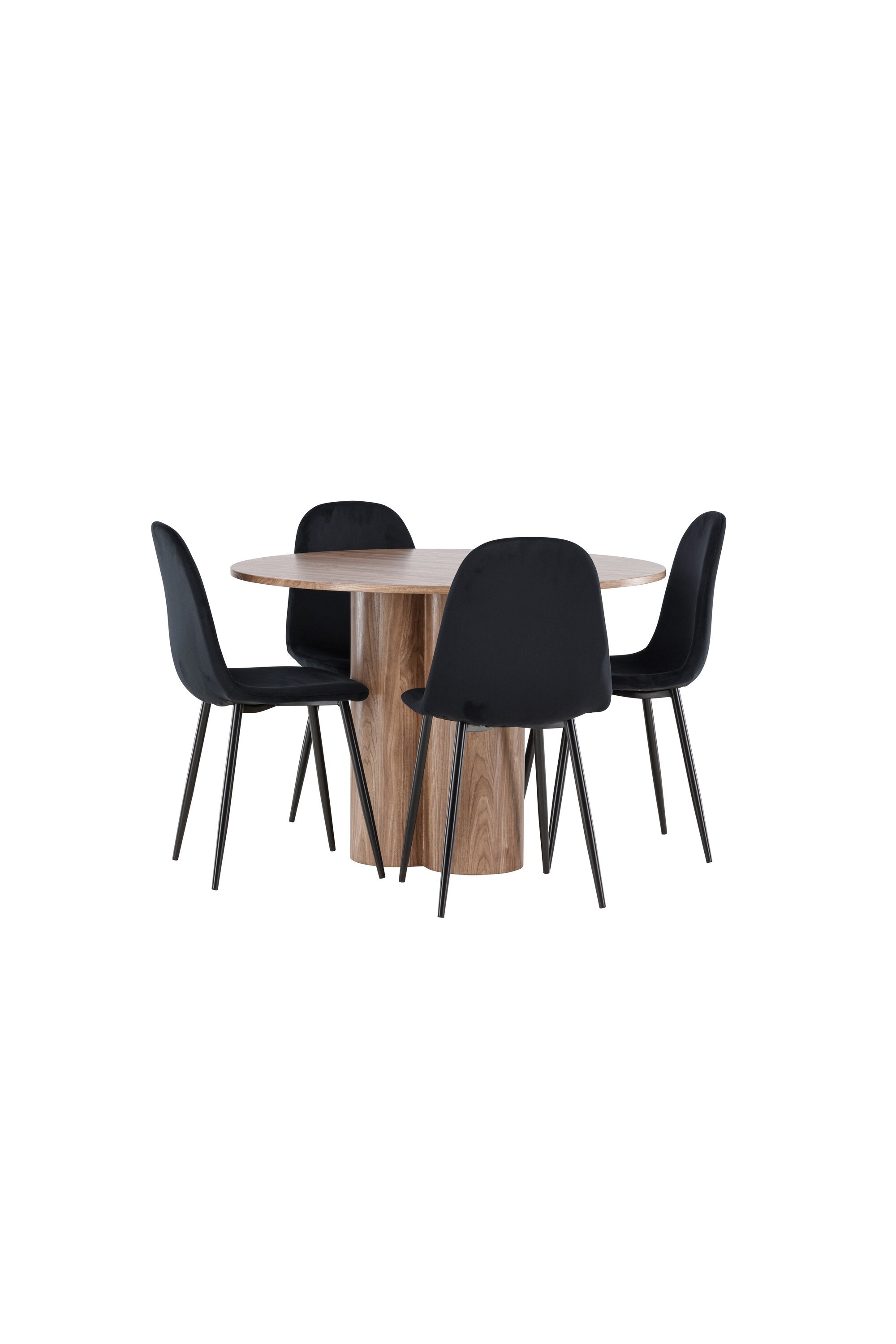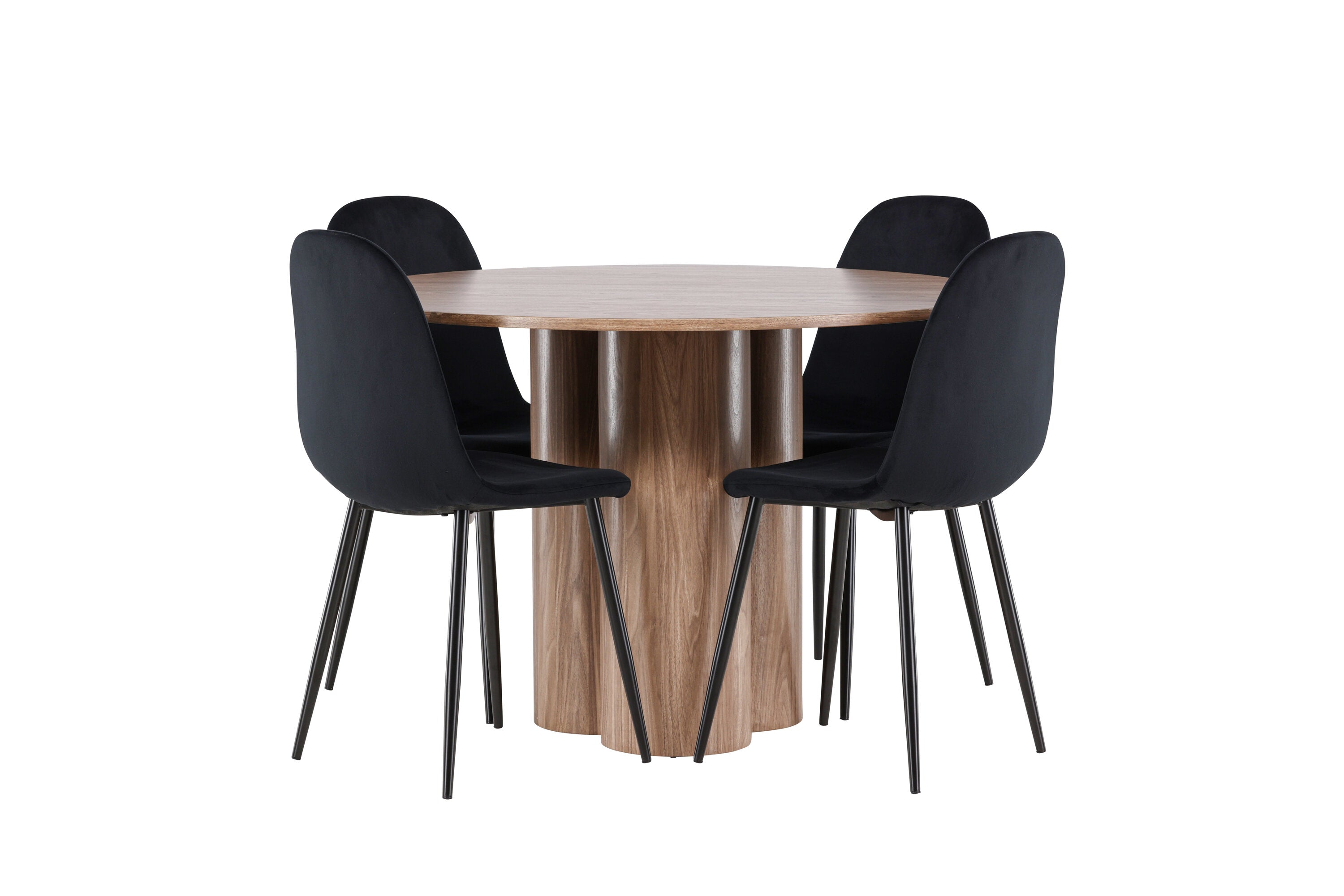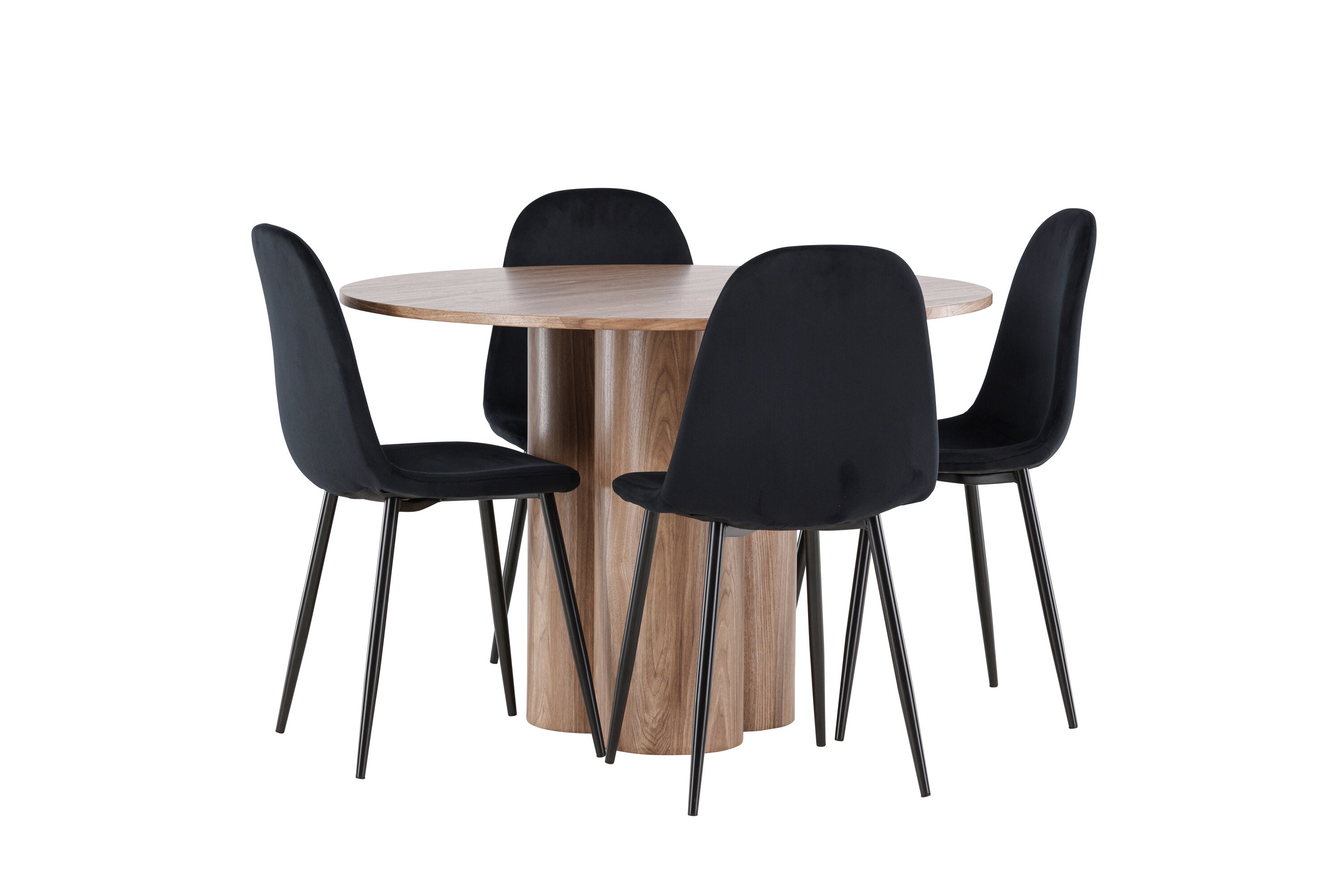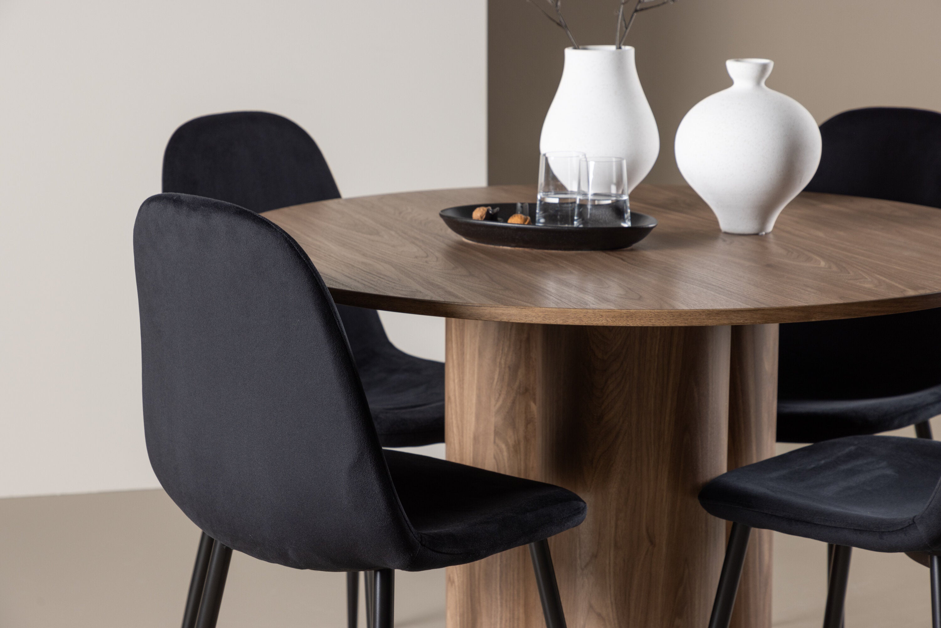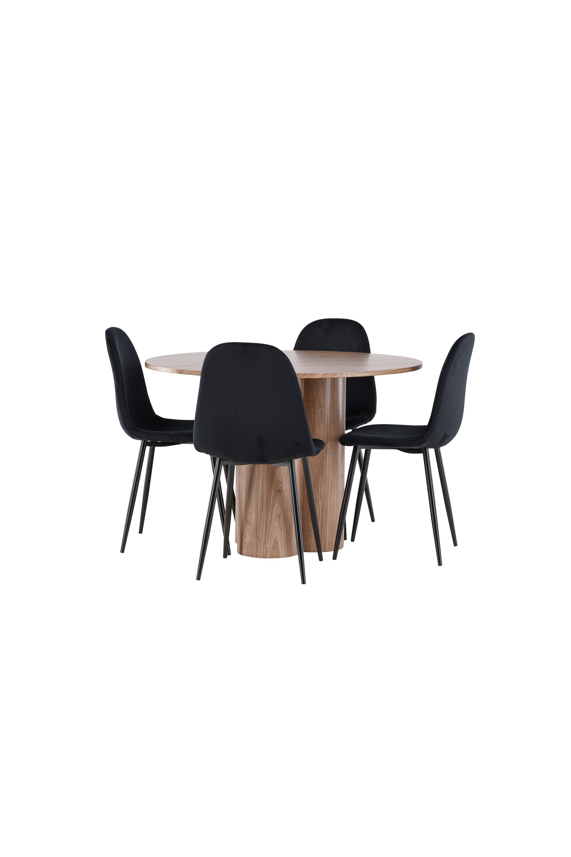 Proměňte svou jídelnu pomocí elegantního jídelního setu, který obsahuje stůl Olivia a židle Polar. Tato sofistikovaná kombinace moderního designu a luxusních materiálů vytváří dokonalé prostředí jak pro každodenní stolování, tak pro slavnostní příležitosti. Stůl Olivia je stylovým a nadčasovým doplňkem vašeho domova. Díky své mocha barvě a MDF konstrukci působí stůl teplým a příjemným dojmem. Deska stolu má průměr 110 cm, poskytuje dostatek prostoru pro pohodlné usazení čtyř osob a přitom je stále dostatečně kompaktní, aby se vešla i do menších prostor. Stůl Olivia stojí stabilně na pevné základně a snadno se čistí, takže je praktický i elegantní. Židle Polar svým luxusním designem doplňují stůl Olivia. Tyto židle jsou čalouněné černým sametem a mají elegantní černé nohy, které nabízejí exkluzivní a pohodlné sezení. Jemný samet v kombinaci s moka tónem stolu vytváří harmonickou a elegantní atmosféru ve vaší jídelně. Židle Polar jsou navrženy s ohledem na estetiku i pohodlí, takže jsou ideální pro dlouhé a příjemné večeře. S jídelním setem Olivia a židlemi Polar získáte kompletní jídelní kout, který kombinuje funkčnost s elegantním designem. Tato jídelní souprava se nepochybně stane ústředním bodem vašeho domova, kde se může scházet rodina a přátelé u lahodného jídla a příjemné společnosti.