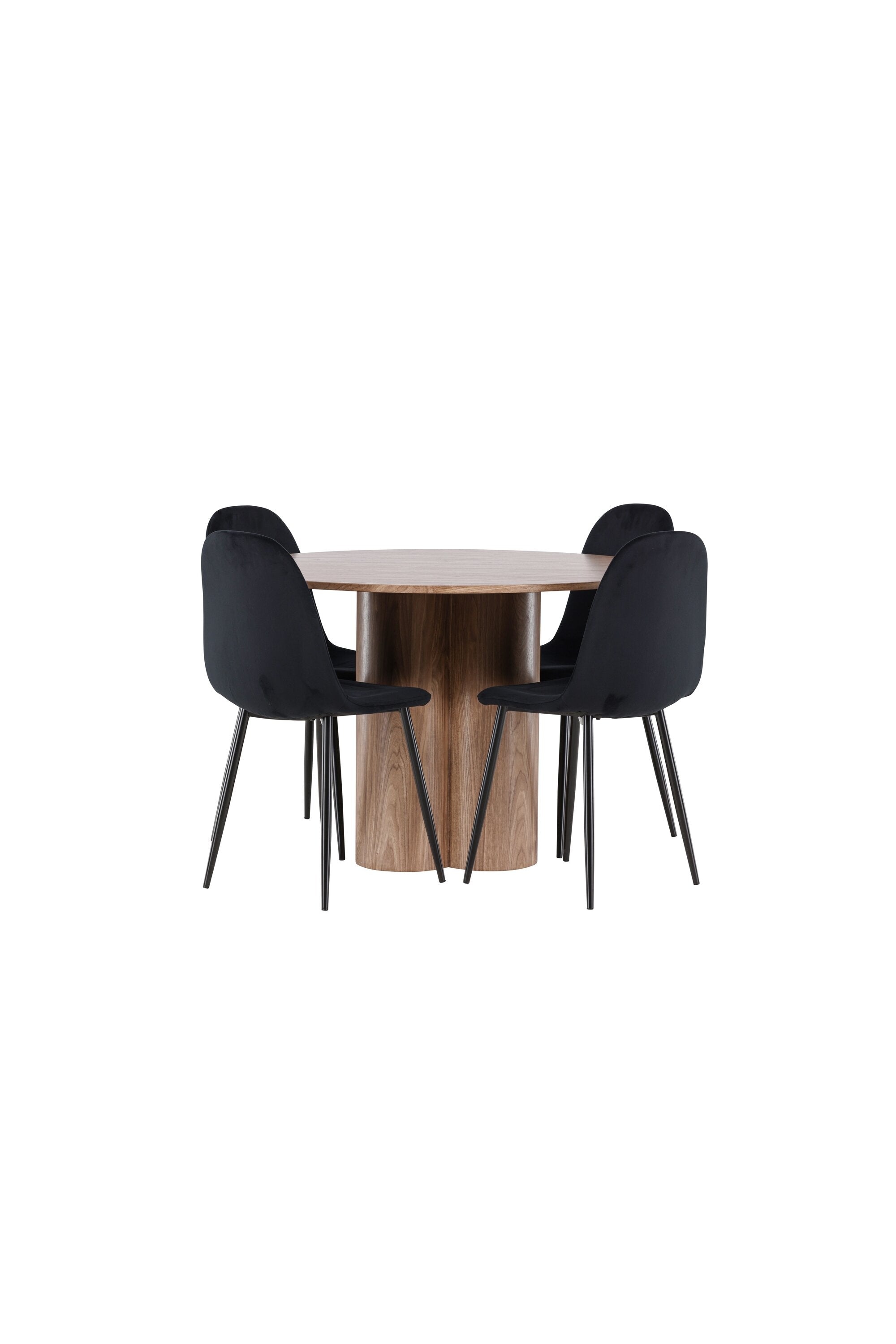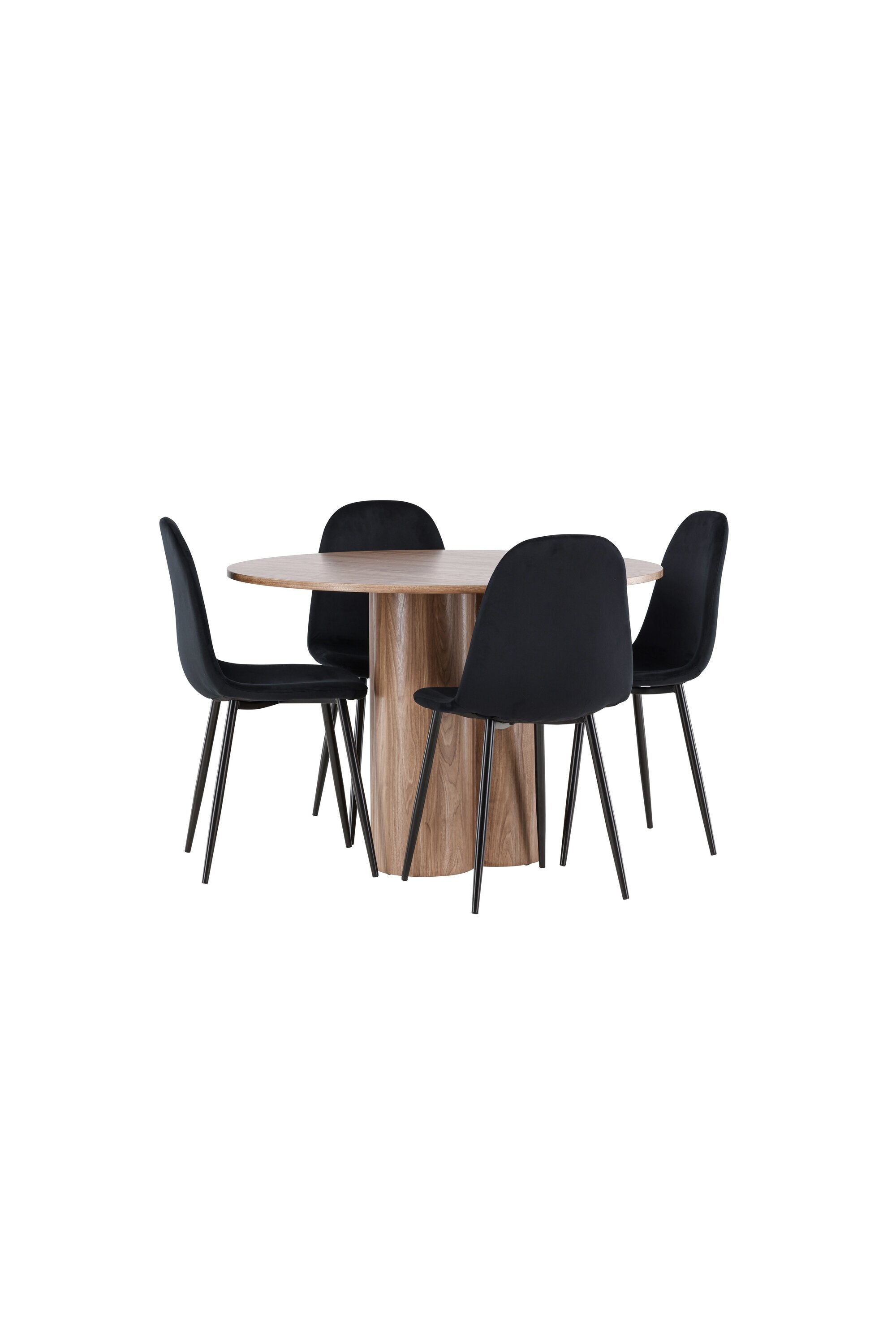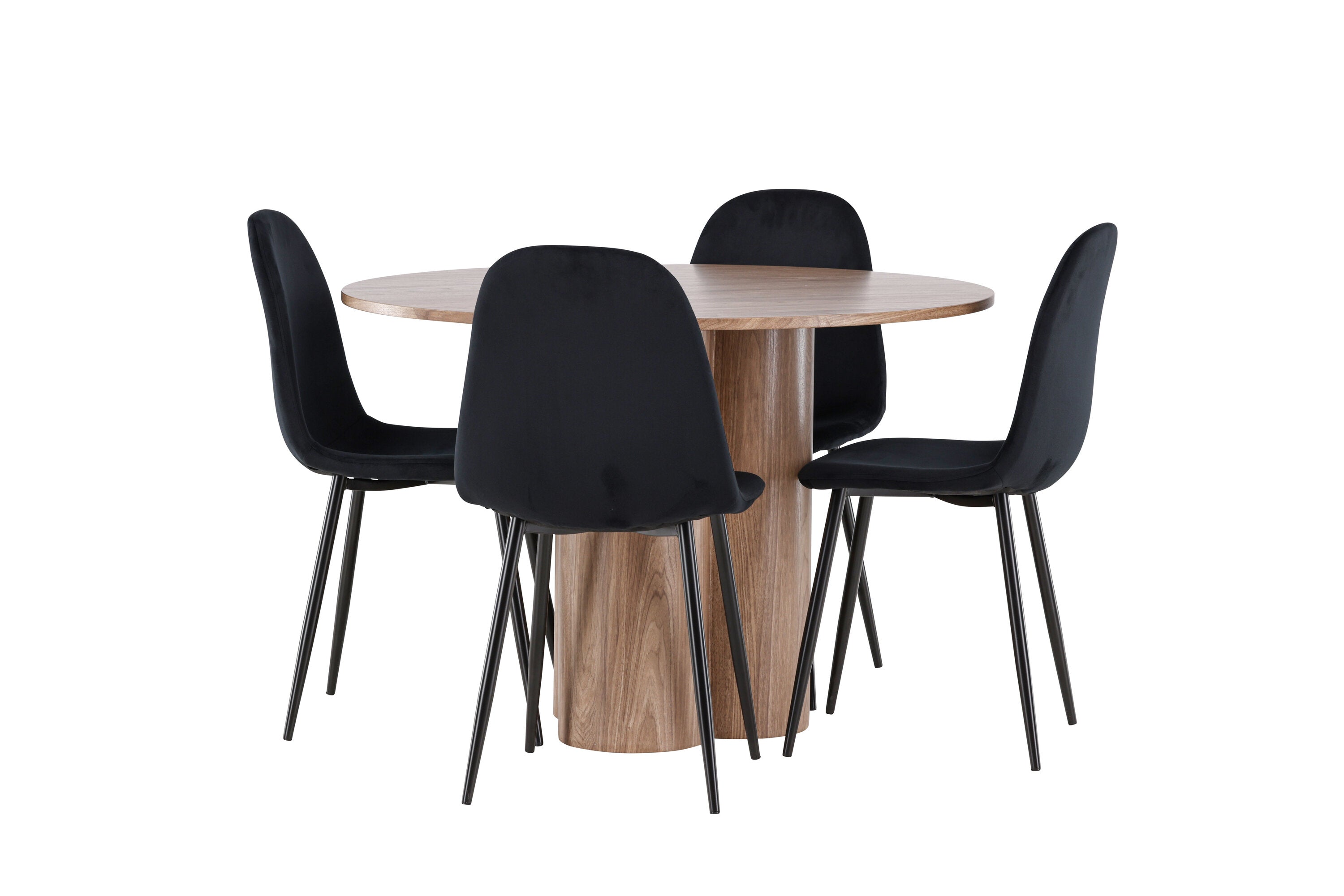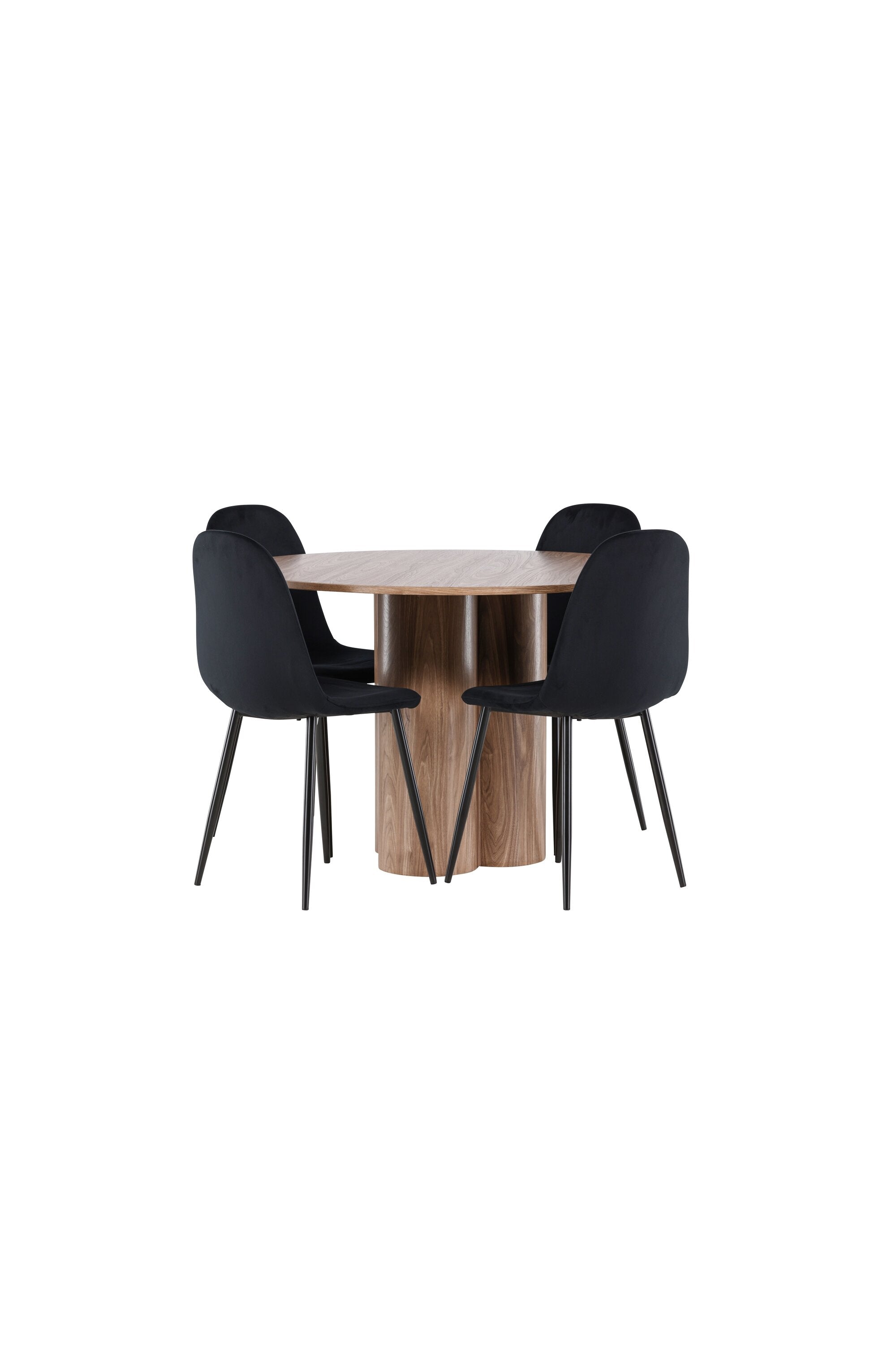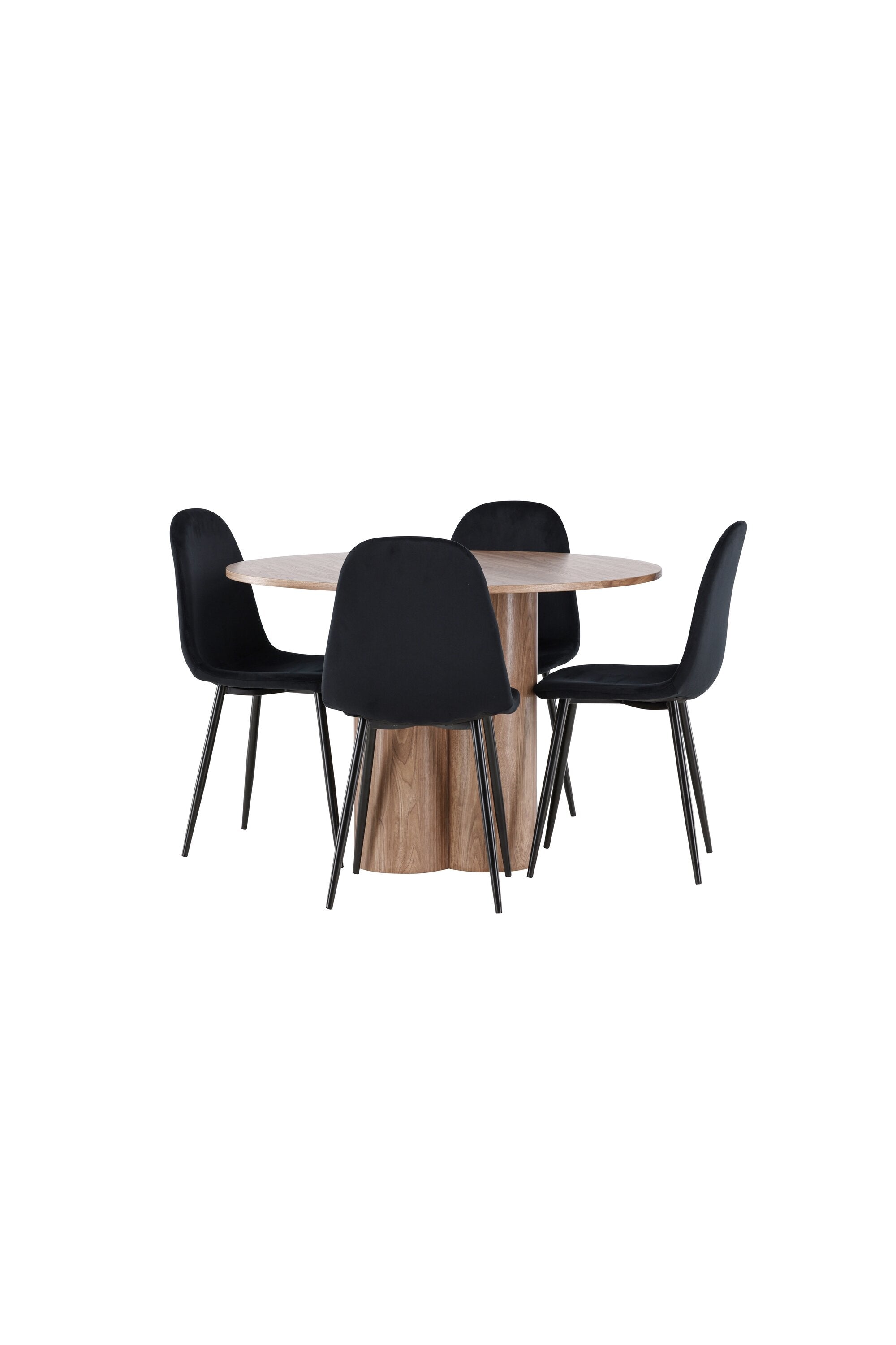 Proměňte svou jídelnu pomocí elegantního jídelního setu, který obsahuje stůl Olivia a židle Polar. Tato sofistikovaná kombinace moderního designu a luxusních materiálů vytváří dokonalé prostředí jak pro každodenní stolování, tak pro slavnostní příležitosti. Stůl Olivia je stylovým a nadčasovým doplňkem vašeho domova. Díky své mocha barvě a MDF konstrukci působí stůl teplým a příjemným dojmem. Deska stolu má průměr 110 cm, poskytuje dostatek prostoru pro pohodlné usazení čtyř osob a přitom je stále dostatečně kompaktní, aby se vešla i do menších prostor. Stůl Olivia stojí stabilně na pevné základně a snadno se čistí, takže je praktický i elegantní. Židle Polar svým luxusním designem doplňují stůl Olivia. Tyto židle jsou čalouněné černým sametem a mají elegantní černé nohy, které nabízejí exkluzivní a pohodlné sezení. Jemný samet v kombinaci s moka tónem stolu vytváří harmonickou a elegantní atmosféru ve vaší jídelně. Židle Polar jsou navrženy s ohledem na estetiku i pohodlí, takže jsou ideální pro dlouhé a příjemné večeře. S jídelním setem Olivia a židlemi Polar získáte kompletní jídelní kout, který kombinuje funkčnost s elegantním designem. Tato jídelní souprava se nepochybně stane ústředním bodem vašeho domova, kde se může scházet rodina a přátelé u lahodného jídla a příjemné společnosti.
